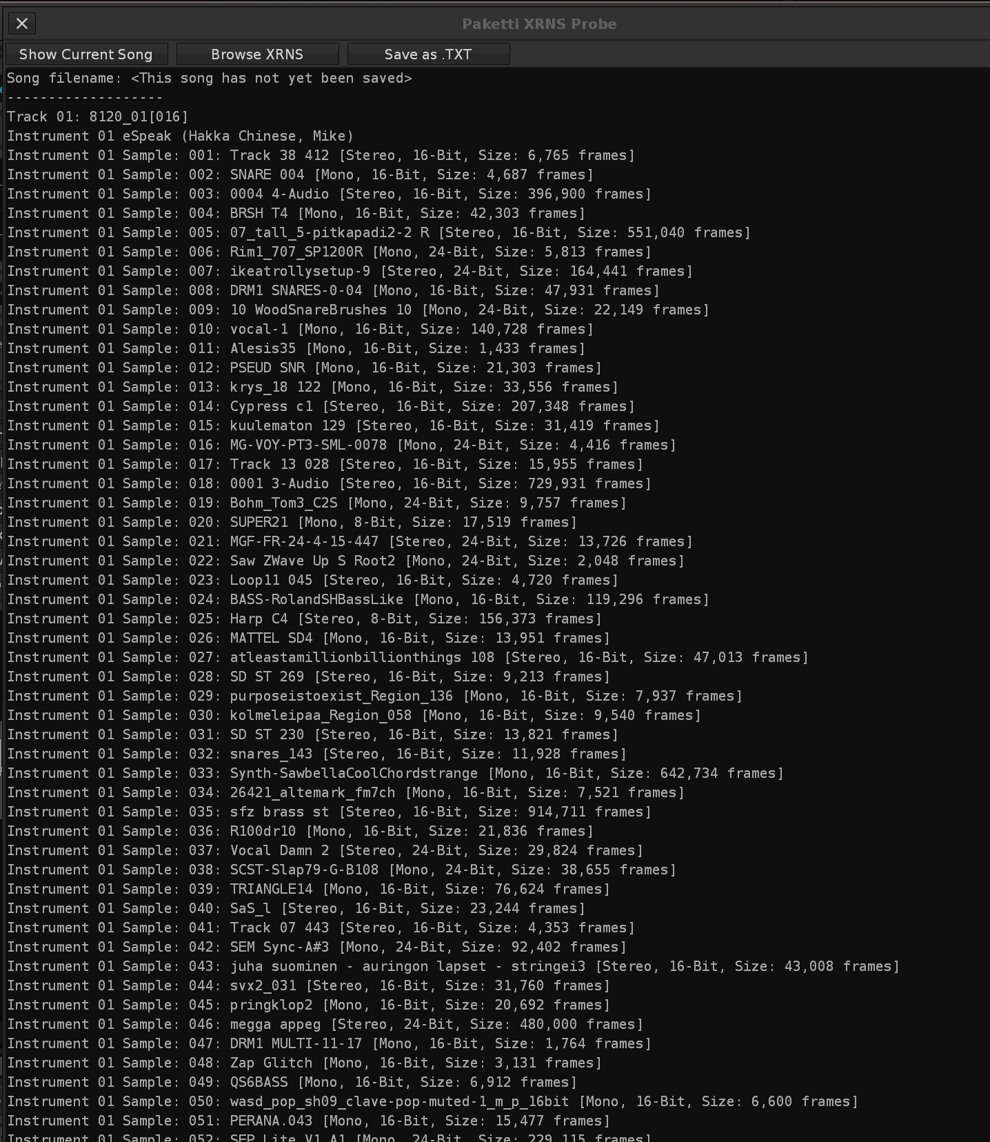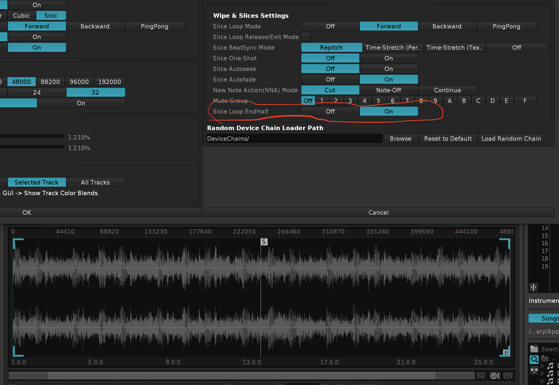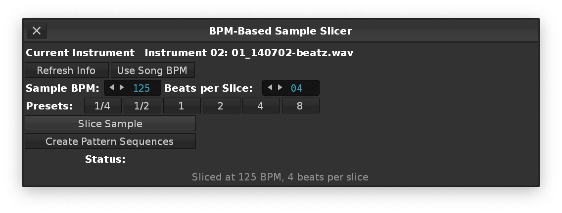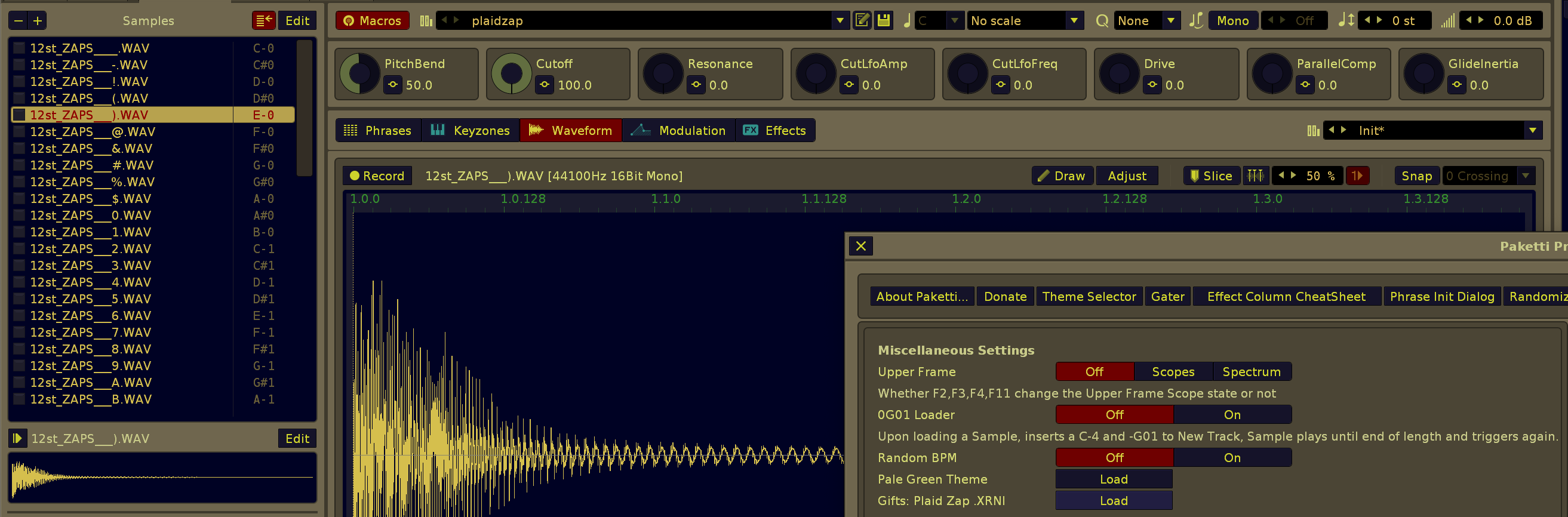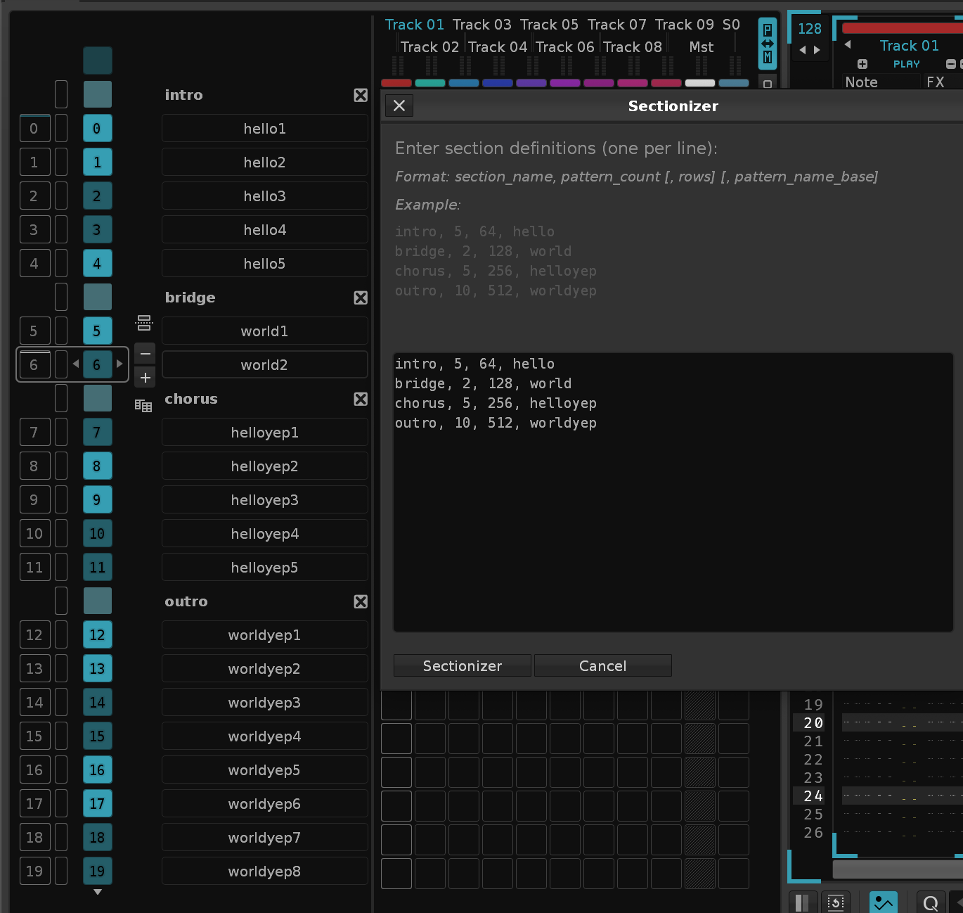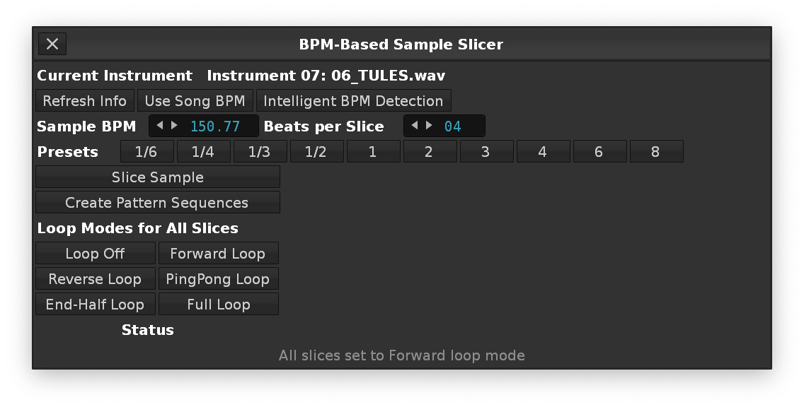 [ and ] format, so if you want to loop [] single pattern, that's what gets looped, if you have a multiple bunch of patterns, start with [ in the name and finish with ] in the name somewhere else.*Instr. Macros devices for each track, and read the BPM from the Wavefile header, or read the BPM from the folder the files are in, then calculate the length of the samples, and add the correct amount of patterns to the pattern sequence, and print, automatically, C-4 (instrumentnumber) 0G01 to every track that has been created, and enable Autoseek for each of the tracks.