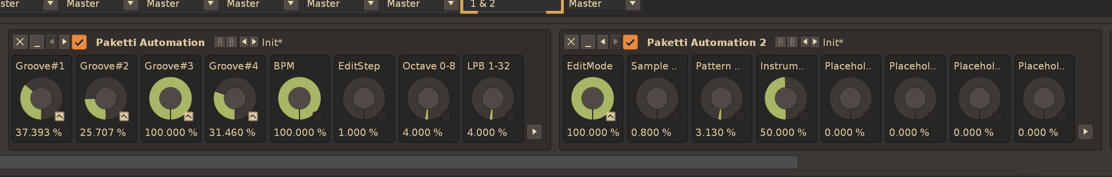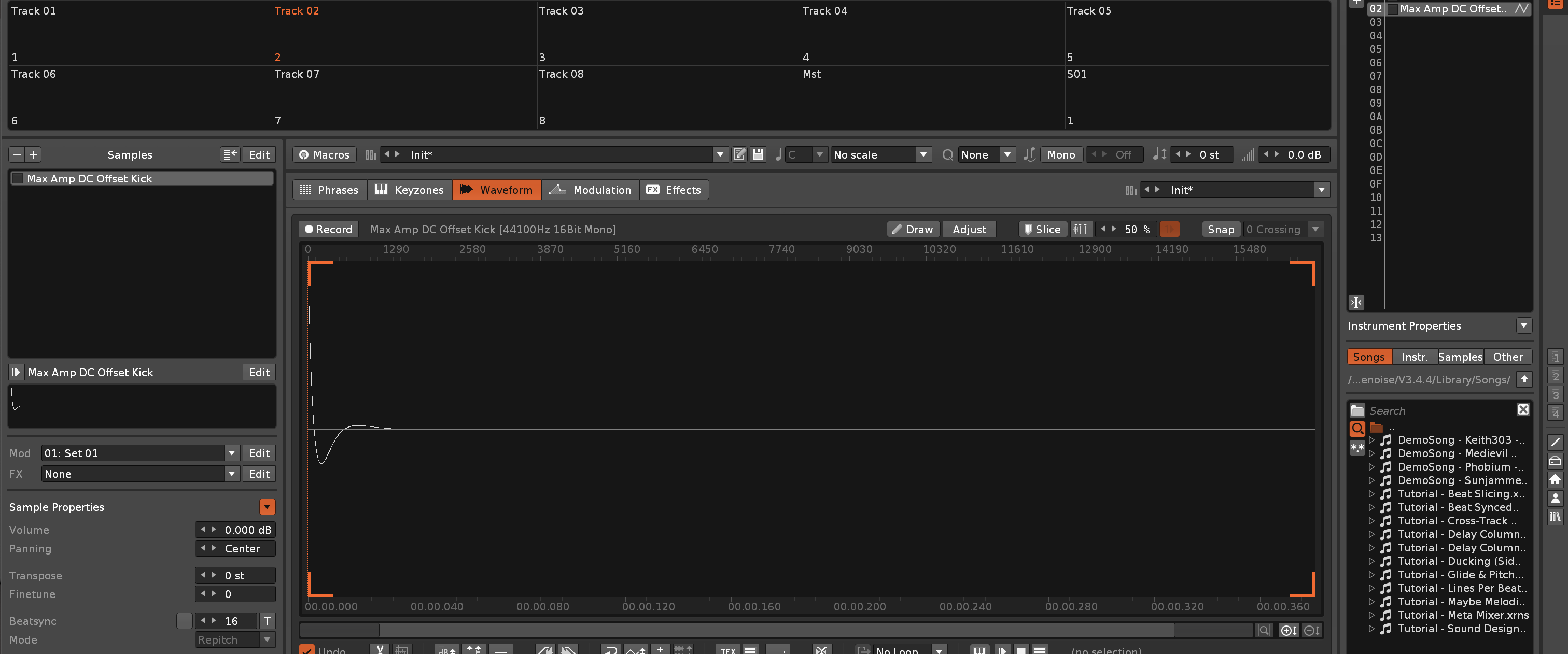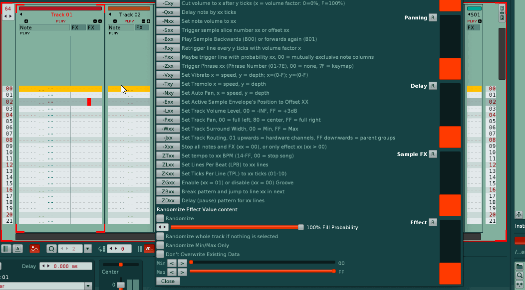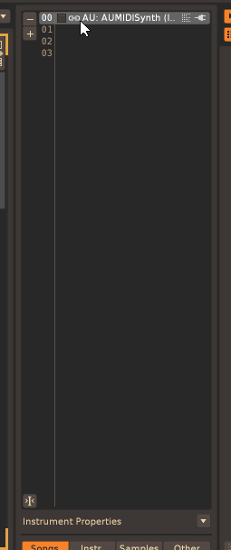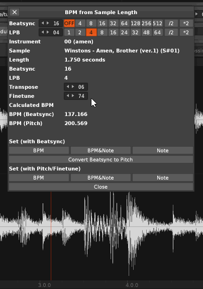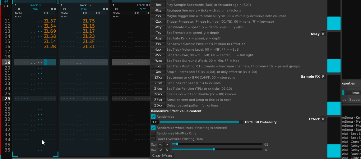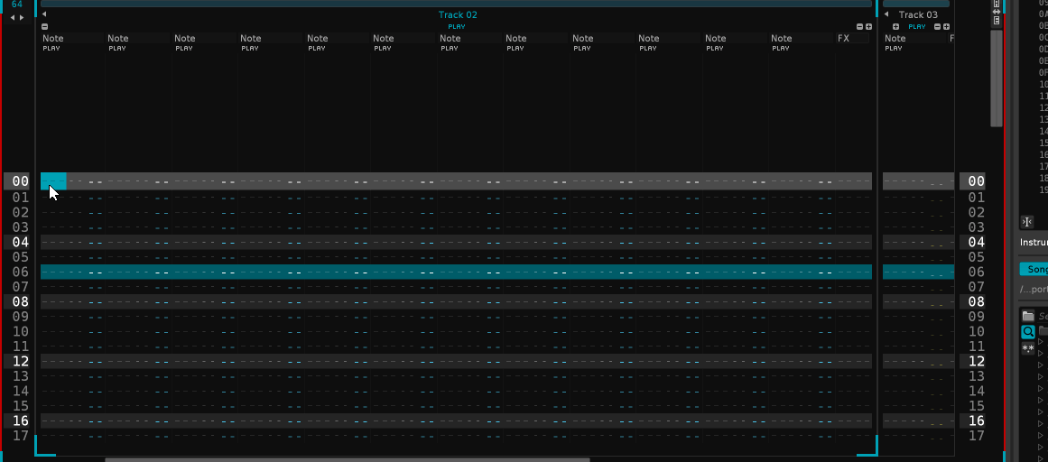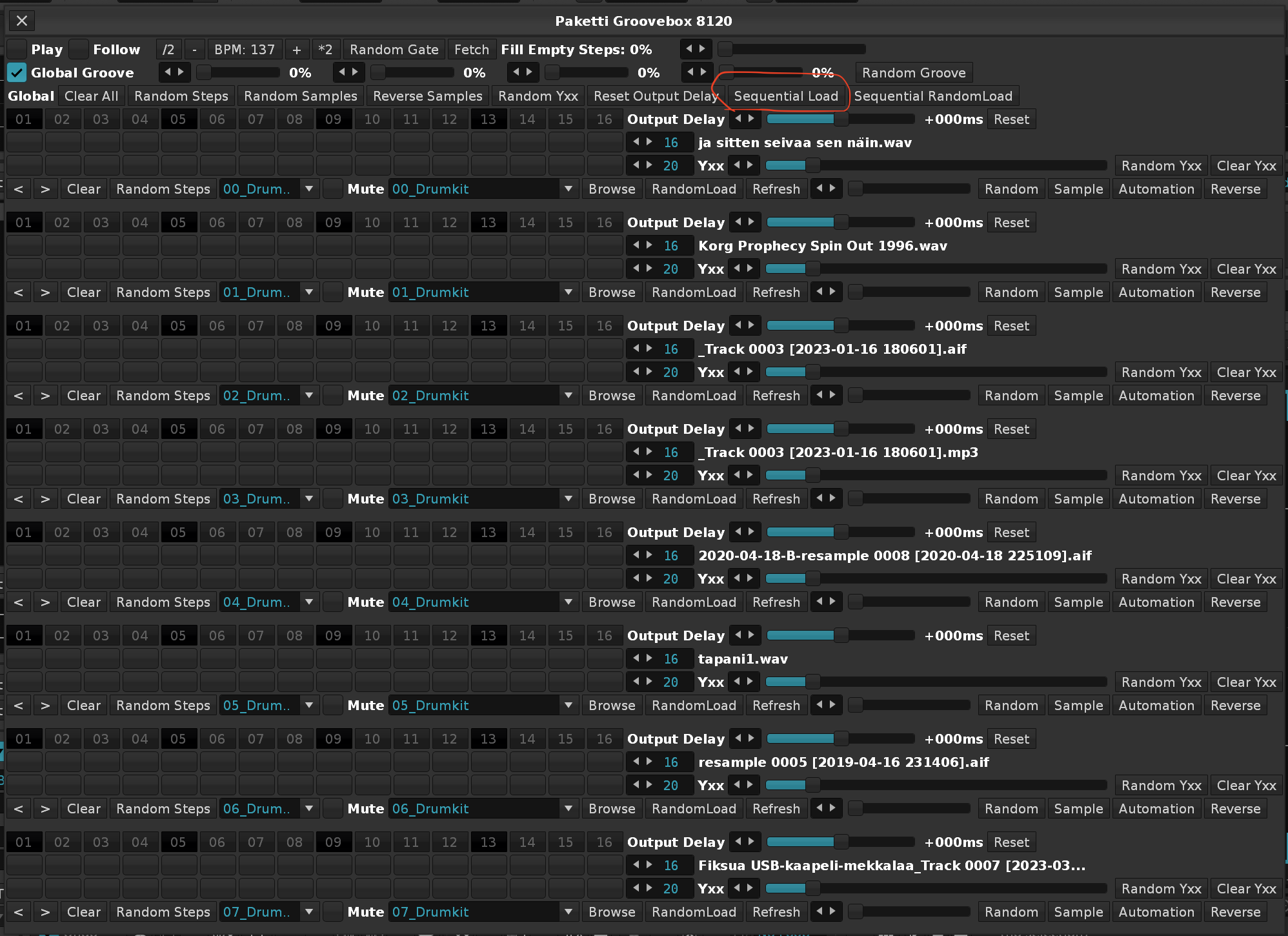 [ and ] format, so if you want to loop [] single pattern, that's what gets looped, if you have a multiple bunch of patterns, start with [ in the name and finish with ] in the name somewhere else.*Instr. Macros devices for each track, and read the BPM from the Wavefile header, or read the BPM from the folder the files are in, then calculate the length of the samples, and add the correct amount of patterns to the pattern sequence, and print, automatically, C-4 (instrumentnumber) 0G01 to every track that has been created, and enable Autoseek for each of the tracks.