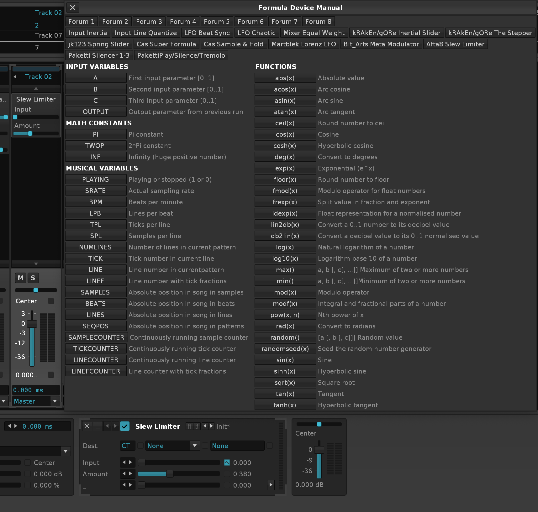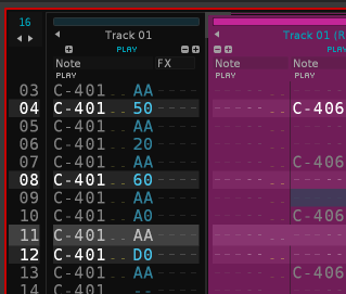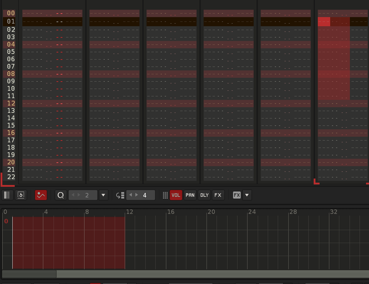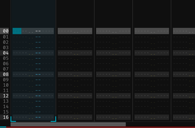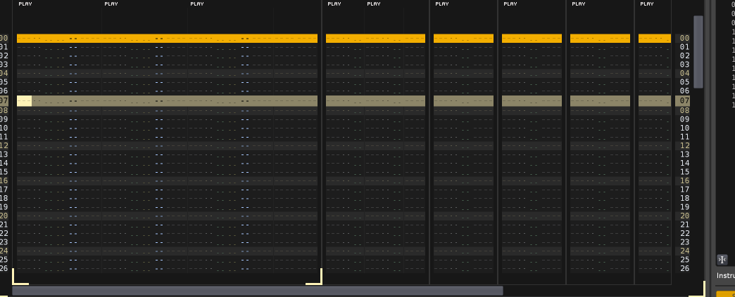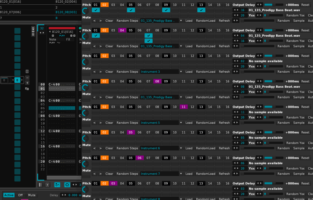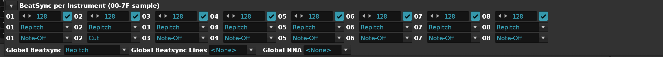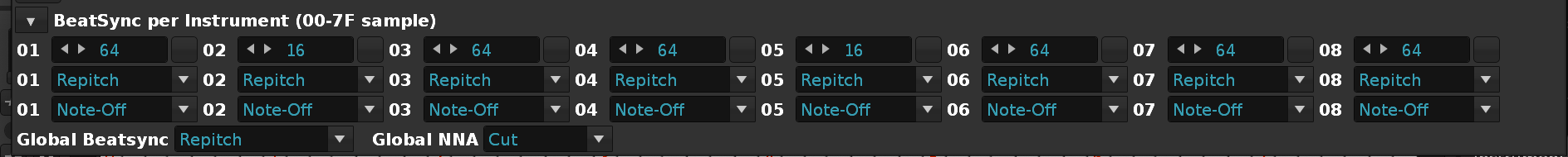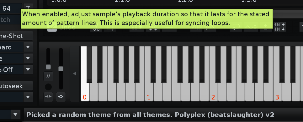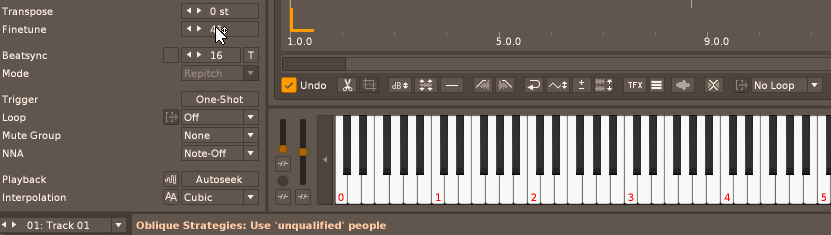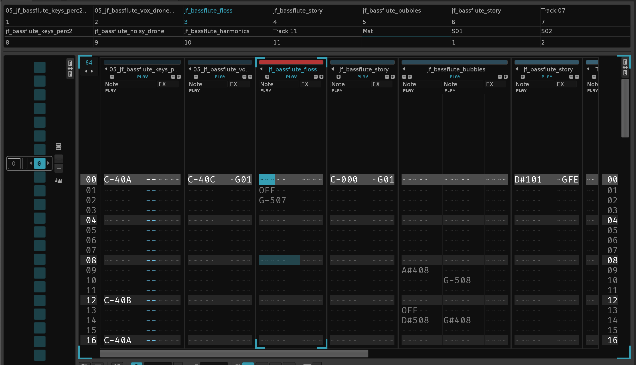[ and ] format, so if you want to loop [] single pattern, that's what gets looped, if you have a multiple bunch of patterns, start with [ in the name and finish with ] in the name somewhere else.*Instr. Macros devices for each track, and read the BPM from the Wavefile header, or read the BPM from the folder the files are in, then calculate the length of the samples, and add the correct amount of patterns to the pattern sequence, and print, automatically, C-4 (instrumentnumber) 0G01 to every track that has been created, and enable Autoseek for each of the tracks.