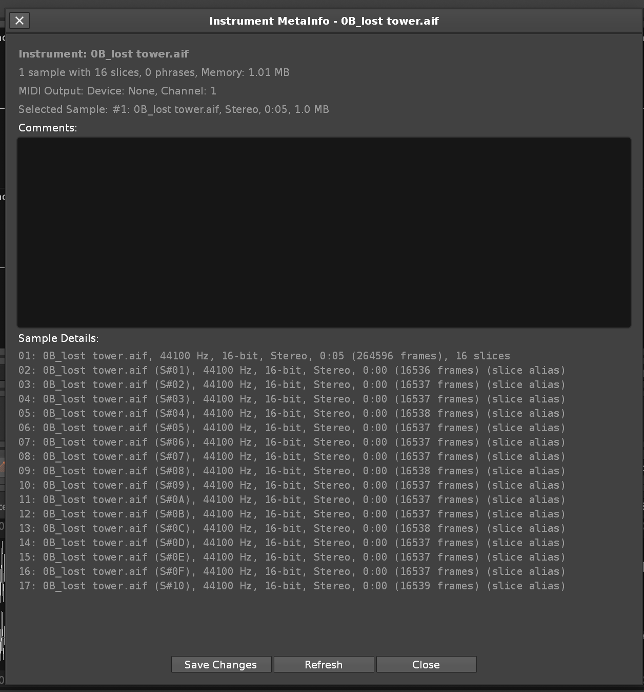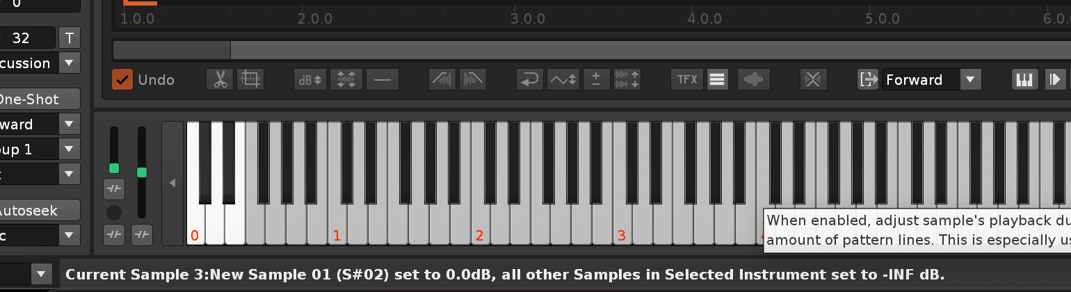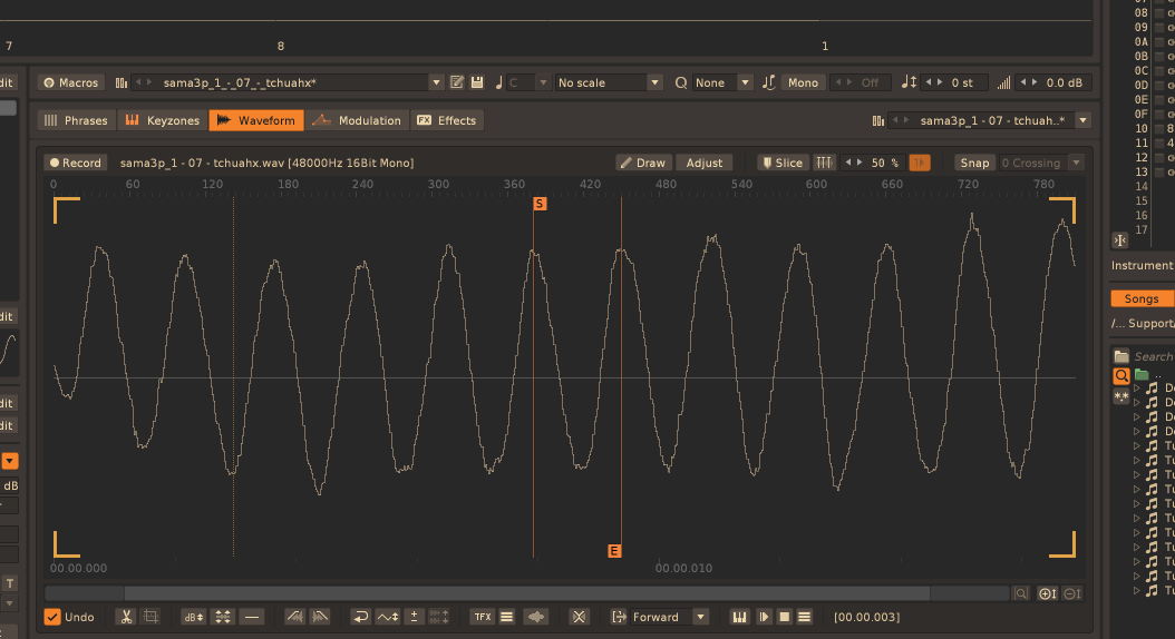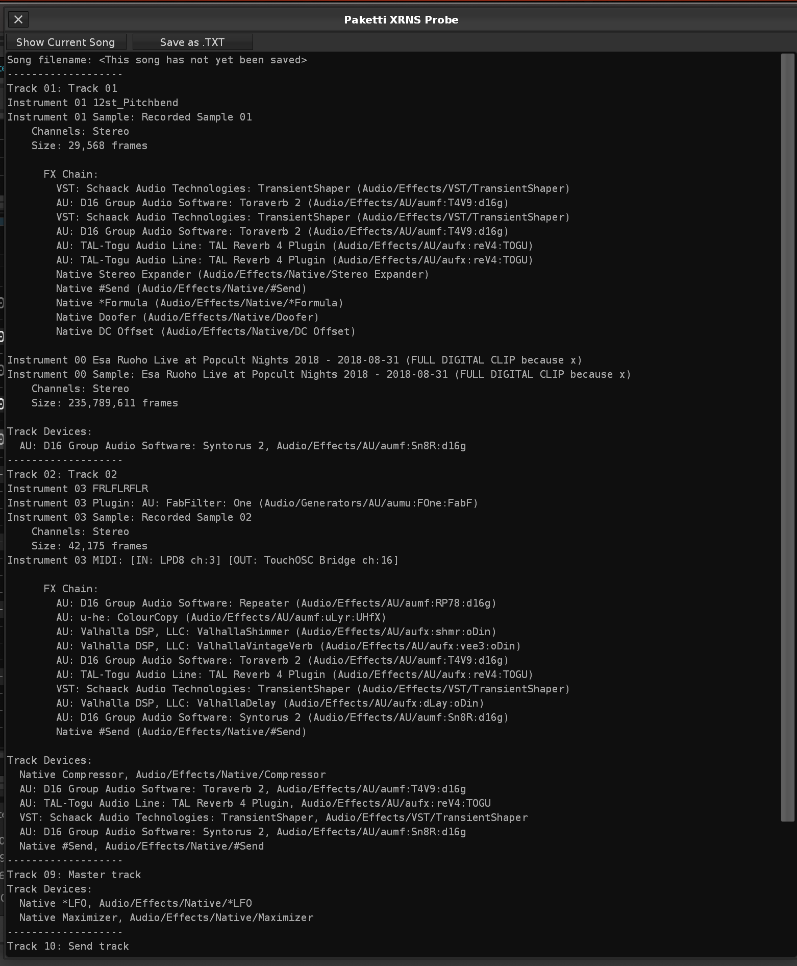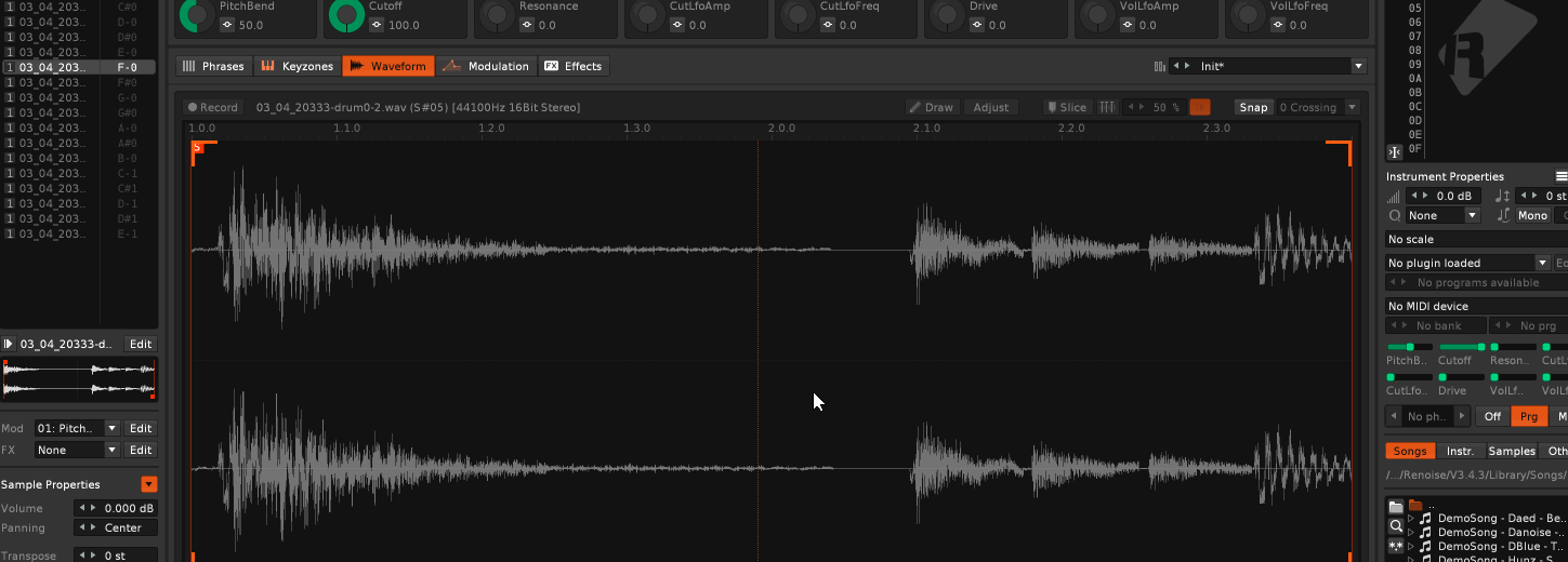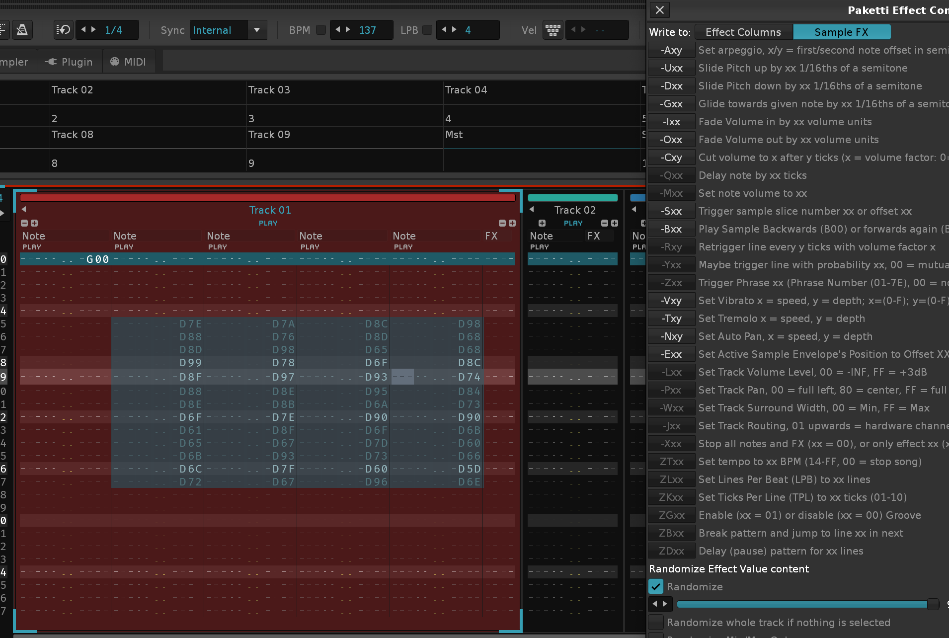 [ and ] format, so if you want to loop [] single pattern, that's what gets looped, if you have a multiple bunch of patterns, start with [ in the name and finish with ] in the name somewhere else.*Instr. Macros devices for each track, and read the BPM from the Wavefile header, or read the BPM from the folder the files are in, then calculate the length of the samples, and add the correct amount of patterns to the pattern sequence, and print, automatically, C-4 (instrumentnumber) 0G01 to every track that has been created, and enable Autoseek for each of the tracks.