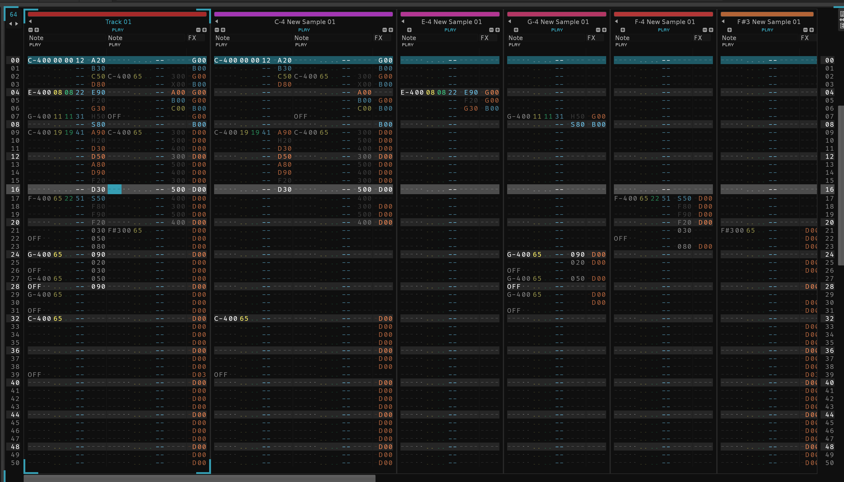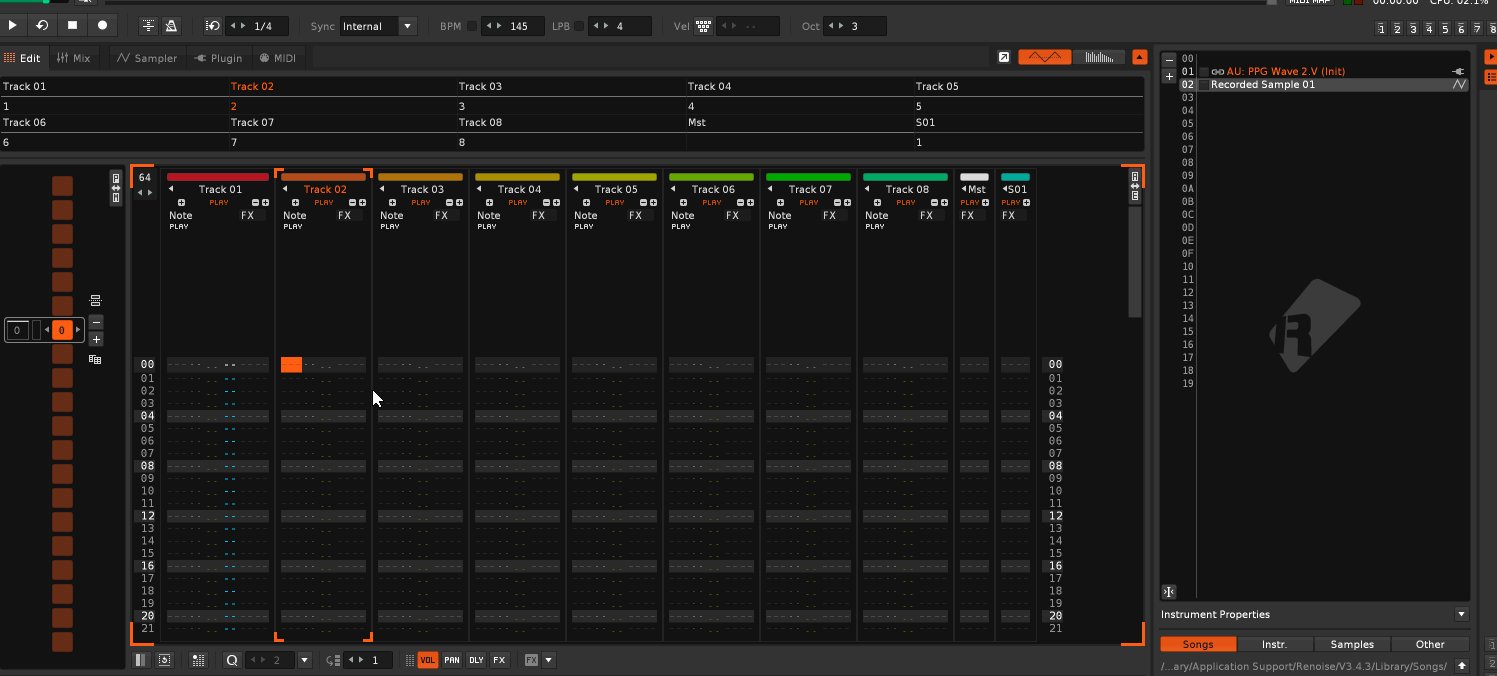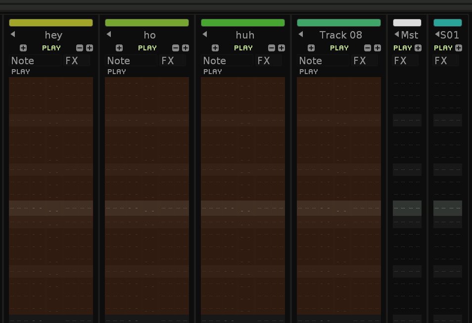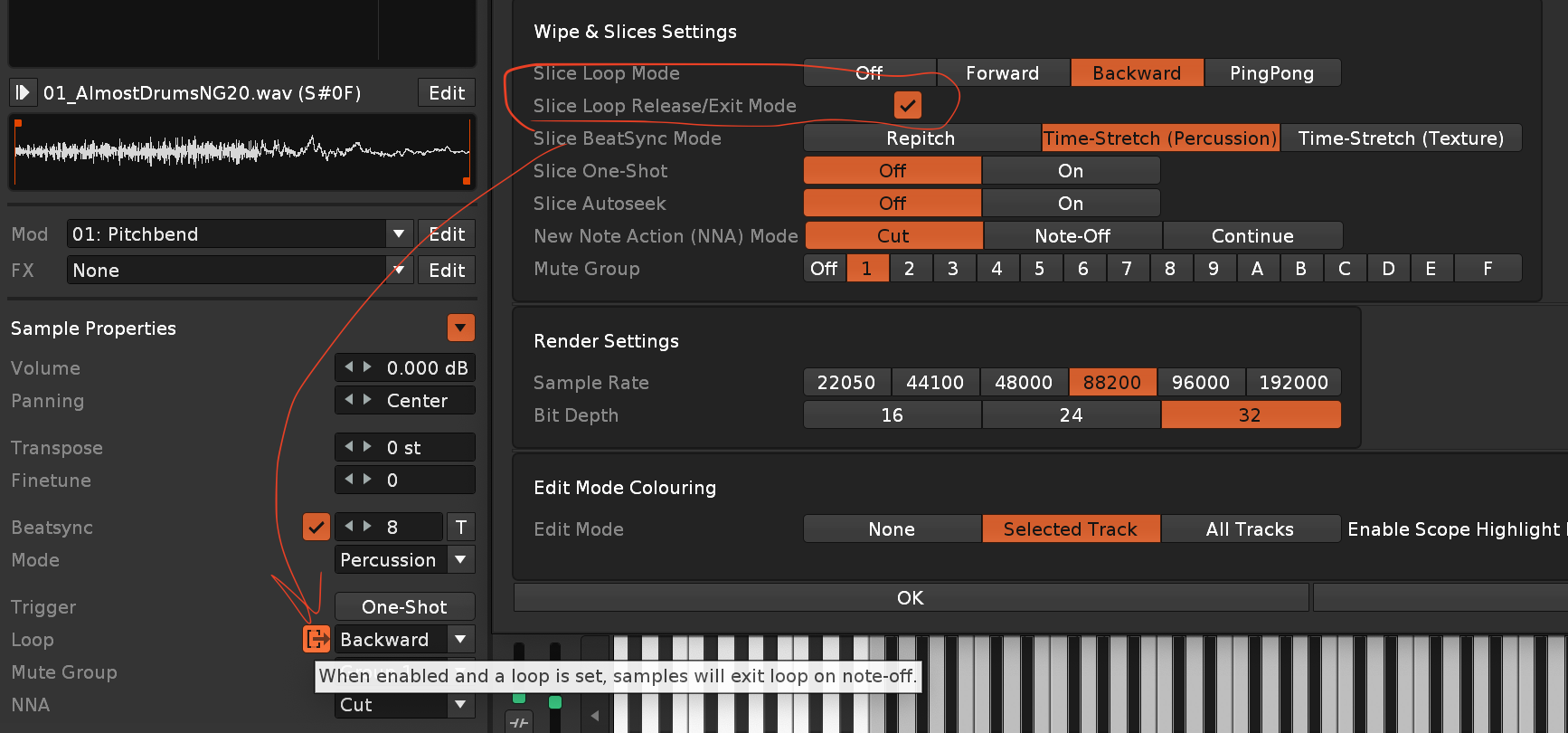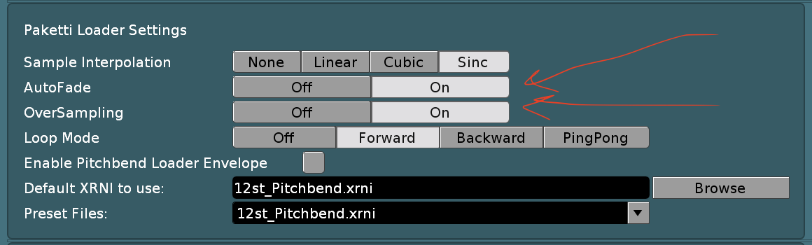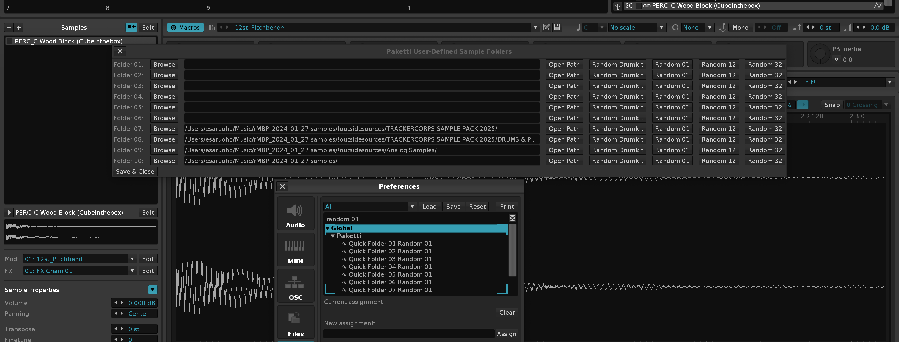 [ and ] format, so if you want to loop [] single pattern, that's what gets looped, if you have a multiple bunch of patterns, start with [ in the name and finish with ] in the name somewhere else.*Instr. Macros devices for each track, and read the BPM from the Wavefile header, or read the BPM from the folder the files are in, then calculate the length of the samples, and add the correct amount of patterns to the pattern sequence, and print, automatically, C-4 (instrumentnumber) 0G01 to every track that has been created, and enable Autoseek for each of the tracks.