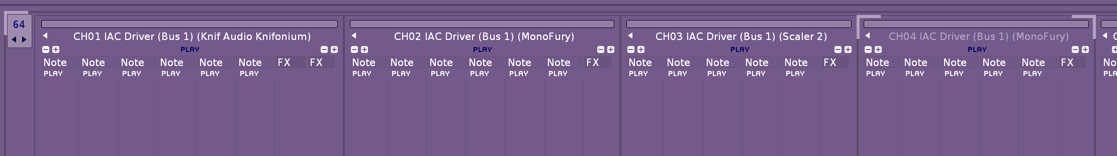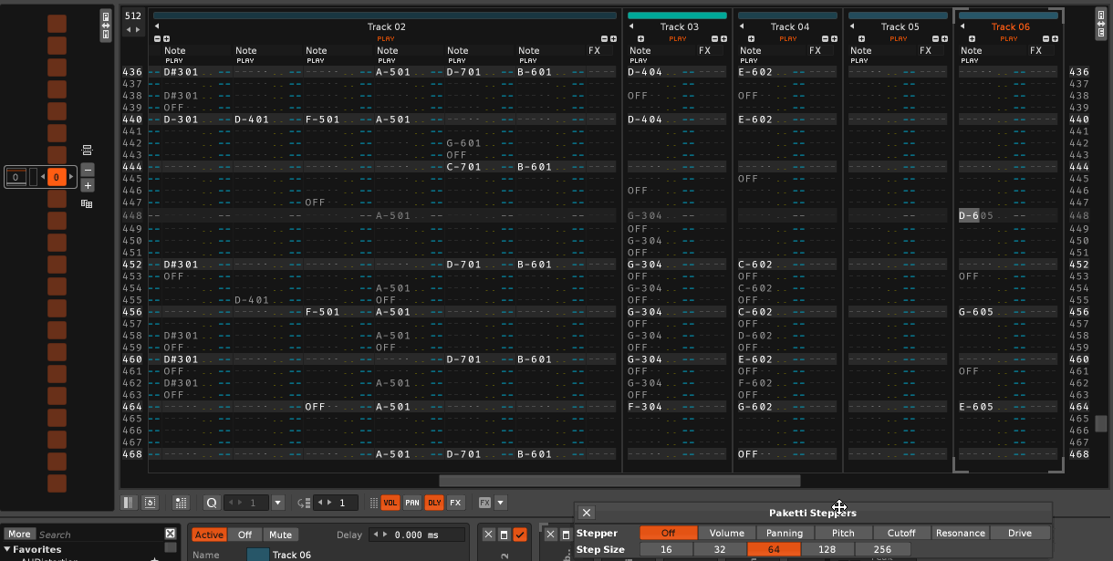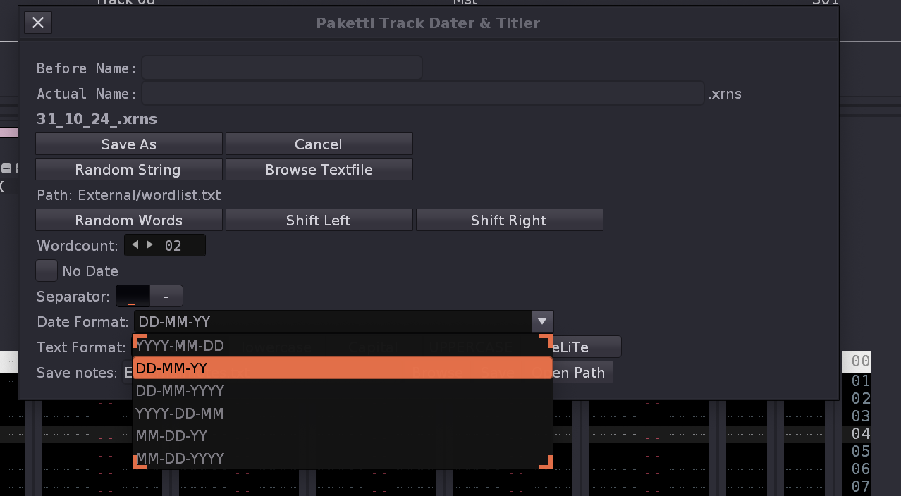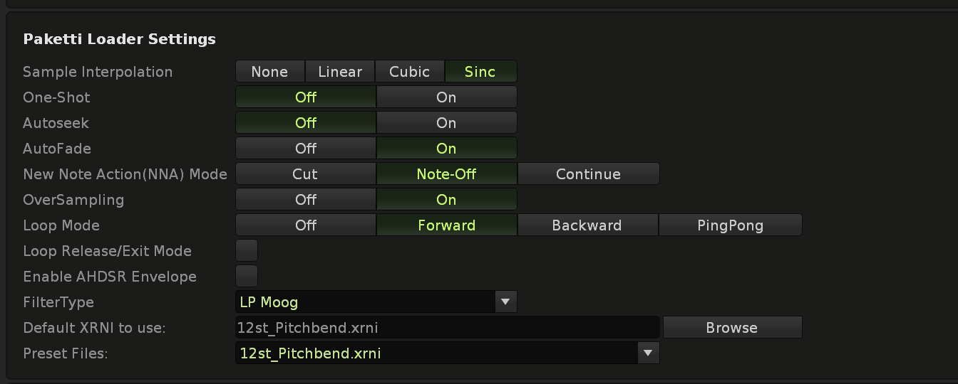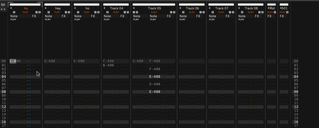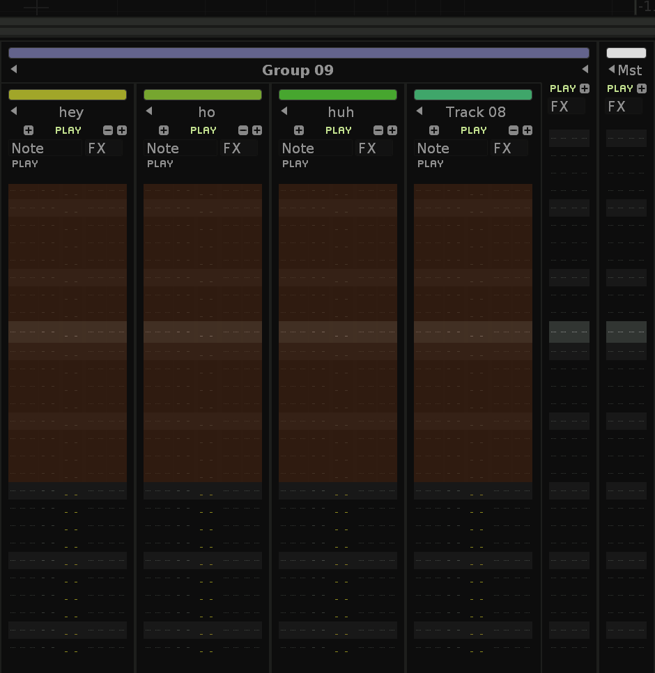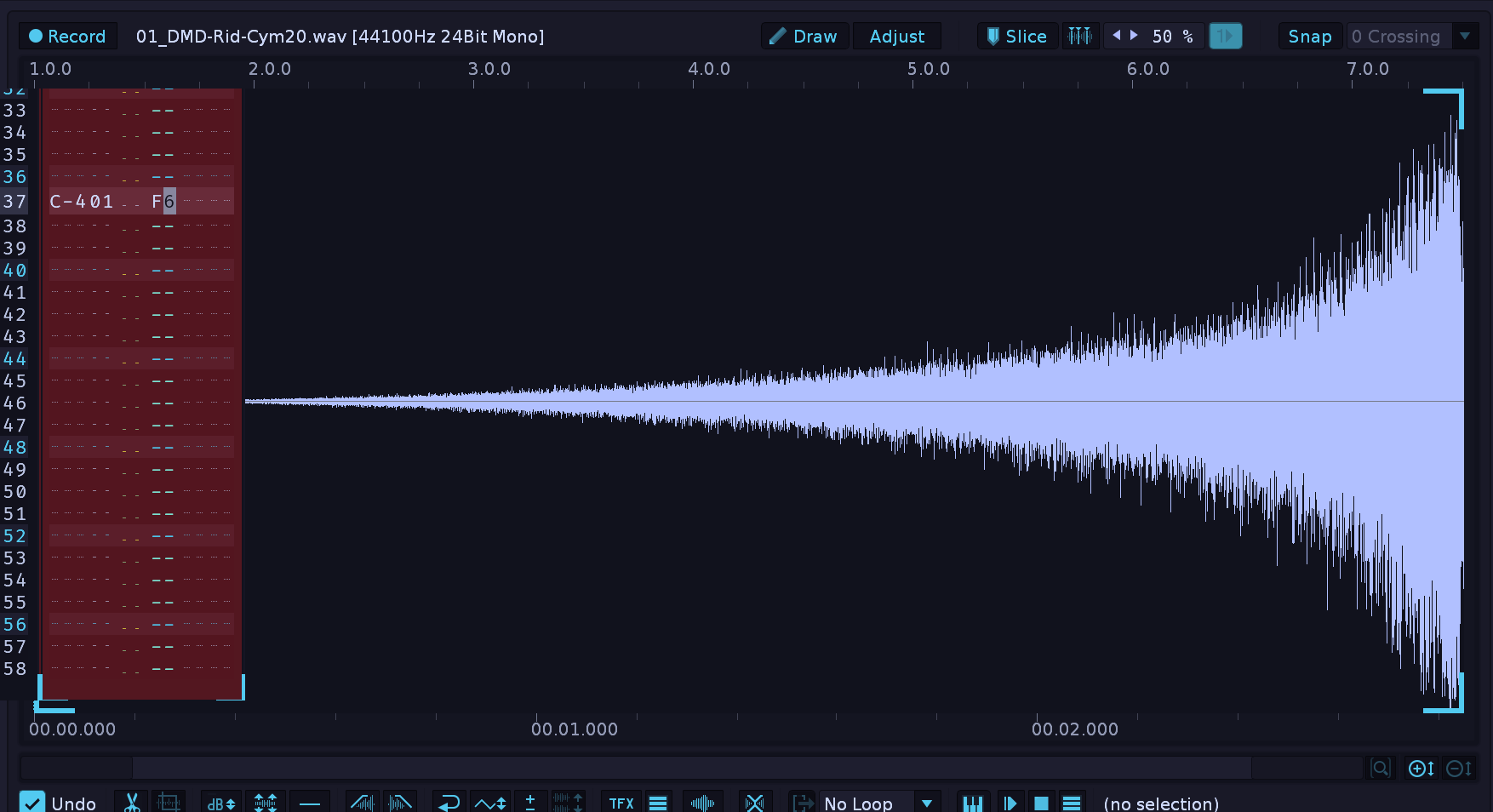 [ and ] format, so if you want to loop [] single pattern, that's what gets looped, if you have a multiple bunch of patterns, start with [ in the name and finish with ] in the name somewhere else.*Instr. Macros devices for each track, and read the BPM from the Wavefile header, or read the BPM from the folder the files are in, then calculate the length of the samples, and add the correct amount of patterns to the pattern sequence, and print, automatically, C-4 (instrumentnumber) 0G01 to every track that has been created, and enable Autoseek for each of the tracks.