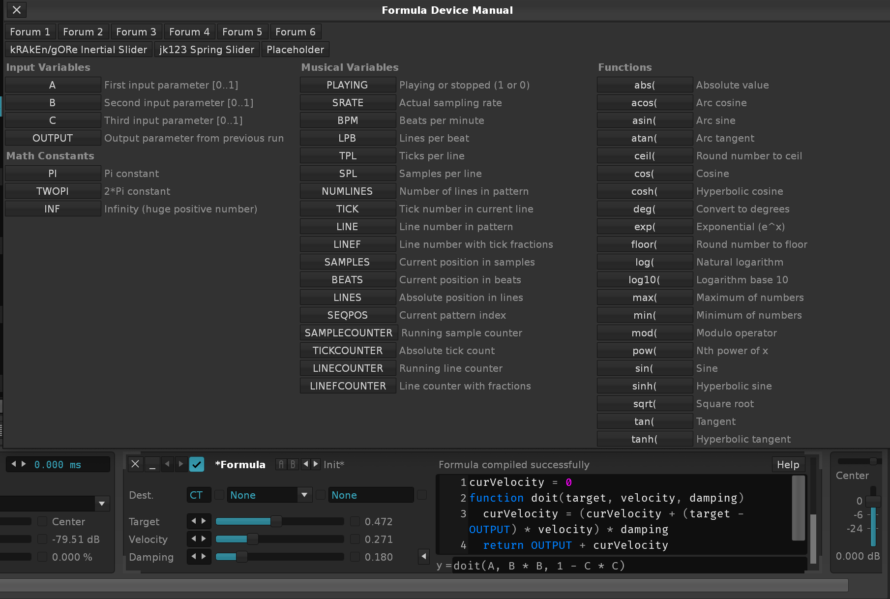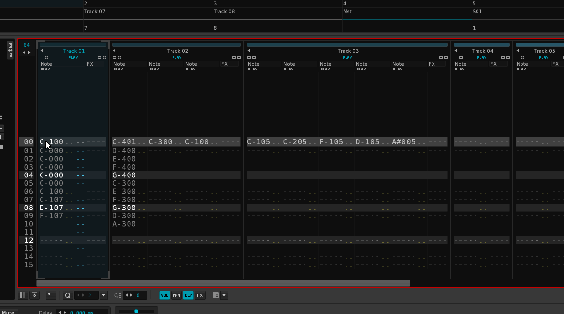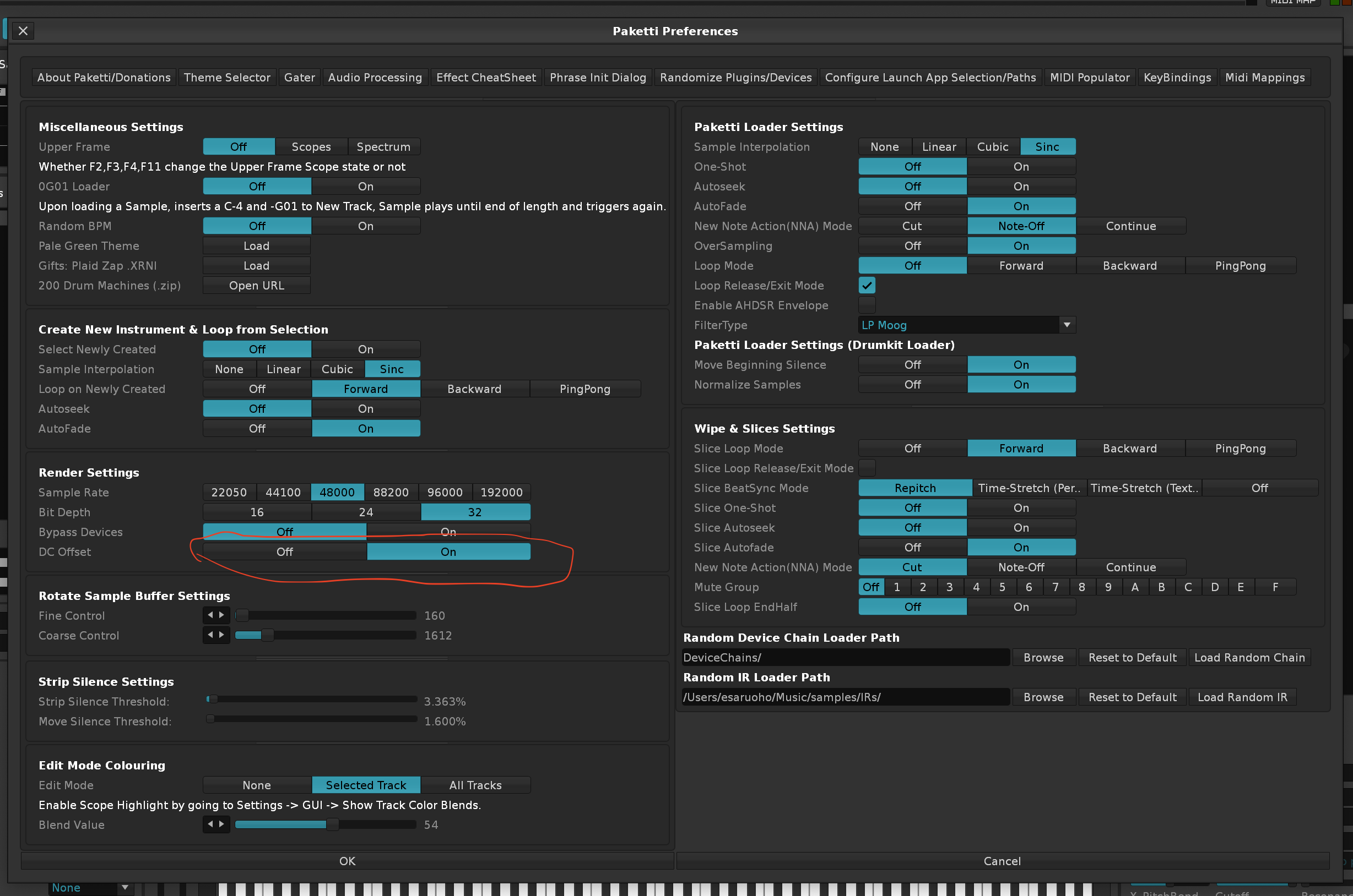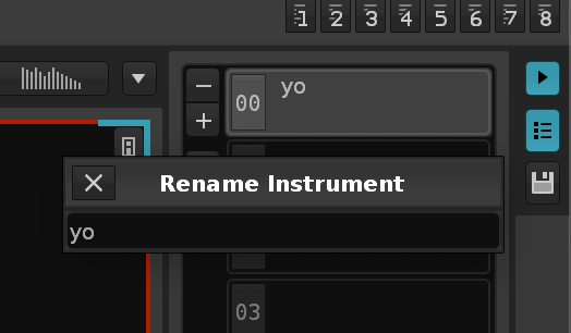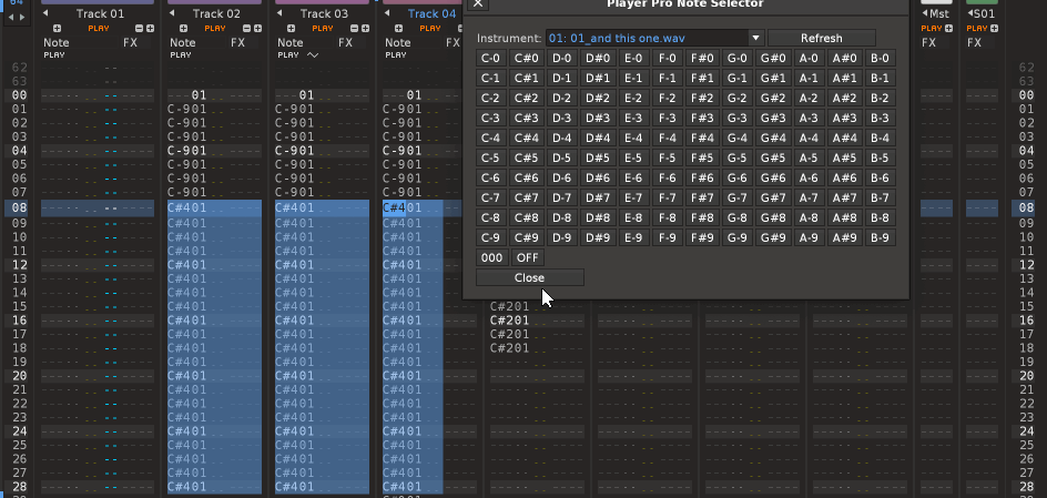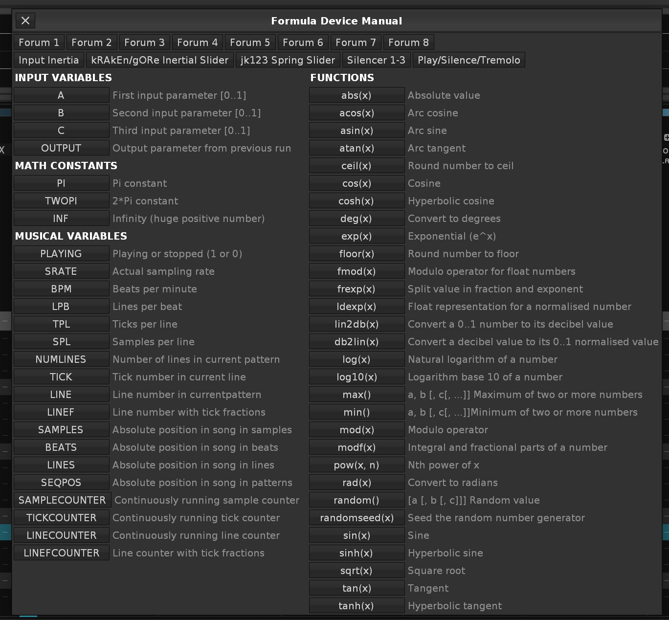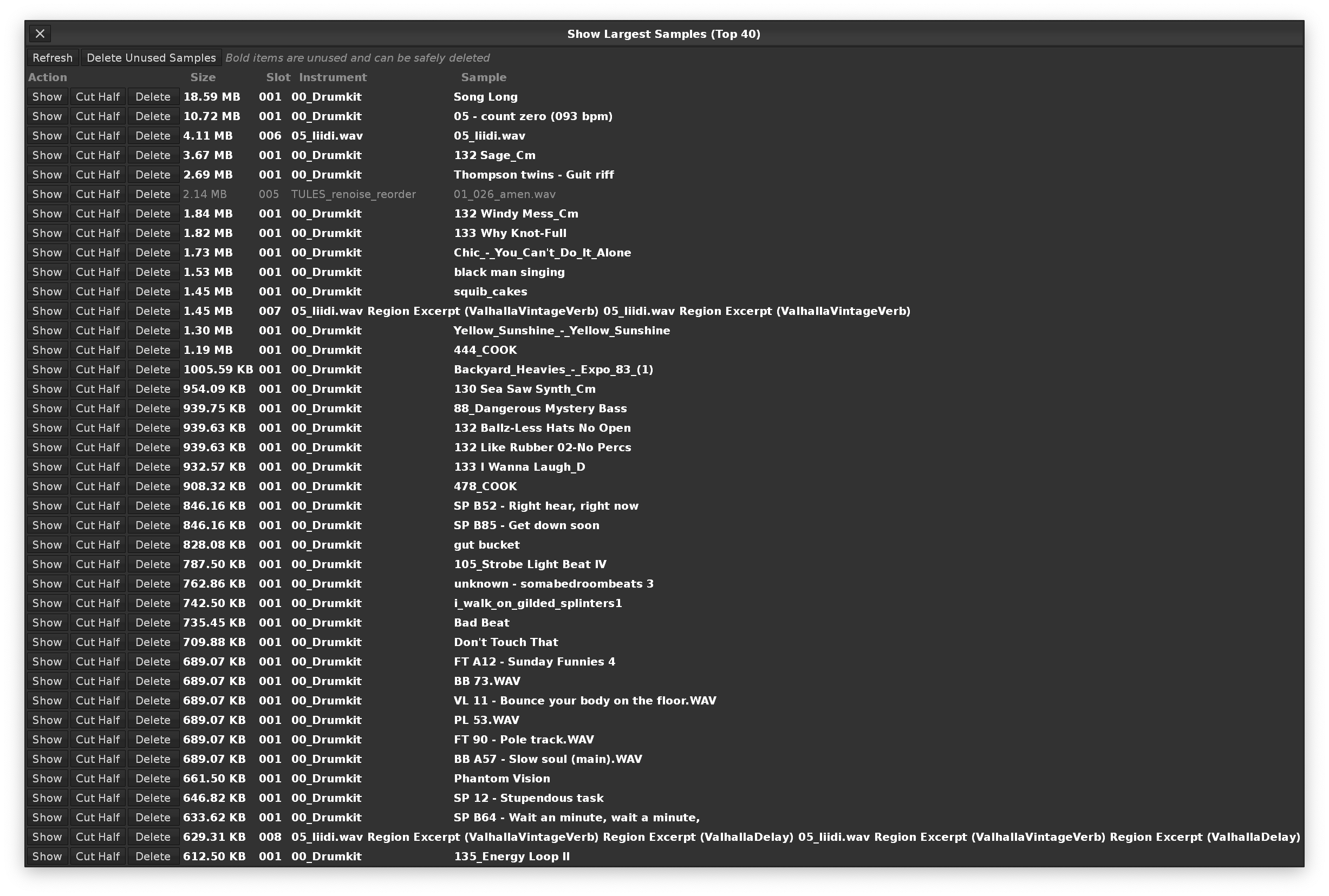 [ and ] format, so if you want to loop [] single pattern, that's what gets looped, if you have a multiple bunch of patterns, start with [ in the name and finish with ] in the name somewhere else.*Instr. Macros devices for each track, and read the BPM from the Wavefile header, or read the BPM from the folder the files are in, then calculate the length of the samples, and add the correct amount of patterns to the pattern sequence, and print, automatically, C-4 (instrumentnumber) 0G01 to every track that has been created, and enable Autoseek for each of the tracks.