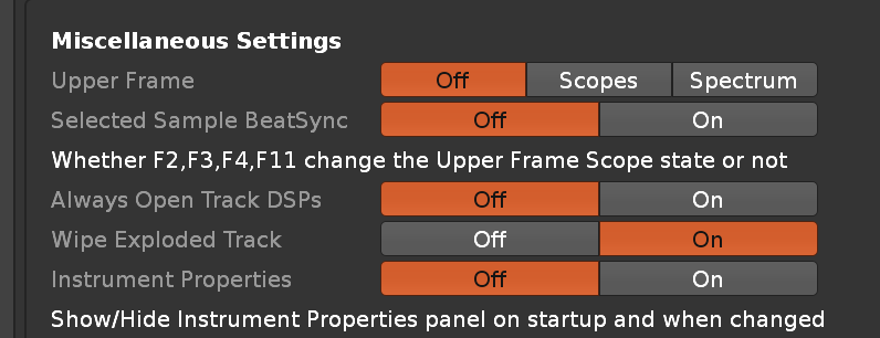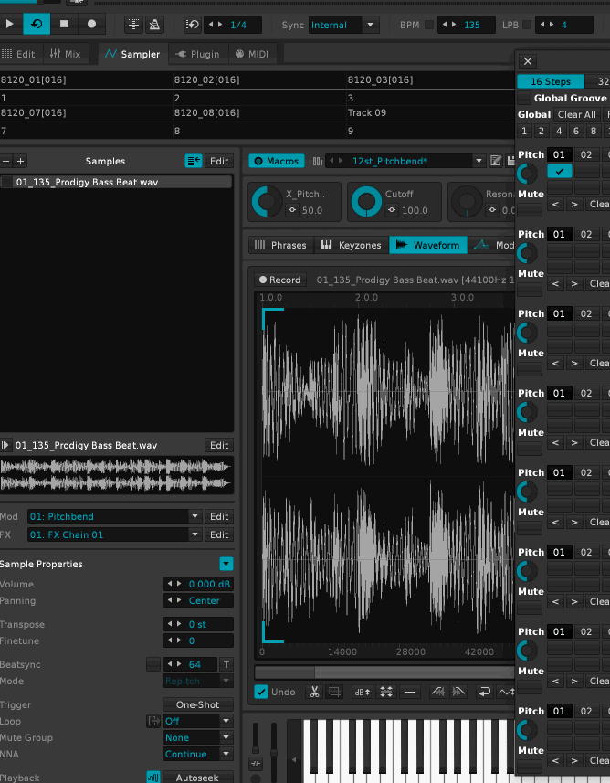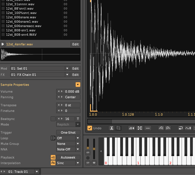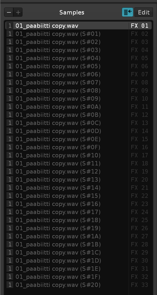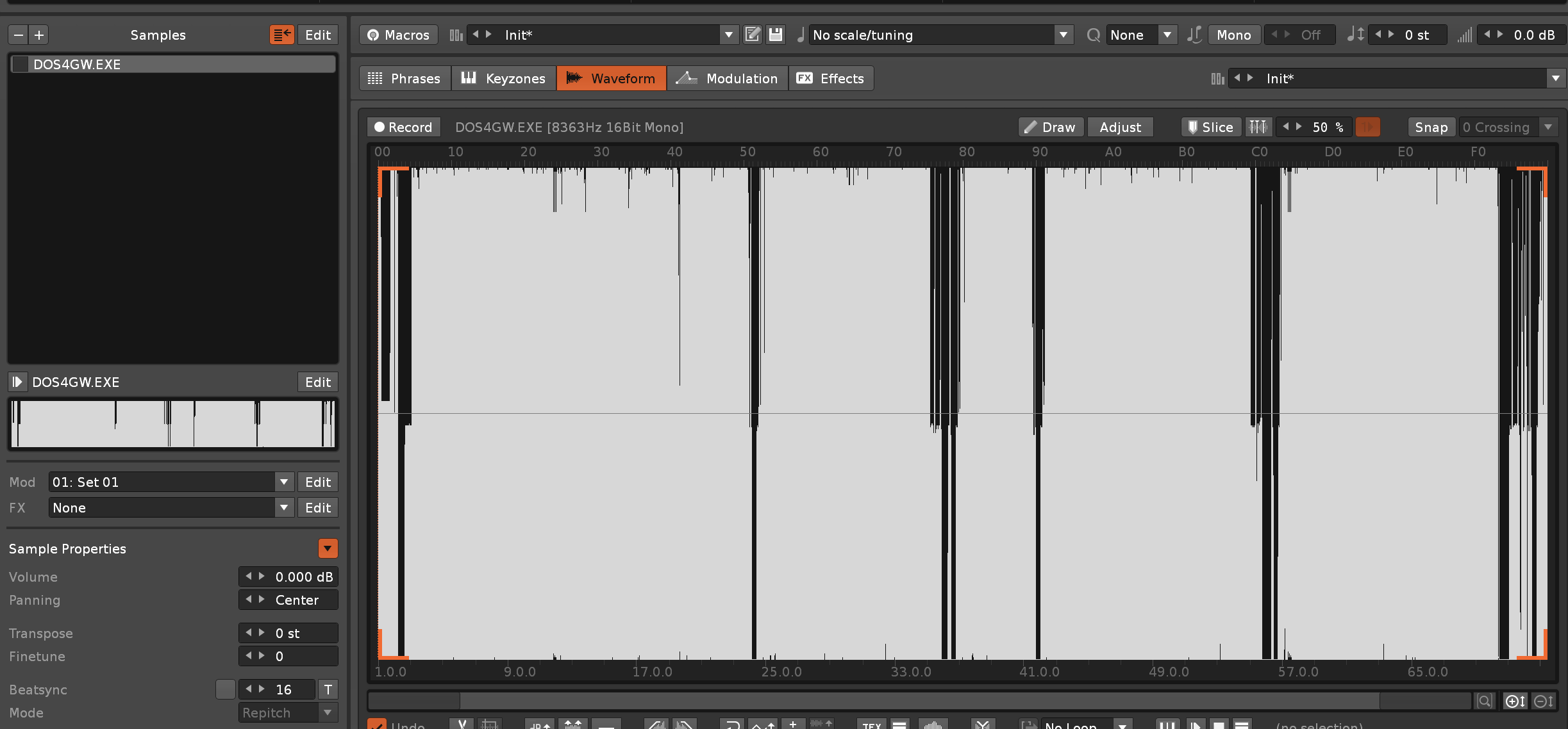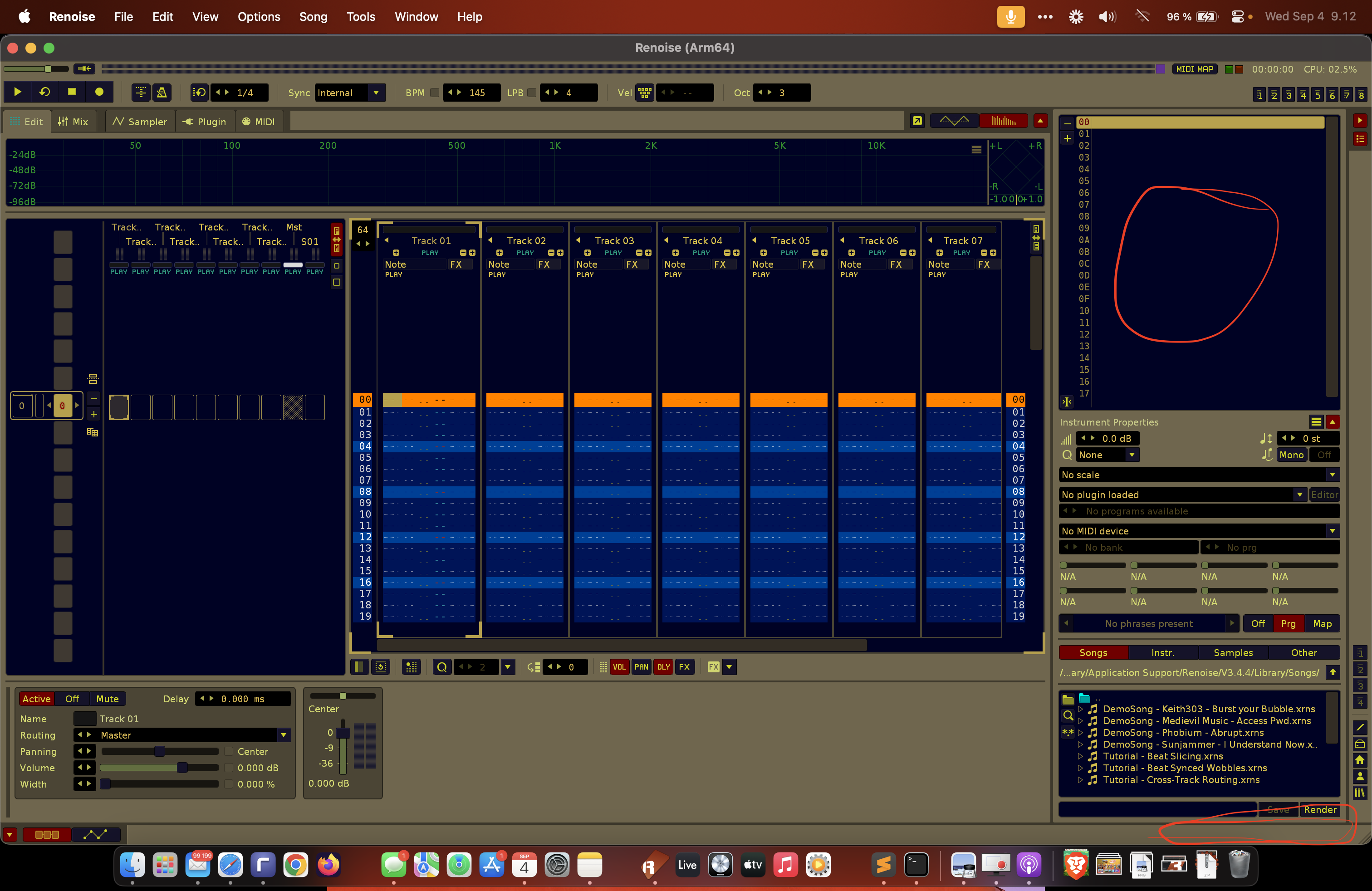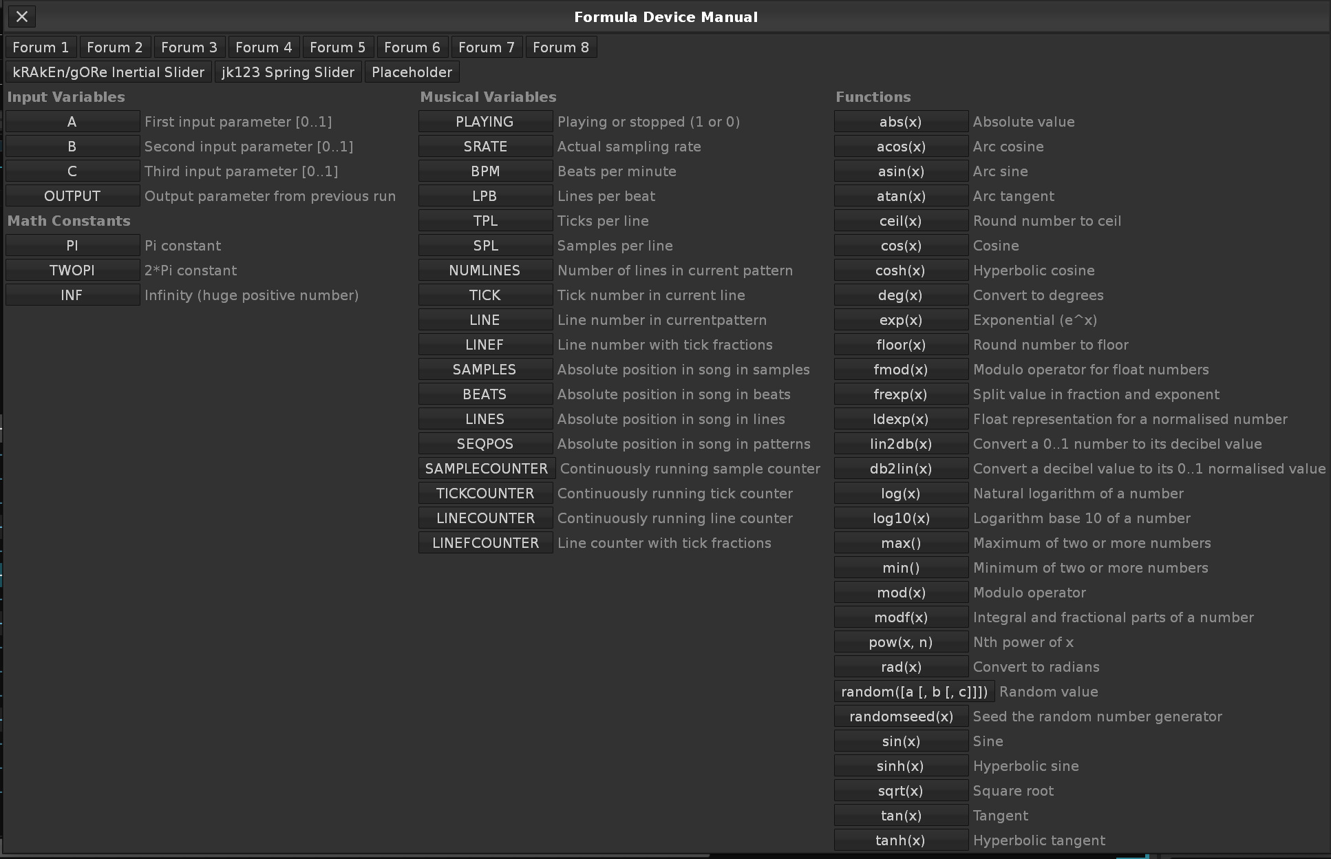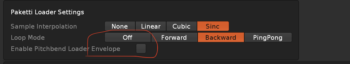 [ and ] format, so if you want to loop [] single pattern, that's what gets looped, if you have a multiple bunch of patterns, start with [ in the name and finish with ] in the name somewhere else.*Instr. Macros devices for each track, and read the BPM from the Wavefile header, or read the BPM from the folder the files are in, then calculate the length of the samples, and add the correct amount of patterns to the pattern sequence, and print, automatically, C-4 (instrumentnumber) 0G01 to every track that has been created, and enable Autoseek for each of the tracks.