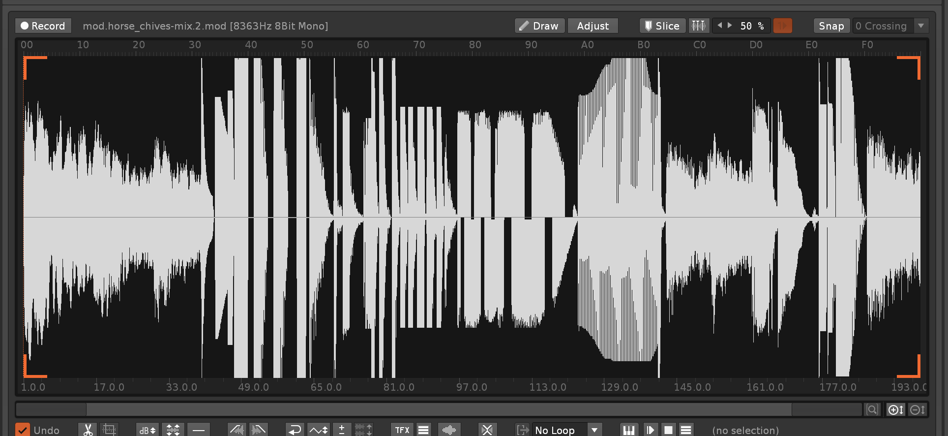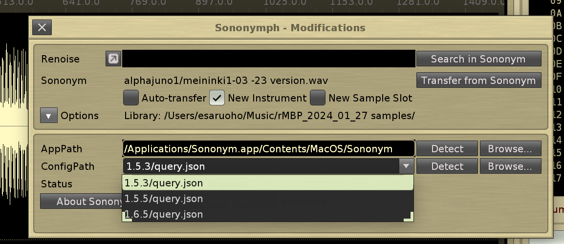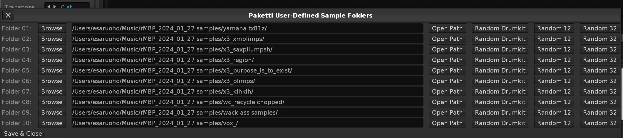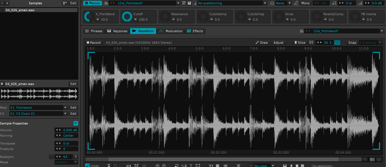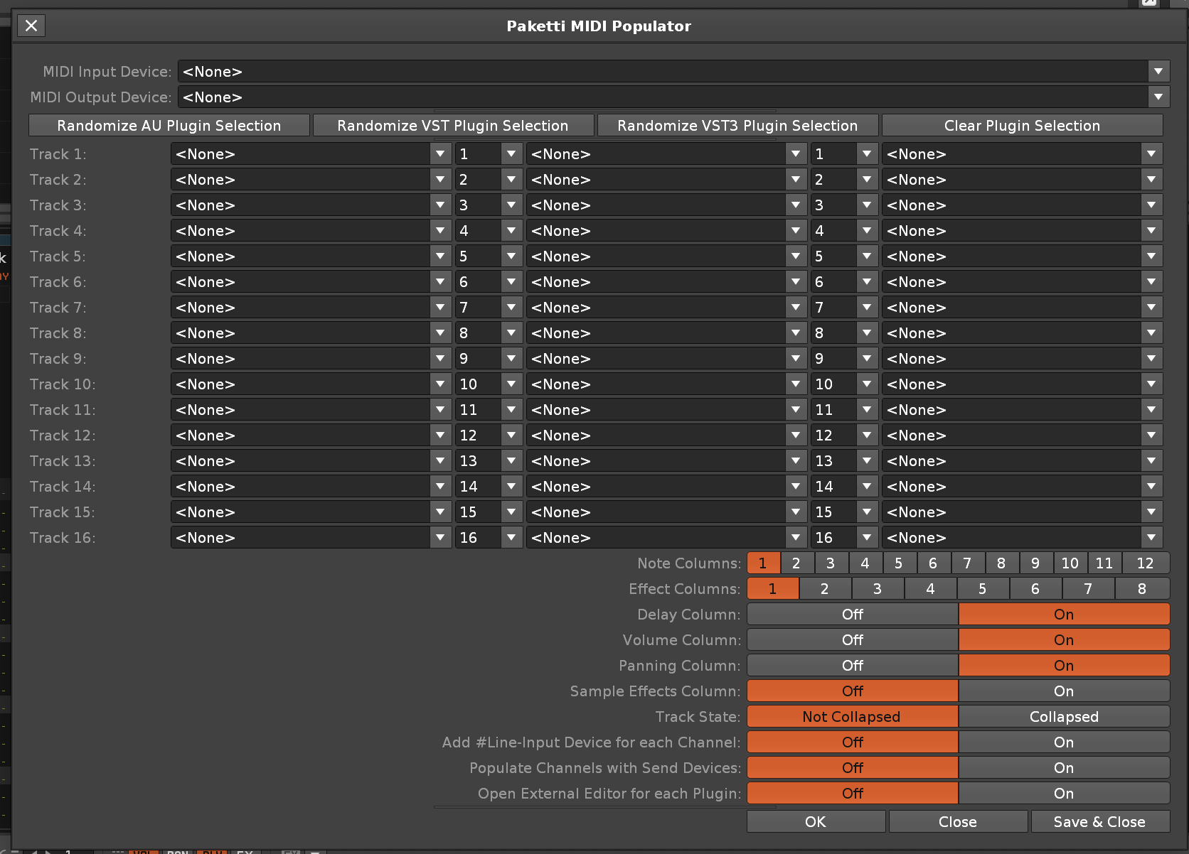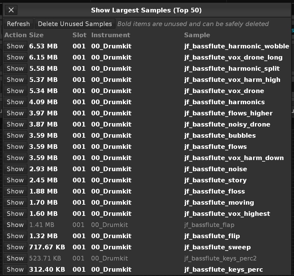 [ and ] format, so if you want to loop [] single pattern, that's what gets looped, if you have a multiple bunch of patterns, start with [ in the name and finish with ] in the name somewhere else.*Instr. Macros devices for each track, and read the BPM from the Wavefile header, or read the BPM from the folder the files are in, then calculate the length of the samples, and add the correct amount of patterns to the pattern sequence, and print, automatically, C-4 (instrumentnumber) 0G01 to every track that has been created, and enable Autoseek for each of the tracks.