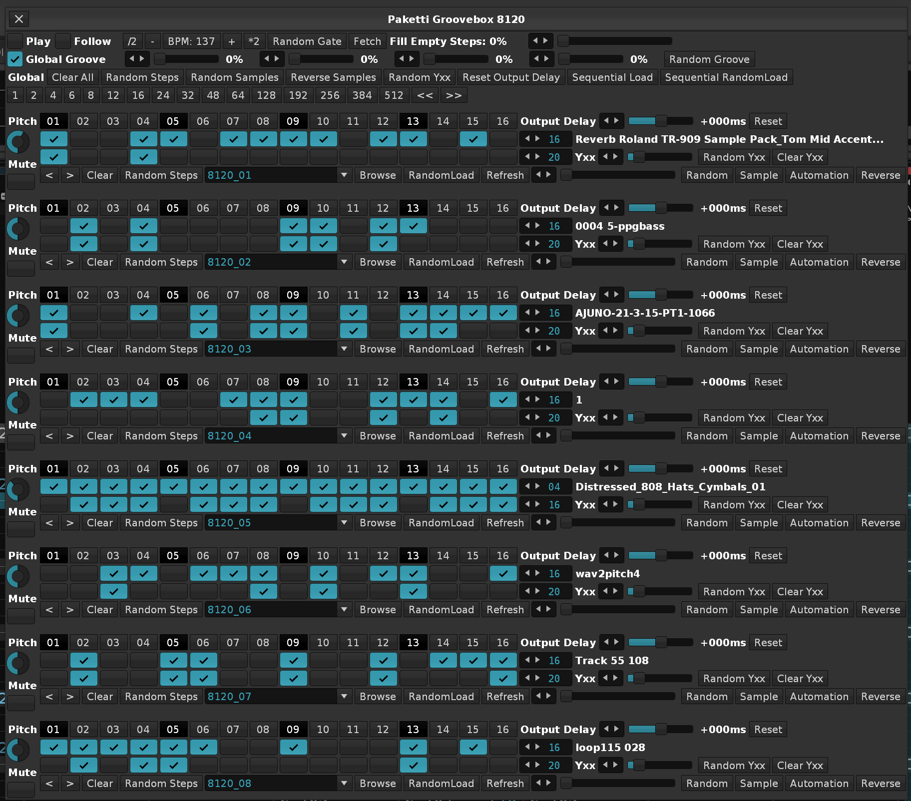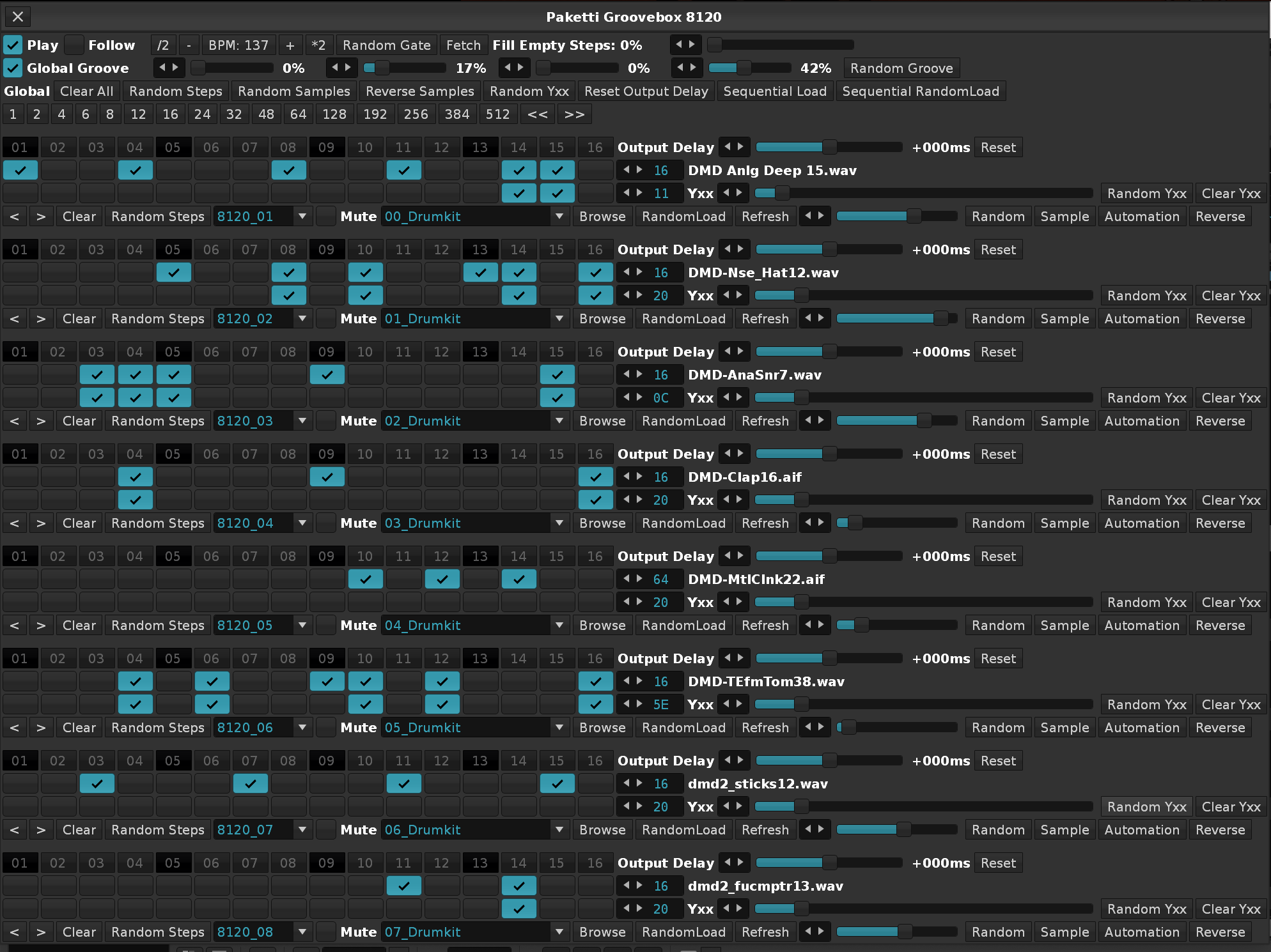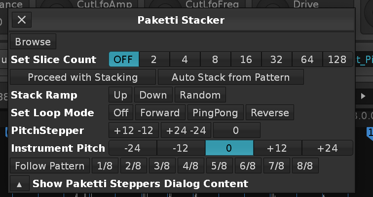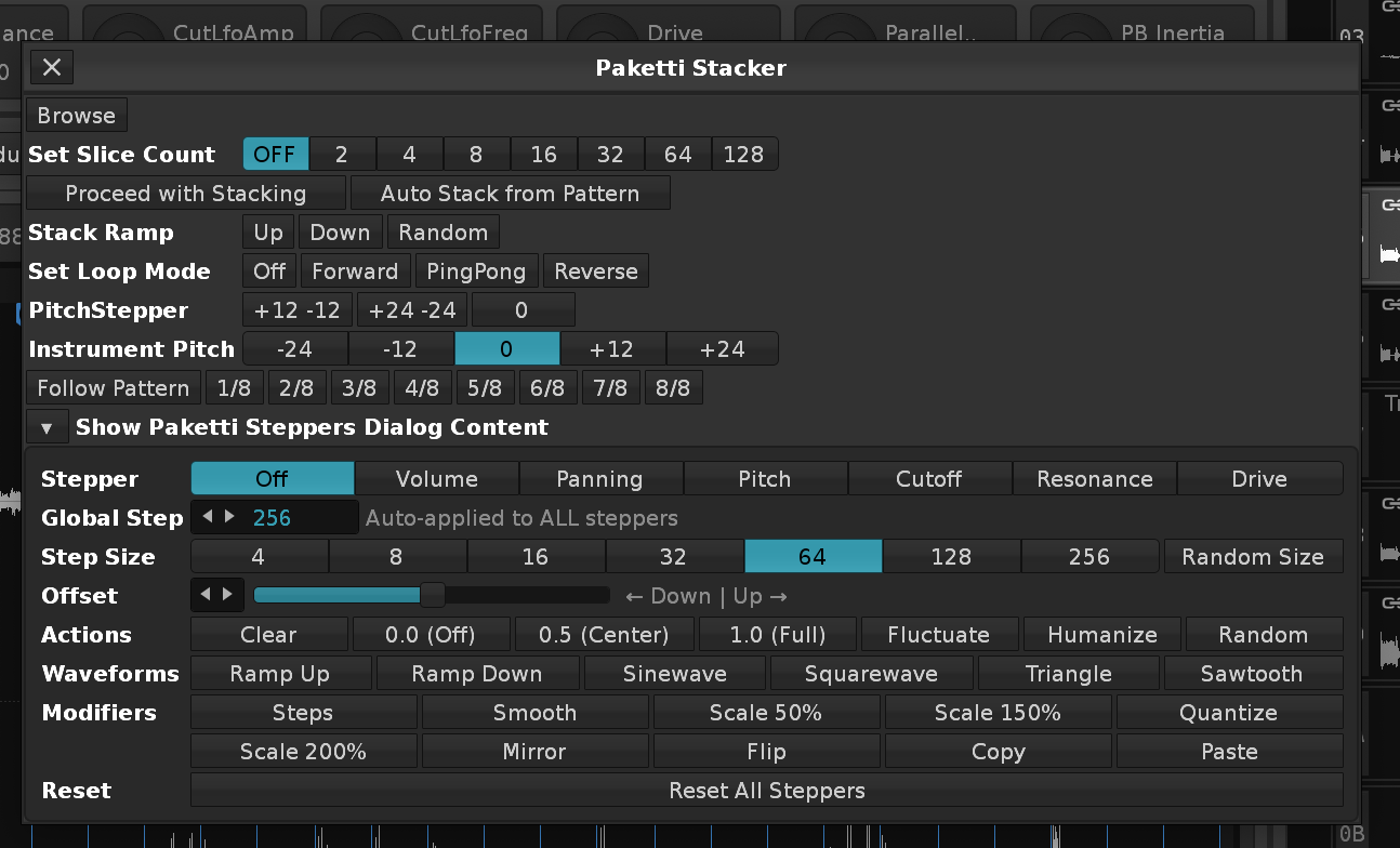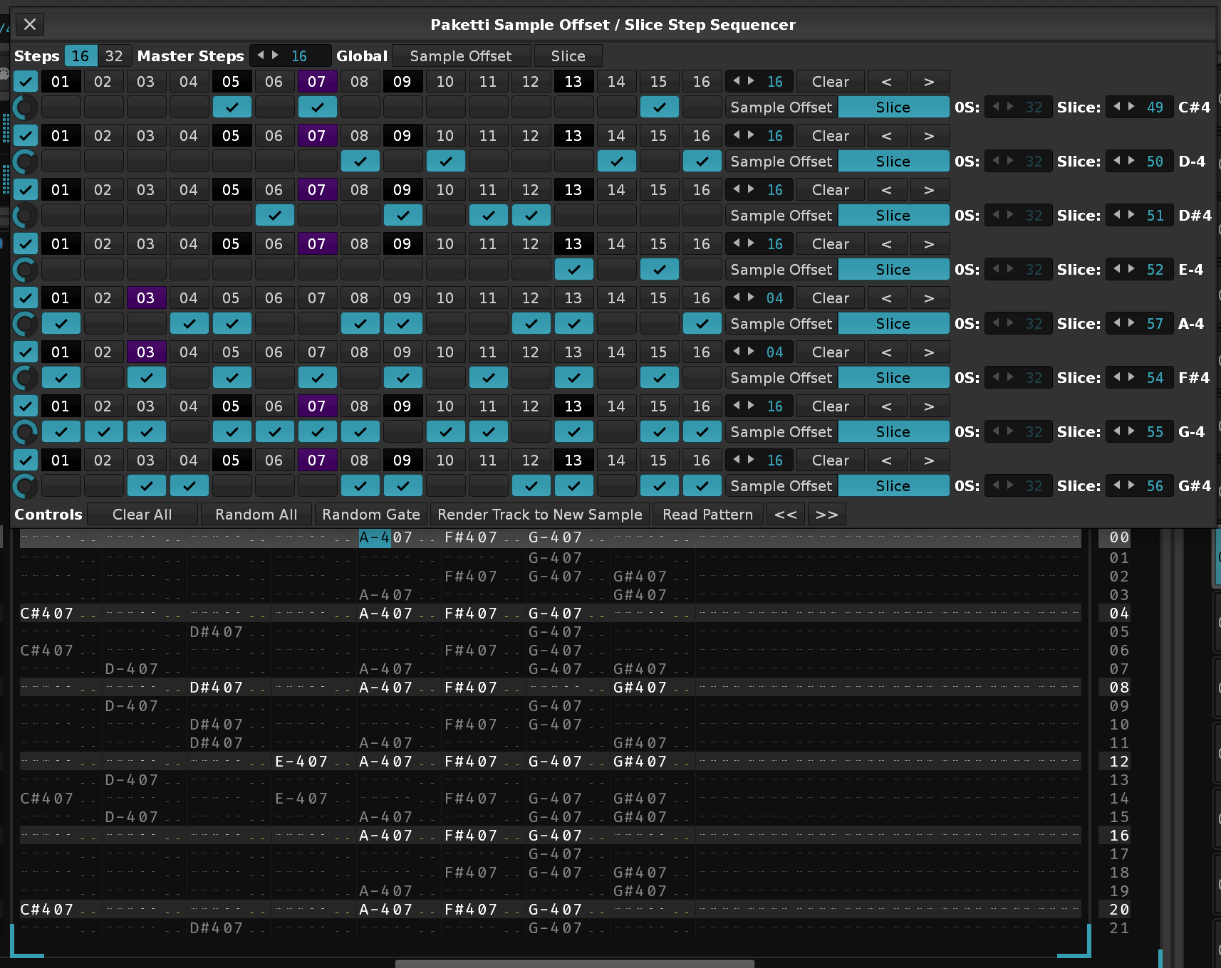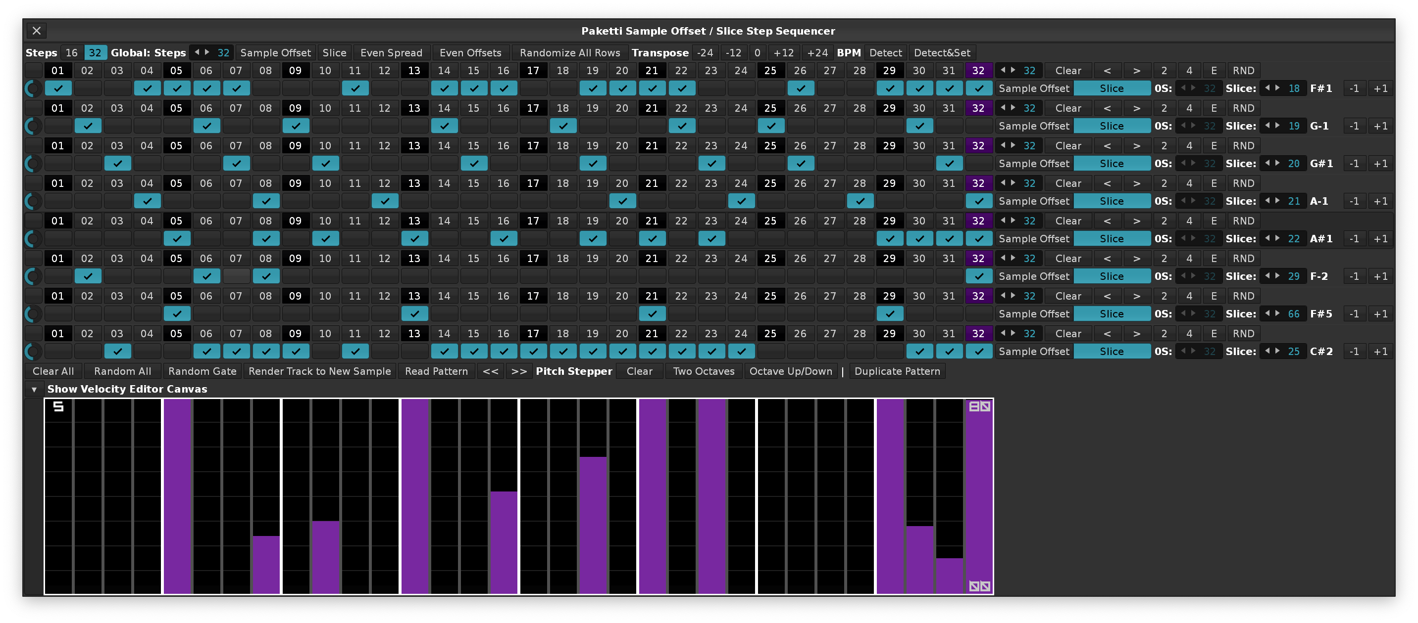 This allows you to pick your favorite 8 slices, or the 8 sample offset values of your choice, and start stepsequencing with them. There's also mute / pitch control for each slice - the pitch is disabled if you hit Sample Offset. And re-enabled when you move back to Slice. It will flood the pattern full (so 16 steps? 512 row pattern? Fills it all). Also you can offset, just like with Paketti Gater + Paketti Groovebox 8120 + Paketti VolDelayPan - them so they keep going against eachother causing all kinds of polyrhythmic fun.