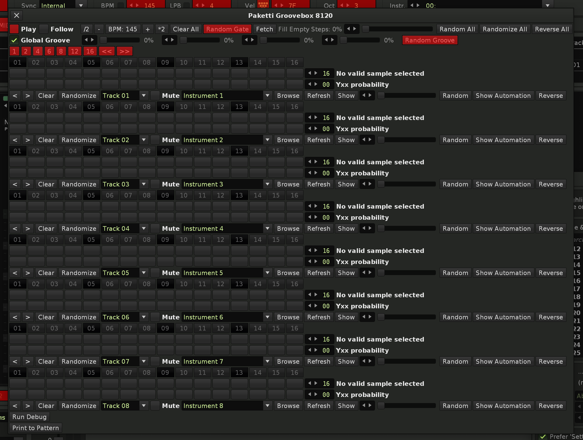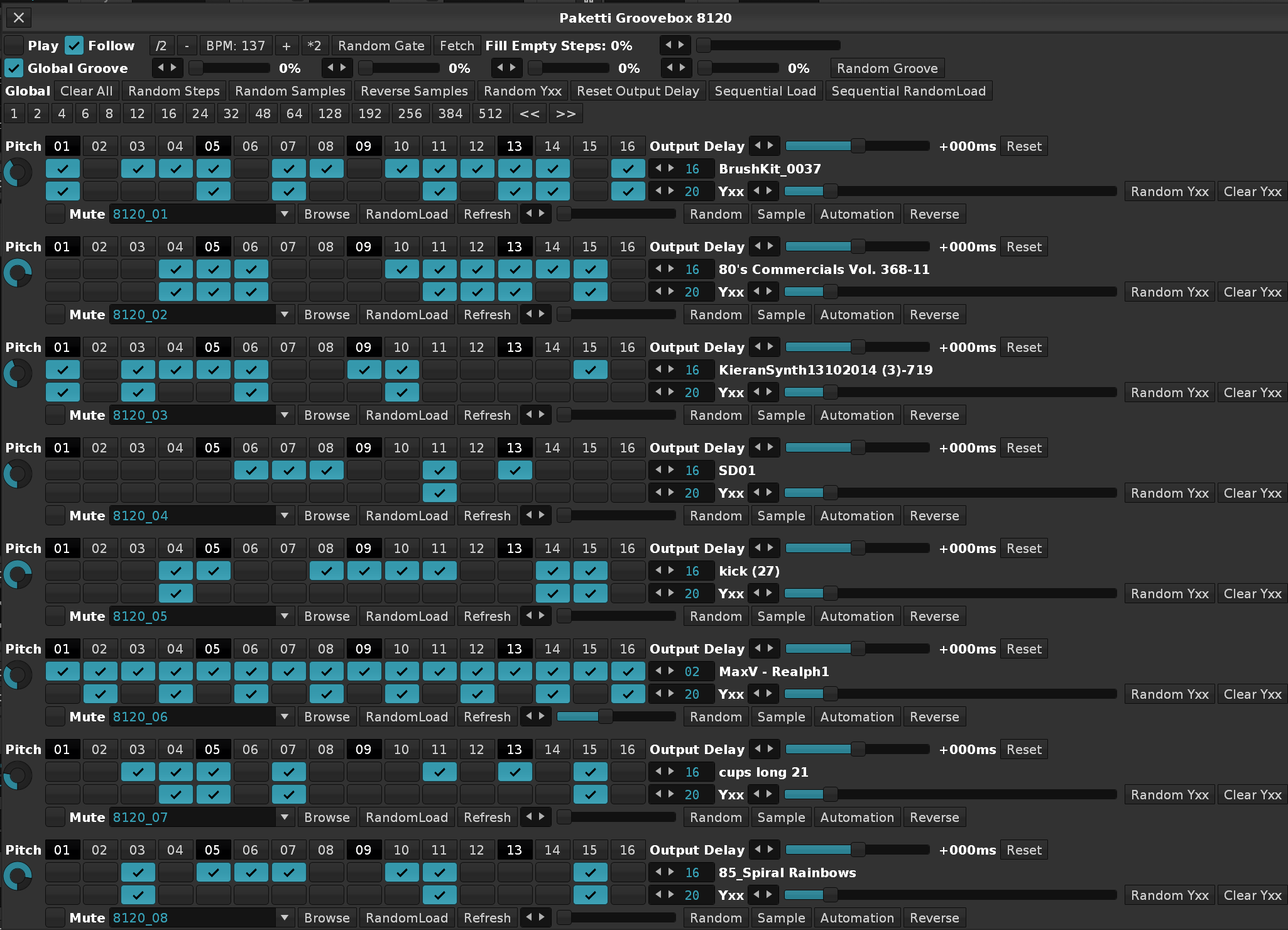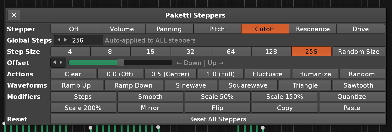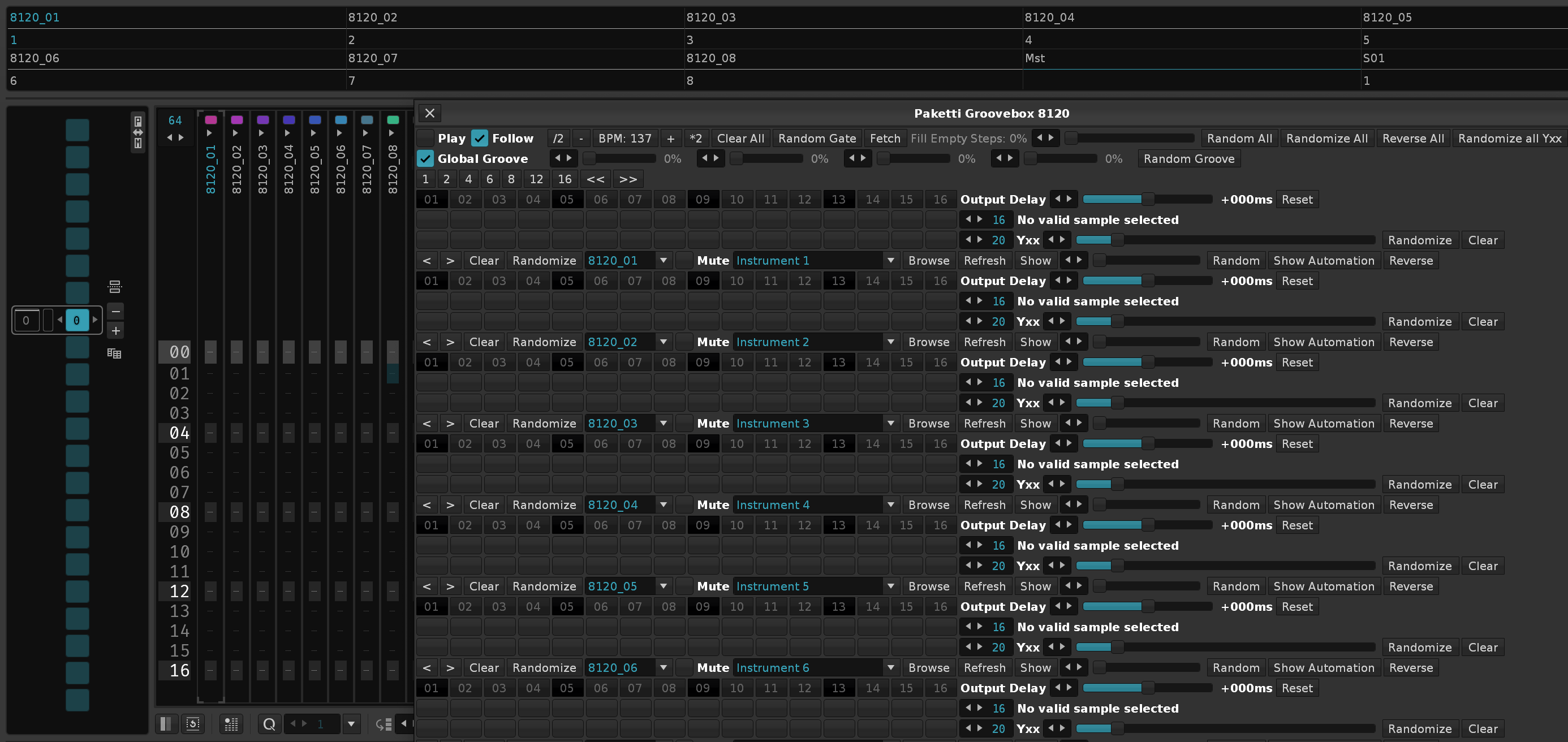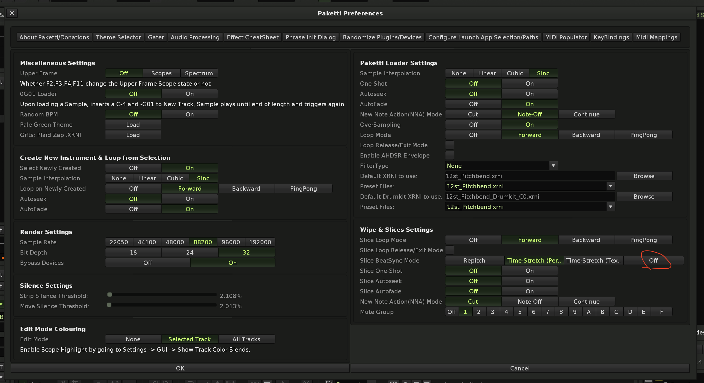 This allows you to pick your favorite 8 slices, or the 8 sample offset values of your choice, and start stepsequencing with them. There's also mute / pitch control for each slice - the pitch is disabled if you hit Sample Offset. And re-enabled when you move back to Slice. It will flood the pattern full (so 16 steps? 512 row pattern? Fills it all). Also you can offset, just like with Paketti Gater + Paketti Groovebox 8120 + Paketti VolDelayPan - them so they keep going against eachother causing all kinds of polyrhythmic fun.