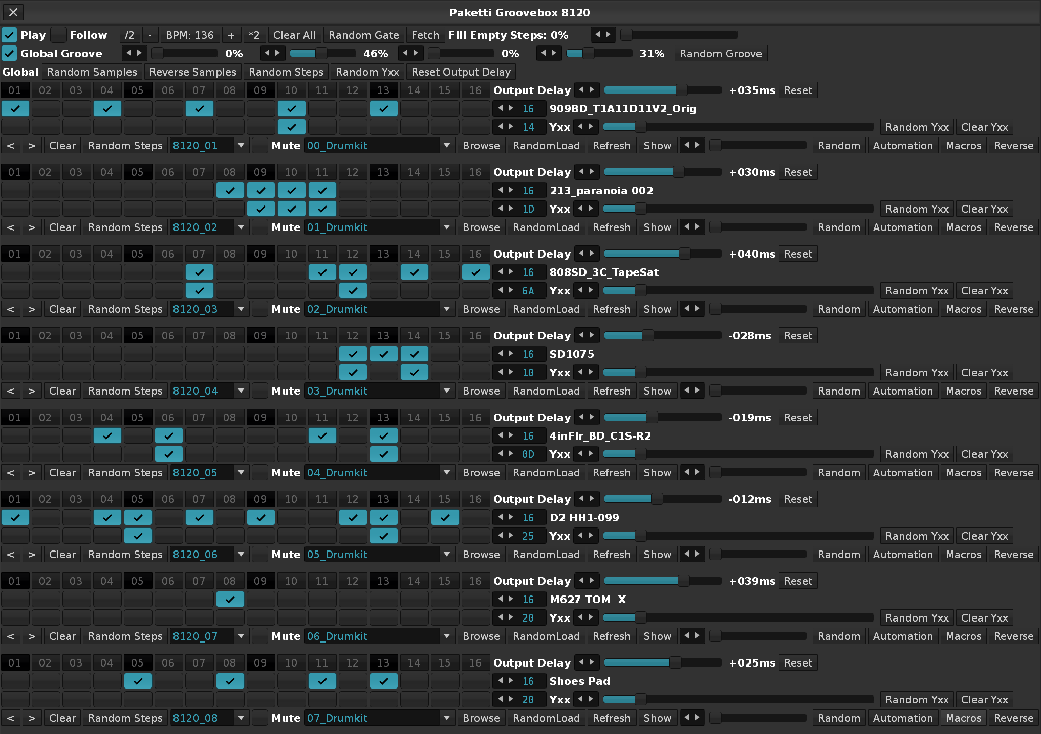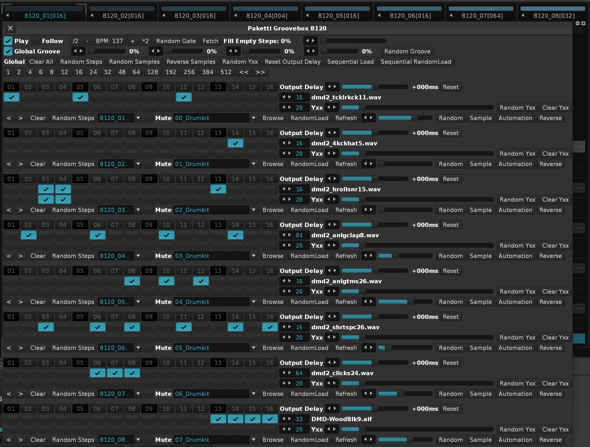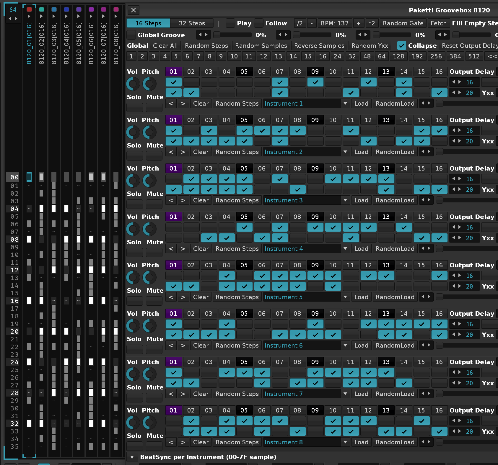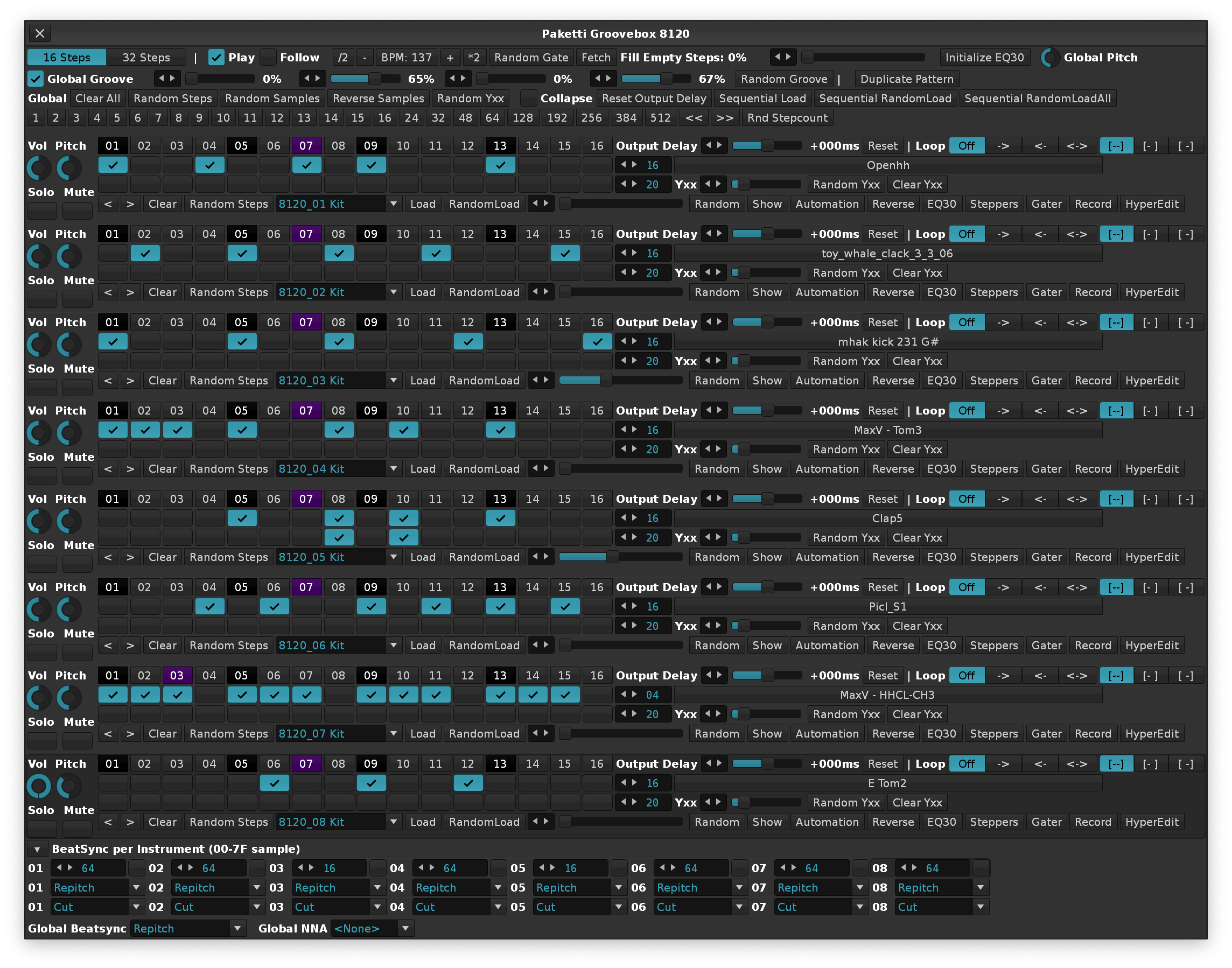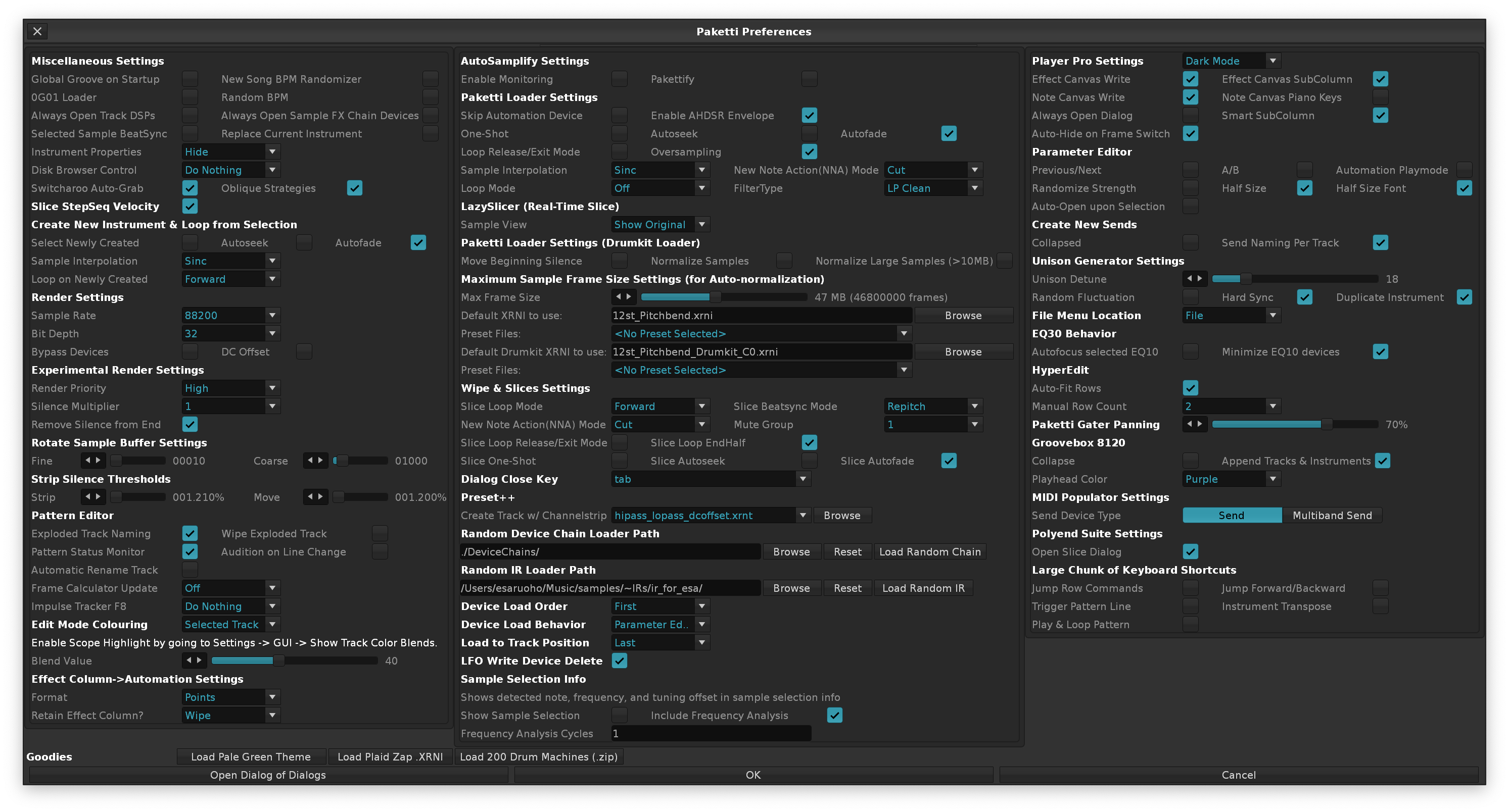 This allows you to pick your favorite 8 slices, or the 8 sample offset values of your choice, and start stepsequencing with them. There's also mute / pitch control for each slice - the pitch is disabled if you hit Sample Offset. And re-enabled when you move back to Slice. It will flood the pattern full (so 16 steps? 512 row pattern? Fills it all). Also you can offset, just like with Paketti Gater + Paketti Groovebox 8120 + Paketti VolDelayPan - them so they keep going against eachother causing all kinds of polyrhythmic fun.