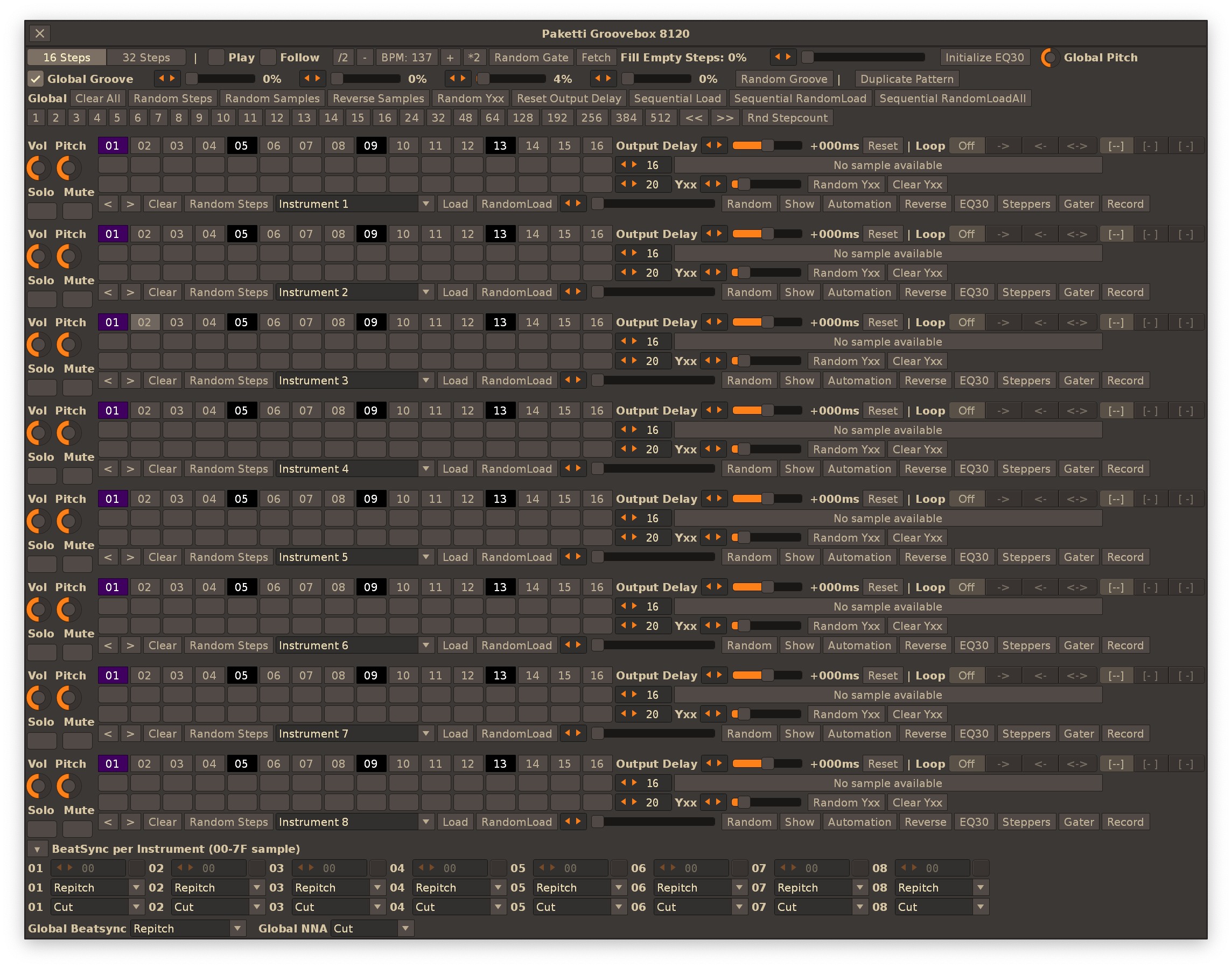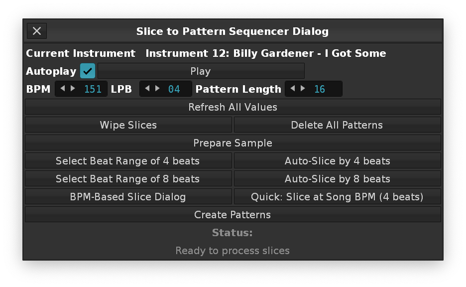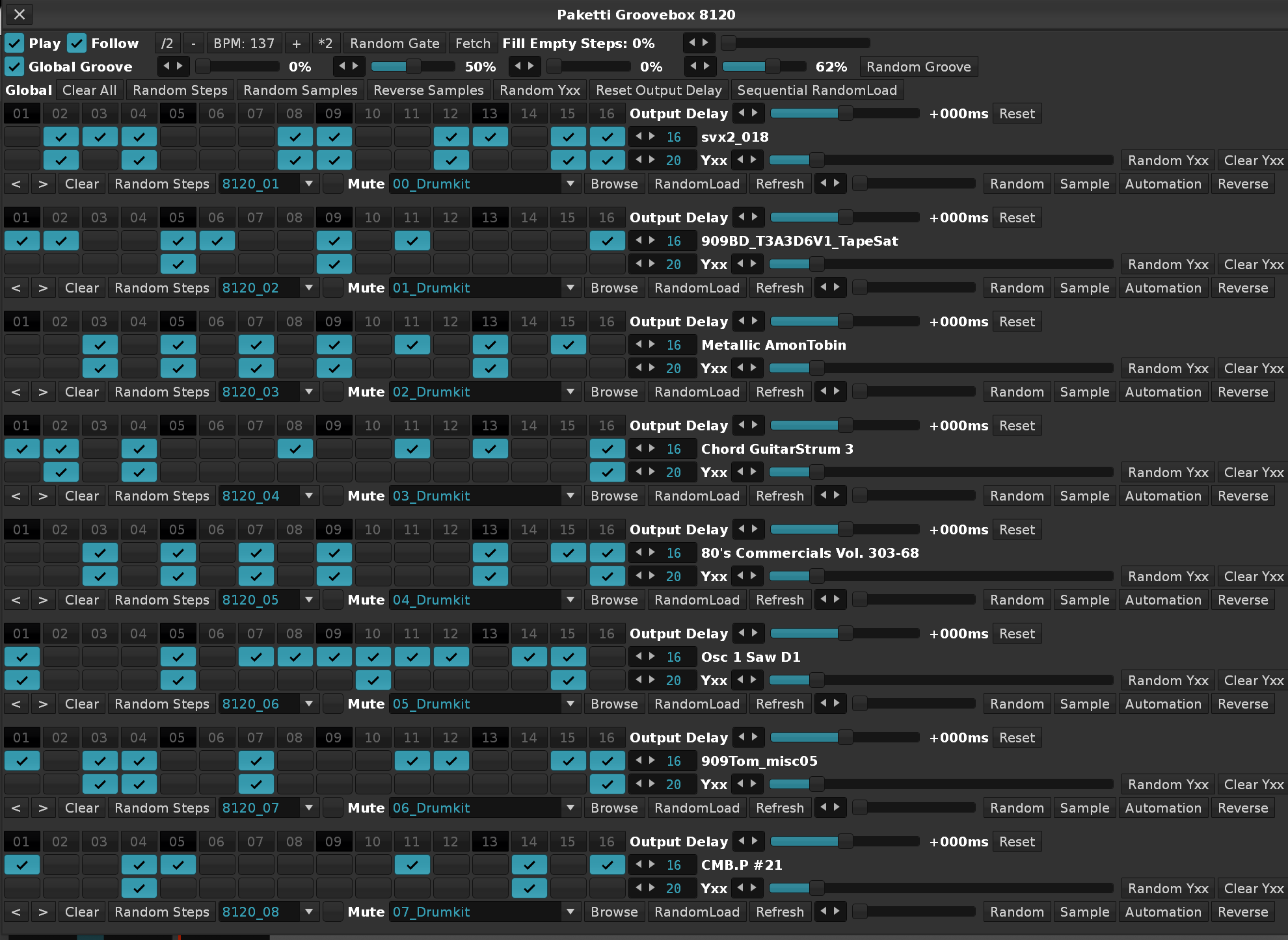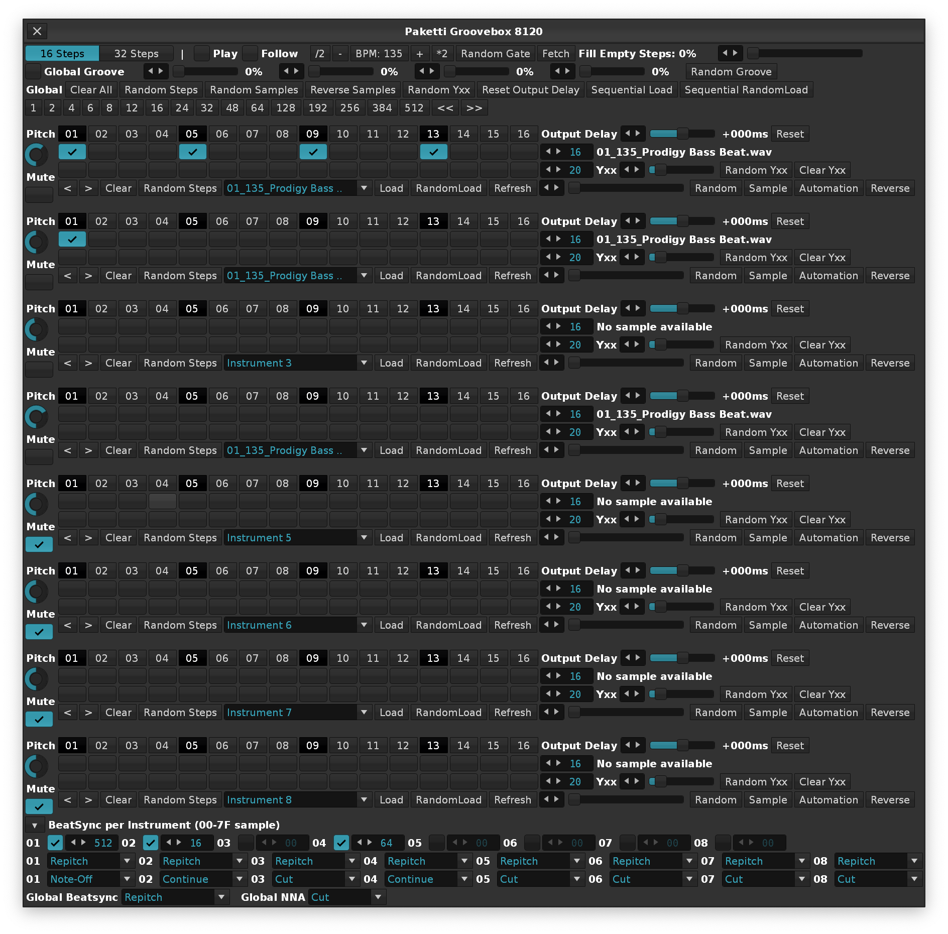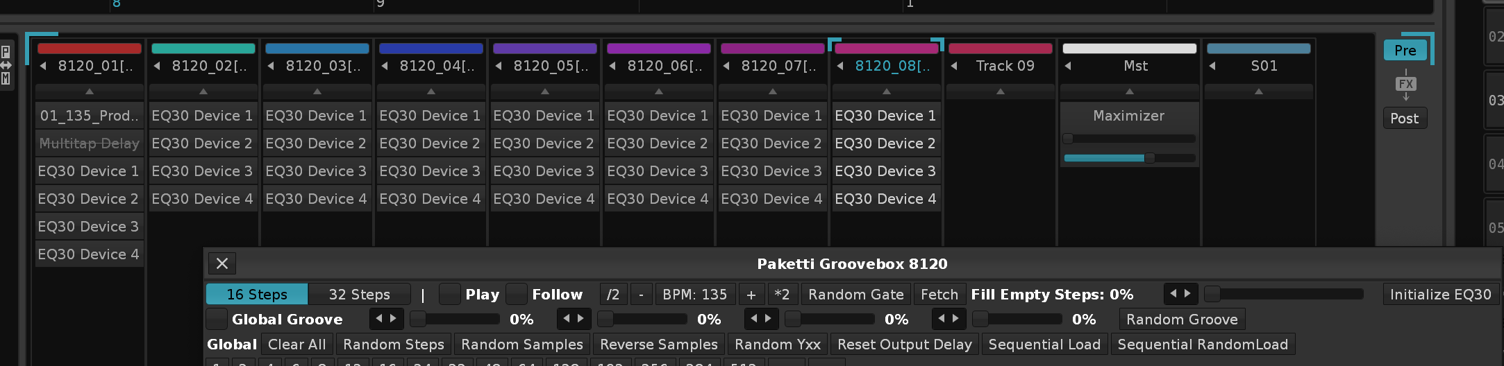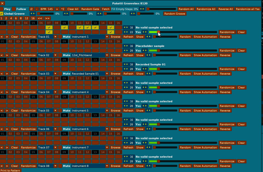 This allows you to pick your favorite 8 slices, or the 8 sample offset values of your choice, and start stepsequencing with them. There's also mute / pitch control for each slice - the pitch is disabled if you hit Sample Offset. And re-enabled when you move back to Slice. It will flood the pattern full (so 16 steps? 512 row pattern? Fills it all). Also you can offset, just like with Paketti Gater + Paketti Groovebox 8120 + Paketti VolDelayPan - them so they keep going against eachother causing all kinds of polyrhythmic fun.