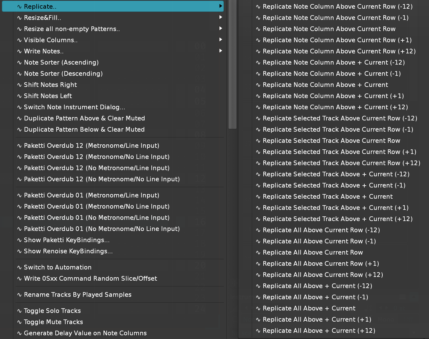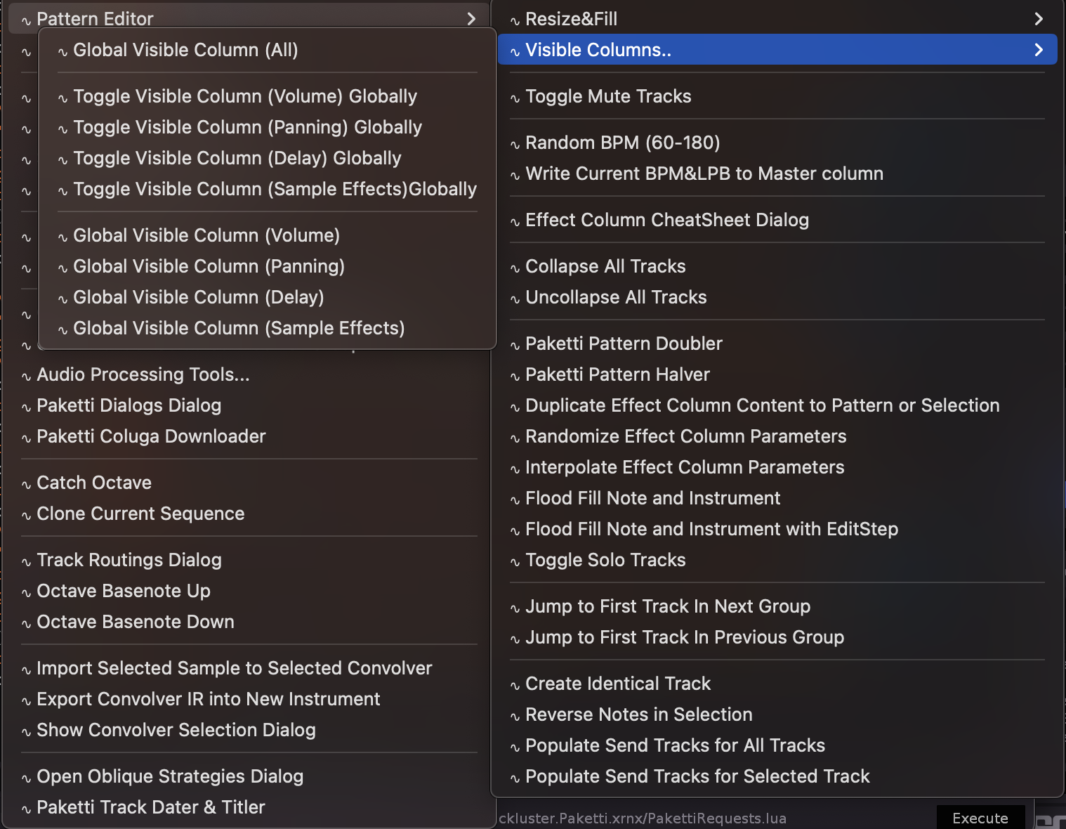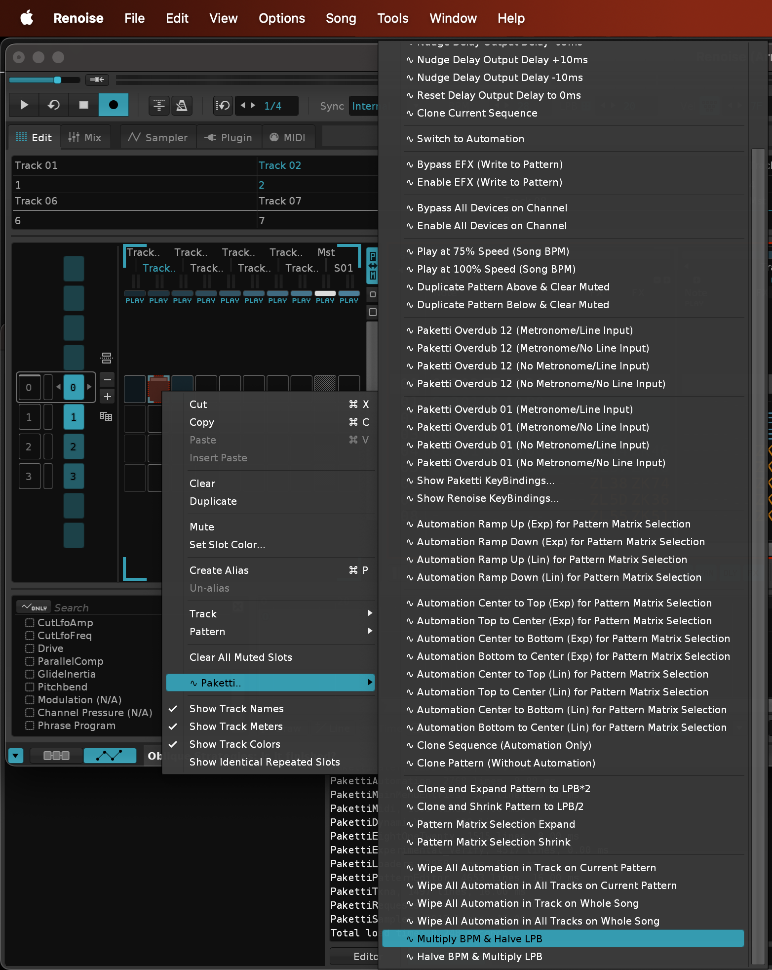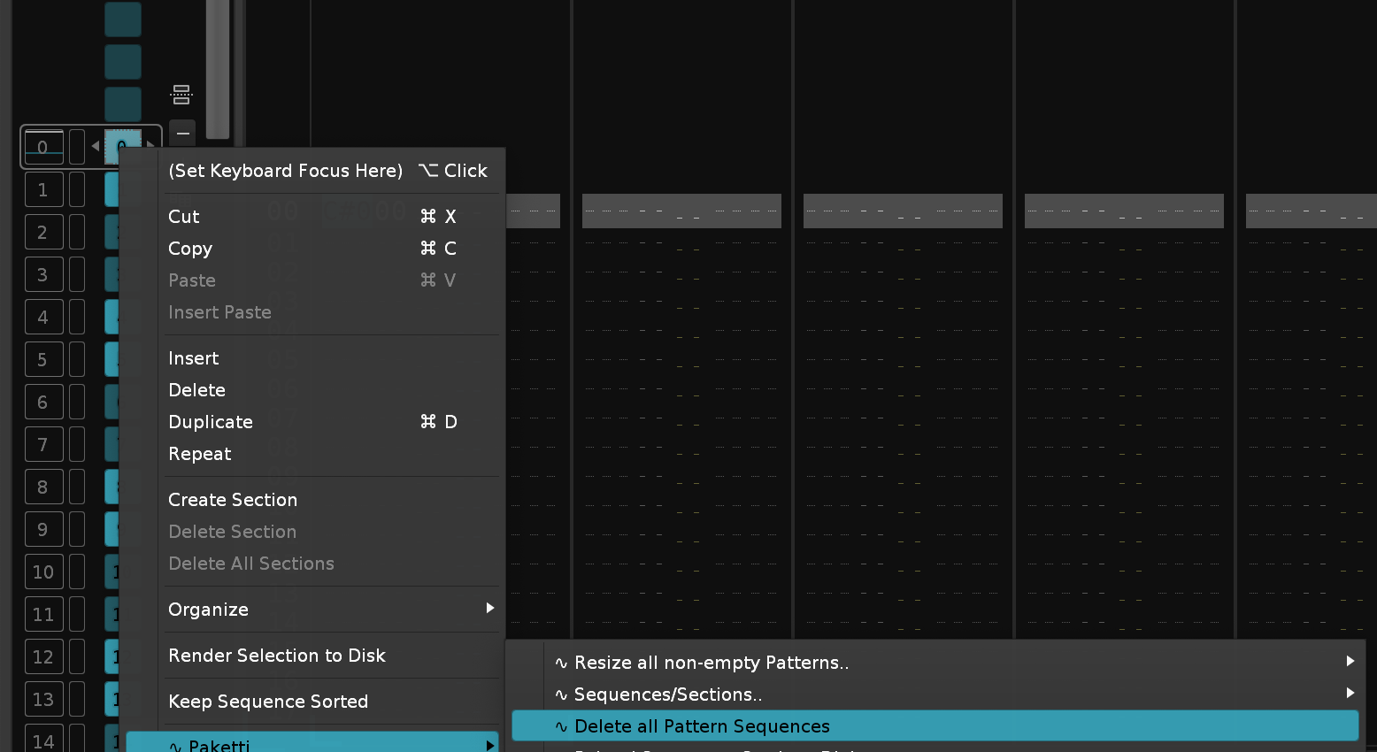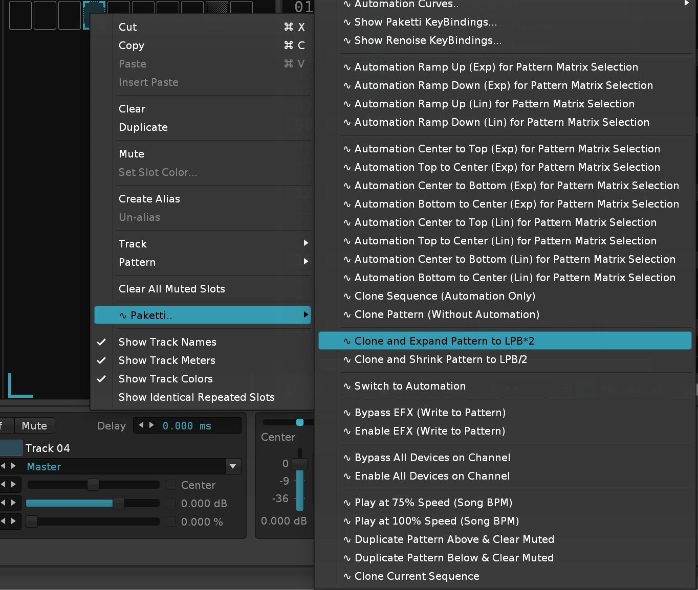 Global:Paketti:Toggle Metronome PrecountPaketti:Toggle Metronome PrecountGlobal:Paketti:Enable Metronome PrecountGlobal:Paketti:Disable Metronome PrecountPaketti:Enable Metronome PrecountPaketti:Disable Metronome PrecountGlobal:Paketti:Toggle Mute/Unmute All TracksPaketti:Toggle Mute/Unmute All TracksGlobal:Paketti:Toggle Mute/Unmute Remembered TracksPaketti:Toggle Mute/Unmute Remembered TracksGlobal:Paketti:Set EditStep & Quantization to 00 through ...to 32Global:Paketti:Increase EditStep & Quantization by 1Global:Paketti:Decrease EditStep & Quantization by 1Global:Paketti:EditStep & Quantization Power of Two AboveGlobal:Paketti:EditStep & Quantization Power of Two BelowPaketti:Set EditStep & Quantization to 00 through ...to 32Paketti:Increase EditStep & Quantization by 1Paketti:Decrease EditStep & Quantization by 1Paketti:EditStep & Quantization Power of Two AbovePaketti:EditStep & Quantization Power of Two BelowPattern Editor:Paketti:Jump to Pattern Fraction 01/02 through 16/16Paketti:Jump to Pattern Fraction 01/02 through 16/16Pattern Editor:Paketti:Save Cursor PositionPattern Editor:Paketti:Jump to Previous PositionGlobal:Paketti:Jump to Previous PositionPaketti:Save Cursor PositionPaketti:Jump to Previous PositionGlobal:Paketti:Move Section Loop (Next)Global:Paketti:Move Section Loop (Previous)Paketti:Move Section Loop (Next)Paketti:Move Section Loop (Previous)Pattern Editor:Paketti:Note Off All Columns in GroupPaketti:Note Off All Columns in GroupPattern Editor:Paketti:Mute Playing Note (Insert Note Off)Paketti:Mute Playing Note (Insert Note Off)Global:Paketti:Clone Sequence Without AutomationPattern Sequencer:Paketti:Clone Sequence Without AutomationPattern Matrix:Paketti:Clone Sequence Without AutomationPaketti:Clone Sequence Without AutomationGlobal:Paketti:Wipe Drumkit Sample FX AssignmentsPaketti:Wipe Drumkit Sample FX AssignmentsPattern Editor:Paketti:Invert Volume OnlyPattern Editor:Paketti:Invert Panning OnlyPattern Editor:Paketti:Invert Delay OnlyPattern Editor:Paketti:Invert Sample FX OnlyPaketti:Invert Volume OnlyPaketti:Invert Panning OnlyPaketti:Invert Delay OnlyPaketti:Invert Sample FX OnlyPattern Editor:Paketti:BPM Switcher Dialog...Paketti:BPM Switcher DialogPattern Editor:Paketti:Write Track Mute (0L00)Pattern Editor:Paketti:Write Track Unmute (0L80)Pattern Editor:Paketti:Write Track Solo via 0L00 (Mute All Others)Pattern Editor:Paketti:Write Track Unsolo via 0L80 (Unmute All)Paketti:Write Track Mute (0L00)Paketti:Write Track Unmute (0L80)Paketti:Write Track Solo via 0L00Paketti:Write Track Unsolo via 0L80Global:Paketti:Step Sequencer FX Randomizer Dialog...Paketti:Pattern Editor:Step Sequencer FX RandomizerMain Menu:Tools:Paketti:Pattern Editor:Step Sequencer FX Randomizer...Pattern Editor:Paketti:Step Sequencer FX Randomizer...Pattern Editor:Paketti:Interpolate Current Subcolumn ValuesPattern Editor:Paketti:Interpolate Column Values (Effect Column)Paketti:Interpolate Current Subcolumn ValuesPaketti:Interpolate Column Values (Effect Column)Pattern Editor:Paketti:Fill Effect Column Between NotesPattern Editor:Paketti:Fill Sample Effects Between NotesPaketti:Fill Effect Column Between NotesPaketti:Fill Sample Effects Between NotesPattern Editor:Paketti:Play Next Note LinePattern Editor:Paketti:Play Previous Note LinePaketti:Play Next Note LinePaketti:Play Previous Note LinePattern Editor:Paketti:Clever Note Off Wipe & Replace (Right After)Pattern Editor:Paketti:Clever Note Off Wipe & Replace (Right Before)Pattern Editor:Paketti:Clever Note Off Wipe & Replace (Half Before)Paketti:Clever Note Off Wipe & Replace (Right After)Paketti:Clever Note Off Wipe & Replace (Right Before)Paketti:Clever Note Off Wipe & Replace (Half Before)Pattern Editor:Paketti:Clever Note Off Delay +1Pattern Editor:Paketti:Clever Note Off Delay -1Pattern Editor:Paketti:Clever Note Off Delay +10Pattern Editor:Paketti:Clever Note Off Delay -10Paketti:Clever Note Off Delay +1Paketti:Clever Note Off Delay -1Paketti:Clever Note Off Delay +10Paketti:Clever Note Off Delay -10Pattern Editor:Paketti:Clever Note Off Reset DelayPaketti:Clever Note Off Reset DelayPattern Editor:Paketti:OctaMED Note Echo Dialog...Paketti:OctaMED Note Echo DialogPakettiSetEditStepAndQuantization() forcing quantize enabled when changing values. Now saves and restores the record_quantize_enabled state so changing EditStep/Quantization values no longer toggles quantize on/off. Status bar shows enabled state: EditStep: 8, Quantize: 8 (On) or (Off).Global:Paketti:Increase EditStep & Quantization by 1, Global:Paketti:Decrease EditStep & Quantization by 1, Global:Paketti:EditStep & Quantization Power of Two Above/Below, Global:Paketti:Set EditStep & Quantization to 00 through 32nudge_with_delay() now sets delay_column_visible = true for ALL tracks in the selection, not just the currently selected track.Pattern Editor:Paketti:Nudge with Delay (Down), Pattern Editor:Paketti:Nudge with Delay (Up)Pattern Editor:Paketti:Interpolate Column Values Exponential (Volume), Pattern Editor:Paketti:Interpolate Column Values Exponential (Panning), Pattern Editor:Paketti:Interpolate Column Values Exponential (Delay), Pattern Editor:Paketti:Interpolate Column Values Exponential (Sample FX), Pattern Editor:Paketti:Interpolate Column Values Exponential (Effect Column), Pattern Editor:Paketti:Interpolate Current Subcolumn Values ExponentialPaketti:Interpolate Column Values Exponential (...)Pattern Editor:Paketti:Jump to Pattern Position Dialog...Paketti:Jump to Pattern Position DialogGlobal:Paketti:Clone and Expand Pattern to LPB*2 (existing, now handles large patterns)visible_note_columns to match (minimum 1). Cleans up tracks with excess empty columns.Global:Paketti:Remove Unused Note ColumnsPaketti:Remove Unused Note ColumnsMain Menu:Tools:Paketti:Pattern Editor:Remove Unused Note ColumnsGlobal:Paketti:Remove Unused Effect ColumnsPaketti:Remove Unused Effect ColumnsMain Menu:Tools:Paketti:Pattern Editor:Remove Unused Effect ColumnsGlobal:Paketti:Re