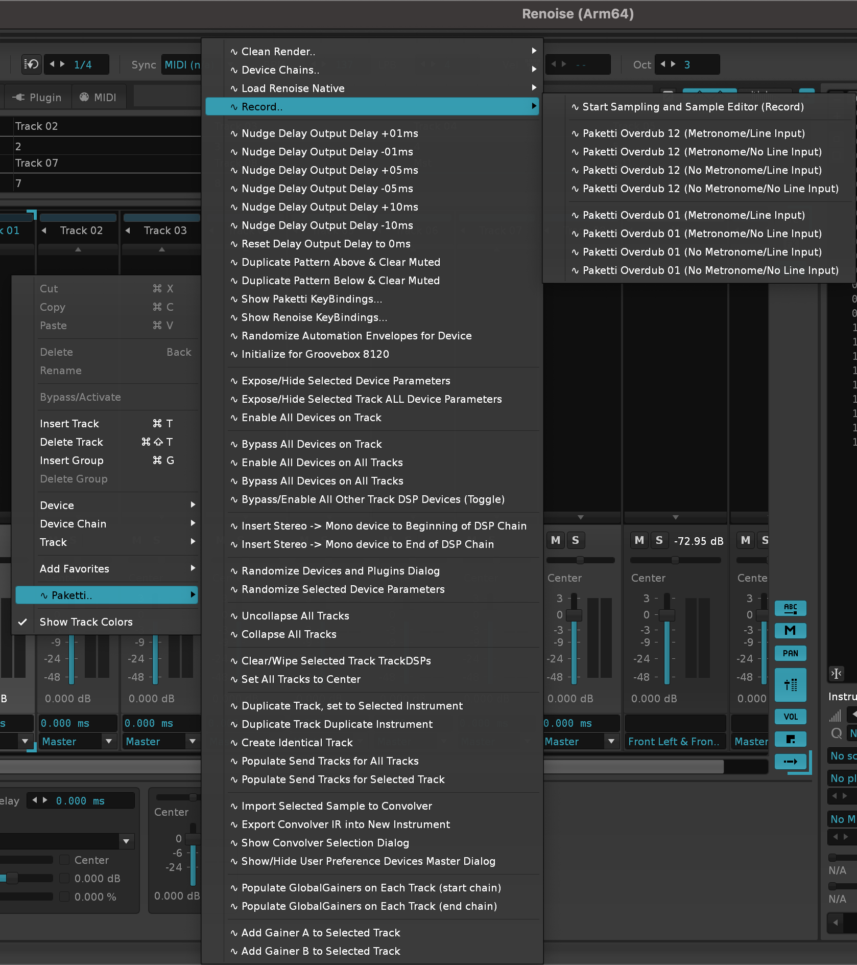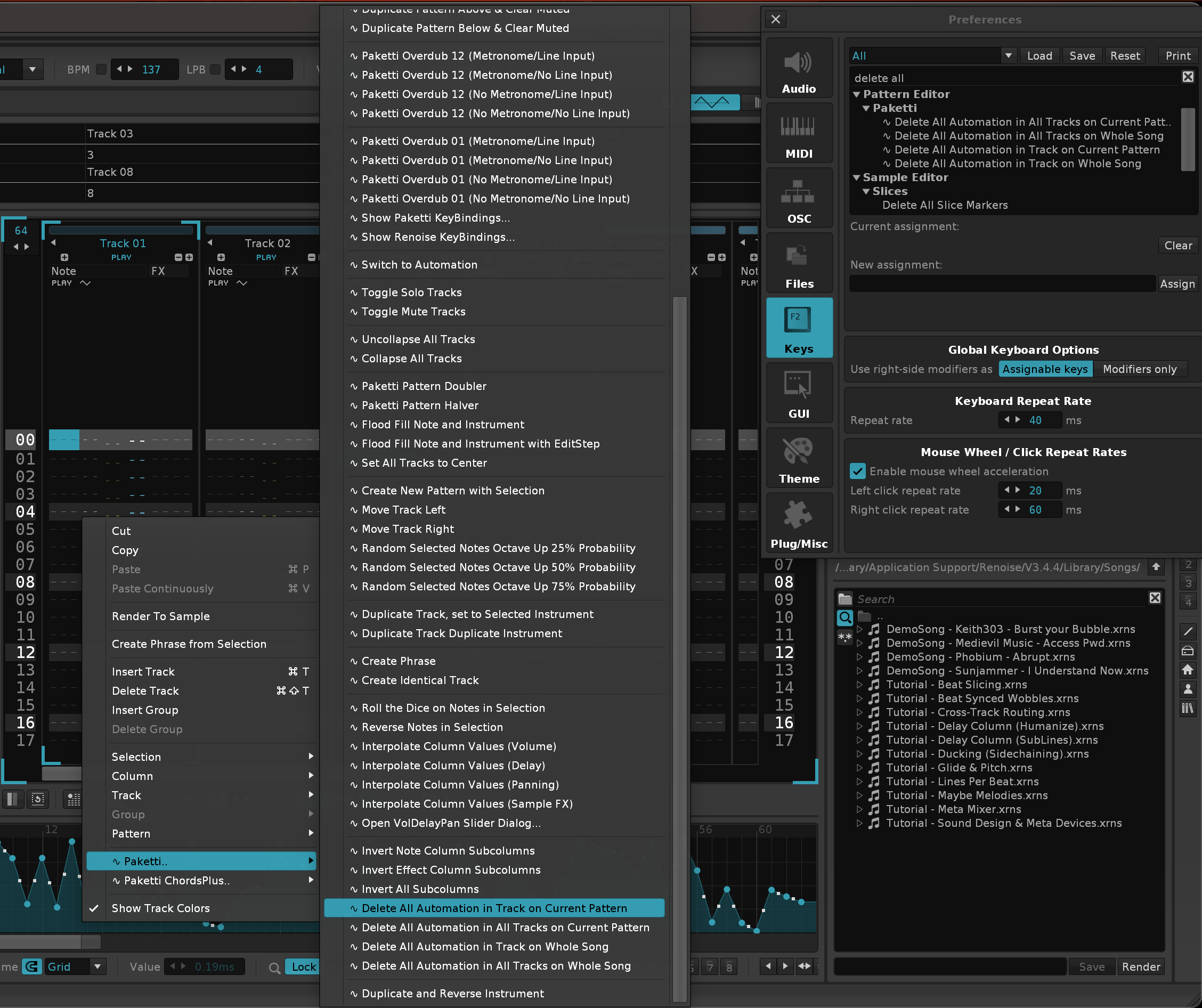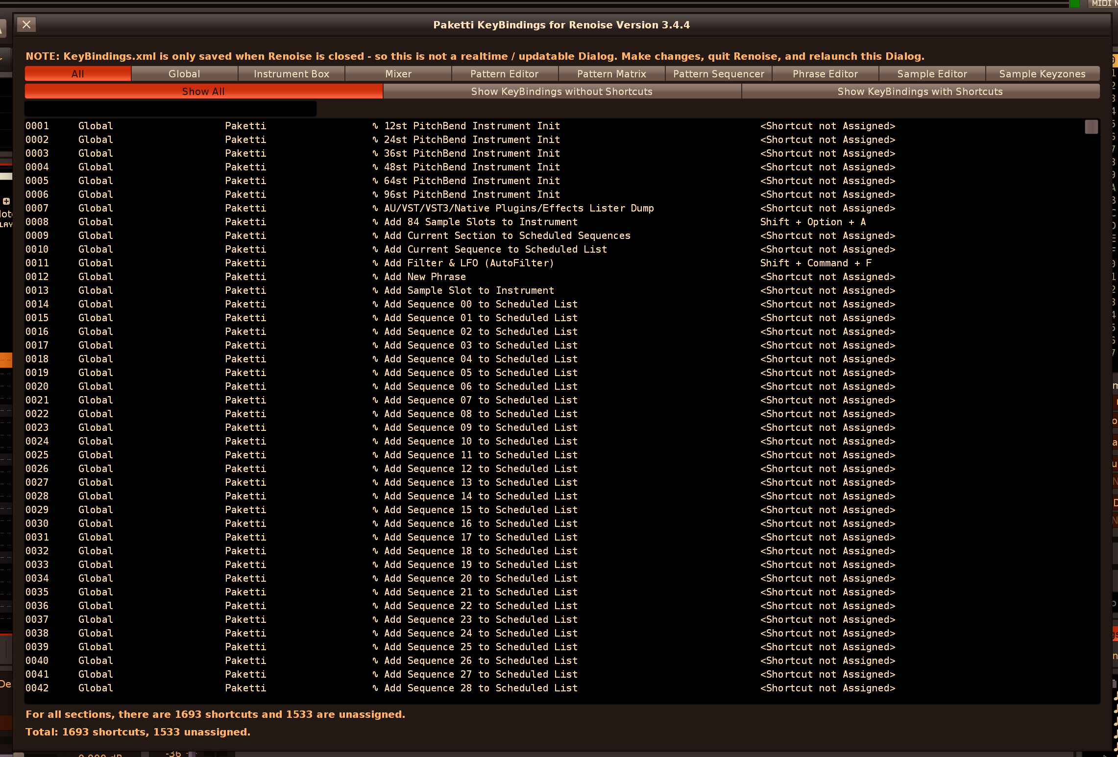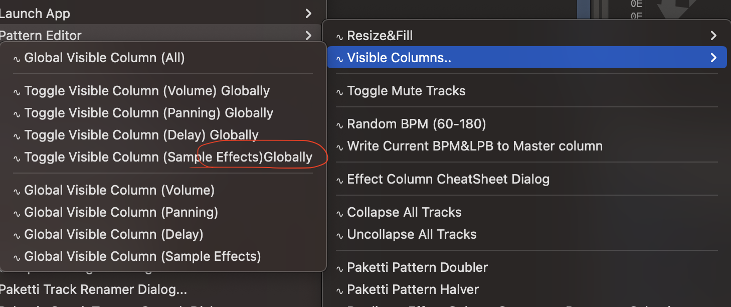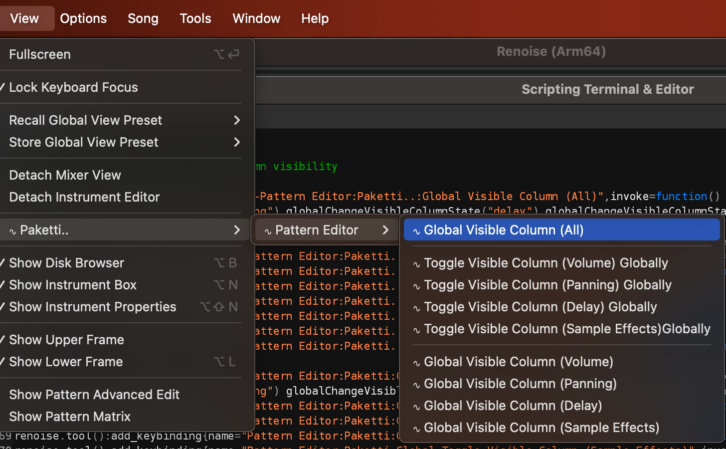 Global:Paketti:Toggle Metronome PrecountPaketti:Toggle Metronome PrecountGlobal:Paketti:Enable Metronome PrecountGlobal:Paketti:Disable Metronome PrecountPaketti:Enable Metronome PrecountPaketti:Disable Metronome PrecountGlobal:Paketti:Toggle Mute/Unmute All TracksPaketti:Toggle Mute/Unmute All TracksGlobal:Paketti:Toggle Mute/Unmute Remembered TracksPaketti:Toggle Mute/Unmute Remembered TracksGlobal:Paketti:Set EditStep & Quantization to 00 through ...to 32Global:Paketti:Increase EditStep & Quantization by 1Global:Paketti:Decrease EditStep & Quantization by 1Global:Paketti:EditStep & Quantization Power of Two AboveGlobal:Paketti:EditStep & Quantization Power of Two BelowPaketti:Set EditStep & Quantization to 00 through ...to 32Paketti:Increase EditStep & Quantization by 1Paketti:Decrease EditStep & Quantization by 1Paketti:EditStep & Quantization Power of Two AbovePaketti:EditStep & Quantization Power of Two BelowPattern Editor:Paketti:Jump to Pattern Fraction 01/02 through 16/16Paketti:Jump to Pattern Fraction 01/02 through 16/16Pattern Editor:Paketti:Save Cursor PositionPattern Editor:Paketti:Jump to Previous PositionGlobal:Paketti:Jump to Previous PositionPaketti:Save Cursor PositionPaketti:Jump to Previous PositionGlobal:Paketti:Move Section Loop (Next)Global:Paketti:Move Section Loop (Previous)Paketti:Move Section Loop (Next)Paketti:Move Section Loop (Previous)Pattern Editor:Paketti:Note Off All Columns in GroupPaketti:Note Off All Columns in GroupPattern Editor:Paketti:Mute Playing Note (Insert Note Off)Paketti:Mute Playing Note (Insert Note Off)Global:Paketti:Clone Sequence Without AutomationPattern Sequencer:Paketti:Clone Sequence Without AutomationPattern Matrix:Paketti:Clone Sequence Without AutomationPaketti:Clone Sequence Without AutomationGlobal:Paketti:Wipe Drumkit Sample FX AssignmentsPaketti:Wipe Drumkit Sample FX AssignmentsPattern Editor:Paketti:Invert Volume OnlyPattern Editor:Paketti:Invert Panning OnlyPattern Editor:Paketti:Invert Delay OnlyPattern Editor:Paketti:Invert Sample FX OnlyPaketti:Invert Volume OnlyPaketti:Invert Panning OnlyPaketti:Invert Delay OnlyPaketti:Invert Sample FX OnlyPattern Editor:Paketti:BPM Switcher Dialog...Paketti:BPM Switcher DialogPattern Editor:Paketti:Write Track Mute (0L00)Pattern Editor:Paketti:Write Track Unmute (0L80)Pattern Editor:Paketti:Write Track Solo via 0L00 (Mute All Others)Pattern Editor:Paketti:Write Track Unsolo via 0L80 (Unmute All)Paketti:Write Track Mute (0L00)Paketti:Write Track Unmute (0L80)Paketti:Write Track Solo via 0L00Paketti:Write Track Unsolo via 0L80Global:Paketti:Step Sequencer FX Randomizer Dialog...Paketti:Pattern Editor:Step Sequencer FX RandomizerMain Menu:Tools:Paketti:Pattern Editor:Step Sequencer FX Randomizer...Pattern Editor:Paketti:Step Sequencer FX Randomizer...Pattern Editor:Paketti:Interpolate Current Subcolumn ValuesPattern Editor:Paketti:Interpolate Column Values (Effect Column)Paketti:Interpolate Current Subcolumn ValuesPaketti:Interpolate Column Values (Effect Column)Pattern Editor:Paketti:Fill Effect Column Between NotesPattern Editor:Paketti:Fill Sample Effects Between NotesPaketti:Fill Effect Column Between NotesPaketti:Fill Sample Effects Between NotesPattern Editor:Paketti:Play Next Note LinePattern Editor:Paketti:Play Previous Note LinePaketti:Play Next Note LinePaketti:Play Previous Note LinePattern Editor:Paketti:Clever Note Off Wipe & Replace (Right After)Pattern Editor:Paketti:Clever Note Off Wipe & Replace (Right Before)Pattern Editor:Paketti:Clever Note Off Wipe & Replace (Half Before)Paketti:Clever Note Off Wipe & Replace (Right After)Paketti:Clever Note Off Wipe & Replace (Right Before)Paketti:Clever Note Off Wipe & Replace (Half Before)Pattern Editor:Paketti:Clever Note Off Delay +1Pattern Editor:Paketti:Clever Note Off Delay -1Pattern Editor:Paketti:Clever Note Off Delay +10Pattern Editor:Paketti:Clever Note Off Delay -10Paketti:Clever Note Off Delay +1Paketti:Clever Note Off Delay -1Paketti:Clever Note Off Delay +10Paketti:Clever Note Off Delay -10Pattern Editor:Paketti:Clever Note Off Reset DelayPaketti:Clever Note Off Reset DelayPattern Editor:Paketti:OctaMED Note Echo Dialog...Paketti:OctaMED Note Echo DialogPakettiSetEditStepAndQuantization() forcing quantize enabled when changing values. Now saves and restores the record_quantize_enabled state so changing EditStep/Quantization values no longer toggles quantize on/off. Status bar shows enabled state: EditStep: 8, Quantize: 8 (On) or (Off).Global:Paketti:Increase EditStep & Quantization by 1, Global:Paketti:Decrease EditStep & Quantization by 1, Global:Paketti:EditStep & Quantization Power of Two Above/Below, Global:Paketti:Set EditStep & Quantization to 00 through 32nudge_with_delay() now sets delay_column_visible = true for ALL tracks in the selection, not just the currently selected track.Pattern Editor:Paketti:Nudge with Delay (Down), Pattern Editor:Paketti:Nudge with Delay (Up)Pattern Editor:Paketti:Interpolate Column Values Exponential (Volume), Pattern Editor:Paketti:Interpolate Column Values Exponential (Panning), Pattern Editor:Paketti:Interpolate Column Values Exponential (Delay), Pattern Editor:Paketti:Interpolate Column Values Exponential (Sample FX), Pattern Editor:Paketti:Interpolate Column Values Exponential (Effect Column), Pattern Editor:Paketti:Interpolate Current Subcolumn Values ExponentialPaketti:Interpolate Column Values Exponential (...)Pattern Editor:Paketti:Jump to Pattern Position Dialog...Paketti:Jump to Pattern Position DialogGlobal:Paketti:Clone and Expand Pattern to LPB*2 (existing, now handles large patterns)visible_note_columns to match (minimum 1). Cleans up tracks with excess empty columns.Global:Paketti:Remove Unused Note ColumnsPaketti:Remove Unused Note ColumnsMain Menu:Tools:Paketti:Pattern Editor:Remove Unused Note ColumnsGlobal:Paketti:Remove Unused Effect ColumnsPaketti:Remove Unused Effect ColumnsMain Menu:Tools:Paketti:Pattern Editor:Remove Unused Effect ColumnsGlobal:Paketti:Re