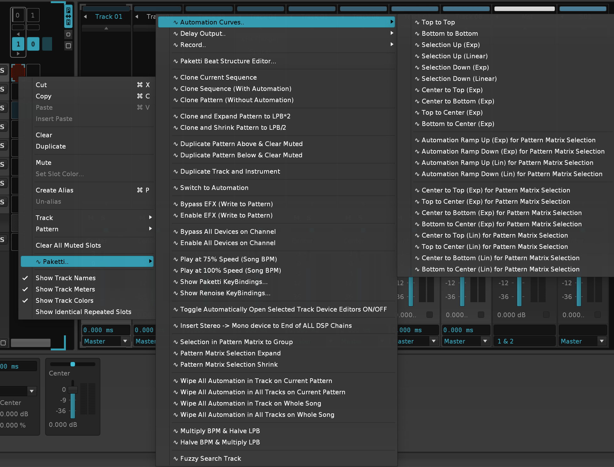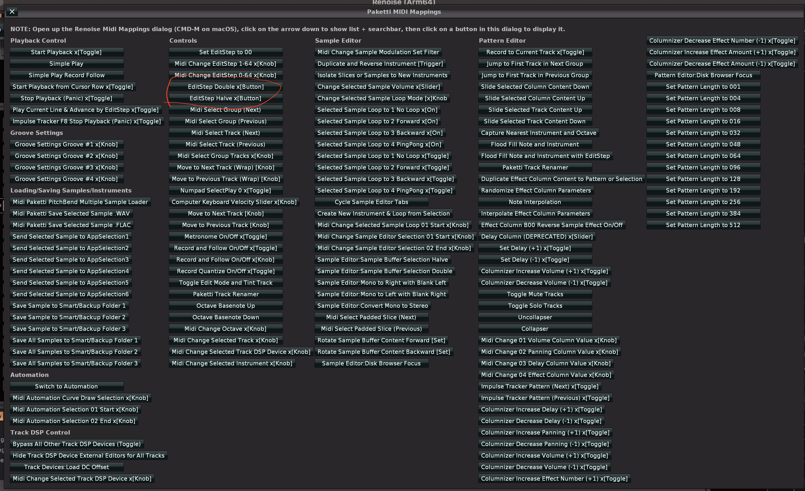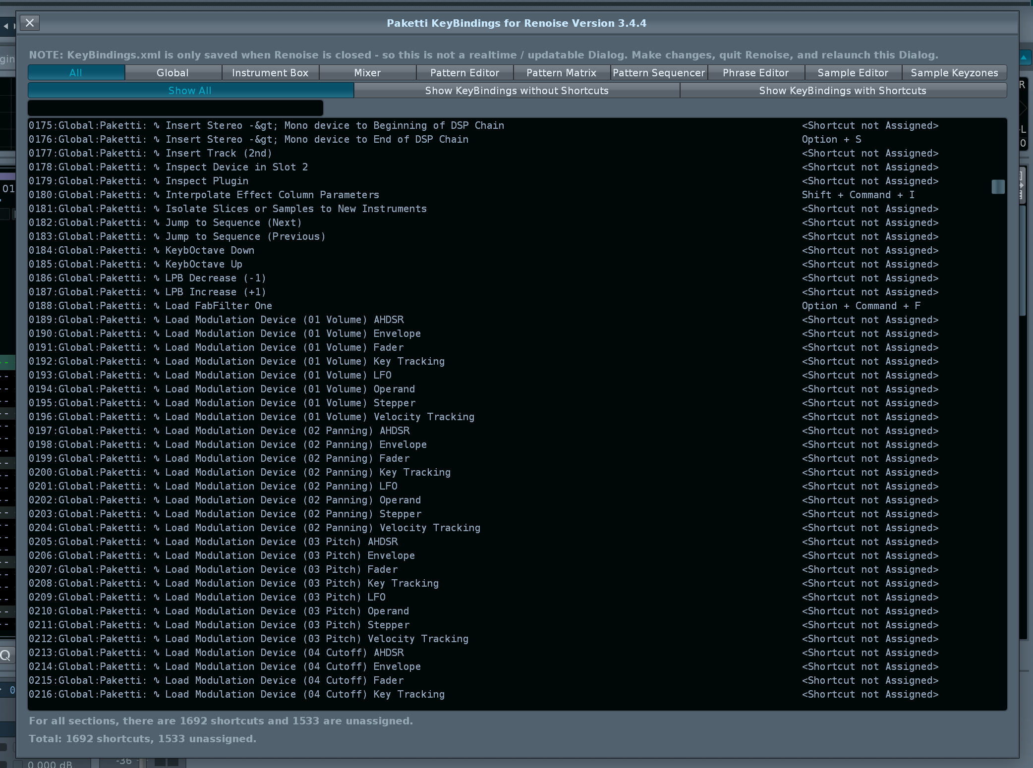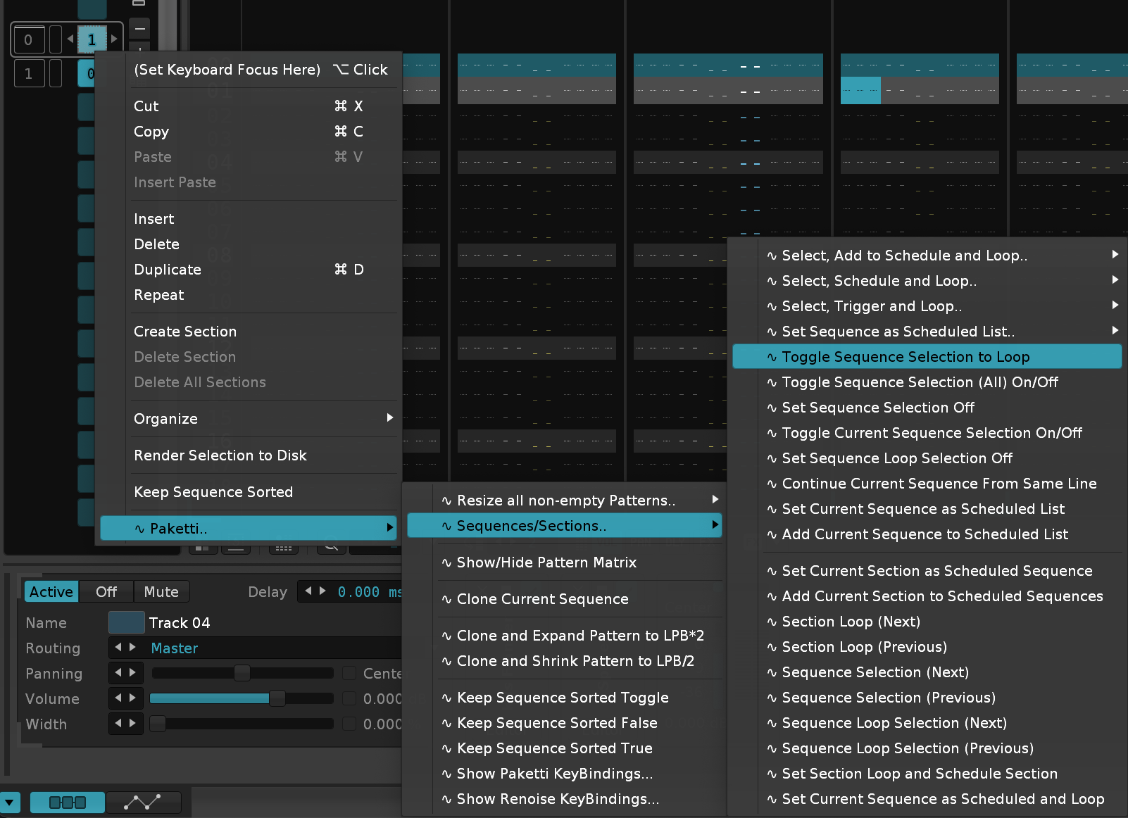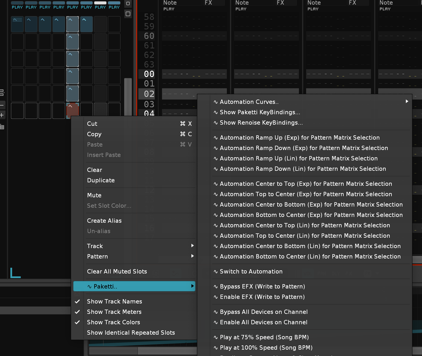 Global:Paketti:Toggle Metronome PrecountPaketti:Toggle Metronome PrecountGlobal:Paketti:Enable Metronome PrecountGlobal:Paketti:Disable Metronome PrecountPaketti:Enable Metronome PrecountPaketti:Disable Metronome PrecountGlobal:Paketti:Toggle Mute/Unmute All TracksPaketti:Toggle Mute/Unmute All TracksGlobal:Paketti:Toggle Mute/Unmute Remembered TracksPaketti:Toggle Mute/Unmute Remembered TracksGlobal:Paketti:Set EditStep & Quantization to 00 through ...to 32Global:Paketti:Increase EditStep & Quantization by 1Global:Paketti:Decrease EditStep & Quantization by 1Global:Paketti:EditStep & Quantization Power of Two AboveGlobal:Paketti:EditStep & Quantization Power of Two BelowPaketti:Set EditStep & Quantization to 00 through ...to 32Paketti:Increase EditStep & Quantization by 1Paketti:Decrease EditStep & Quantization by 1Paketti:EditStep & Quantization Power of Two AbovePaketti:EditStep & Quantization Power of Two BelowPattern Editor:Paketti:Jump to Pattern Fraction 01/02 through 16/16Paketti:Jump to Pattern Fraction 01/02 through 16/16Pattern Editor:Paketti:Save Cursor PositionPattern Editor:Paketti:Jump to Previous PositionGlobal:Paketti:Jump to Previous PositionPaketti:Save Cursor PositionPaketti:Jump to Previous PositionGlobal:Paketti:Move Section Loop (Next)Global:Paketti:Move Section Loop (Previous)Paketti:Move Section Loop (Next)Paketti:Move Section Loop (Previous)Pattern Editor:Paketti:Note Off All Columns in GroupPaketti:Note Off All Columns in GroupPattern Editor:Paketti:Mute Playing Note (Insert Note Off)Paketti:Mute Playing Note (Insert Note Off)Global:Paketti:Clone Sequence Without AutomationPattern Sequencer:Paketti:Clone Sequence Without AutomationPattern Matrix:Paketti:Clone Sequence Without AutomationPaketti:Clone Sequence Without AutomationGlobal:Paketti:Wipe Drumkit Sample FX AssignmentsPaketti:Wipe Drumkit Sample FX AssignmentsPattern Editor:Paketti:Invert Volume OnlyPattern Editor:Paketti:Invert Panning OnlyPattern Editor:Paketti:Invert Delay OnlyPattern Editor:Paketti:Invert Sample FX OnlyPaketti:Invert Volume OnlyPaketti:Invert Panning OnlyPaketti:Invert Delay OnlyPaketti:Invert Sample FX OnlyPattern Editor:Paketti:BPM Switcher Dialog...Paketti:BPM Switcher DialogPattern Editor:Paketti:Write Track Mute (0L00)Pattern Editor:Paketti:Write Track Unmute (0L80)Pattern Editor:Paketti:Write Track Solo via 0L00 (Mute All Others)Pattern Editor:Paketti:Write Track Unsolo via 0L80 (Unmute All)Paketti:Write Track Mute (0L00)Paketti:Write Track Unmute (0L80)Paketti:Write Track Solo via 0L00Paketti:Write Track Unsolo via 0L80Global:Paketti:Step Sequencer FX Randomizer Dialog...Paketti:Pattern Editor:Step Sequencer FX RandomizerMain Menu:Tools:Paketti:Pattern Editor:Step Sequencer FX Randomizer...Pattern Editor:Paketti:Step Sequencer FX Randomizer...Pattern Editor:Paketti:Interpolate Current Subcolumn ValuesPattern Editor:Paketti:Interpolate Column Values (Effect Column)Paketti:Interpolate Current Subcolumn ValuesPaketti:Interpolate Column Values (Effect Column)Pattern Editor:Paketti:Fill Effect Column Between NotesPattern Editor:Paketti:Fill Sample Effects Between NotesPaketti:Fill Effect Column Between NotesPaketti:Fill Sample Effects Between NotesPattern Editor:Paketti:Play Next Note LinePattern Editor:Paketti:Play Previous Note LinePaketti:Play Next Note LinePaketti:Play Previous Note LinePattern Editor:Paketti:Clever Note Off Wipe & Replace (Right After)Pattern Editor:Paketti:Clever Note Off Wipe & Replace (Right Before)Pattern Editor:Paketti:Clever Note Off Wipe & Replace (Half Before)Paketti:Clever Note Off Wipe & Replace (Right After)Paketti:Clever Note Off Wipe & Replace (Right Before)Paketti:Clever Note Off Wipe & Replace (Half Before)Pattern Editor:Paketti:Clever Note Off Delay +1Pattern Editor:Paketti:Clever Note Off Delay -1Pattern Editor:Paketti:Clever Note Off Delay +10Pattern Editor:Paketti:Clever Note Off Delay -10Paketti:Clever Note Off Delay +1Paketti:Clever Note Off Delay -1Paketti:Clever Note Off Delay +10Paketti:Clever Note Off Delay -10Pattern Editor:Paketti:Clever Note Off Reset DelayPaketti:Clever Note Off Reset DelayPattern Editor:Paketti:OctaMED Note Echo Dialog...Paketti:OctaMED Note Echo DialogPakettiSetEditStepAndQuantization() forcing quantize enabled when changing values. Now saves and restores the record_quantize_enabled state so changing EditStep/Quantization values no longer toggles quantize on/off. Status bar shows enabled state: EditStep: 8, Quantize: 8 (On) or (Off).Global:Paketti:Increase EditStep & Quantization by 1, Global:Paketti:Decrease EditStep & Quantization by 1, Global:Paketti:EditStep & Quantization Power of Two Above/Below, Global:Paketti:Set EditStep & Quantization to 00 through 32nudge_with_delay() now sets delay_column_visible = true for ALL tracks in the selection, not just the currently selected track.Pattern Editor:Paketti:Nudge with Delay (Down), Pattern Editor:Paketti:Nudge with Delay (Up)Pattern Editor:Paketti:Interpolate Column Values Exponential (Volume), Pattern Editor:Paketti:Interpolate Column Values Exponential (Panning), Pattern Editor:Paketti:Interpolate Column Values Exponential (Delay), Pattern Editor:Paketti:Interpolate Column Values Exponential (Sample FX), Pattern Editor:Paketti:Interpolate Column Values Exponential (Effect Column), Pattern Editor:Paketti:Interpolate Current Subcolumn Values ExponentialPaketti:Interpolate Column Values Exponential (...)Pattern Editor:Paketti:Jump to Pattern Position Dialog...Paketti:Jump to Pattern Position DialogGlobal:Paketti:Clone and Expand Pattern to LPB*2 (existing, now handles large patterns)visible_note_columns to match (minimum 1). Cleans up tracks with excess empty columns.Global:Paketti:Remove Unused Note ColumnsPaketti:Remove Unused Note ColumnsMain Menu:Tools:Paketti:Pattern Editor:Remove Unused Note ColumnsGlobal:Paketti:Remove Unused Effect ColumnsPaketti:Remove Unused Effect ColumnsMain Menu:Tools:Paketti:Pattern Editor:Remove Unused Effect ColumnsGlobal:Paketti:Re