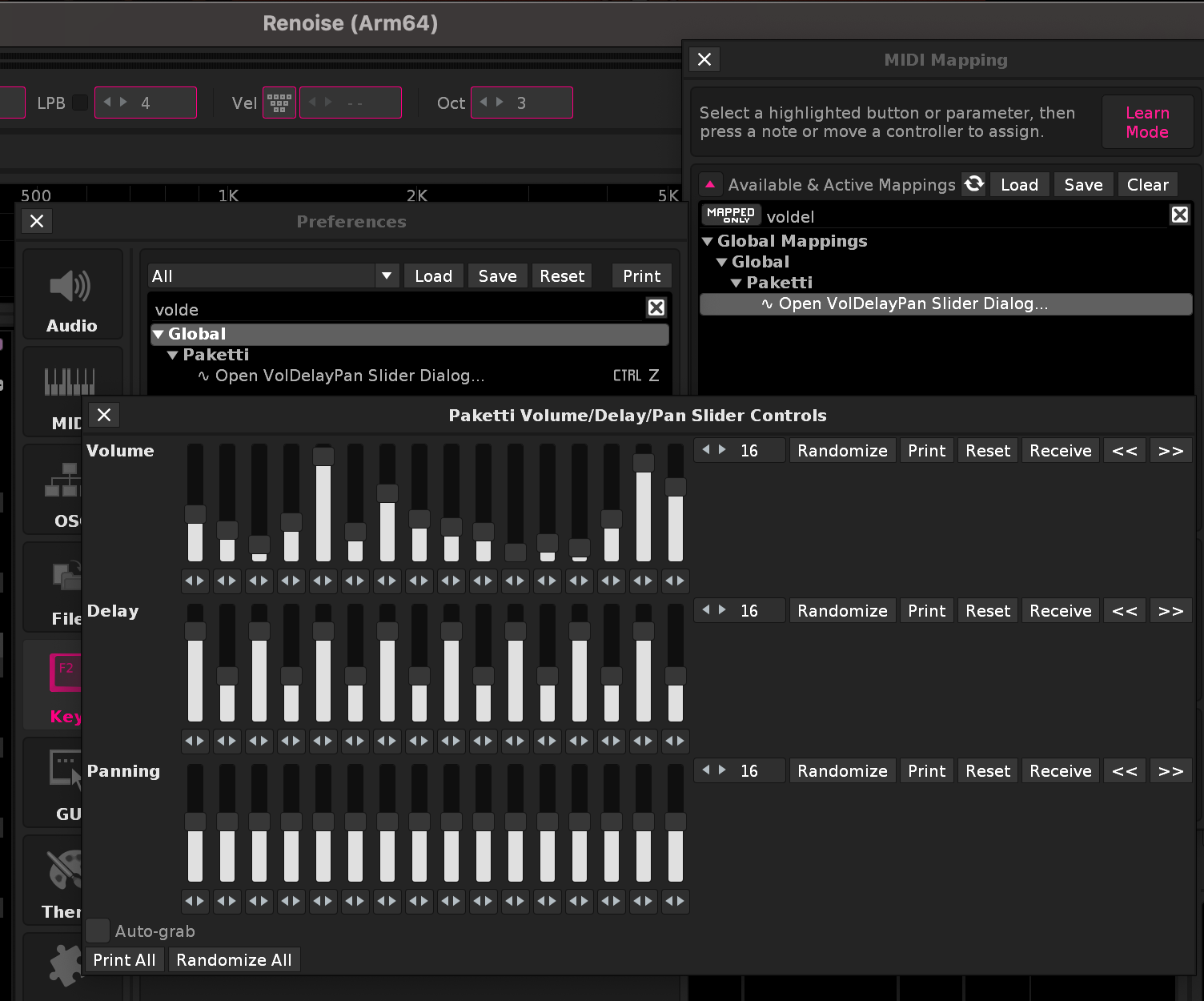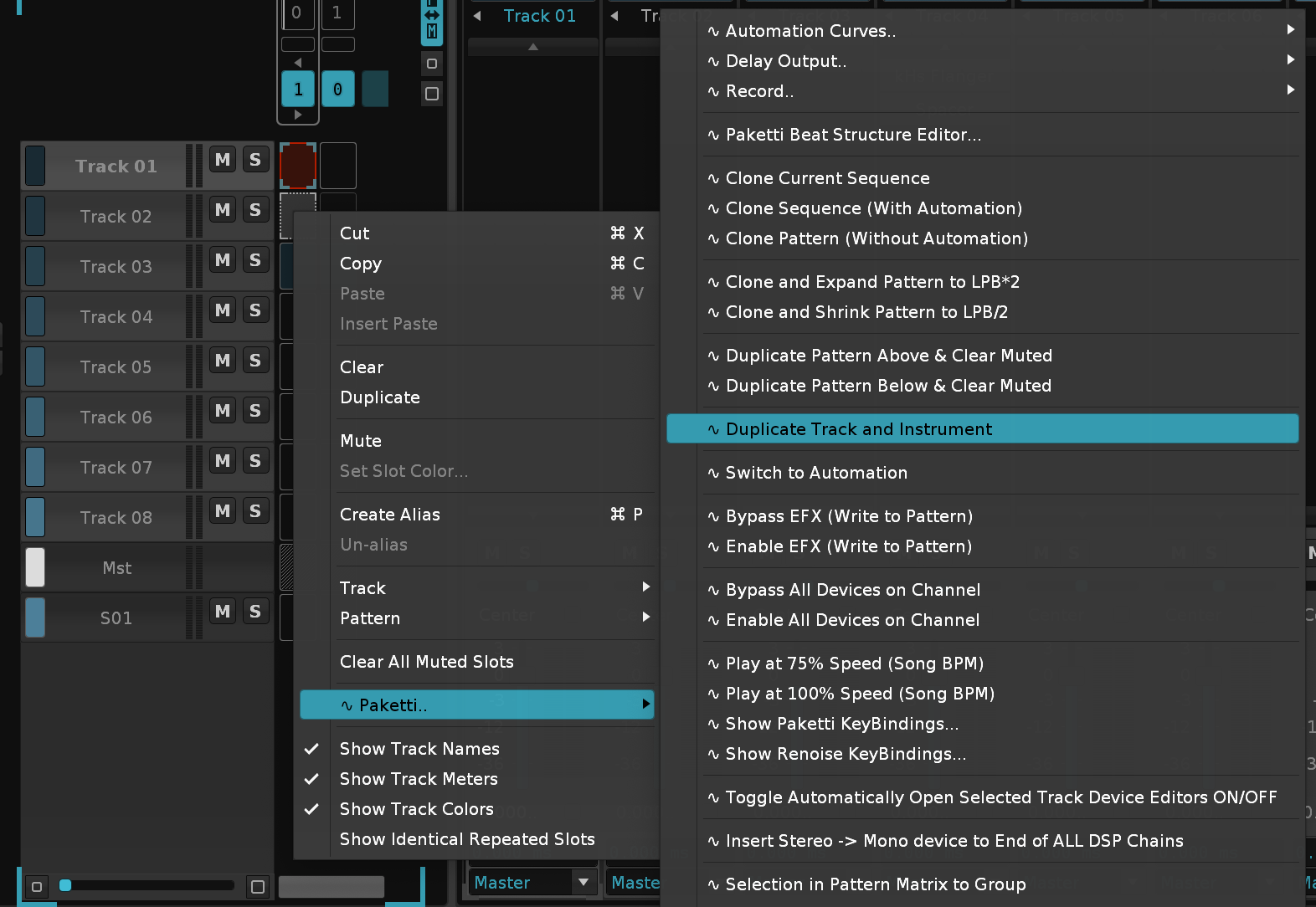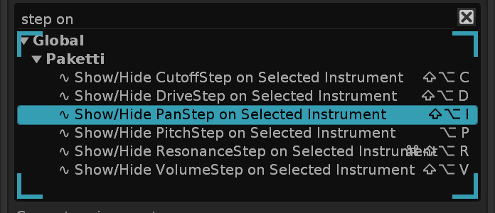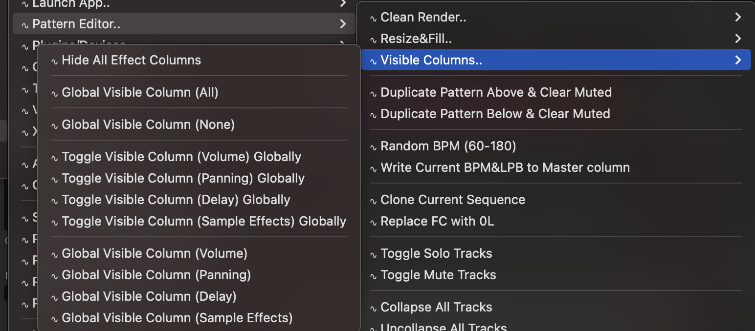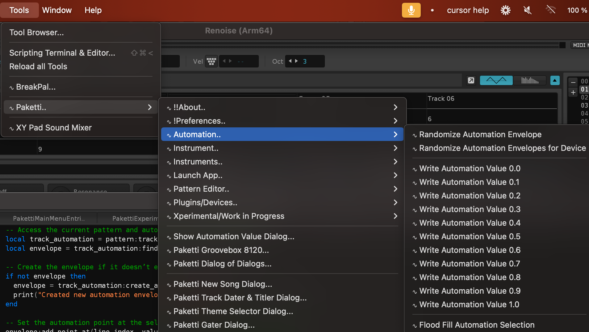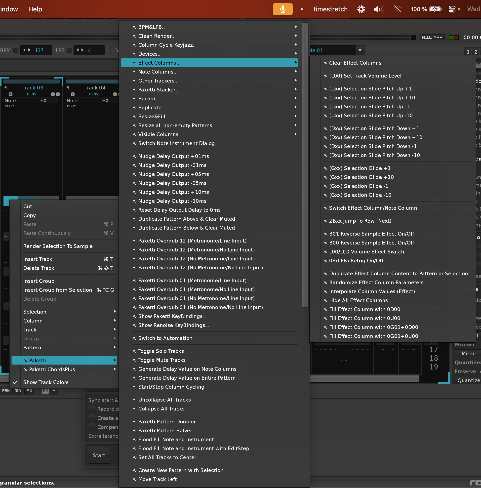 Global:Paketti:Toggle Metronome PrecountPaketti:Toggle Metronome PrecountGlobal:Paketti:Enable Metronome PrecountGlobal:Paketti:Disable Metronome PrecountPaketti:Enable Metronome PrecountPaketti:Disable Metronome PrecountGlobal:Paketti:Toggle Mute/Unmute All TracksPaketti:Toggle Mute/Unmute All TracksGlobal:Paketti:Toggle Mute/Unmute Remembered TracksPaketti:Toggle Mute/Unmute Remembered TracksGlobal:Paketti:Set EditStep & Quantization to 00 through ...to 32Global:Paketti:Increase EditStep & Quantization by 1Global:Paketti:Decrease EditStep & Quantization by 1Global:Paketti:EditStep & Quantization Power of Two AboveGlobal:Paketti:EditStep & Quantization Power of Two BelowPaketti:Set EditStep & Quantization to 00 through ...to 32Paketti:Increase EditStep & Quantization by 1Paketti:Decrease EditStep & Quantization by 1Paketti:EditStep & Quantization Power of Two AbovePaketti:EditStep & Quantization Power of Two BelowPattern Editor:Paketti:Jump to Pattern Fraction 01/02 through 16/16Paketti:Jump to Pattern Fraction 01/02 through 16/16Pattern Editor:Paketti:Save Cursor PositionPattern Editor:Paketti:Jump to Previous PositionGlobal:Paketti:Jump to Previous PositionPaketti:Save Cursor PositionPaketti:Jump to Previous PositionGlobal:Paketti:Move Section Loop (Next)Global:Paketti:Move Section Loop (Previous)Paketti:Move Section Loop (Next)Paketti:Move Section Loop (Previous)Pattern Editor:Paketti:Note Off All Columns in GroupPaketti:Note Off All Columns in GroupPattern Editor:Paketti:Mute Playing Note (Insert Note Off)Paketti:Mute Playing Note (Insert Note Off)Global:Paketti:Clone Sequence Without AutomationPattern Sequencer:Paketti:Clone Sequence Without AutomationPattern Matrix:Paketti:Clone Sequence Without AutomationPaketti:Clone Sequence Without AutomationGlobal:Paketti:Wipe Drumkit Sample FX AssignmentsPaketti:Wipe Drumkit Sample FX AssignmentsPattern Editor:Paketti:Invert Volume OnlyPattern Editor:Paketti:Invert Panning OnlyPattern Editor:Paketti:Invert Delay OnlyPattern Editor:Paketti:Invert Sample FX OnlyPaketti:Invert Volume OnlyPaketti:Invert Panning OnlyPaketti:Invert Delay OnlyPaketti:Invert Sample FX OnlyPattern Editor:Paketti:BPM Switcher Dialog...Paketti:BPM Switcher DialogPattern Editor:Paketti:Write Track Mute (0L00)Pattern Editor:Paketti:Write Track Unmute (0L80)Pattern Editor:Paketti:Write Track Solo via 0L00 (Mute All Others)Pattern Editor:Paketti:Write Track Unsolo via 0L80 (Unmute All)Paketti:Write Track Mute (0L00)Paketti:Write Track Unmute (0L80)Paketti:Write Track Solo via 0L00Paketti:Write Track Unsolo via 0L80Global:Paketti:Step Sequencer FX Randomizer Dialog...Paketti:Pattern Editor:Step Sequencer FX RandomizerMain Menu:Tools:Paketti:Pattern Editor:Step Sequencer FX Randomizer...Pattern Editor:Paketti:Step Sequencer FX Randomizer...Pattern Editor:Paketti:Interpolate Current Subcolumn ValuesPattern Editor:Paketti:Interpolate Column Values (Effect Column)Paketti:Interpolate Current Subcolumn ValuesPaketti:Interpolate Column Values (Effect Column)Pattern Editor:Paketti:Fill Effect Column Between NotesPattern Editor:Paketti:Fill Sample Effects Between NotesPaketti:Fill Effect Column Between NotesPaketti:Fill Sample Effects Between NotesPattern Editor:Paketti:Play Next Note LinePattern Editor:Paketti:Play Previous Note LinePaketti:Play Next Note LinePaketti:Play Previous Note LinePattern Editor:Paketti:Clever Note Off Wipe & Replace (Right After)Pattern Editor:Paketti:Clever Note Off Wipe & Replace (Right Before)Pattern Editor:Paketti:Clever Note Off Wipe & Replace (Half Before)Paketti:Clever Note Off Wipe & Replace (Right After)Paketti:Clever Note Off Wipe & Replace (Right Before)Paketti:Clever Note Off Wipe & Replace (Half Before)Pattern Editor:Paketti:Clever Note Off Delay +1Pattern Editor:Paketti:Clever Note Off Delay -1Pattern Editor:Paketti:Clever Note Off Delay +10Pattern Editor:Paketti:Clever Note Off Delay -10Paketti:Clever Note Off Delay +1Paketti:Clever Note Off Delay -1Paketti:Clever Note Off Delay +10Paketti:Clever Note Off Delay -10Pattern Editor:Paketti:Clever Note Off Reset DelayPaketti:Clever Note Off Reset DelayPattern Editor:Paketti:OctaMED Note Echo Dialog...Paketti:OctaMED Note Echo DialogPakettiSetEditStepAndQuantization() forcing quantize enabled when changing values. Now saves and restores the record_quantize_enabled state so changing EditStep/Quantization values no longer toggles quantize on/off. Status bar shows enabled state: EditStep: 8, Quantize: 8 (On) or (Off).Global:Paketti:Increase EditStep & Quantization by 1, Global:Paketti:Decrease EditStep & Quantization by 1, Global:Paketti:EditStep & Quantization Power of Two Above/Below, Global:Paketti:Set EditStep & Quantization to 00 through 32nudge_with_delay() now sets delay_column_visible = true for ALL tracks in the selection, not just the currently selected track.Pattern Editor:Paketti:Nudge with Delay (Down), Pattern Editor:Paketti:Nudge with Delay (Up)Pattern Editor:Paketti:Interpolate Column Values Exponential (Volume), Pattern Editor:Paketti:Interpolate Column Values Exponential (Panning), Pattern Editor:Paketti:Interpolate Column Values Exponential (Delay), Pattern Editor:Paketti:Interpolate Column Values Exponential (Sample FX), Pattern Editor:Paketti:Interpolate Column Values Exponential (Effect Column), Pattern Editor:Paketti:Interpolate Current Subcolumn Values ExponentialPaketti:Interpolate Column Values Exponential (...)Pattern Editor:Paketti:Jump to Pattern Position Dialog...Paketti:Jump to Pattern Position DialogGlobal:Paketti:Clone and Expand Pattern to LPB*2 (existing, now handles large patterns)visible_note_columns to match (minimum 1). Cleans up tracks with excess empty columns.Global:Paketti:Remove Unused Note ColumnsPaketti:Remove Unused Note ColumnsMain Menu:Tools:Paketti:Pattern Editor:Remove Unused Note ColumnsGlobal:Paketti:Remove Unused Effect ColumnsPaketti:Remove Unused Effect ColumnsMain Menu:Tools:Paketti:Pattern Editor:Remove Unused Effect ColumnsGlobal:Paketti:Re