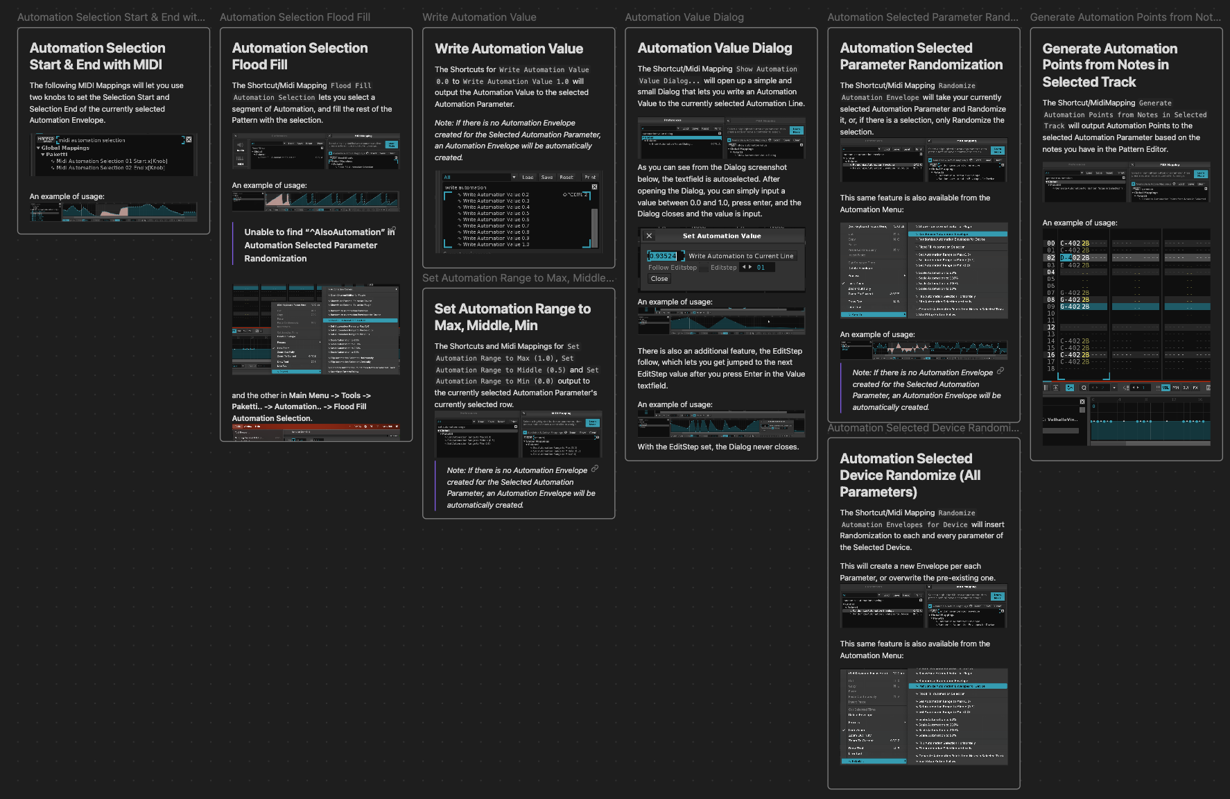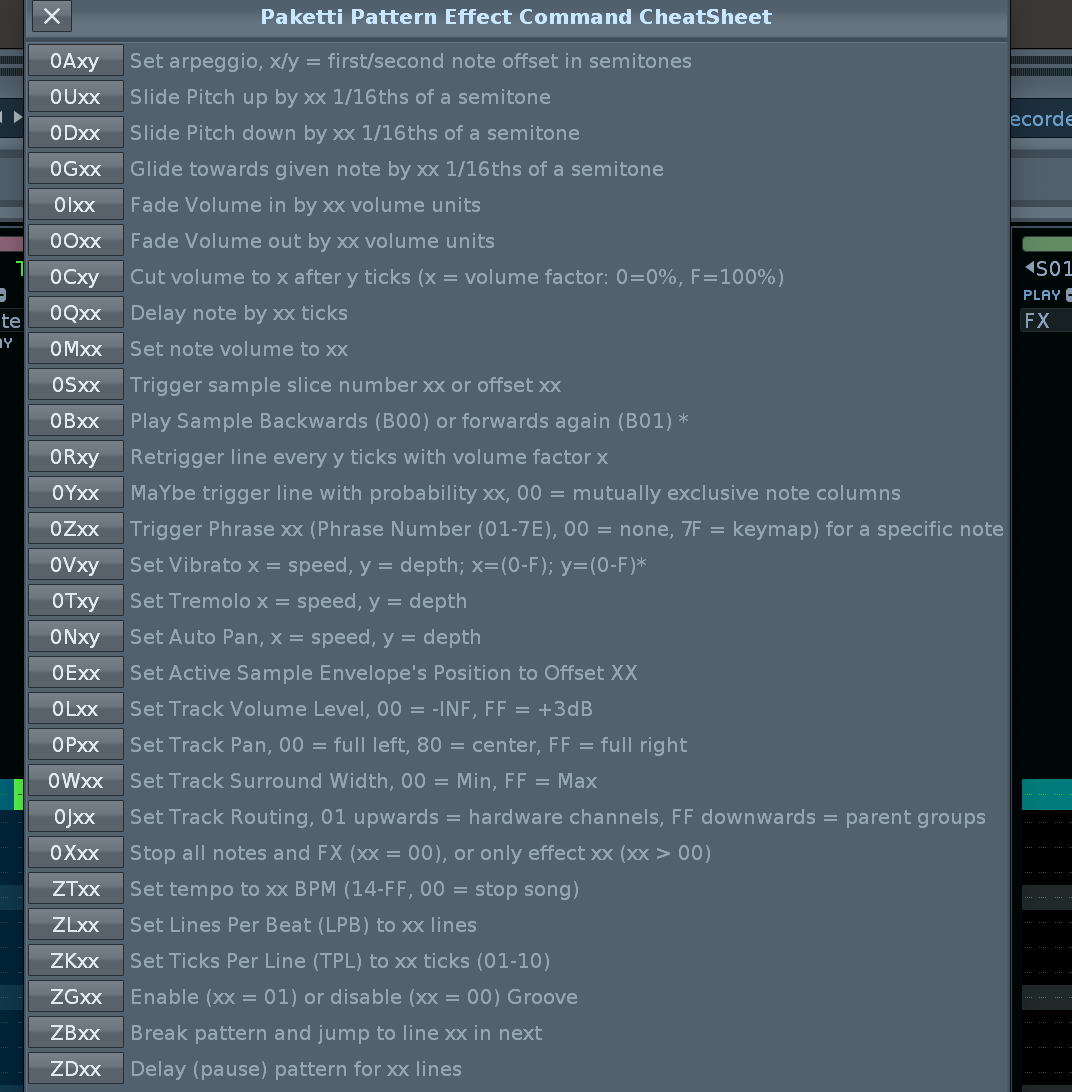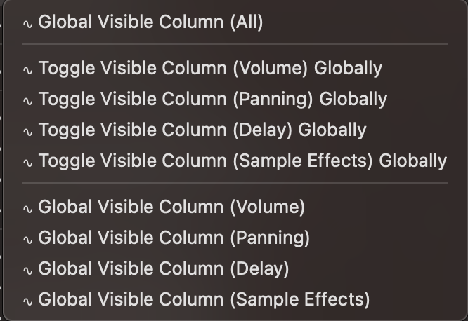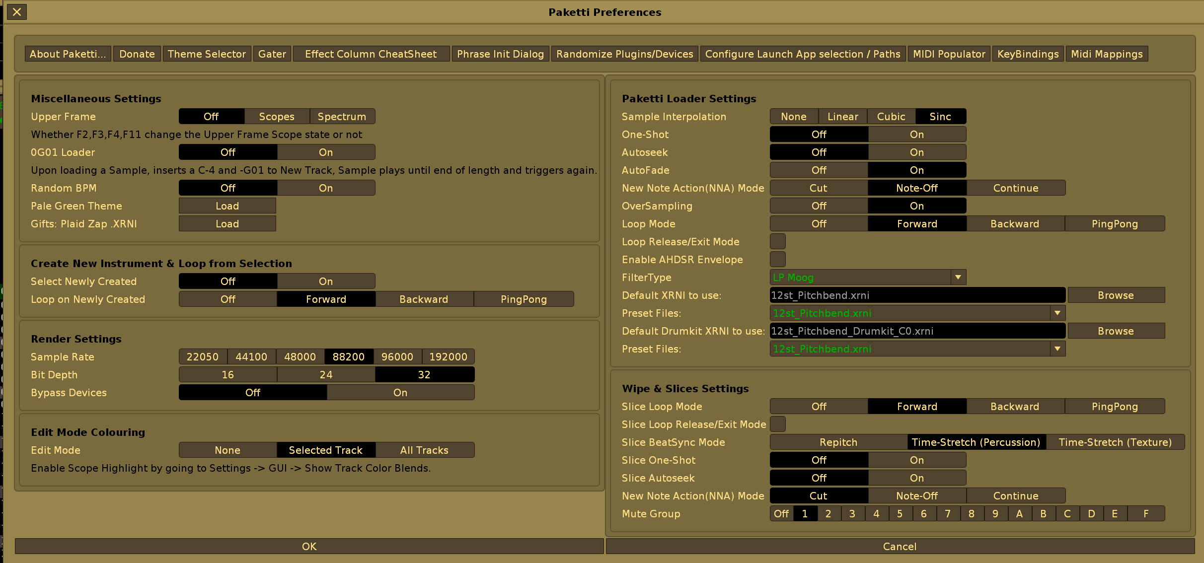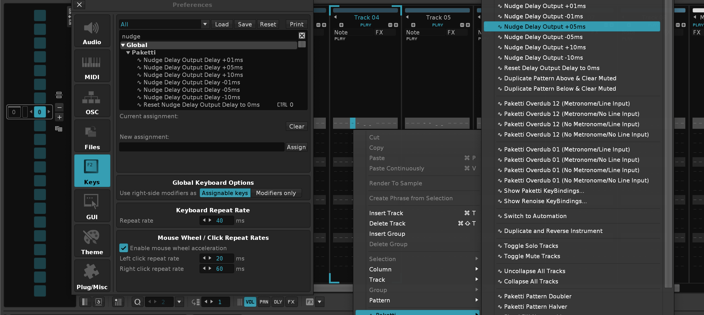 Global:Paketti:Toggle Metronome PrecountPaketti:Toggle Metronome PrecountGlobal:Paketti:Enable Metronome PrecountGlobal:Paketti:Disable Metronome PrecountPaketti:Enable Metronome PrecountPaketti:Disable Metronome PrecountGlobal:Paketti:Toggle Mute/Unmute All TracksPaketti:Toggle Mute/Unmute All TracksGlobal:Paketti:Toggle Mute/Unmute Remembered TracksPaketti:Toggle Mute/Unmute Remembered TracksGlobal:Paketti:Set EditStep & Quantization to 00 through ...to 32Global:Paketti:Increase EditStep & Quantization by 1Global:Paketti:Decrease EditStep & Quantization by 1Global:Paketti:EditStep & Quantization Power of Two AboveGlobal:Paketti:EditStep & Quantization Power of Two BelowPaketti:Set EditStep & Quantization to 00 through ...to 32Paketti:Increase EditStep & Quantization by 1Paketti:Decrease EditStep & Quantization by 1Paketti:EditStep & Quantization Power of Two AbovePaketti:EditStep & Quantization Power of Two BelowPattern Editor:Paketti:Jump to Pattern Fraction 01/02 through 16/16Paketti:Jump to Pattern Fraction 01/02 through 16/16Pattern Editor:Paketti:Save Cursor PositionPattern Editor:Paketti:Jump to Previous PositionGlobal:Paketti:Jump to Previous PositionPaketti:Save Cursor PositionPaketti:Jump to Previous PositionGlobal:Paketti:Move Section Loop (Next)Global:Paketti:Move Section Loop (Previous)Paketti:Move Section Loop (Next)Paketti:Move Section Loop (Previous)Pattern Editor:Paketti:Note Off All Columns in GroupPaketti:Note Off All Columns in GroupPattern Editor:Paketti:Mute Playing Note (Insert Note Off)Paketti:Mute Playing Note (Insert Note Off)Global:Paketti:Clone Sequence Without AutomationPattern Sequencer:Paketti:Clone Sequence Without AutomationPattern Matrix:Paketti:Clone Sequence Without AutomationPaketti:Clone Sequence Without AutomationGlobal:Paketti:Wipe Drumkit Sample FX AssignmentsPaketti:Wipe Drumkit Sample FX AssignmentsPattern Editor:Paketti:Invert Volume OnlyPattern Editor:Paketti:Invert Panning OnlyPattern Editor:Paketti:Invert Delay OnlyPattern Editor:Paketti:Invert Sample FX OnlyPaketti:Invert Volume OnlyPaketti:Invert Panning OnlyPaketti:Invert Delay OnlyPaketti:Invert Sample FX OnlyPattern Editor:Paketti:BPM Switcher Dialog...Paketti:BPM Switcher DialogPattern Editor:Paketti:Write Track Mute (0L00)Pattern Editor:Paketti:Write Track Unmute (0L80)Pattern Editor:Paketti:Write Track Solo via 0L00 (Mute All Others)Pattern Editor:Paketti:Write Track Unsolo via 0L80 (Unmute All)Paketti:Write Track Mute (0L00)Paketti:Write Track Unmute (0L80)Paketti:Write Track Solo via 0L00Paketti:Write Track Unsolo via 0L80Global:Paketti:Step Sequencer FX Randomizer Dialog...Paketti:Pattern Editor:Step Sequencer FX RandomizerMain Menu:Tools:Paketti:Pattern Editor:Step Sequencer FX Randomizer...Pattern Editor:Paketti:Step Sequencer FX Randomizer...Pattern Editor:Paketti:Interpolate Current Subcolumn ValuesPattern Editor:Paketti:Interpolate Column Values (Effect Column)Paketti:Interpolate Current Subcolumn ValuesPaketti:Interpolate Column Values (Effect Column)Pattern Editor:Paketti:Fill Effect Column Between NotesPattern Editor:Paketti:Fill Sample Effects Between NotesPaketti:Fill Effect Column Between NotesPaketti:Fill Sample Effects Between NotesPattern Editor:Paketti:Play Next Note LinePattern Editor:Paketti:Play Previous Note LinePaketti:Play Next Note LinePaketti:Play Previous Note LinePattern Editor:Paketti:Clever Note Off Wipe & Replace (Right After)Pattern Editor:Paketti:Clever Note Off Wipe & Replace (Right Before)Pattern Editor:Paketti:Clever Note Off Wipe & Replace (Half Before)Paketti:Clever Note Off Wipe & Replace (Right After)Paketti:Clever Note Off Wipe & Replace (Right Before)Paketti:Clever Note Off Wipe & Replace (Half Before)Pattern Editor:Paketti:Clever Note Off Delay +1Pattern Editor:Paketti:Clever Note Off Delay -1Pattern Editor:Paketti:Clever Note Off Delay +10Pattern Editor:Paketti:Clever Note Off Delay -10Paketti:Clever Note Off Delay +1Paketti:Clever Note Off Delay -1Paketti:Clever Note Off Delay +10Paketti:Clever Note Off Delay -10Pattern Editor:Paketti:Clever Note Off Reset DelayPaketti:Clever Note Off Reset DelayPattern Editor:Paketti:OctaMED Note Echo Dialog...Paketti:OctaMED Note Echo DialogPakettiSetEditStepAndQuantization() forcing quantize enabled when changing values. Now saves and restores the record_quantize_enabled state so changing EditStep/Quantization values no longer toggles quantize on/off. Status bar shows enabled state: EditStep: 8, Quantize: 8 (On) or (Off).Global:Paketti:Increase EditStep & Quantization by 1, Global:Paketti:Decrease EditStep & Quantization by 1, Global:Paketti:EditStep & Quantization Power of Two Above/Below, Global:Paketti:Set EditStep & Quantization to 00 through 32nudge_with_delay() now sets delay_column_visible = true for ALL tracks in the selection, not just the currently selected track.Pattern Editor:Paketti:Nudge with Delay (Down), Pattern Editor:Paketti:Nudge with Delay (Up)Pattern Editor:Paketti:Interpolate Column Values Exponential (Volume), Pattern Editor:Paketti:Interpolate Column Values Exponential (Panning), Pattern Editor:Paketti:Interpolate Column Values Exponential (Delay), Pattern Editor:Paketti:Interpolate Column Values Exponential (Sample FX), Pattern Editor:Paketti:Interpolate Column Values Exponential (Effect Column), Pattern Editor:Paketti:Interpolate Current Subcolumn Values ExponentialPaketti:Interpolate Column Values Exponential (...)Pattern Editor:Paketti:Jump to Pattern Position Dialog...Paketti:Jump to Pattern Position DialogGlobal:Paketti:Clone and Expand Pattern to LPB*2 (existing, now handles large patterns)visible_note_columns to match (minimum 1). Cleans up tracks with excess empty columns.Global:Paketti:Remove Unused Note ColumnsPaketti:Remove Unused Note ColumnsMain Menu:Tools:Paketti:Pattern Editor:Remove Unused Note ColumnsGlobal:Paketti:Remove Unused Effect ColumnsPaketti:Remove Unused Effect ColumnsMain Menu:Tools:Paketti:Pattern Editor:Remove Unused Effect ColumnsGlobal:Paketti:Re