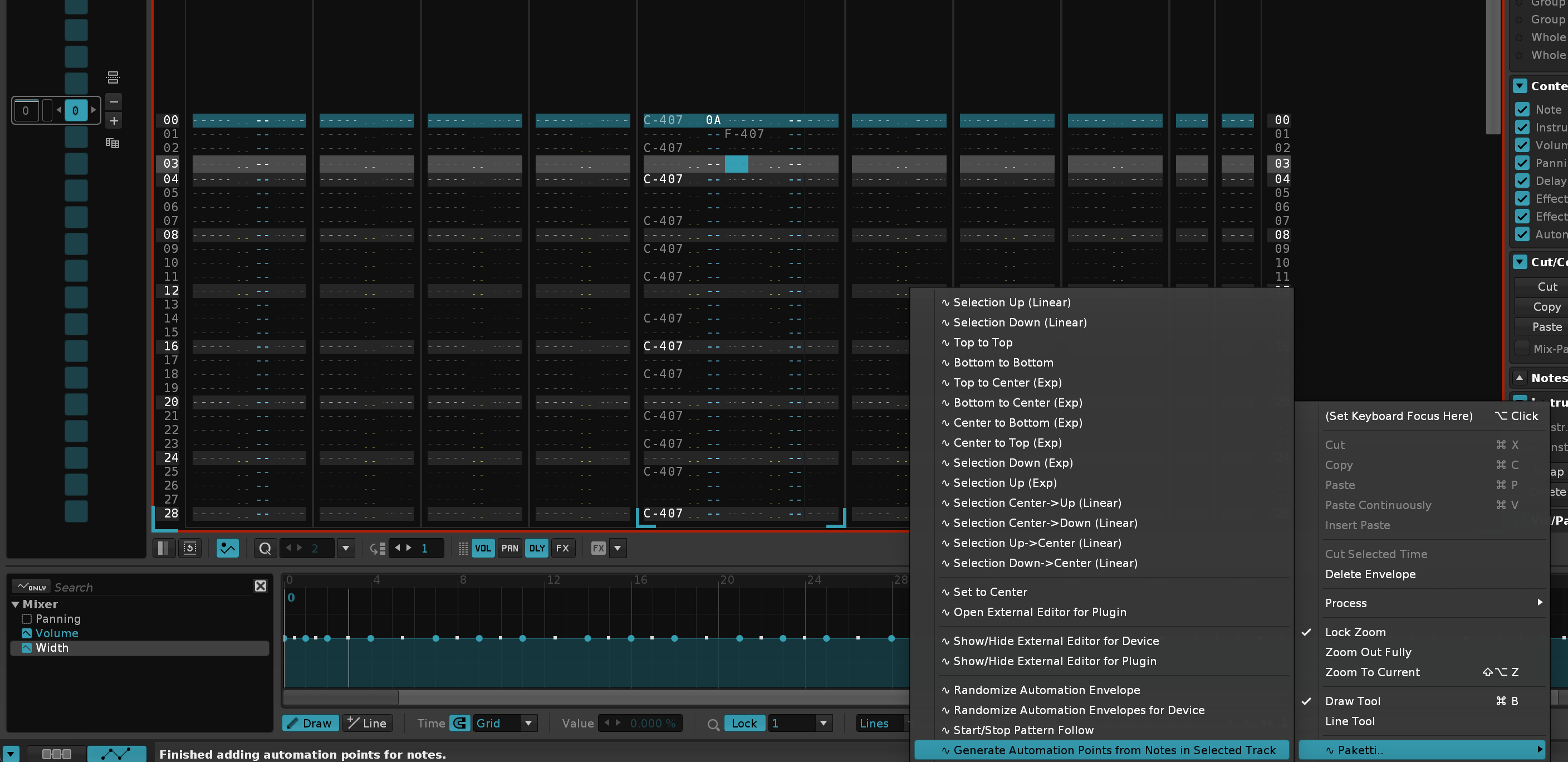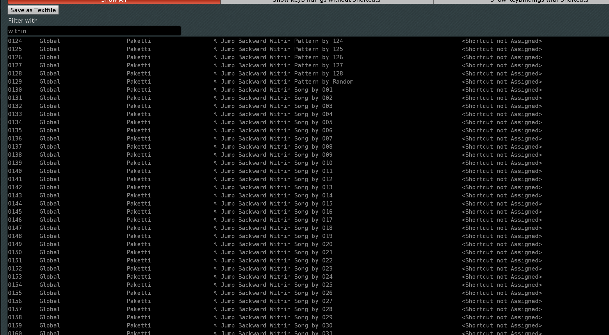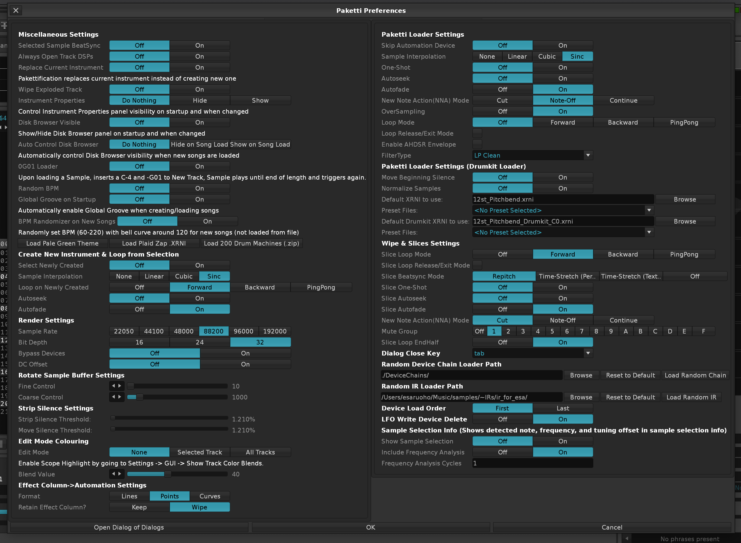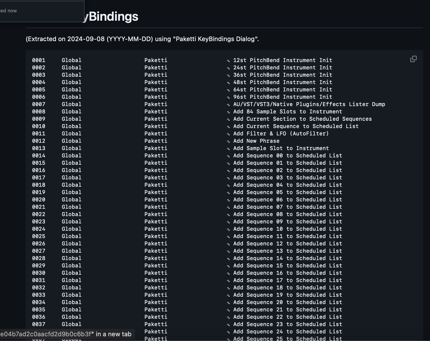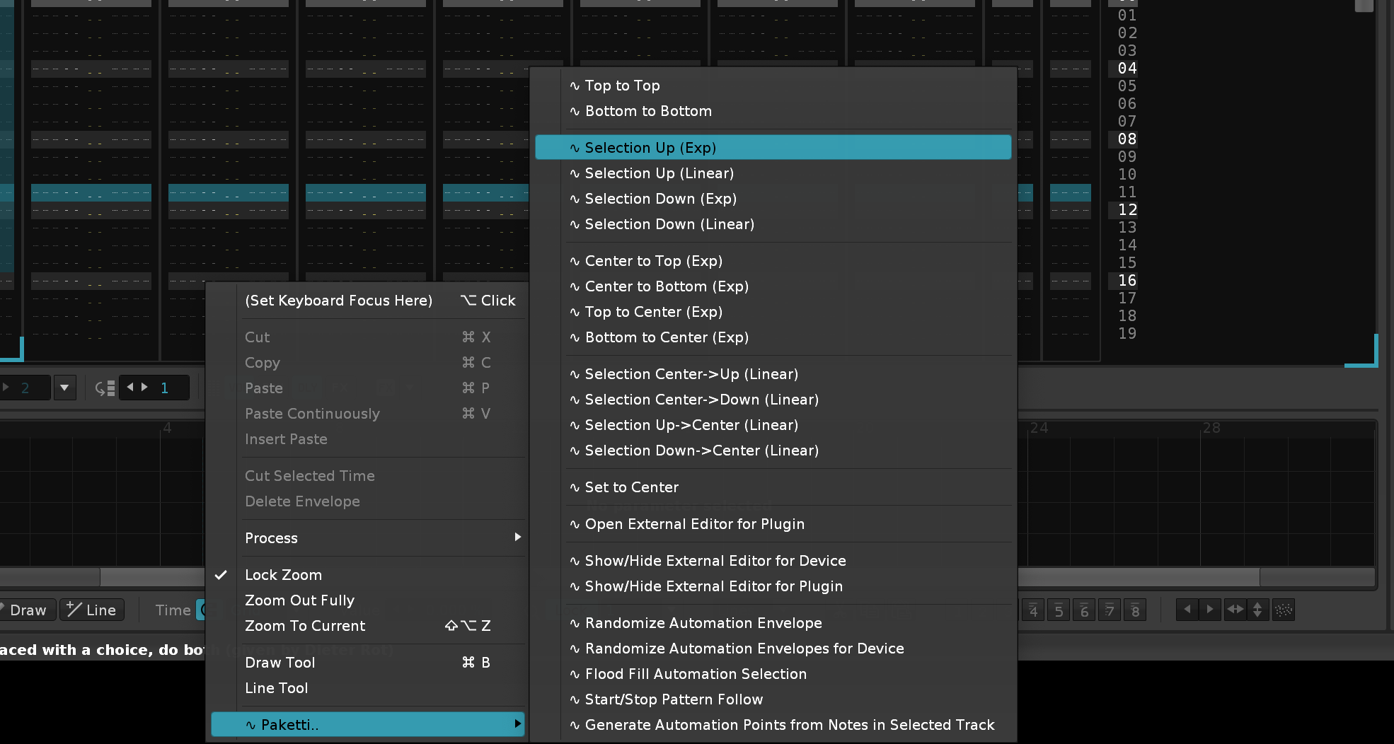 Global:Paketti:Toggle Metronome PrecountPaketti:Toggle Metronome PrecountGlobal:Paketti:Enable Metronome PrecountGlobal:Paketti:Disable Metronome PrecountPaketti:Enable Metronome PrecountPaketti:Disable Metronome PrecountGlobal:Paketti:Toggle Mute/Unmute All TracksPaketti:Toggle Mute/Unmute All TracksGlobal:Paketti:Toggle Mute/Unmute Remembered TracksPaketti:Toggle Mute/Unmute Remembered TracksGlobal:Paketti:Set EditStep & Quantization to 00 through ...to 32Global:Paketti:Increase EditStep & Quantization by 1Global:Paketti:Decrease EditStep & Quantization by 1Global:Paketti:EditStep & Quantization Power of Two AboveGlobal:Paketti:EditStep & Quantization Power of Two BelowPaketti:Set EditStep & Quantization to 00 through ...to 32Paketti:Increase EditStep & Quantization by 1Paketti:Decrease EditStep & Quantization by 1Paketti:EditStep & Quantization Power of Two AbovePaketti:EditStep & Quantization Power of Two BelowPattern Editor:Paketti:Jump to Pattern Fraction 01/02 through 16/16Paketti:Jump to Pattern Fraction 01/02 through 16/16Pattern Editor:Paketti:Save Cursor PositionPattern Editor:Paketti:Jump to Previous PositionGlobal:Paketti:Jump to Previous PositionPaketti:Save Cursor PositionPaketti:Jump to Previous PositionGlobal:Paketti:Move Section Loop (Next)Global:Paketti:Move Section Loop (Previous)Paketti:Move Section Loop (Next)Paketti:Move Section Loop (Previous)Pattern Editor:Paketti:Note Off All Columns in GroupPaketti:Note Off All Columns in GroupPattern Editor:Paketti:Mute Playing Note (Insert Note Off)Paketti:Mute Playing Note (Insert Note Off)Global:Paketti:Clone Sequence Without AutomationPattern Sequencer:Paketti:Clone Sequence Without AutomationPattern Matrix:Paketti:Clone Sequence Without AutomationPaketti:Clone Sequence Without AutomationGlobal:Paketti:Wipe Drumkit Sample FX AssignmentsPaketti:Wipe Drumkit Sample FX AssignmentsPattern Editor:Paketti:Invert Volume OnlyPattern Editor:Paketti:Invert Panning OnlyPattern Editor:Paketti:Invert Delay OnlyPattern Editor:Paketti:Invert Sample FX OnlyPaketti:Invert Volume OnlyPaketti:Invert Panning OnlyPaketti:Invert Delay OnlyPaketti:Invert Sample FX OnlyPattern Editor:Paketti:BPM Switcher Dialog...Paketti:BPM Switcher DialogPattern Editor:Paketti:Write Track Mute (0L00)Pattern Editor:Paketti:Write Track Unmute (0L80)Pattern Editor:Paketti:Write Track Solo via 0L00 (Mute All Others)Pattern Editor:Paketti:Write Track Unsolo via 0L80 (Unmute All)Paketti:Write Track Mute (0L00)Paketti:Write Track Unmute (0L80)Paketti:Write Track Solo via 0L00Paketti:Write Track Unsolo via 0L80Global:Paketti:Step Sequencer FX Randomizer Dialog...Paketti:Pattern Editor:Step Sequencer FX RandomizerMain Menu:Tools:Paketti:Pattern Editor:Step Sequencer FX Randomizer...Pattern Editor:Paketti:Step Sequencer FX Randomizer...Pattern Editor:Paketti:Interpolate Current Subcolumn ValuesPattern Editor:Paketti:Interpolate Column Values (Effect Column)Paketti:Interpolate Current Subcolumn ValuesPaketti:Interpolate Column Values (Effect Column)Pattern Editor:Paketti:Fill Effect Column Between NotesPattern Editor:Paketti:Fill Sample Effects Between NotesPaketti:Fill Effect Column Between NotesPaketti:Fill Sample Effects Between NotesPattern Editor:Paketti:Play Next Note LinePattern Editor:Paketti:Play Previous Note LinePaketti:Play Next Note LinePaketti:Play Previous Note LinePattern Editor:Paketti:Clever Note Off Wipe & Replace (Right After)Pattern Editor:Paketti:Clever Note Off Wipe & Replace (Right Before)Pattern Editor:Paketti:Clever Note Off Wipe & Replace (Half Before)Paketti:Clever Note Off Wipe & Replace (Right After)Paketti:Clever Note Off Wipe & Replace (Right Before)Paketti:Clever Note Off Wipe & Replace (Half Before)Pattern Editor:Paketti:Clever Note Off Delay +1Pattern Editor:Paketti:Clever Note Off Delay -1Pattern Editor:Paketti:Clever Note Off Delay +10Pattern Editor:Paketti:Clever Note Off Delay -10Paketti:Clever Note Off Delay +1Paketti:Clever Note Off Delay -1Paketti:Clever Note Off Delay +10Paketti:Clever Note Off Delay -10Pattern Editor:Paketti:Clever Note Off Reset DelayPaketti:Clever Note Off Reset DelayPattern Editor:Paketti:OctaMED Note Echo Dialog...Paketti:OctaMED Note Echo DialogPakettiSetEditStepAndQuantization() forcing quantize enabled when changing values. Now saves and restores the record_quantize_enabled state so changing EditStep/Quantization values no longer toggles quantize on/off. Status bar shows enabled state: EditStep: 8, Quantize: 8 (On) or (Off).Global:Paketti:Increase EditStep & Quantization by 1, Global:Paketti:Decrease EditStep & Quantization by 1, Global:Paketti:EditStep & Quantization Power of Two Above/Below, Global:Paketti:Set EditStep & Quantization to 00 through 32nudge_with_delay() now sets delay_column_visible = true for ALL tracks in the selection, not just the currently selected track.Pattern Editor:Paketti:Nudge with Delay (Down), Pattern Editor:Paketti:Nudge with Delay (Up)Pattern Editor:Paketti:Interpolate Column Values Exponential (Volume), Pattern Editor:Paketti:Interpolate Column Values Exponential (Panning), Pattern Editor:Paketti:Interpolate Column Values Exponential (Delay), Pattern Editor:Paketti:Interpolate Column Values Exponential (Sample FX), Pattern Editor:Paketti:Interpolate Column Values Exponential (Effect Column), Pattern Editor:Paketti:Interpolate Current Subcolumn Values ExponentialPaketti:Interpolate Column Values Exponential (...)Pattern Editor:Paketti:Jump to Pattern Position Dialog...Paketti:Jump to Pattern Position DialogGlobal:Paketti:Clone and Expand Pattern to LPB*2 (existing, now handles large patterns)visible_note_columns to match (minimum 1). Cleans up tracks with excess empty columns.Global:Paketti:Remove Unused Note ColumnsPaketti:Remove Unused Note ColumnsMain Menu:Tools:Paketti:Pattern Editor:Remove Unused Note ColumnsGlobal:Paketti:Remove Unused Effect ColumnsPaketti:Remove Unused Effect ColumnsMain Menu:Tools:Paketti:Pattern Editor:Remove Unused Effect ColumnsGlobal:Paketti:Re
