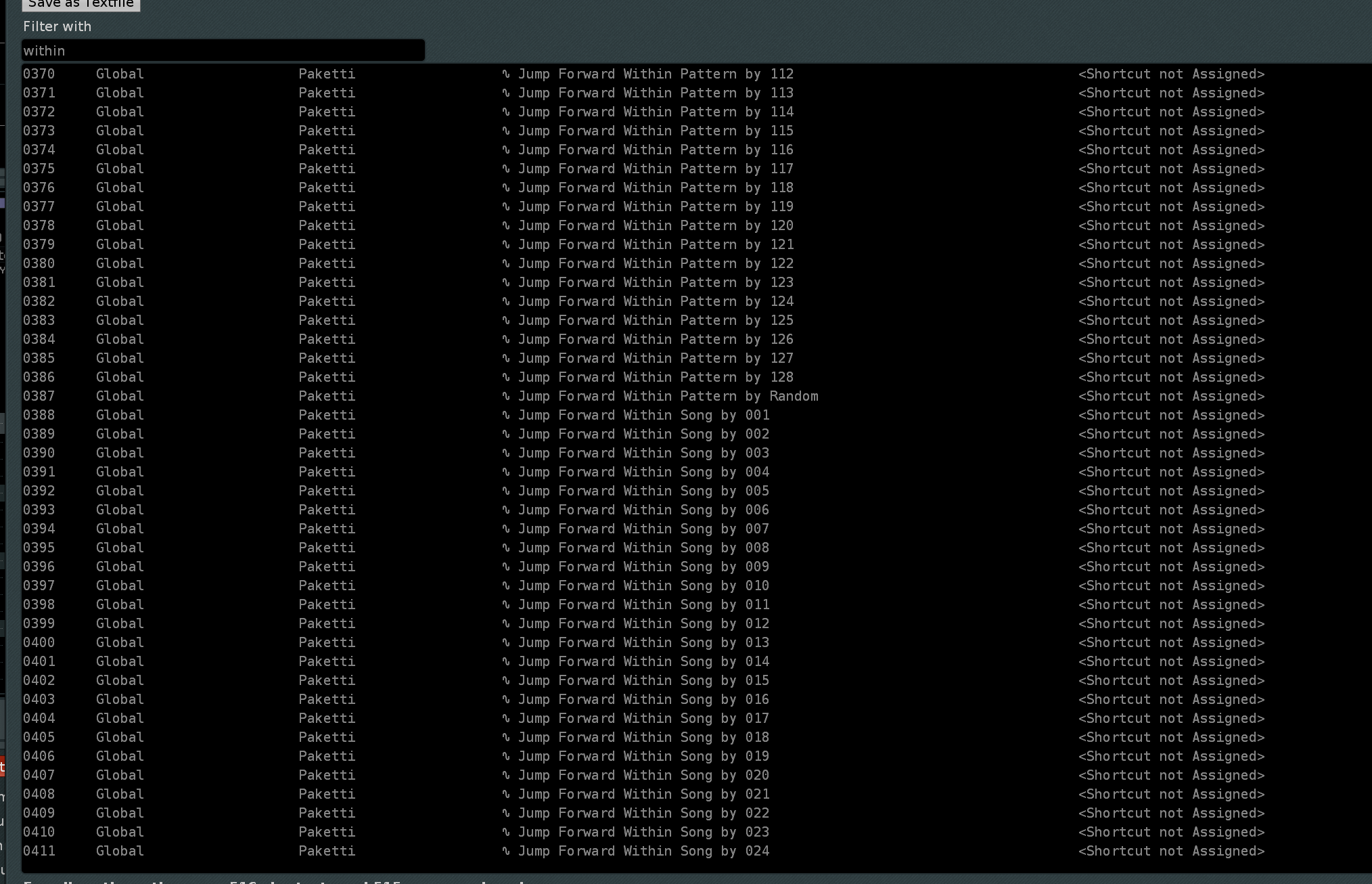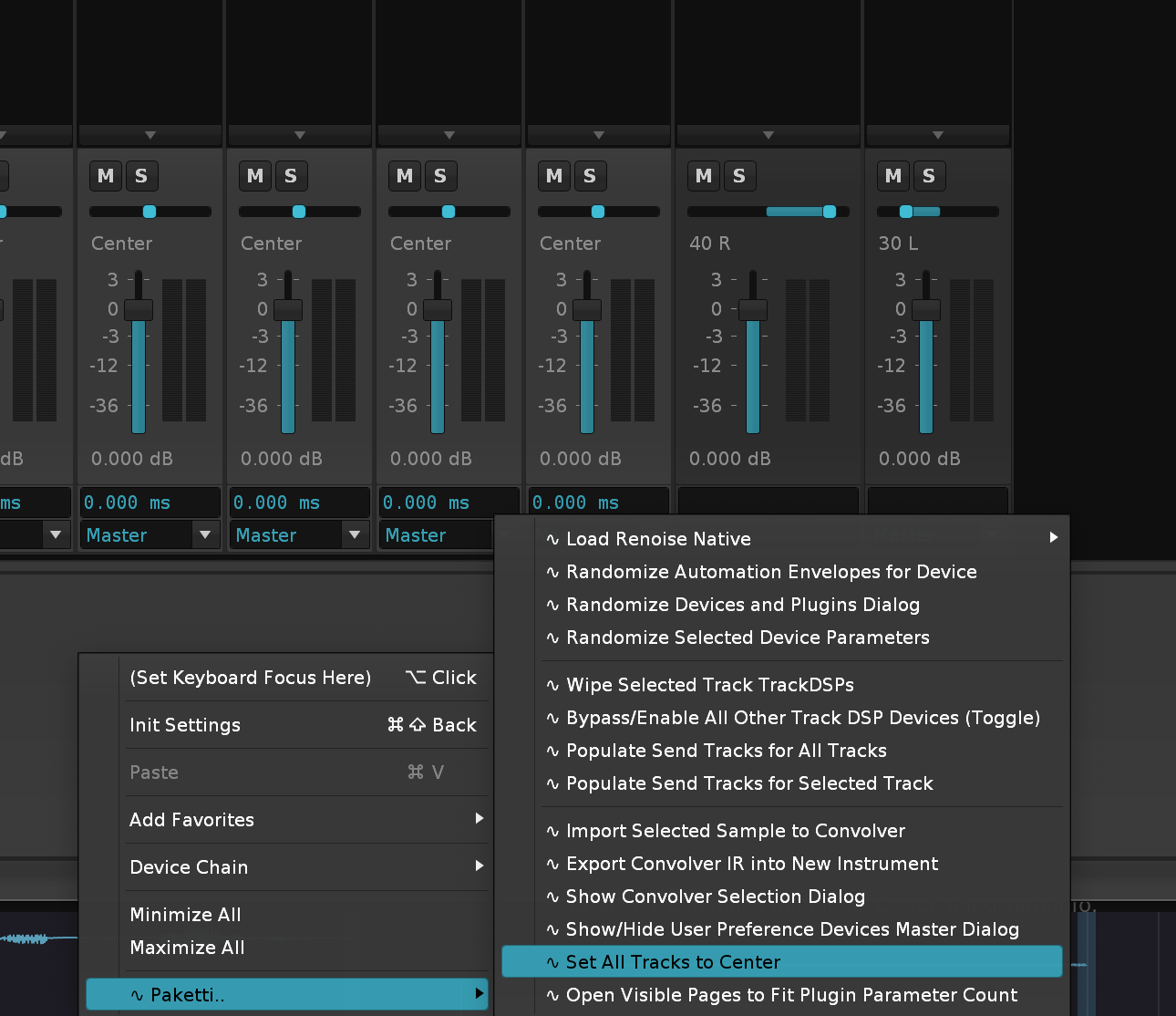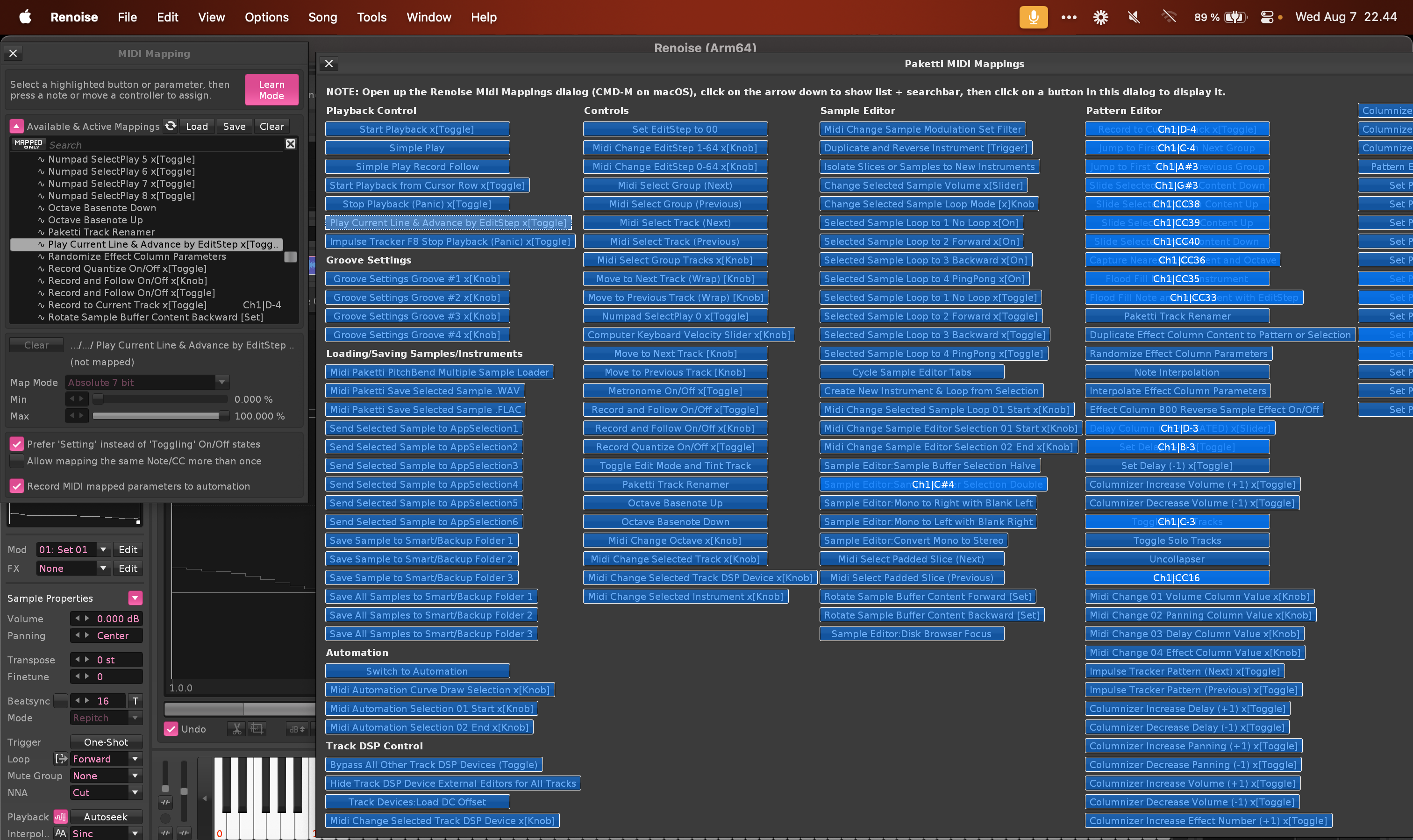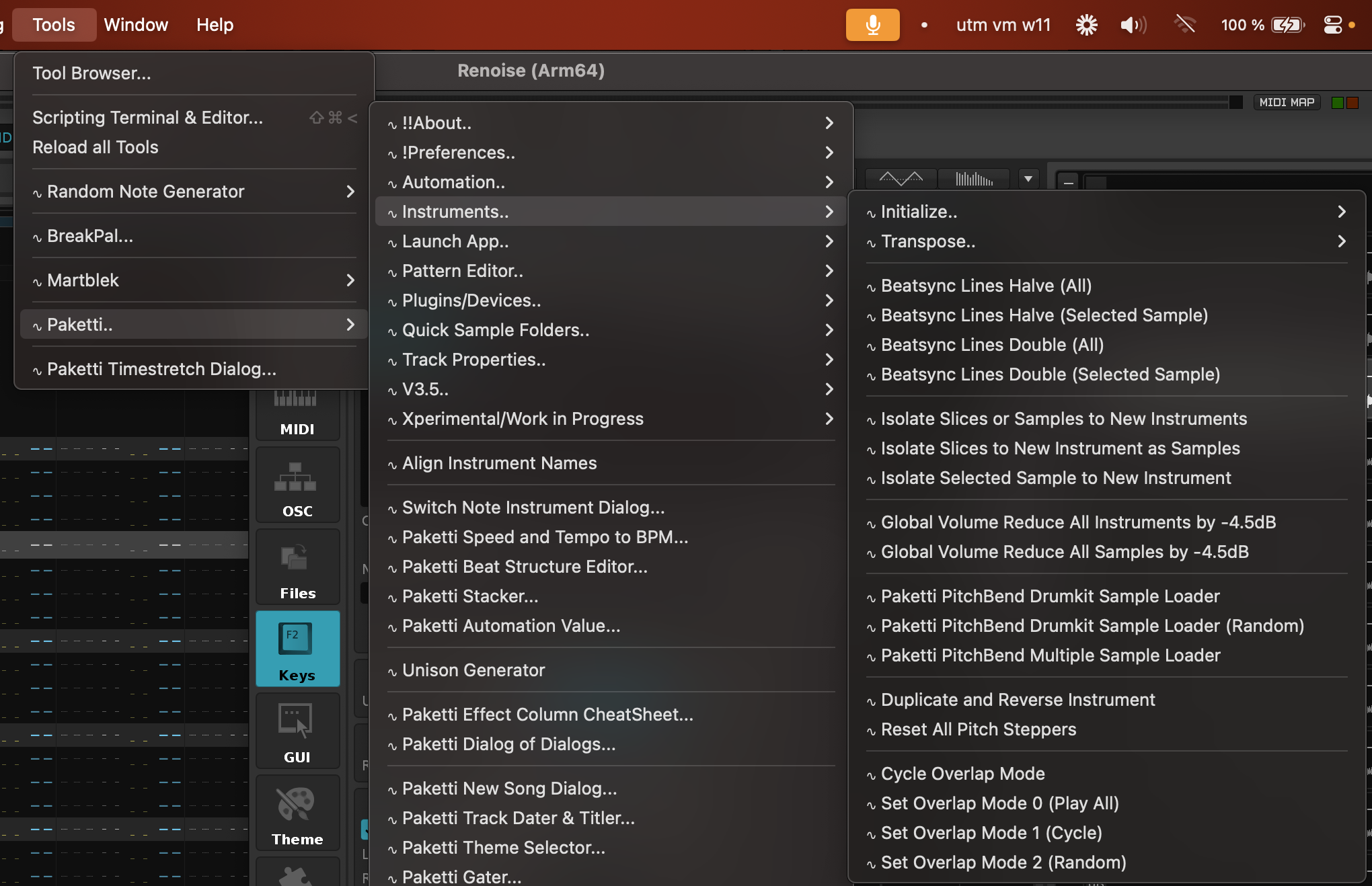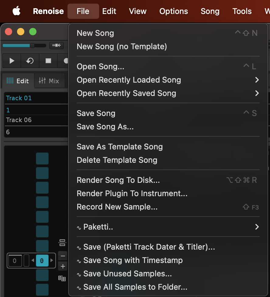 Global:Paketti:Toggle Metronome PrecountPaketti:Toggle Metronome PrecountGlobal:Paketti:Enable Metronome PrecountGlobal:Paketti:Disable Metronome PrecountPaketti:Enable Metronome PrecountPaketti:Disable Metronome PrecountGlobal:Paketti:Toggle Mute/Unmute All TracksPaketti:Toggle Mute/Unmute All TracksGlobal:Paketti:Toggle Mute/Unmute Remembered TracksPaketti:Toggle Mute/Unmute Remembered TracksGlobal:Paketti:Set EditStep & Quantization to 00 through ...to 32Global:Paketti:Increase EditStep & Quantization by 1Global:Paketti:Decrease EditStep & Quantization by 1Global:Paketti:EditStep & Quantization Power of Two AboveGlobal:Paketti:EditStep & Quantization Power of Two BelowPaketti:Set EditStep & Quantization to 00 through ...to 32Paketti:Increase EditStep & Quantization by 1Paketti:Decrease EditStep & Quantization by 1Paketti:EditStep & Quantization Power of Two AbovePaketti:EditStep & Quantization Power of Two BelowPattern Editor:Paketti:Jump to Pattern Fraction 01/02 through 16/16Paketti:Jump to Pattern Fraction 01/02 through 16/16Pattern Editor:Paketti:Save Cursor PositionPattern Editor:Paketti:Jump to Previous PositionGlobal:Paketti:Jump to Previous PositionPaketti:Save Cursor PositionPaketti:Jump to Previous PositionGlobal:Paketti:Move Section Loop (Next)Global:Paketti:Move Section Loop (Previous)Paketti:Move Section Loop (Next)Paketti:Move Section Loop (Previous)Pattern Editor:Paketti:Note Off All Columns in GroupPaketti:Note Off All Columns in GroupPattern Editor:Paketti:Mute Playing Note (Insert Note Off)Paketti:Mute Playing Note (Insert Note Off)Global:Paketti:Clone Sequence Without AutomationPattern Sequencer:Paketti:Clone Sequence Without AutomationPattern Matrix:Paketti:Clone Sequence Without AutomationPaketti:Clone Sequence Without AutomationGlobal:Paketti:Wipe Drumkit Sample FX AssignmentsPaketti:Wipe Drumkit Sample FX AssignmentsPattern Editor:Paketti:Invert Volume OnlyPattern Editor:Paketti:Invert Panning OnlyPattern Editor:Paketti:Invert Delay OnlyPattern Editor:Paketti:Invert Sample FX OnlyPaketti:Invert Volume OnlyPaketti:Invert Panning OnlyPaketti:Invert Delay OnlyPaketti:Invert Sample FX OnlyPattern Editor:Paketti:BPM Switcher Dialog...Paketti:BPM Switcher DialogPattern Editor:Paketti:Write Track Mute (0L00)Pattern Editor:Paketti:Write Track Unmute (0L80)Pattern Editor:Paketti:Write Track Solo via 0L00 (Mute All Others)Pattern Editor:Paketti:Write Track Unsolo via 0L80 (Unmute All)Paketti:Write Track Mute (0L00)Paketti:Write Track Unmute (0L80)Paketti:Write Track Solo via 0L00Paketti:Write Track Unsolo via 0L80Global:Paketti:Step Sequencer FX Randomizer Dialog...Paketti:Pattern Editor:Step Sequencer FX RandomizerMain Menu:Tools:Paketti:Pattern Editor:Step Sequencer FX Randomizer...Pattern Editor:Paketti:Step Sequencer FX Randomizer...Pattern Editor:Paketti:Interpolate Current Subcolumn ValuesPattern Editor:Paketti:Interpolate Column Values (Effect Column)Paketti:Interpolate Current Subcolumn ValuesPaketti:Interpolate Column Values (Effect Column)Pattern Editor:Paketti:Fill Effect Column Between NotesPattern Editor:Paketti:Fill Sample Effects Between NotesPaketti:Fill Effect Column Between NotesPaketti:Fill Sample Effects Between NotesPattern Editor:Paketti:Play Next Note LinePattern Editor:Paketti:Play Previous Note LinePaketti:Play Next Note LinePaketti:Play Previous Note LinePattern Editor:Paketti:Clever Note Off Wipe & Replace (Right After)Pattern Editor:Paketti:Clever Note Off Wipe & Replace (Right Before)Pattern Editor:Paketti:Clever Note Off Wipe & Replace (Half Before)Paketti:Clever Note Off Wipe & Replace (Right After)Paketti:Clever Note Off Wipe & Replace (Right Before)Paketti:Clever Note Off Wipe & Replace (Half Before)Pattern Editor:Paketti:Clever Note Off Delay +1Pattern Editor:Paketti:Clever Note Off Delay -1Pattern Editor:Paketti:Clever Note Off Delay +10Pattern Editor:Paketti:Clever Note Off Delay -10Paketti:Clever Note Off Delay +1Paketti:Clever Note Off Delay -1Paketti:Clever Note Off Delay +10Paketti:Clever Note Off Delay -10Pattern Editor:Paketti:Clever Note Off Reset DelayPaketti:Clever Note Off Reset DelayPattern Editor:Paketti:OctaMED Note Echo Dialog...Paketti:OctaMED Note Echo DialogPakettiSetEditStepAndQuantization() forcing quantize enabled when changing values. Now saves and restores the record_quantize_enabled state so changing EditStep/Quantization values no longer toggles quantize on/off. Status bar shows enabled state: EditStep: 8, Quantize: 8 (On) or (Off).Global:Paketti:Increase EditStep & Quantization by 1, Global:Paketti:Decrease EditStep & Quantization by 1, Global:Paketti:EditStep & Quantization Power of Two Above/Below, Global:Paketti:Set EditStep & Quantization to 00 through 32nudge_with_delay() now sets delay_column_visible = true for ALL tracks in the selection, not just the currently selected track.Pattern Editor:Paketti:Nudge with Delay (Down), Pattern Editor:Paketti:Nudge with Delay (Up)Pattern Editor:Paketti:Interpolate Column Values Exponential (Volume), Pattern Editor:Paketti:Interpolate Column Values Exponential (Panning), Pattern Editor:Paketti:Interpolate Column Values Exponential (Delay), Pattern Editor:Paketti:Interpolate Column Values Exponential (Sample FX), Pattern Editor:Paketti:Interpolate Column Values Exponential (Effect Column), Pattern Editor:Paketti:Interpolate Current Subcolumn Values ExponentialPaketti:Interpolate Column Values Exponential (...)Pattern Editor:Paketti:Jump to Pattern Position Dialog...Paketti:Jump to Pattern Position DialogGlobal:Paketti:Clone and Expand Pattern to LPB*2 (existing, now handles large patterns)visible_note_columns to match (minimum 1). Cleans up tracks with excess empty columns.Global:Paketti:Remove Unused Note ColumnsPaketti:Remove Unused Note ColumnsMain Menu:Tools:Paketti:Pattern Editor:Remove Unused Note ColumnsGlobal:Paketti:Remove Unused Effect ColumnsPaketti:Remove Unused Effect ColumnsMain Menu:Tools:Paketti:Pattern Editor:Remove Unused Effect ColumnsGlobal:Paketti:Re