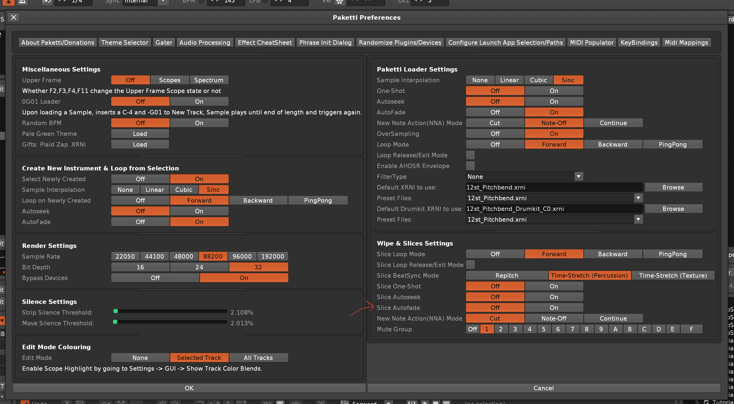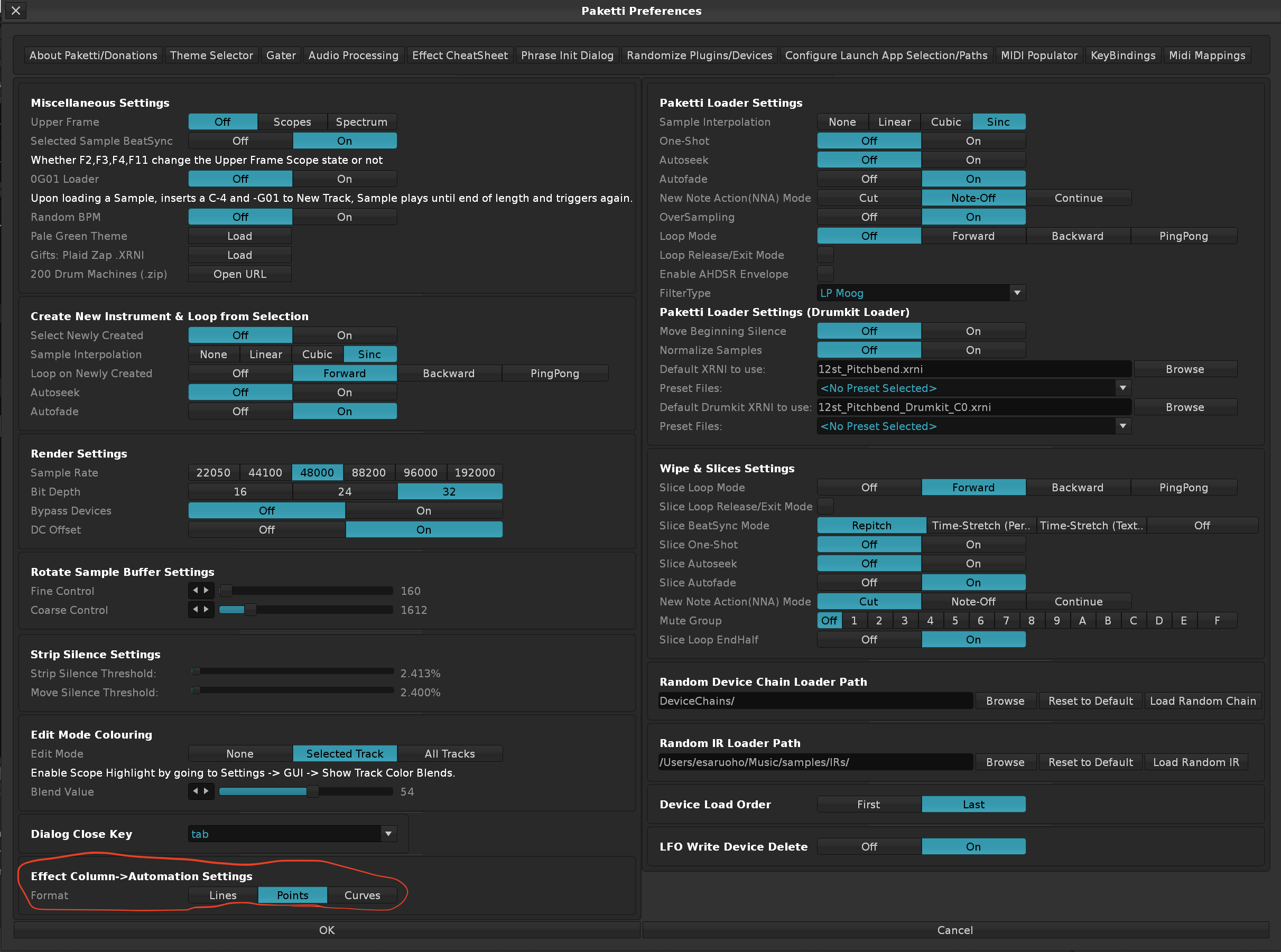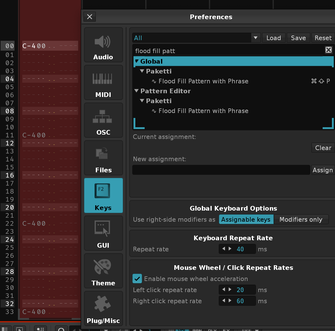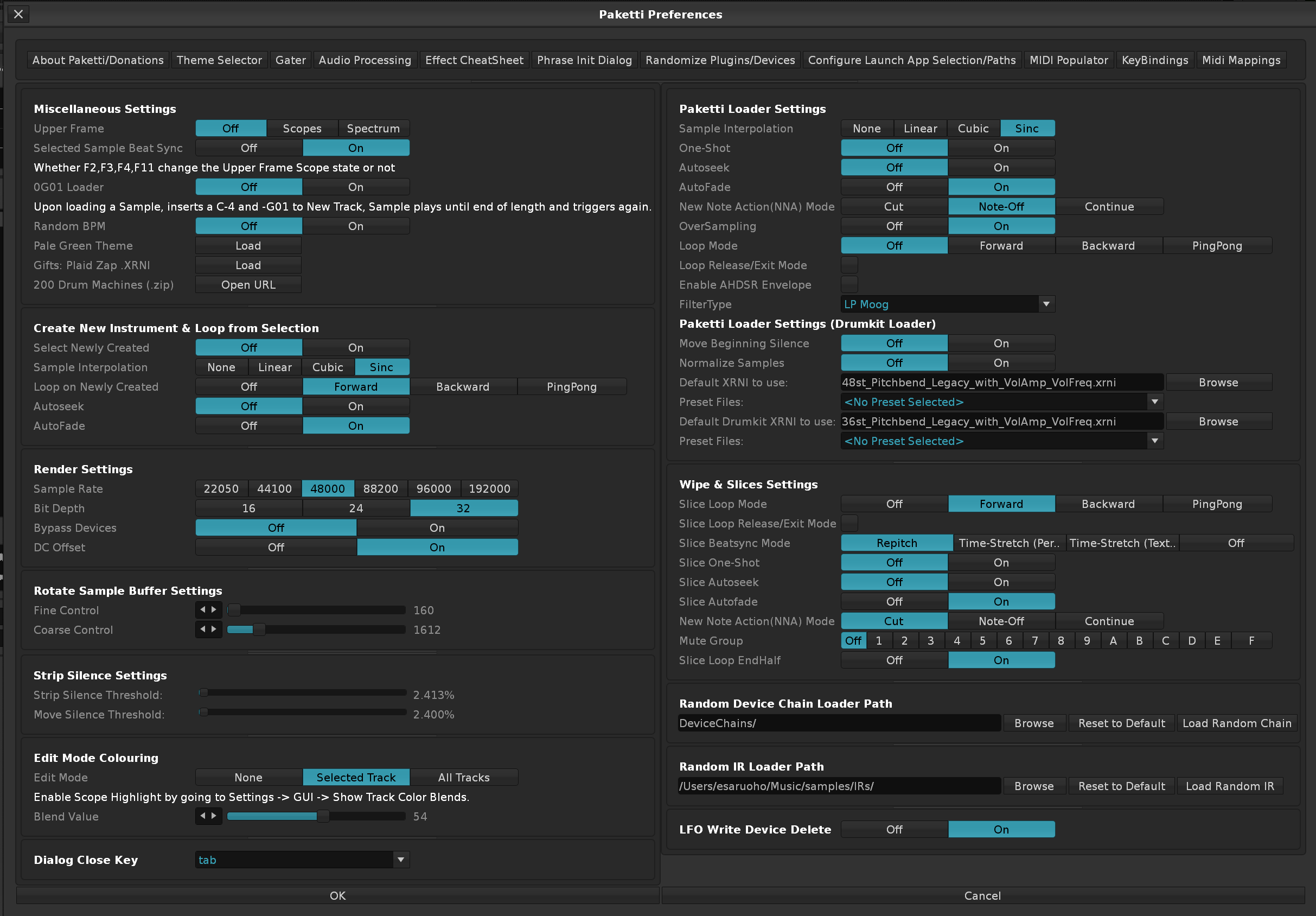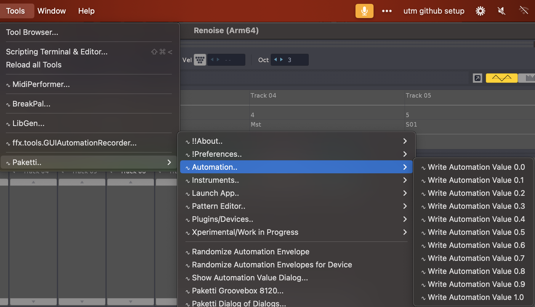 Global:Paketti:Toggle Metronome PrecountPaketti:Toggle Metronome PrecountGlobal:Paketti:Enable Metronome PrecountGlobal:Paketti:Disable Metronome PrecountPaketti:Enable Metronome PrecountPaketti:Disable Metronome PrecountGlobal:Paketti:Toggle Mute/Unmute All TracksPaketti:Toggle Mute/Unmute All TracksGlobal:Paketti:Toggle Mute/Unmute Remembered TracksPaketti:Toggle Mute/Unmute Remembered TracksGlobal:Paketti:Set EditStep & Quantization to 00 through ...to 32Global:Paketti:Increase EditStep & Quantization by 1Global:Paketti:Decrease EditStep & Quantization by 1Global:Paketti:EditStep & Quantization Power of Two AboveGlobal:Paketti:EditStep & Quantization Power of Two BelowPaketti:Set EditStep & Quantization to 00 through ...to 32Paketti:Increase EditStep & Quantization by 1Paketti:Decrease EditStep & Quantization by 1Paketti:EditStep & Quantization Power of Two AbovePaketti:EditStep & Quantization Power of Two BelowPattern Editor:Paketti:Jump to Pattern Fraction 01/02 through 16/16Paketti:Jump to Pattern Fraction 01/02 through 16/16Pattern Editor:Paketti:Save Cursor PositionPattern Editor:Paketti:Jump to Previous PositionGlobal:Paketti:Jump to Previous PositionPaketti:Save Cursor PositionPaketti:Jump to Previous PositionGlobal:Paketti:Move Section Loop (Next)Global:Paketti:Move Section Loop (Previous)Paketti:Move Section Loop (Next)Paketti:Move Section Loop (Previous)Pattern Editor:Paketti:Note Off All Columns in GroupPaketti:Note Off All Columns in GroupPattern Editor:Paketti:Mute Playing Note (Insert Note Off)Paketti:Mute Playing Note (Insert Note Off)Global:Paketti:Clone Sequence Without AutomationPattern Sequencer:Paketti:Clone Sequence Without AutomationPattern Matrix:Paketti:Clone Sequence Without AutomationPaketti:Clone Sequence Without AutomationGlobal:Paketti:Wipe Drumkit Sample FX AssignmentsPaketti:Wipe Drumkit Sample FX AssignmentsPattern Editor:Paketti:Invert Volume OnlyPattern Editor:Paketti:Invert Panning OnlyPattern Editor:Paketti:Invert Delay OnlyPattern Editor:Paketti:Invert Sample FX OnlyPaketti:Invert Volume OnlyPaketti:Invert Panning OnlyPaketti:Invert Delay OnlyPaketti:Invert Sample FX OnlyPattern Editor:Paketti:BPM Switcher Dialog...Paketti:BPM Switcher DialogPattern Editor:Paketti:Write Track Mute (0L00)Pattern Editor:Paketti:Write Track Unmute (0L80)Pattern Editor:Paketti:Write Track Solo via 0L00 (Mute All Others)Pattern Editor:Paketti:Write Track Unsolo via 0L80 (Unmute All)Paketti:Write Track Mute (0L00)Paketti:Write Track Unmute (0L80)Paketti:Write Track Solo via 0L00Paketti:Write Track Unsolo via 0L80Global:Paketti:Step Sequencer FX Randomizer Dialog...Paketti:Pattern Editor:Step Sequencer FX RandomizerMain Menu:Tools:Paketti:Pattern Editor:Step Sequencer FX Randomizer...Pattern Editor:Paketti:Step Sequencer FX Randomizer...Pattern Editor:Paketti:Interpolate Current Subcolumn ValuesPattern Editor:Paketti:Interpolate Column Values (Effect Column)Paketti:Interpolate Current Subcolumn ValuesPaketti:Interpolate Column Values (Effect Column)Pattern Editor:Paketti:Fill Effect Column Between NotesPattern Editor:Paketti:Fill Sample Effects Between NotesPaketti:Fill Effect Column Between NotesPaketti:Fill Sample Effects Between NotesPattern Editor:Paketti:Play Next Note LinePattern Editor:Paketti:Play Previous Note LinePaketti:Play Next Note LinePaketti:Play Previous Note LinePattern Editor:Paketti:Clever Note Off Wipe & Replace (Right After)Pattern Editor:Paketti:Clever Note Off Wipe & Replace (Right Before)Pattern Editor:Paketti:Clever Note Off Wipe & Replace (Half Before)Paketti:Clever Note Off Wipe & Replace (Right After)Paketti:Clever Note Off Wipe & Replace (Right Before)Paketti:Clever Note Off Wipe & Replace (Half Before)Pattern Editor:Paketti:Clever Note Off Delay +1Pattern Editor:Paketti:Clever Note Off Delay -1Pattern Editor:Paketti:Clever Note Off Delay +10Pattern Editor:Paketti:Clever Note Off Delay -10Paketti:Clever Note Off Delay +1Paketti:Clever Note Off Delay -1Paketti:Clever Note Off Delay +10Paketti:Clever Note Off Delay -10Pattern Editor:Paketti:Clever Note Off Reset DelayPaketti:Clever Note Off Reset DelayPattern Editor:Paketti:OctaMED Note Echo Dialog...Paketti:OctaMED Note Echo DialogPakettiSetEditStepAndQuantization() forcing quantize enabled when changing values. Now saves and restores the record_quantize_enabled state so changing EditStep/Quantization values no longer toggles quantize on/off. Status bar shows enabled state: EditStep: 8, Quantize: 8 (On) or (Off).Global:Paketti:Increase EditStep & Quantization by 1, Global:Paketti:Decrease EditStep & Quantization by 1, Global:Paketti:EditStep & Quantization Power of Two Above/Below, Global:Paketti:Set EditStep & Quantization to 00 through 32nudge_with_delay() now sets delay_column_visible = true for ALL tracks in the selection, not just the currently selected track.Pattern Editor:Paketti:Nudge with Delay (Down), Pattern Editor:Paketti:Nudge with Delay (Up)Pattern Editor:Paketti:Interpolate Column Values Exponential (Volume), Pattern Editor:Paketti:Interpolate Column Values Exponential (Panning), Pattern Editor:Paketti:Interpolate Column Values Exponential (Delay), Pattern Editor:Paketti:Interpolate Column Values Exponential (Sample FX), Pattern Editor:Paketti:Interpolate Column Values Exponential (Effect Column), Pattern Editor:Paketti:Interpolate Current Subcolumn Values ExponentialPaketti:Interpolate Column Values Exponential (...)Pattern Editor:Paketti:Jump to Pattern Position Dialog...Paketti:Jump to Pattern Position DialogGlobal:Paketti:Clone and Expand Pattern to LPB*2 (existing, now handles large patterns)visible_note_columns to match (minimum 1). Cleans up tracks with excess empty columns.Global:Paketti:Remove Unused Note ColumnsPaketti:Remove Unused Note ColumnsMain Menu:Tools:Paketti:Pattern Editor:Remove Unused Note ColumnsGlobal:Paketti:Remove Unused Effect ColumnsPaketti:Remove Unused Effect ColumnsMain Menu:Tools:Paketti:Pattern Editor:Remove Unused Effect ColumnsGlobal:Paketti:Re