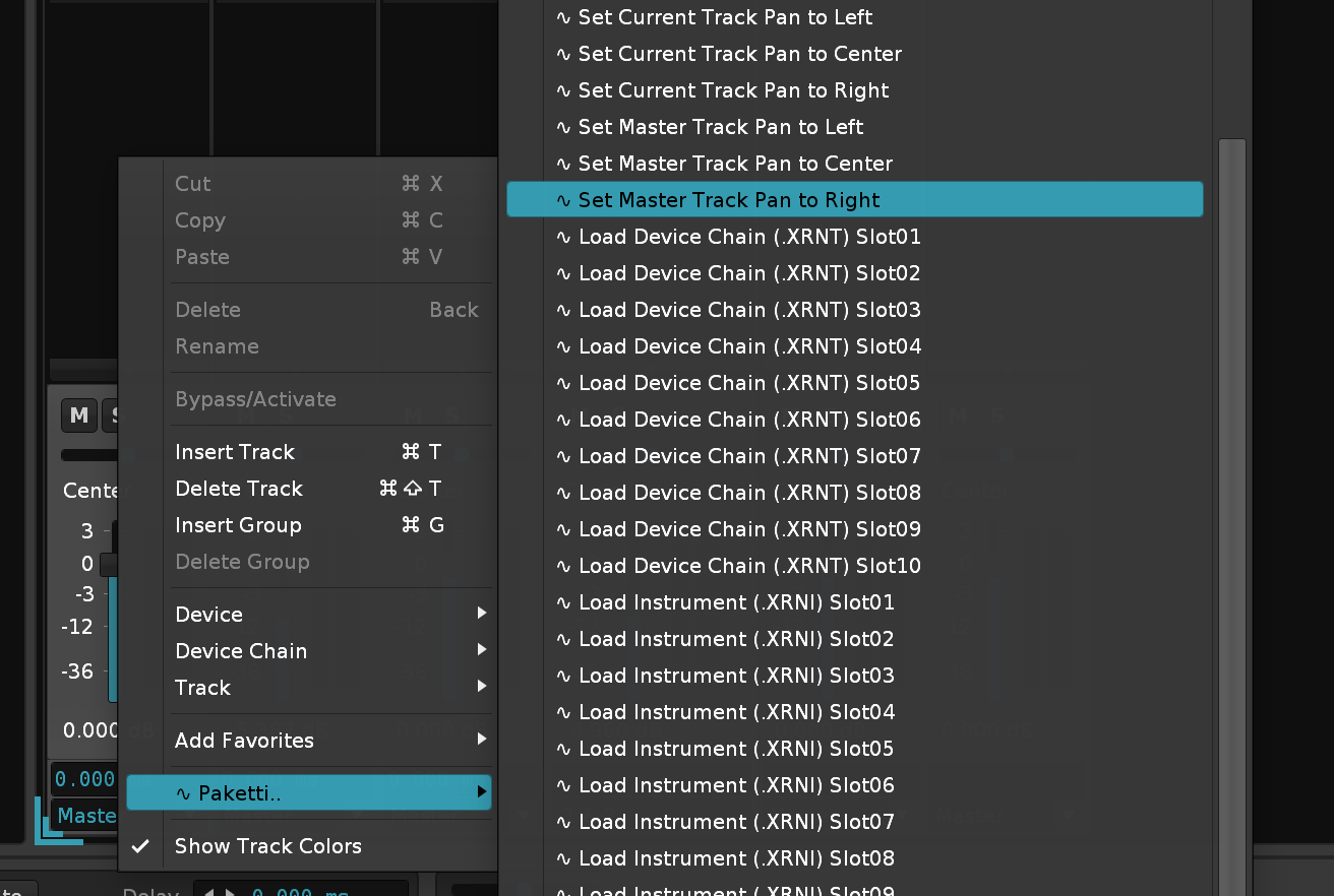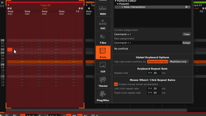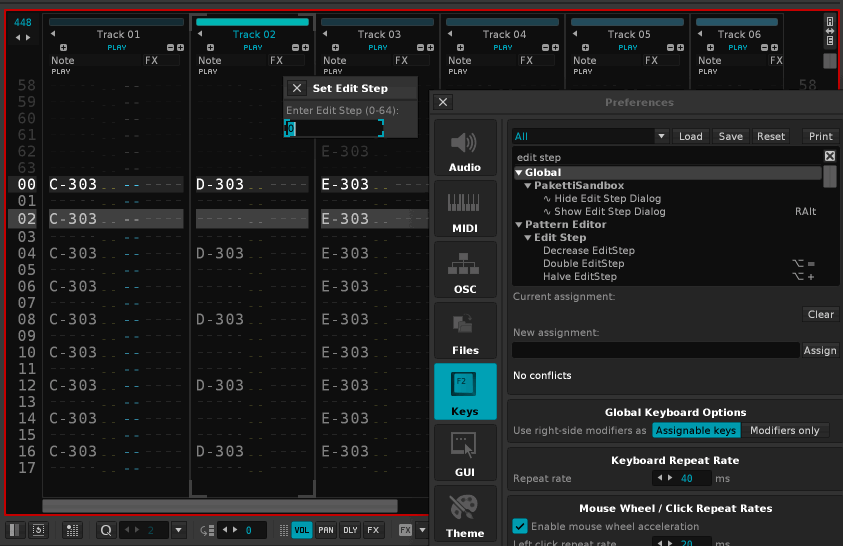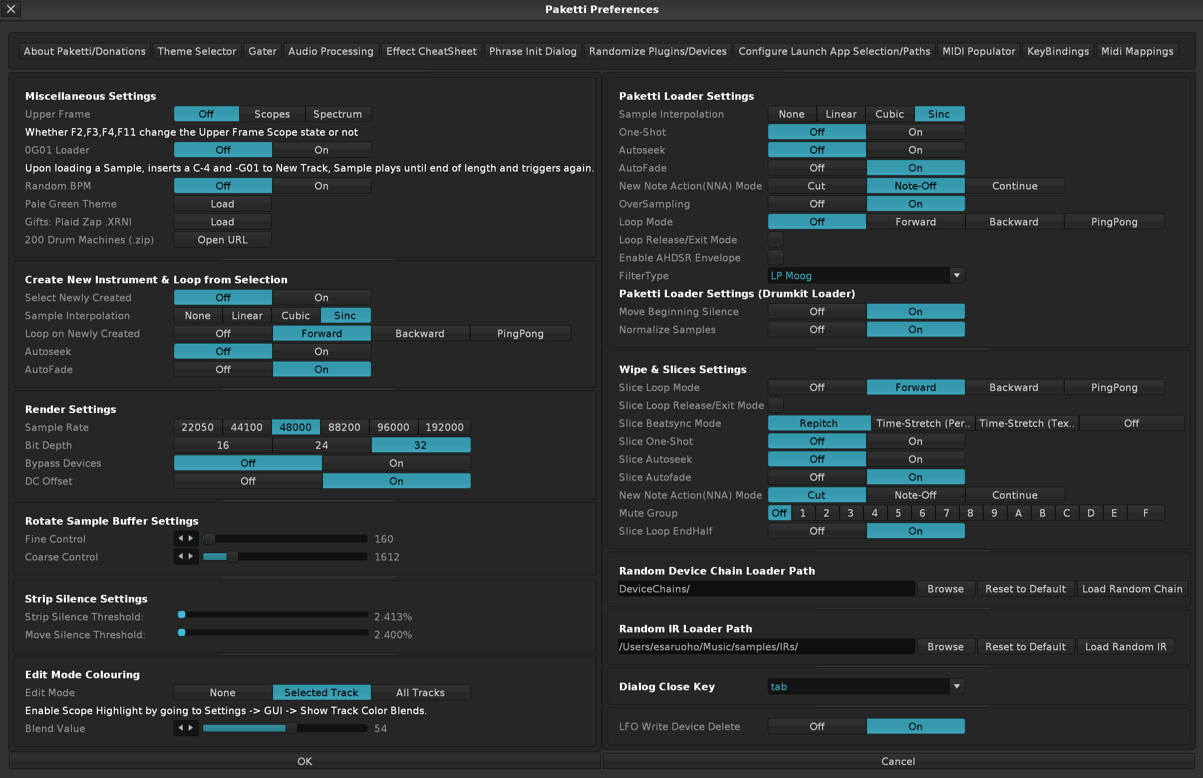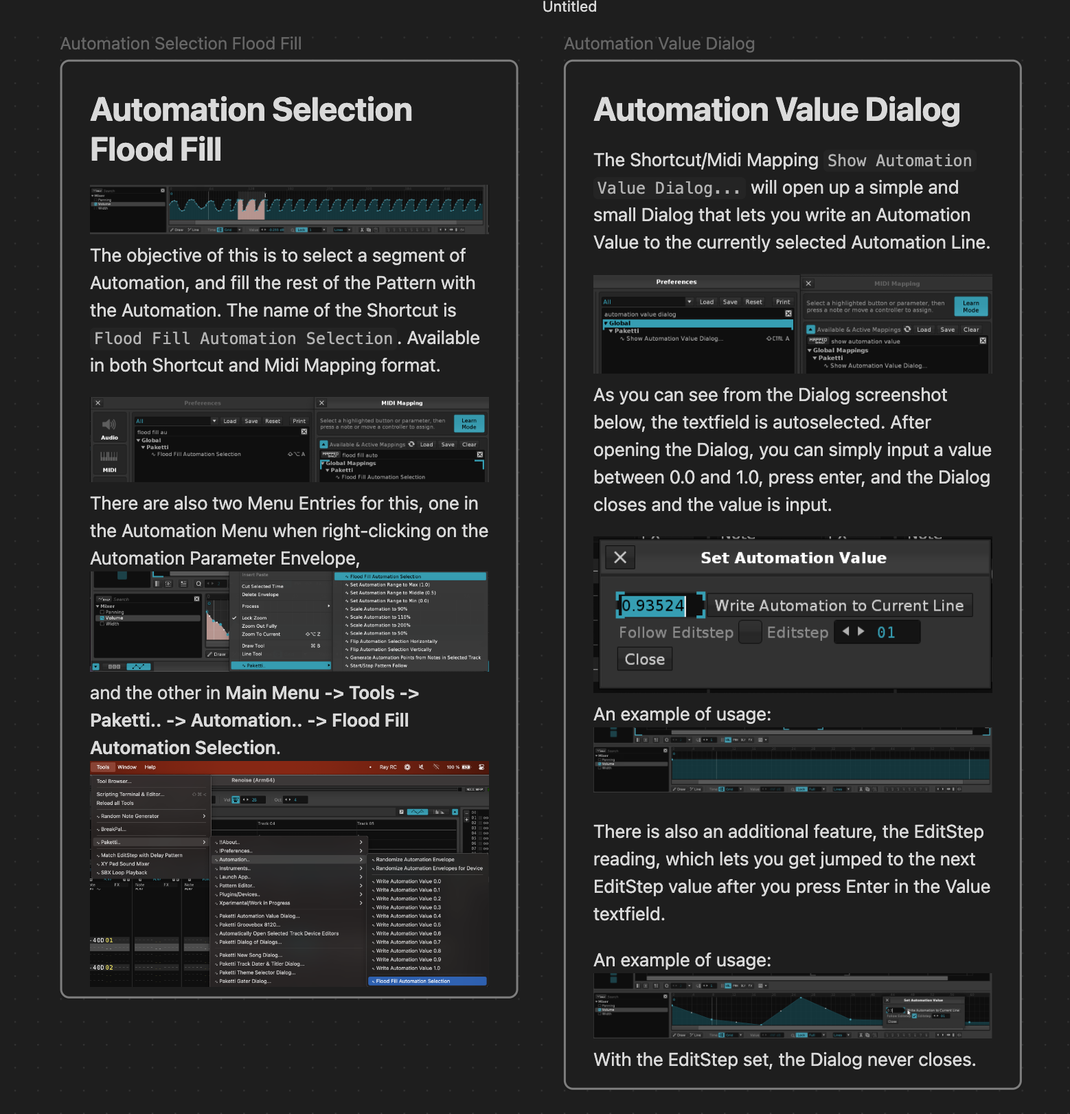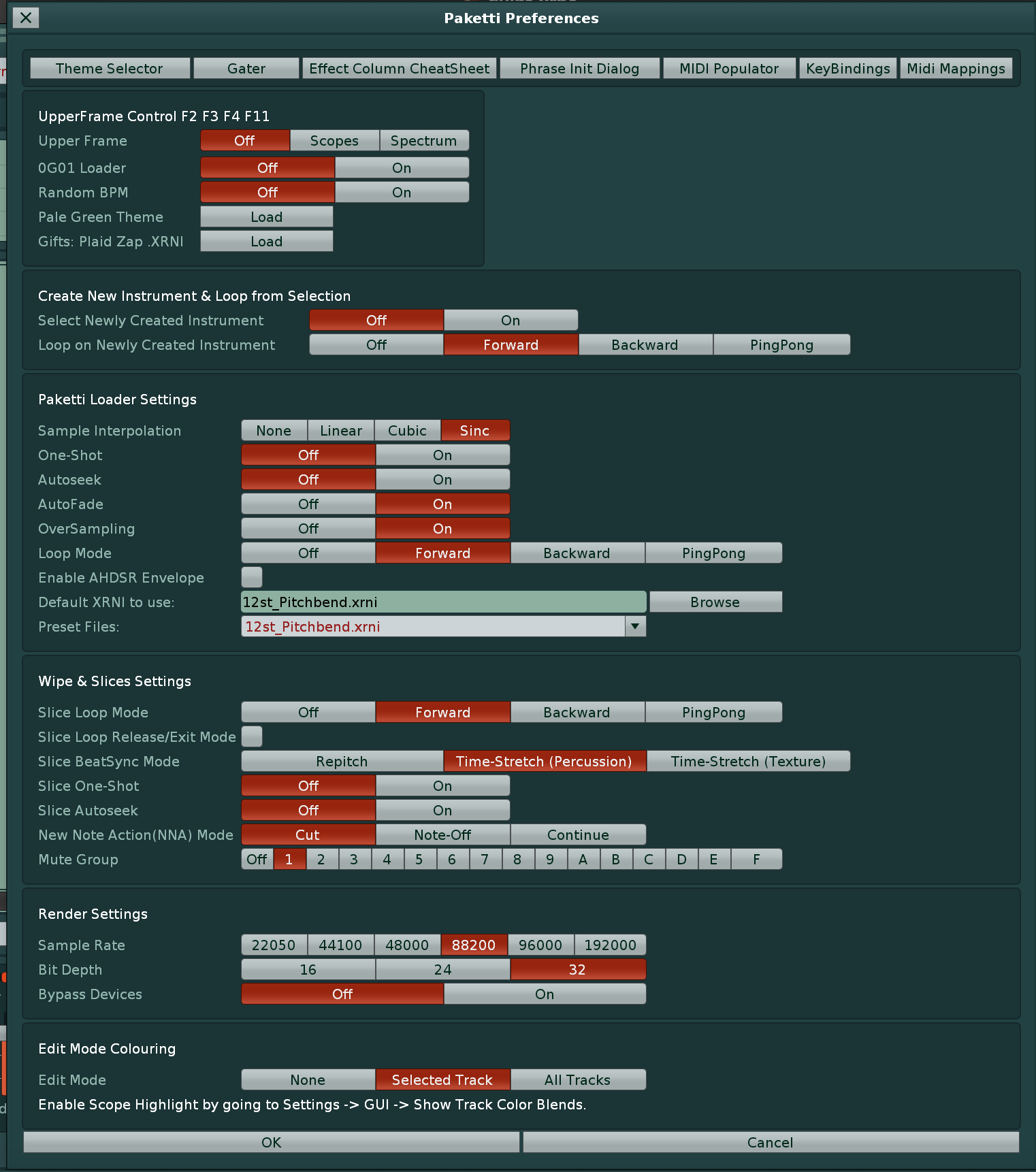 Global:Paketti:Toggle Metronome PrecountPaketti:Toggle Metronome PrecountGlobal:Paketti:Enable Metronome PrecountGlobal:Paketti:Disable Metronome PrecountPaketti:Enable Metronome PrecountPaketti:Disable Metronome PrecountGlobal:Paketti:Toggle Mute/Unmute All TracksPaketti:Toggle Mute/Unmute All TracksGlobal:Paketti:Toggle Mute/Unmute Remembered TracksPaketti:Toggle Mute/Unmute Remembered TracksGlobal:Paketti:Set EditStep & Quantization to 00 through ...to 32Global:Paketti:Increase EditStep & Quantization by 1Global:Paketti:Decrease EditStep & Quantization by 1Global:Paketti:EditStep & Quantization Power of Two AboveGlobal:Paketti:EditStep & Quantization Power of Two BelowPaketti:Set EditStep & Quantization to 00 through ...to 32Paketti:Increase EditStep & Quantization by 1Paketti:Decrease EditStep & Quantization by 1Paketti:EditStep & Quantization Power of Two AbovePaketti:EditStep & Quantization Power of Two BelowPattern Editor:Paketti:Jump to Pattern Fraction 01/02 through 16/16Paketti:Jump to Pattern Fraction 01/02 through 16/16Pattern Editor:Paketti:Save Cursor PositionPattern Editor:Paketti:Jump to Previous PositionGlobal:Paketti:Jump to Previous PositionPaketti:Save Cursor PositionPaketti:Jump to Previous PositionGlobal:Paketti:Move Section Loop (Next)Global:Paketti:Move Section Loop (Previous)Paketti:Move Section Loop (Next)Paketti:Move Section Loop (Previous)Pattern Editor:Paketti:Note Off All Columns in GroupPaketti:Note Off All Columns in GroupPattern Editor:Paketti:Mute Playing Note (Insert Note Off)Paketti:Mute Playing Note (Insert Note Off)Global:Paketti:Clone Sequence Without AutomationPattern Sequencer:Paketti:Clone Sequence Without AutomationPattern Matrix:Paketti:Clone Sequence Without AutomationPaketti:Clone Sequence Without AutomationGlobal:Paketti:Wipe Drumkit Sample FX AssignmentsPaketti:Wipe Drumkit Sample FX AssignmentsPattern Editor:Paketti:Invert Volume OnlyPattern Editor:Paketti:Invert Panning OnlyPattern Editor:Paketti:Invert Delay OnlyPattern Editor:Paketti:Invert Sample FX OnlyPaketti:Invert Volume OnlyPaketti:Invert Panning OnlyPaketti:Invert Delay OnlyPaketti:Invert Sample FX OnlyPattern Editor:Paketti:BPM Switcher Dialog...Paketti:BPM Switcher DialogPattern Editor:Paketti:Write Track Mute (0L00)Pattern Editor:Paketti:Write Track Unmute (0L80)Pattern Editor:Paketti:Write Track Solo via 0L00 (Mute All Others)Pattern Editor:Paketti:Write Track Unsolo via 0L80 (Unmute All)Paketti:Write Track Mute (0L00)Paketti:Write Track Unmute (0L80)Paketti:Write Track Solo via 0L00Paketti:Write Track Unsolo via 0L80Global:Paketti:Step Sequencer FX Randomizer Dialog...Paketti:Pattern Editor:Step Sequencer FX RandomizerMain Menu:Tools:Paketti:Pattern Editor:Step Sequencer FX Randomizer...Pattern Editor:Paketti:Step Sequencer FX Randomizer...Pattern Editor:Paketti:Interpolate Current Subcolumn ValuesPattern Editor:Paketti:Interpolate Column Values (Effect Column)Paketti:Interpolate Current Subcolumn ValuesPaketti:Interpolate Column Values (Effect Column)Pattern Editor:Paketti:Fill Effect Column Between NotesPattern Editor:Paketti:Fill Sample Effects Between NotesPaketti:Fill Effect Column Between NotesPaketti:Fill Sample Effects Between NotesPattern Editor:Paketti:Play Next Note LinePattern Editor:Paketti:Play Previous Note LinePaketti:Play Next Note LinePaketti:Play Previous Note LinePattern Editor:Paketti:Clever Note Off Wipe & Replace (Right After)Pattern Editor:Paketti:Clever Note Off Wipe & Replace (Right Before)Pattern Editor:Paketti:Clever Note Off Wipe & Replace (Half Before)Paketti:Clever Note Off Wipe & Replace (Right After)Paketti:Clever Note Off Wipe & Replace (Right Before)Paketti:Clever Note Off Wipe & Replace (Half Before)Pattern Editor:Paketti:Clever Note Off Delay +1Pattern Editor:Paketti:Clever Note Off Delay -1Pattern Editor:Paketti:Clever Note Off Delay +10Pattern Editor:Paketti:Clever Note Off Delay -10Paketti:Clever Note Off Delay +1Paketti:Clever Note Off Delay -1Paketti:Clever Note Off Delay +10Paketti:Clever Note Off Delay -10Pattern Editor:Paketti:Clever Note Off Reset DelayPaketti:Clever Note Off Reset DelayPattern Editor:Paketti:OctaMED Note Echo Dialog...Paketti:OctaMED Note Echo DialogPakettiSetEditStepAndQuantization() forcing quantize enabled when changing values. Now saves and restores the record_quantize_enabled state so changing EditStep/Quantization values no longer toggles quantize on/off. Status bar shows enabled state: EditStep: 8, Quantize: 8 (On) or (Off).Global:Paketti:Increase EditStep & Quantization by 1, Global:Paketti:Decrease EditStep & Quantization by 1, Global:Paketti:EditStep & Quantization Power of Two Above/Below, Global:Paketti:Set EditStep & Quantization to 00 through 32nudge_with_delay() now sets delay_column_visible = true for ALL tracks in the selection, not just the currently selected track.Pattern Editor:Paketti:Nudge with Delay (Down), Pattern Editor:Paketti:Nudge with Delay (Up)Pattern Editor:Paketti:Interpolate Column Values Exponential (Volume), Pattern Editor:Paketti:Interpolate Column Values Exponential (Panning), Pattern Editor:Paketti:Interpolate Column Values Exponential (Delay), Pattern Editor:Paketti:Interpolate Column Values Exponential (Sample FX), Pattern Editor:Paketti:Interpolate Column Values Exponential (Effect Column), Pattern Editor:Paketti:Interpolate Current Subcolumn Values ExponentialPaketti:Interpolate Column Values Exponential (...)Pattern Editor:Paketti:Jump to Pattern Position Dialog...Paketti:Jump to Pattern Position DialogGlobal:Paketti:Clone and Expand Pattern to LPB*2 (existing, now handles large patterns)visible_note_columns to match (minimum 1). Cleans up tracks with excess empty columns.Global:Paketti:Remove Unused Note ColumnsPaketti:Remove Unused Note ColumnsMain Menu:Tools:Paketti:Pattern Editor:Remove Unused Note ColumnsGlobal:Paketti:Remove Unused Effect ColumnsPaketti:Remove Unused Effect ColumnsMain Menu:Tools:Paketti:Pattern Editor:Remove Unused Effect ColumnsGlobal:Paketti:Re