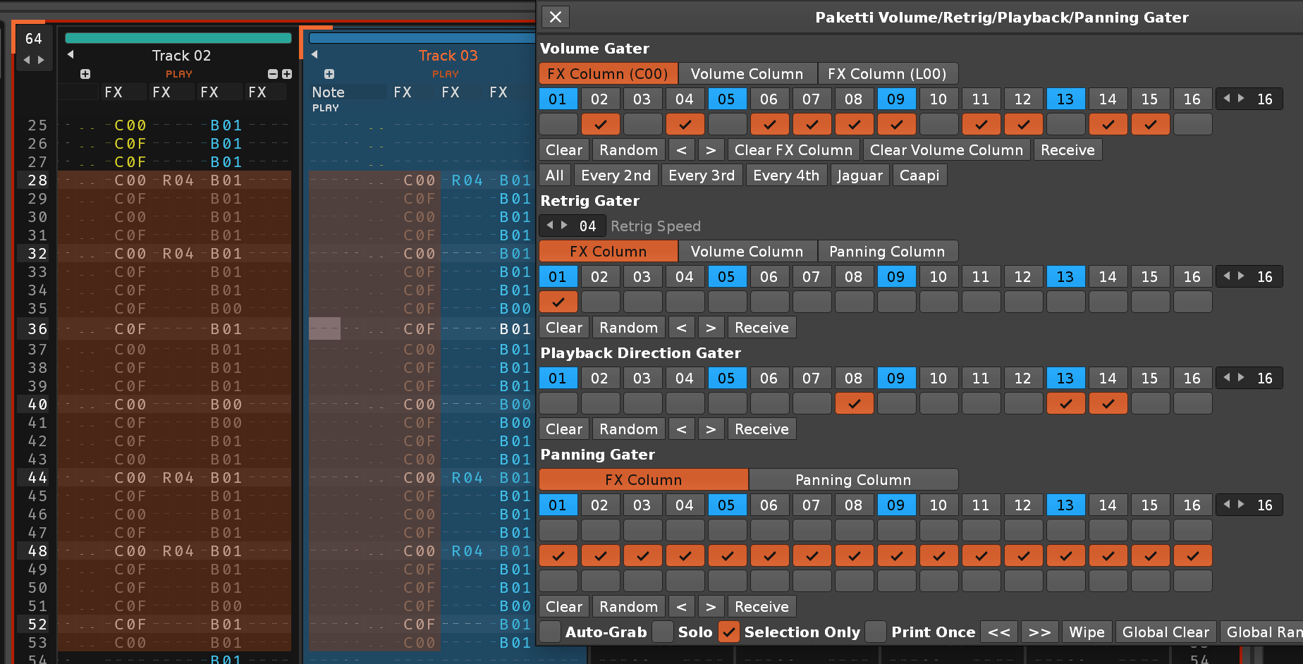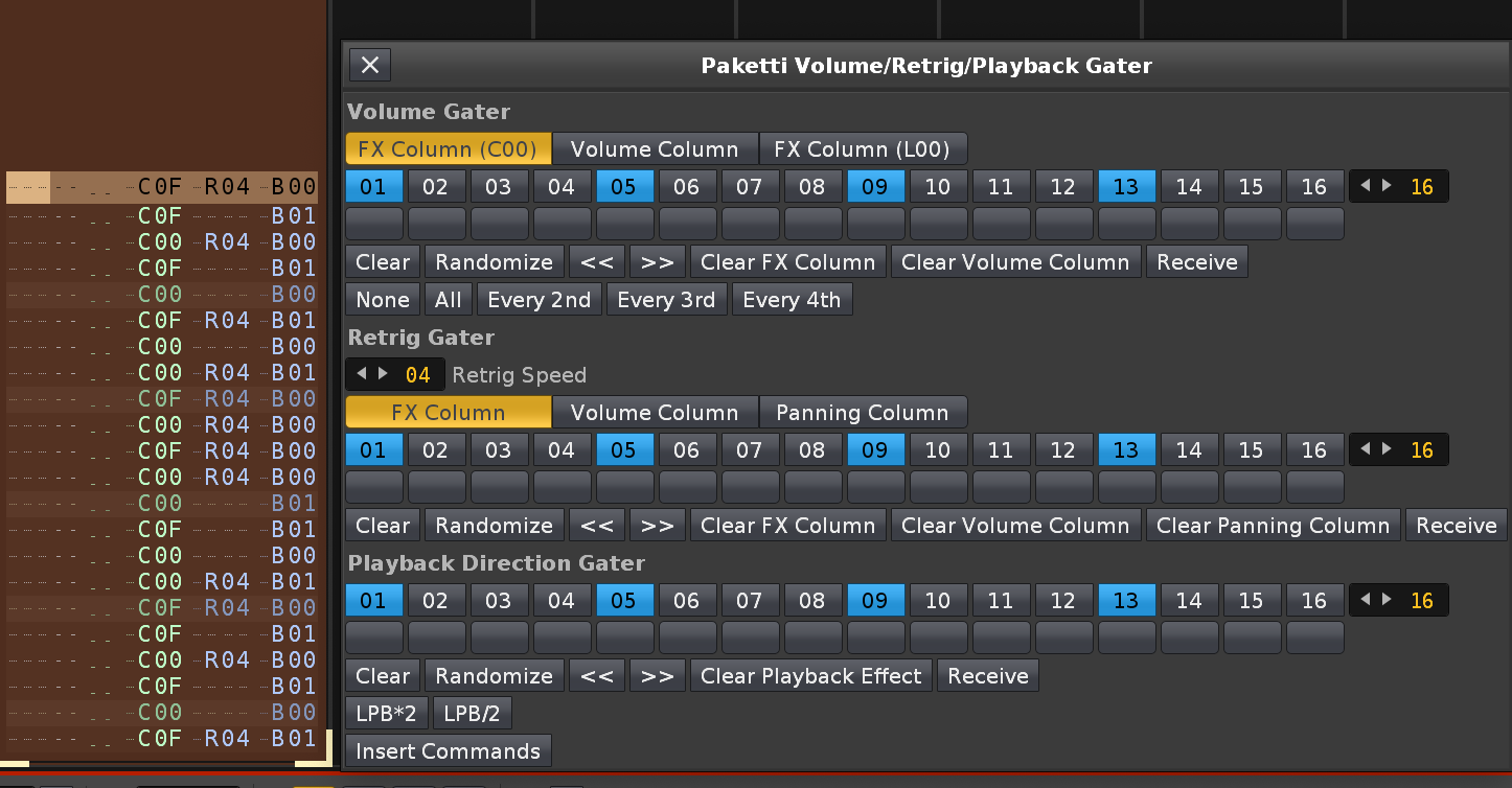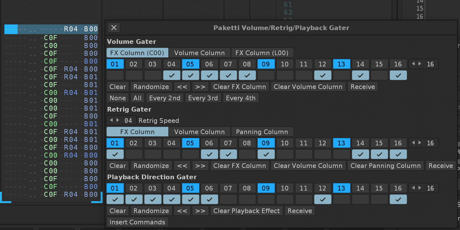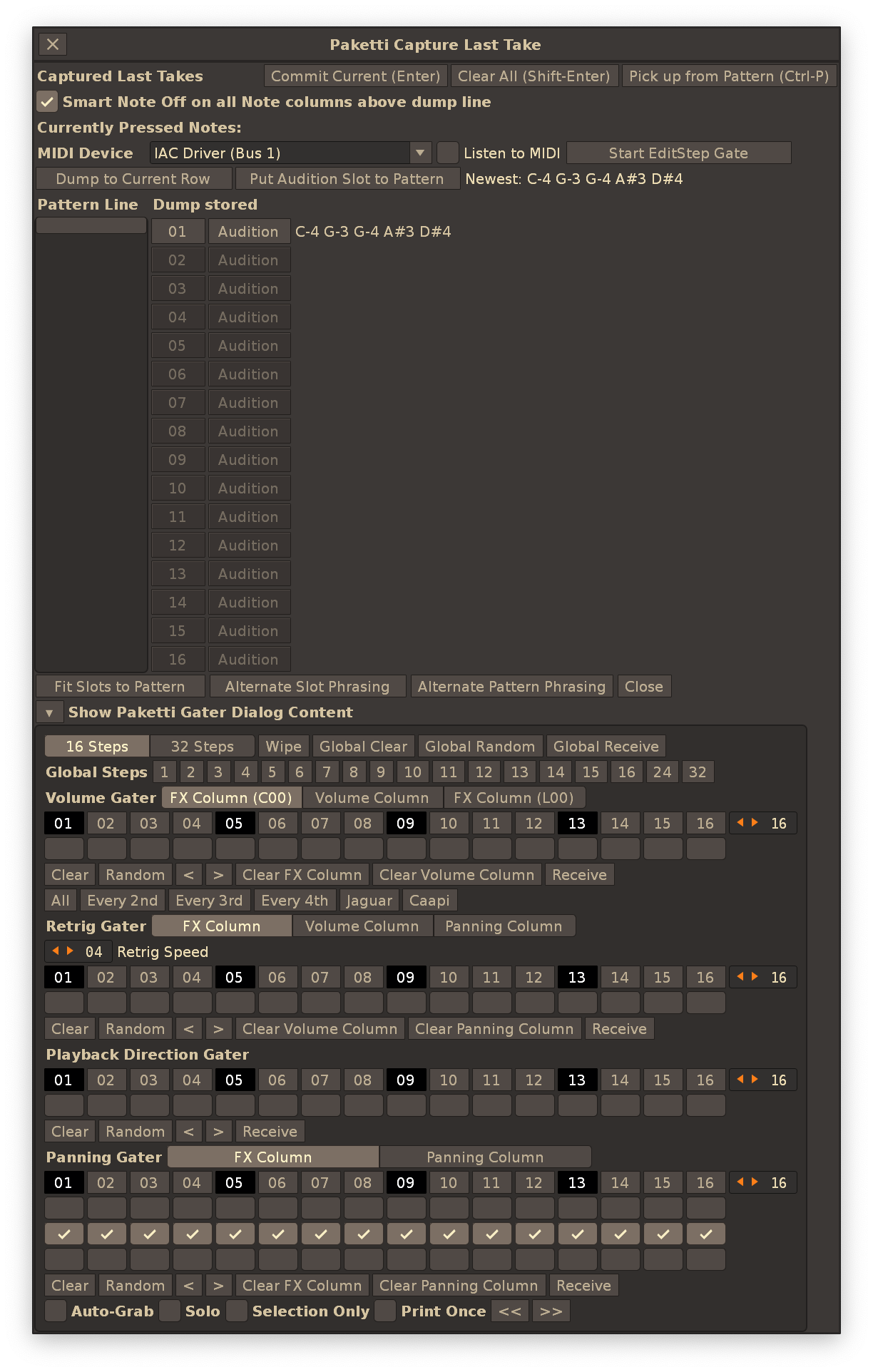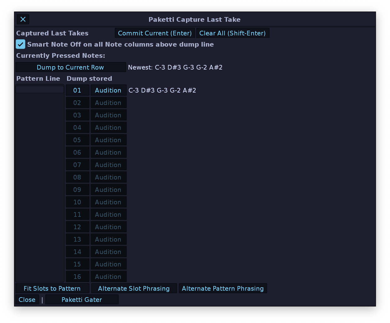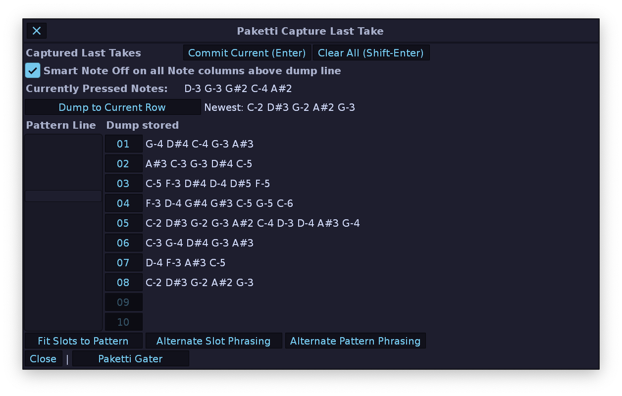 This will let you have the dialog open, play notes on the Computer Keyboard, press enter and the played notes are saved as a chord, which you can then output anywhere. The Smart Note Off feature is also there, adding a Smart Note Off to the end of the pattern. And if you have 4 or 8 chords put to Dump Slots, then you can also spread them across the pattern. I can think of no method that would be as fast - and as dynamic. If you have a 512 row pattern, and have 8 chords, you can slam them in, automatically, without thinking, every 64 rows. 64 row and 4 chords? every 16 steps. If you made an error, you can always use backspace to remove the newest note, or shift-backspace to wipe the whole Currently Pressed Notes. You can modify the Slot Phrasing (shifting them by octaves randomly) or do the very same thing for the current Selected Track's Pattern content for Selected Pattern. And you can access the Paketti Gater directly.