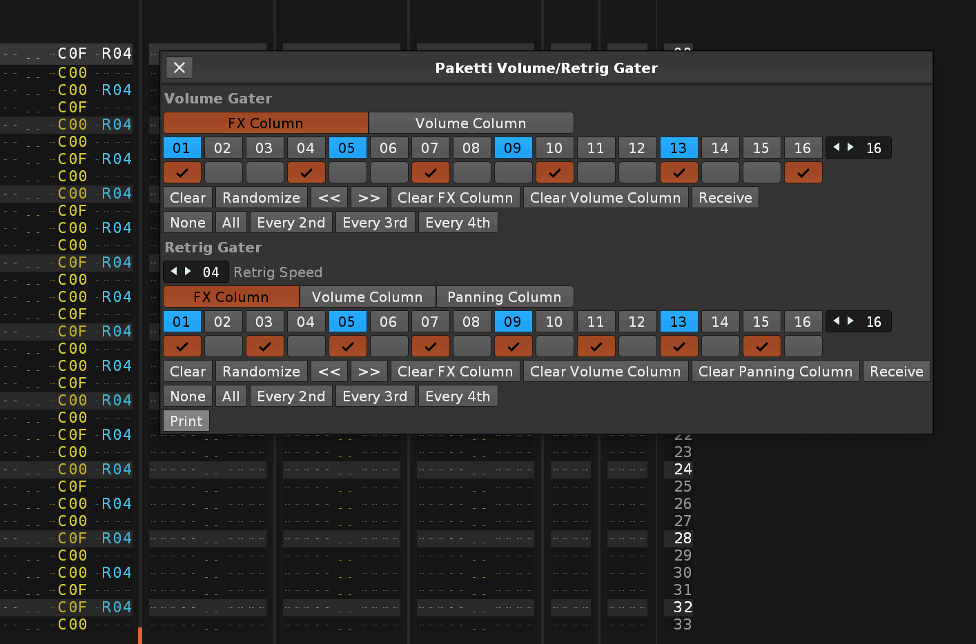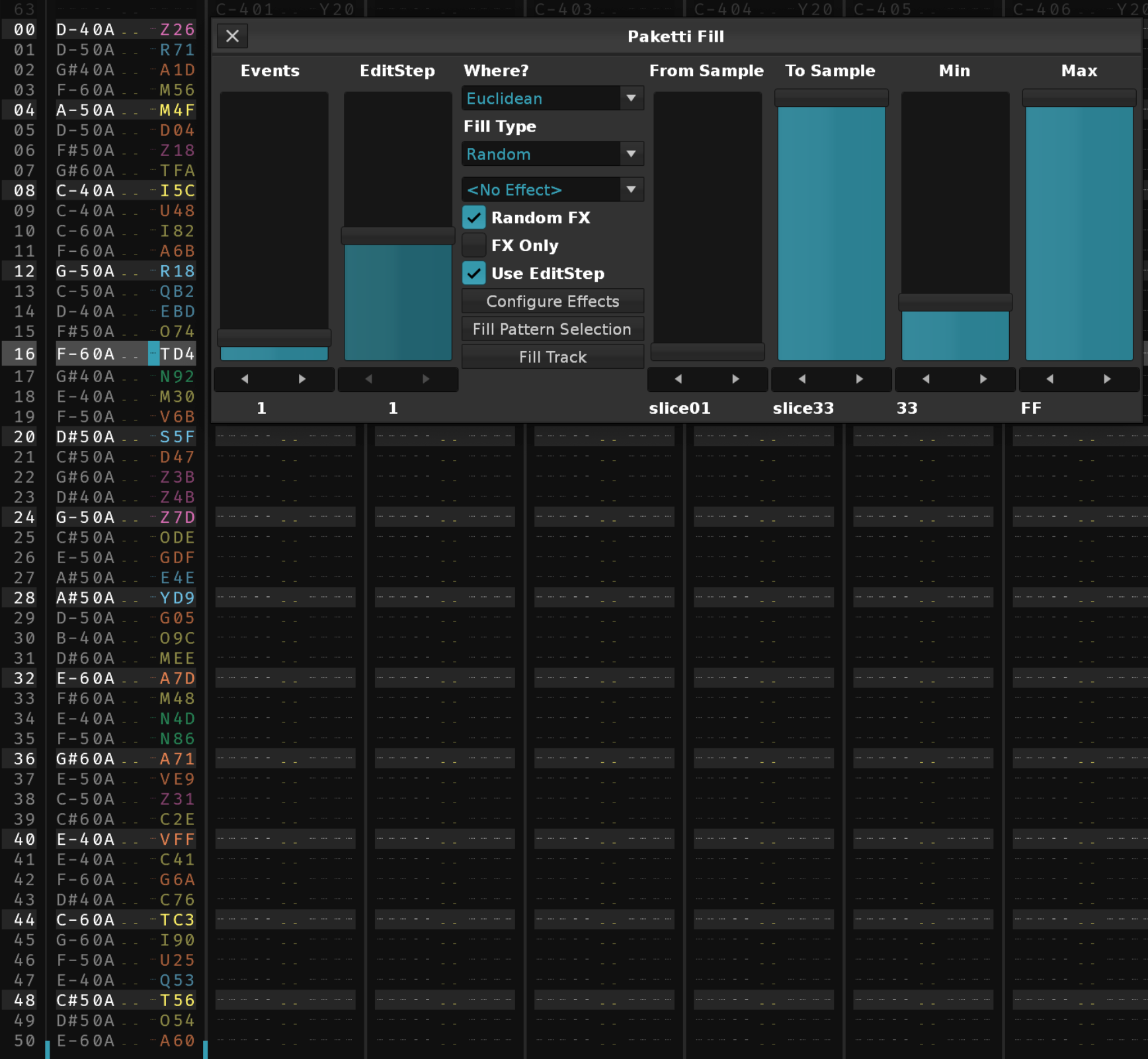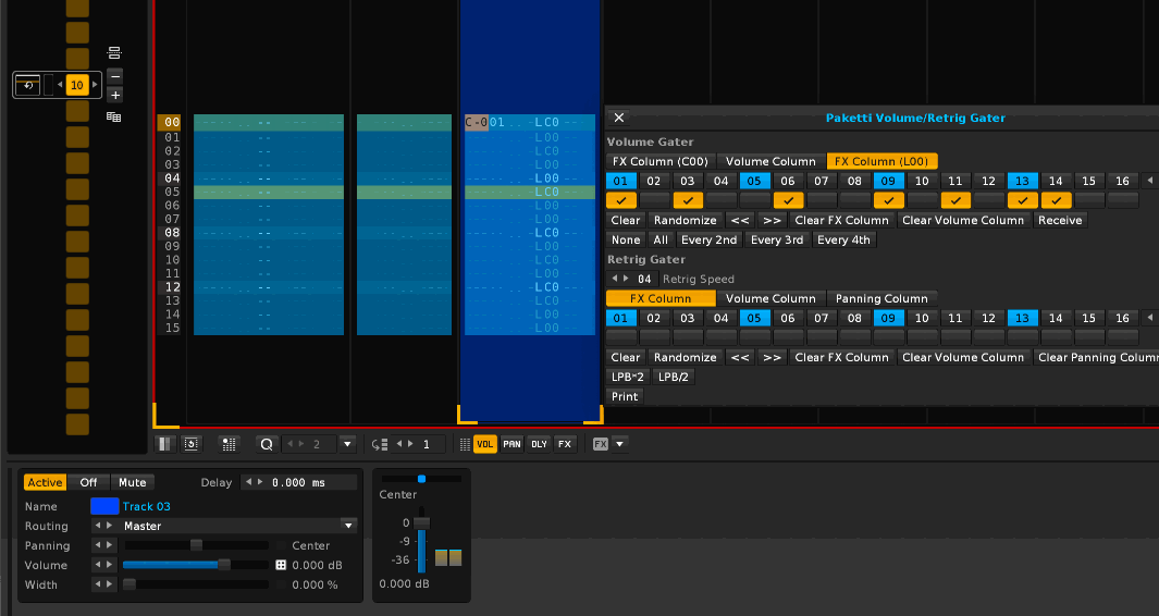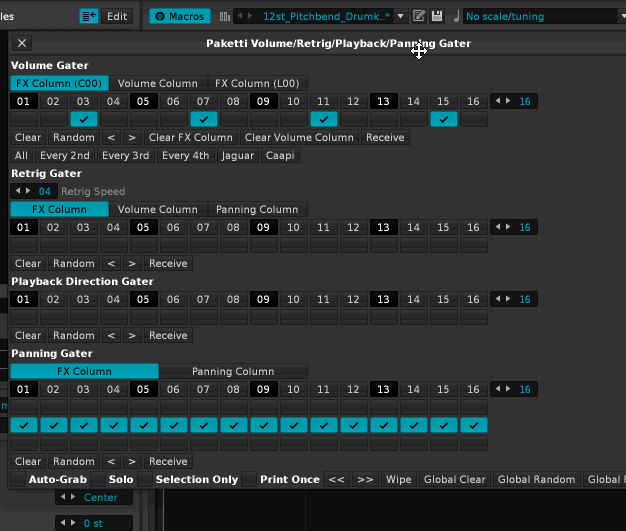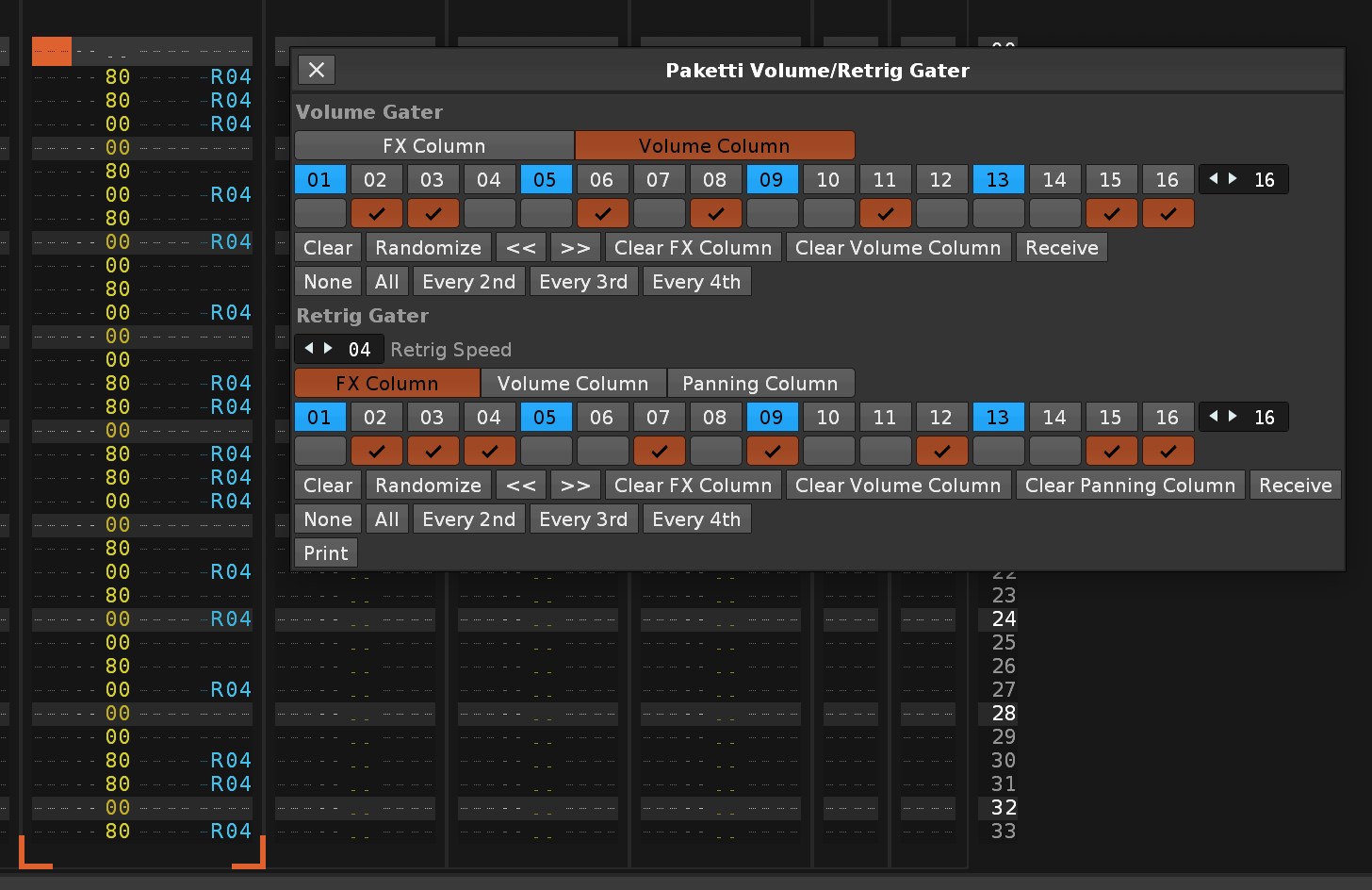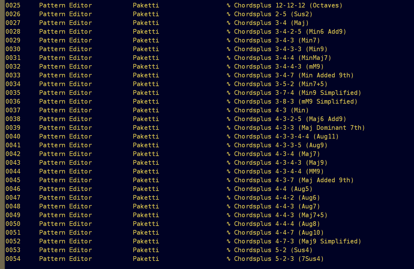 This will let you have the dialog open, play notes on the Computer Keyboard, press enter and the played notes are saved as a chord, which you can then output anywhere. The Smart Note Off feature is also there, adding a Smart Note Off to the end of the pattern. And if you have 4 or 8 chords put to Dump Slots, then you can also spread them across the pattern. I can think of no method that would be as fast - and as dynamic. If you have a 512 row pattern, and have 8 chords, you can slam them in, automatically, without thinking, every 64 rows. 64 row and 4 chords? every 16 steps. If you made an error, you can always use backspace to remove the newest note, or shift-backspace to wipe the whole Currently Pressed Notes. You can modify the Slot Phrasing (shifting them by octaves randomly) or do the very same thing for the current Selected Track's Pattern content for Selected Pattern. And you can access the Paketti Gater directly.