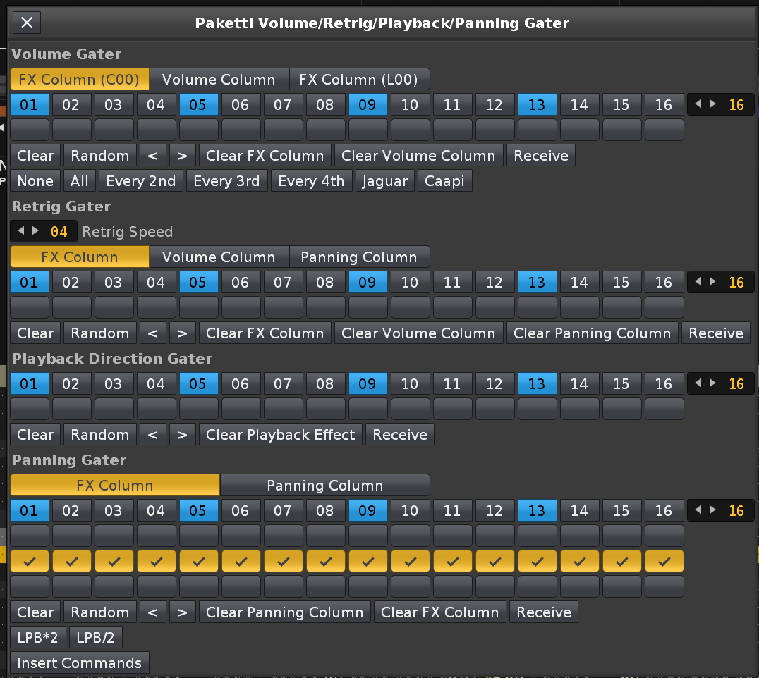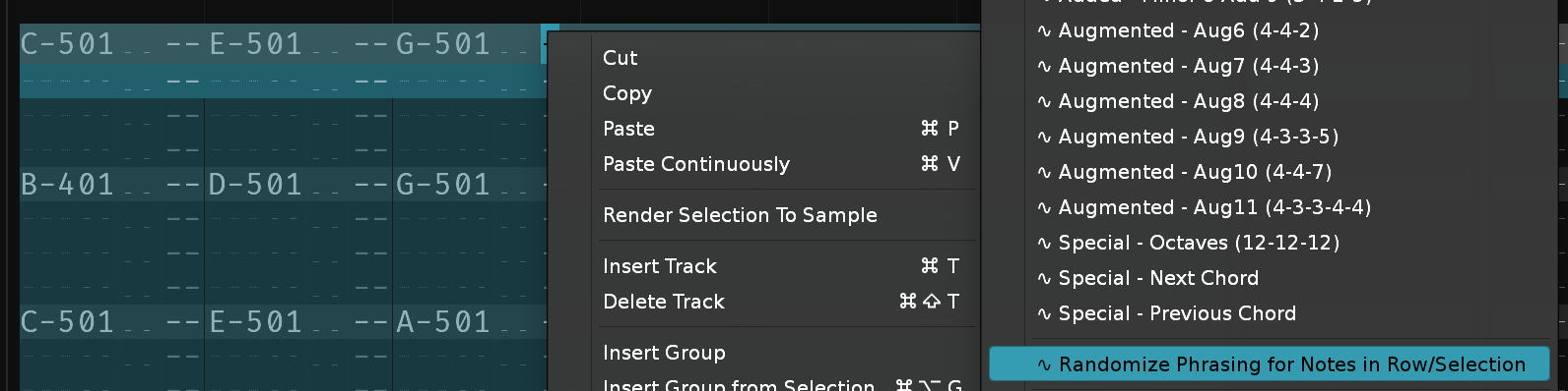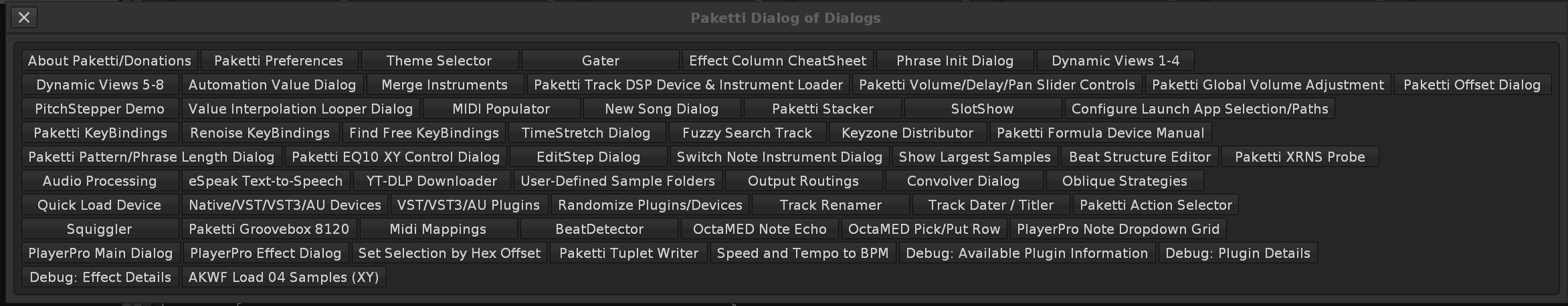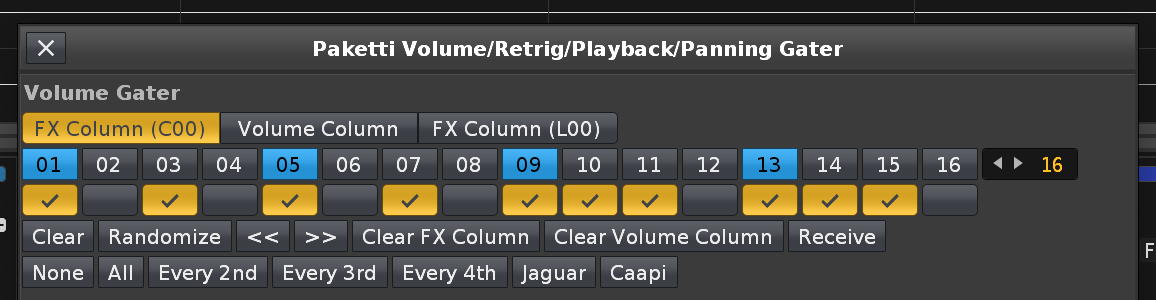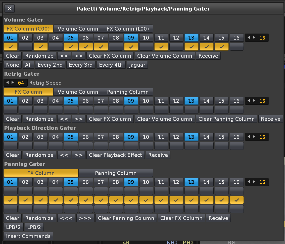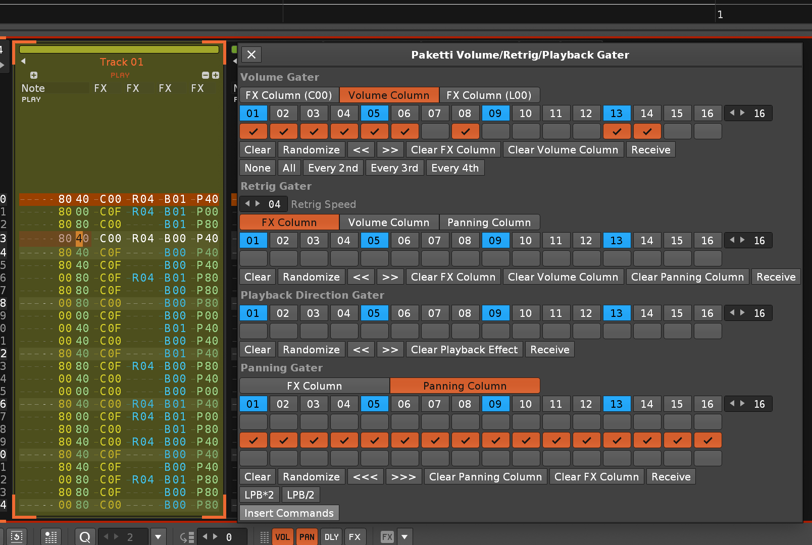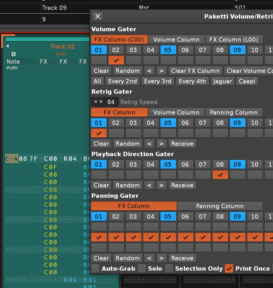 This will let you have the dialog open, play notes on the Computer Keyboard, press enter and the played notes are saved as a chord, which you can then output anywhere. The Smart Note Off feature is also there, adding a Smart Note Off to the end of the pattern. And if you have 4 or 8 chords put to Dump Slots, then you can also spread them across the pattern. I can think of no method that would be as fast - and as dynamic. If you have a 512 row pattern, and have 8 chords, you can slam them in, automatically, without thinking, every 64 rows. 64 row and 4 chords? every 16 steps. If you made an error, you can always use backspace to remove the newest note, or shift-backspace to wipe the whole Currently Pressed Notes. You can modify the Slot Phrasing (shifting them by octaves randomly) or do the very same thing for the current Selected Track's Pattern content for Selected Pattern. And you can access the Paketti Gater directly.