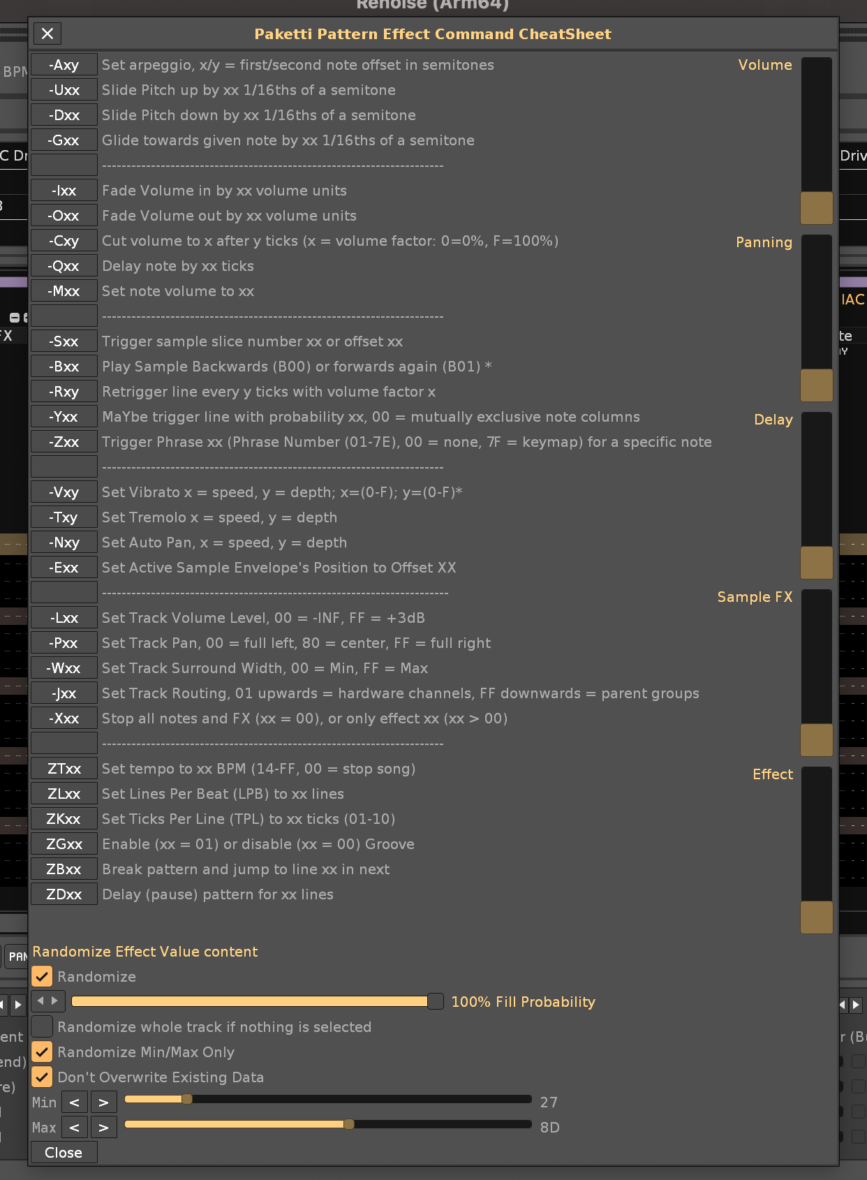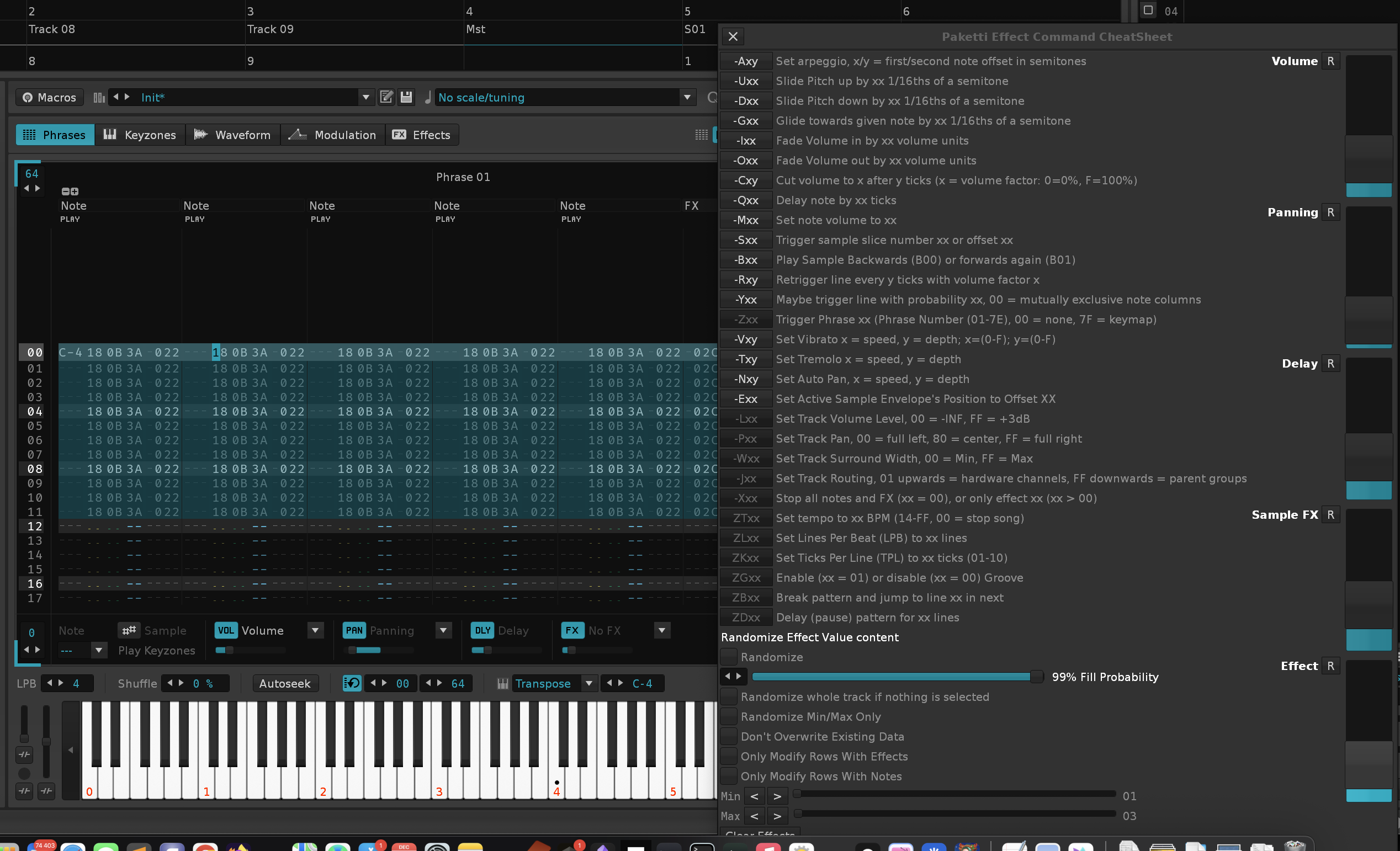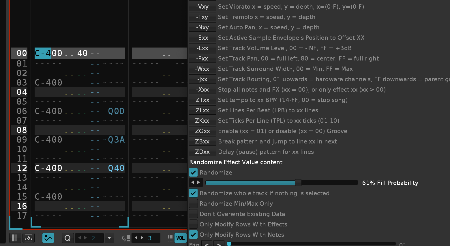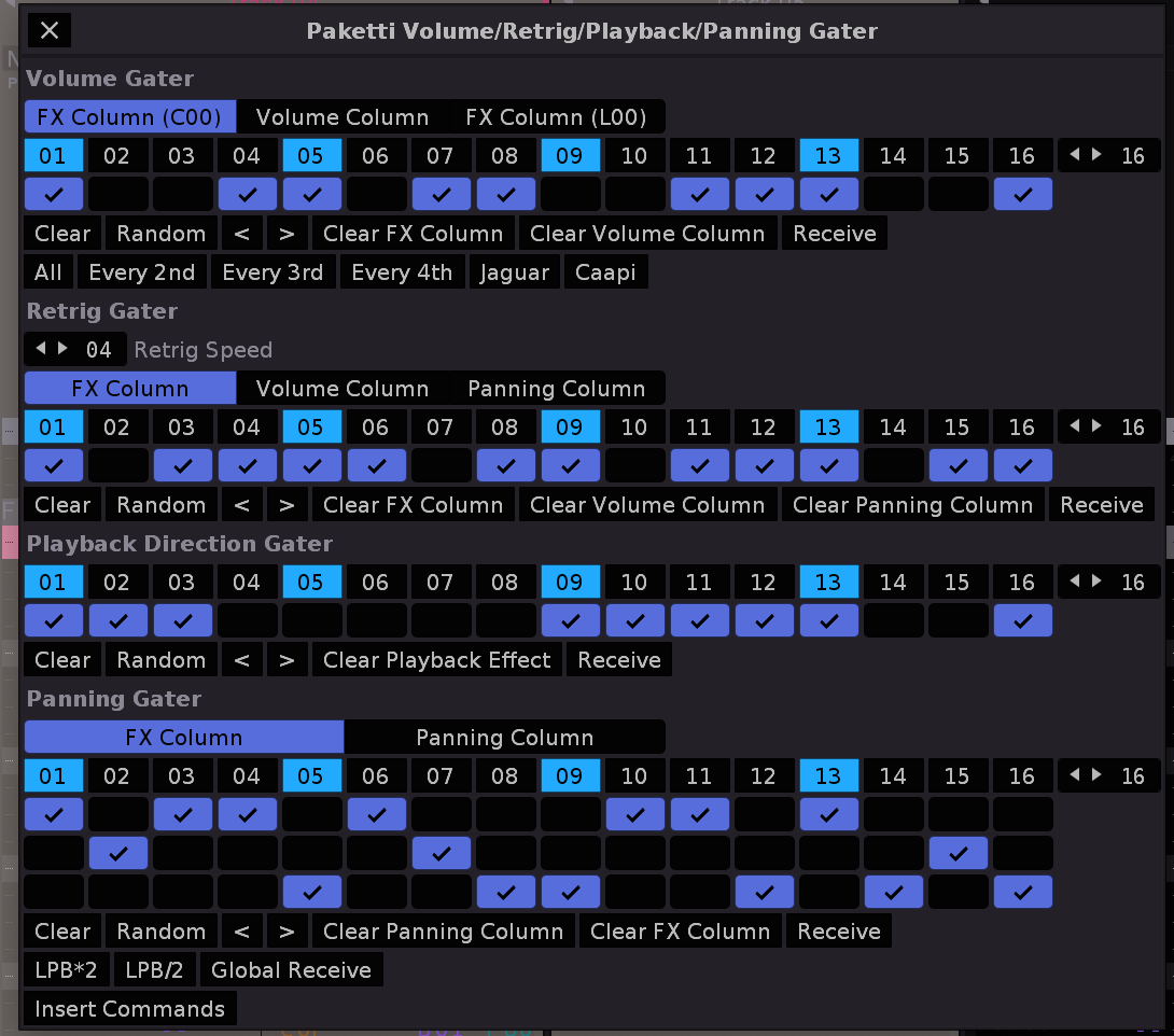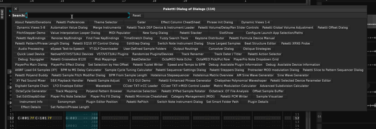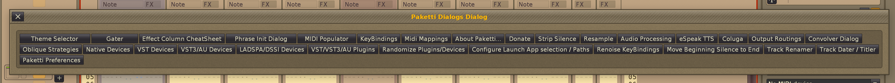 This will let you have the dialog open, play notes on the Computer Keyboard, press enter and the played notes are saved as a chord, which you can then output anywhere. The Smart Note Off feature is also there, adding a Smart Note Off to the end of the pattern. And if you have 4 or 8 chords put to Dump Slots, then you can also spread them across the pattern. I can think of no method that would be as fast - and as dynamic. If you have a 512 row pattern, and have 8 chords, you can slam them in, automatically, without thinking, every 64 rows. 64 row and 4 chords? every 16 steps. If you made an error, you can always use backspace to remove the newest note, or shift-backspace to wipe the whole Currently Pressed Notes. You can modify the Slot Phrasing (shifting them by octaves randomly) or do the very same thing for the current Selected Track's Pattern content for Selected Pattern. And you can access the Paketti Gater directly.