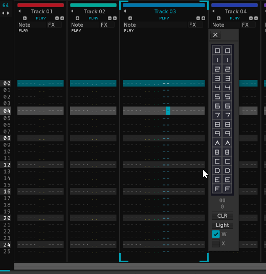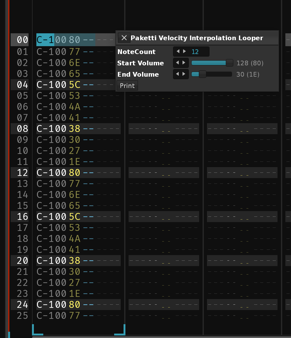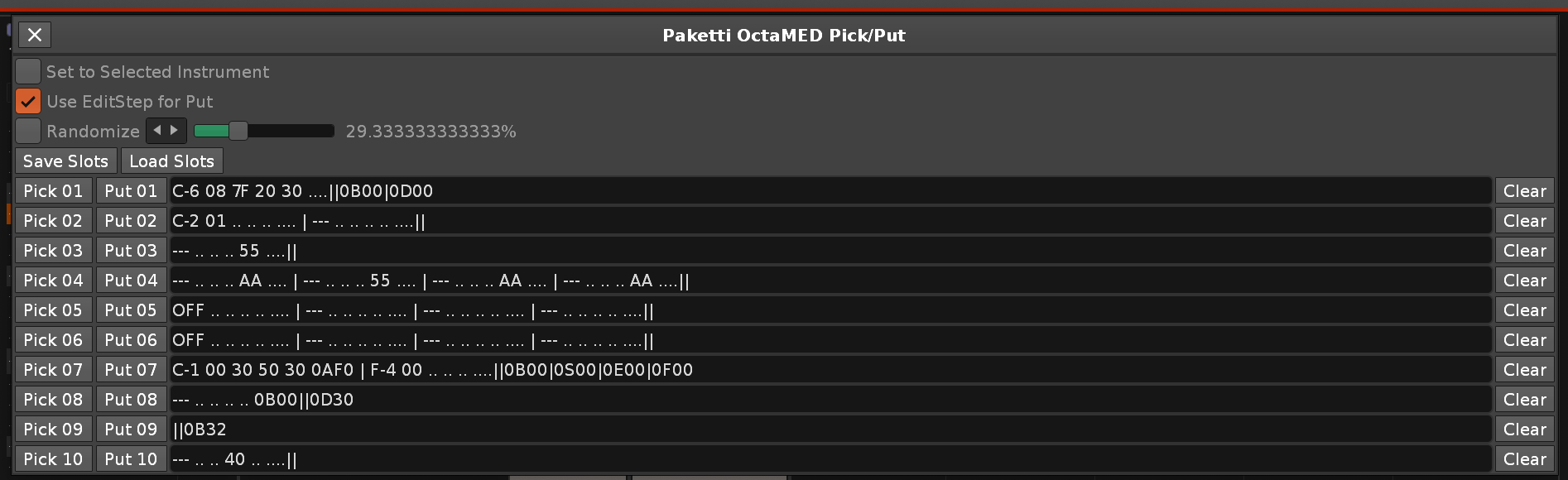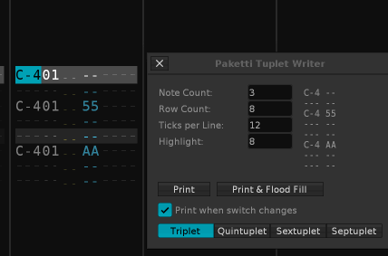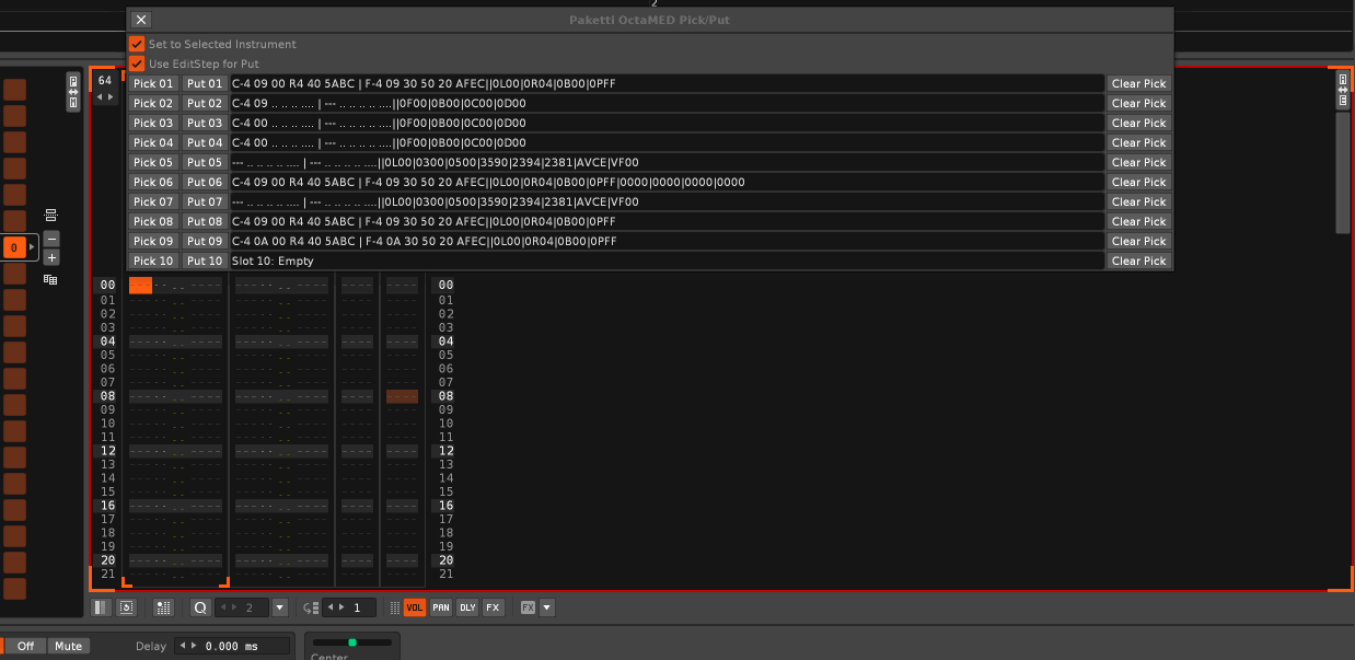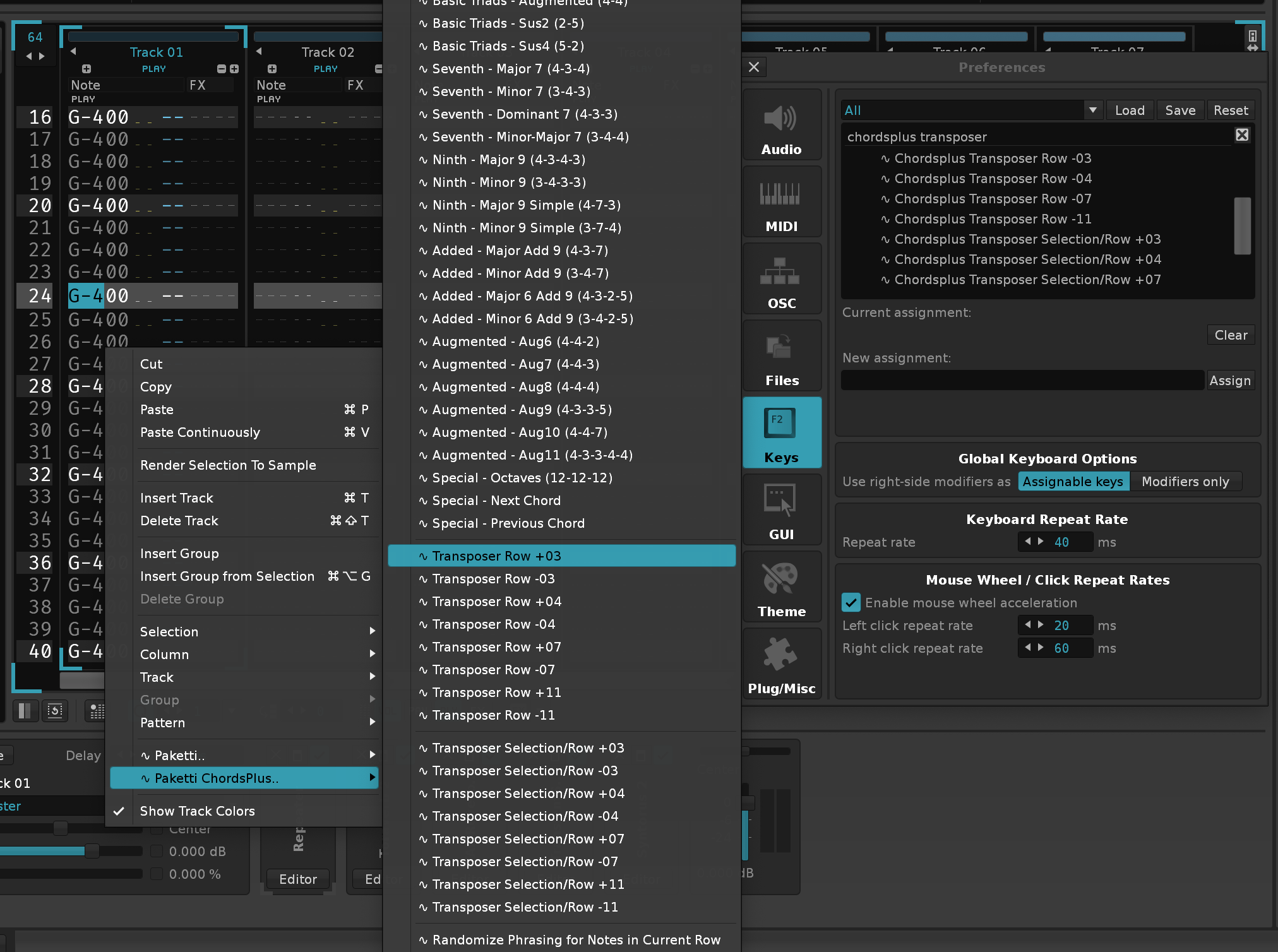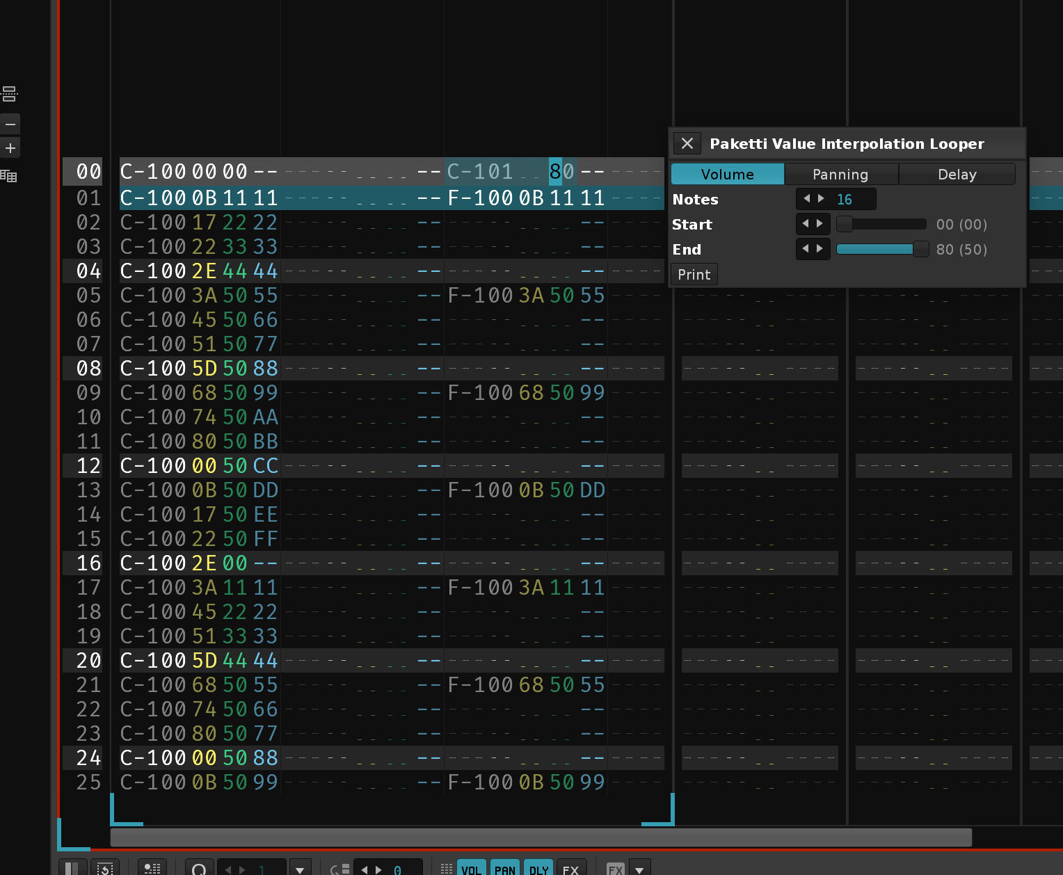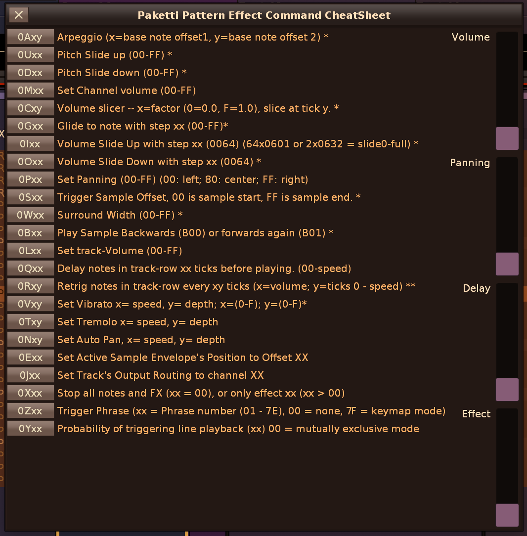 This will let you have the dialog open, play notes on the Computer Keyboard, press enter and the played notes are saved as a chord, which you can then output anywhere. The Smart Note Off feature is also there, adding a Smart Note Off to the end of the pattern. And if you have 4 or 8 chords put to Dump Slots, then you can also spread them across the pattern. I can think of no method that would be as fast - and as dynamic. If you have a 512 row pattern, and have 8 chords, you can slam them in, automatically, without thinking, every 64 rows. 64 row and 4 chords? every 16 steps. If you made an error, you can always use backspace to remove the newest note, or shift-backspace to wipe the whole Currently Pressed Notes. You can modify the Slot Phrasing (shifting them by octaves randomly) or do the very same thing for the current Selected Track's Pattern content for Selected Pattern. And you can access the Paketti Gater directly.