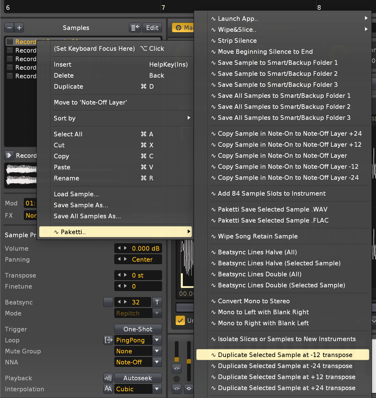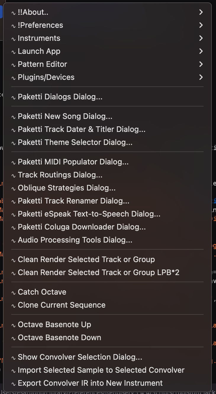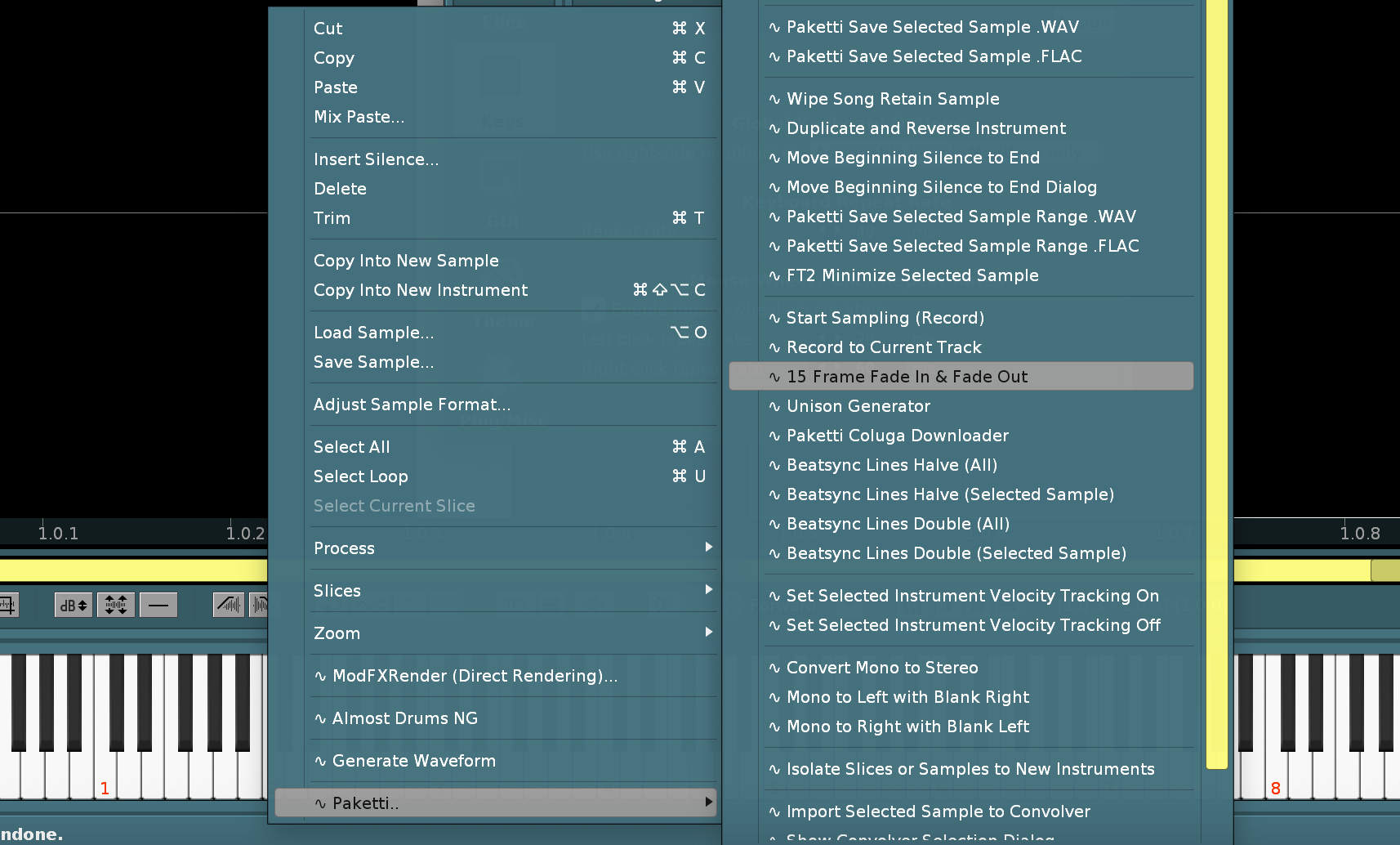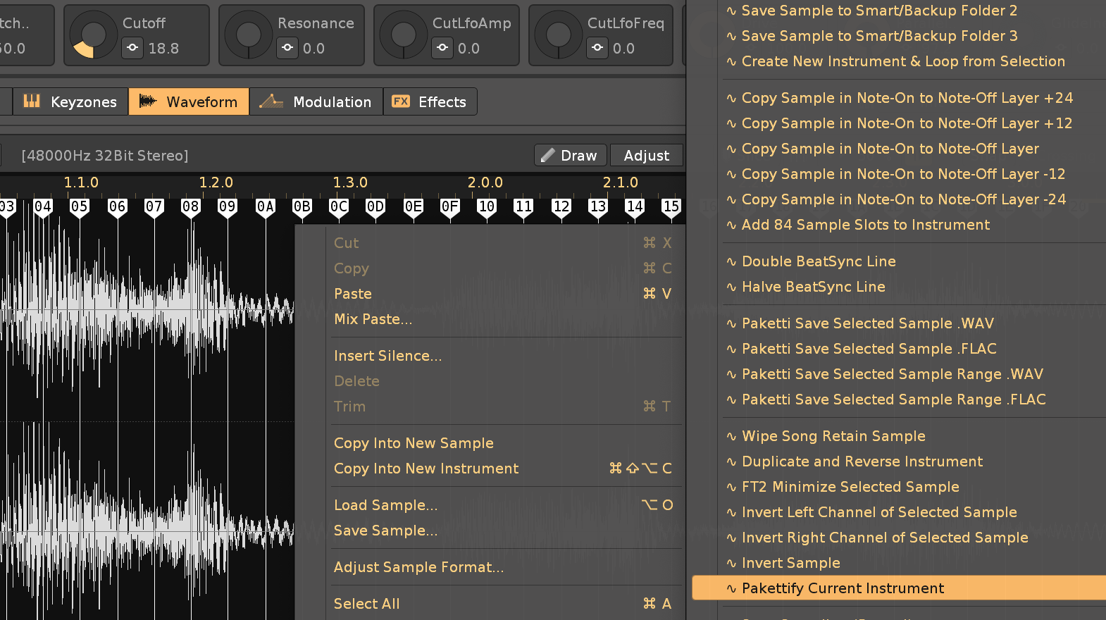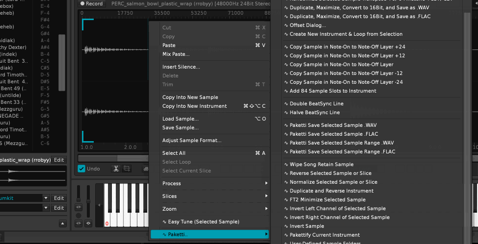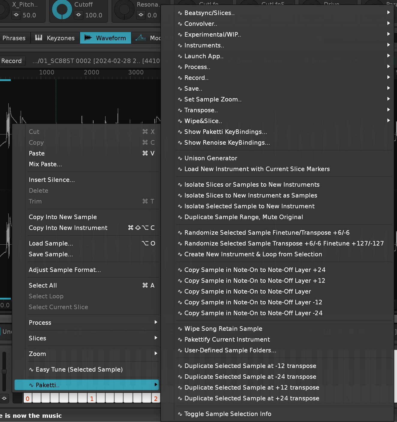 Paketti:Microtonal Tunings:Apply 10-TET Decagono LangePaketti:Microtonal Tunings:Apply Phi 7/10 Hybrid LangePaketti:Microtonal Tunings:Apply Lange Phi Music SystemPaketti:Microtonal Tunings:Phi Harmonic Strings WavetableAdded Trim Selected Sample to Selection and Normalize β a combined operation that first trims the selected sample to the current selection range in the Sample Editor, then immediately normalizes the trimmed result. This is a common two-step workflow now available as a single action.