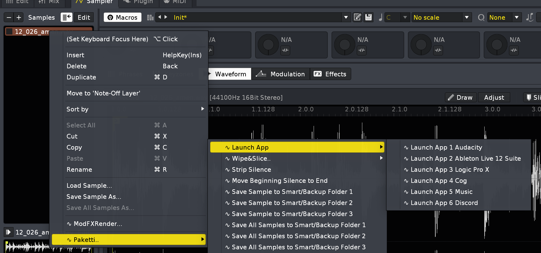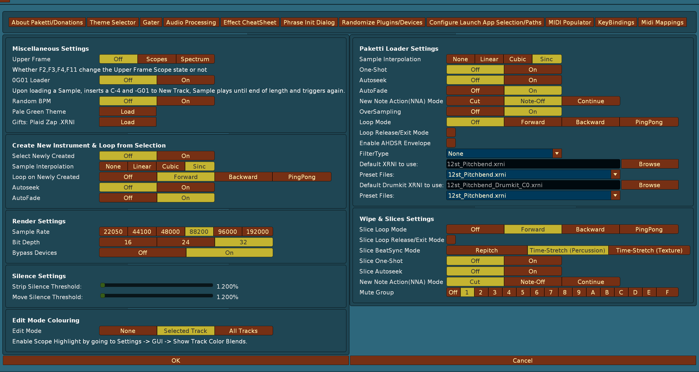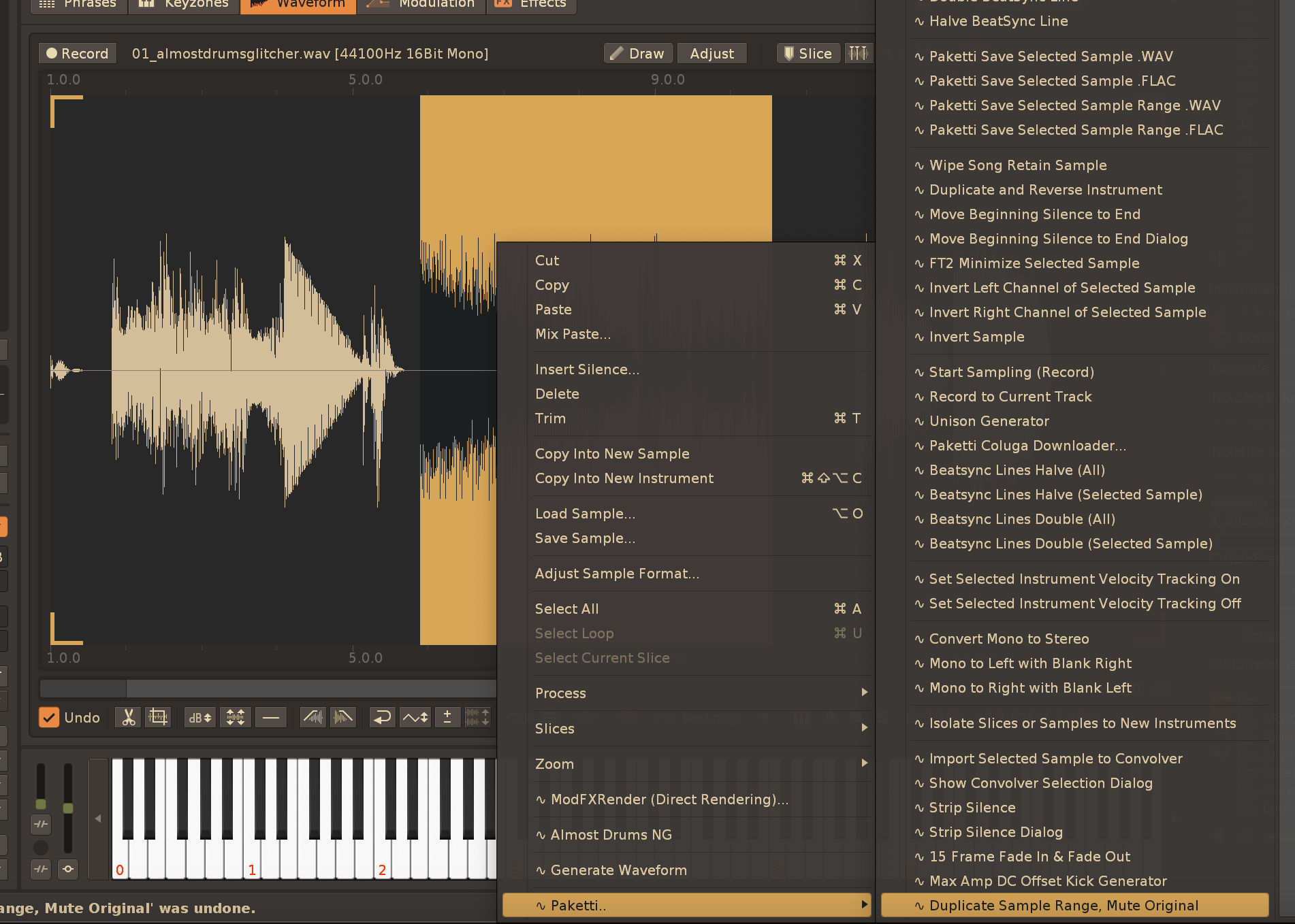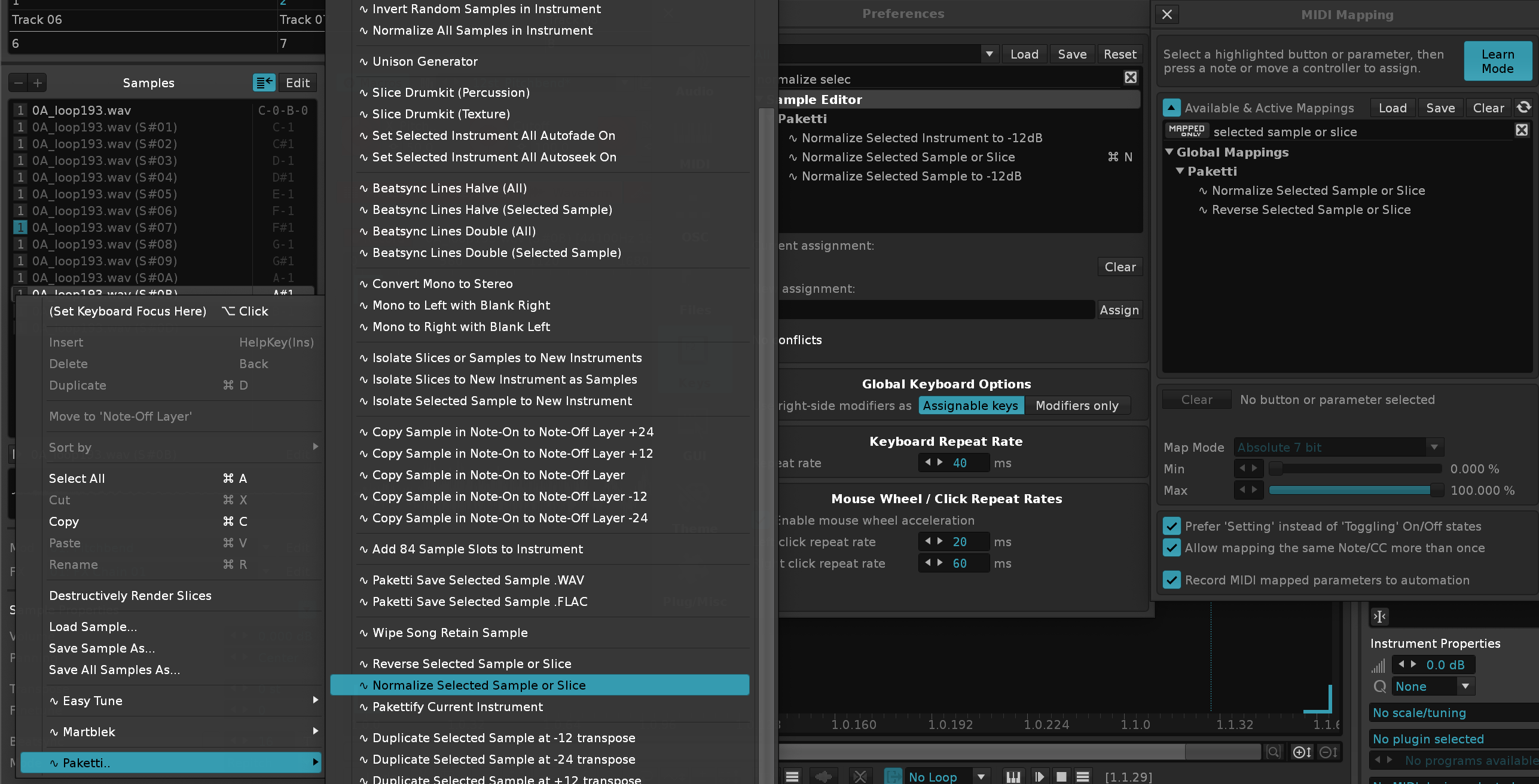 Paketti:Microtonal Tunings:Apply 10-TET Decagono LangePaketti:Microtonal Tunings:Apply Phi 7/10 Hybrid LangePaketti:Microtonal Tunings:Apply Lange Phi Music SystemPaketti:Microtonal Tunings:Phi Harmonic Strings WavetableAdded Trim Selected Sample to Selection and Normalize β a combined operation that first trims the selected sample to the current selection range in the Sample Editor, then immediately normalizes the trimmed result. This is a common two-step workflow now available as a single action.