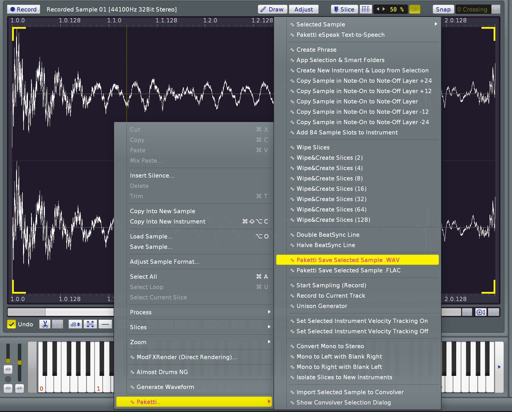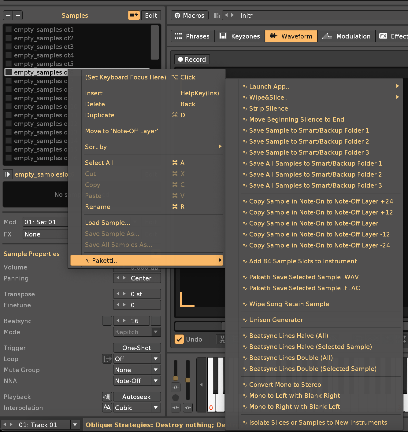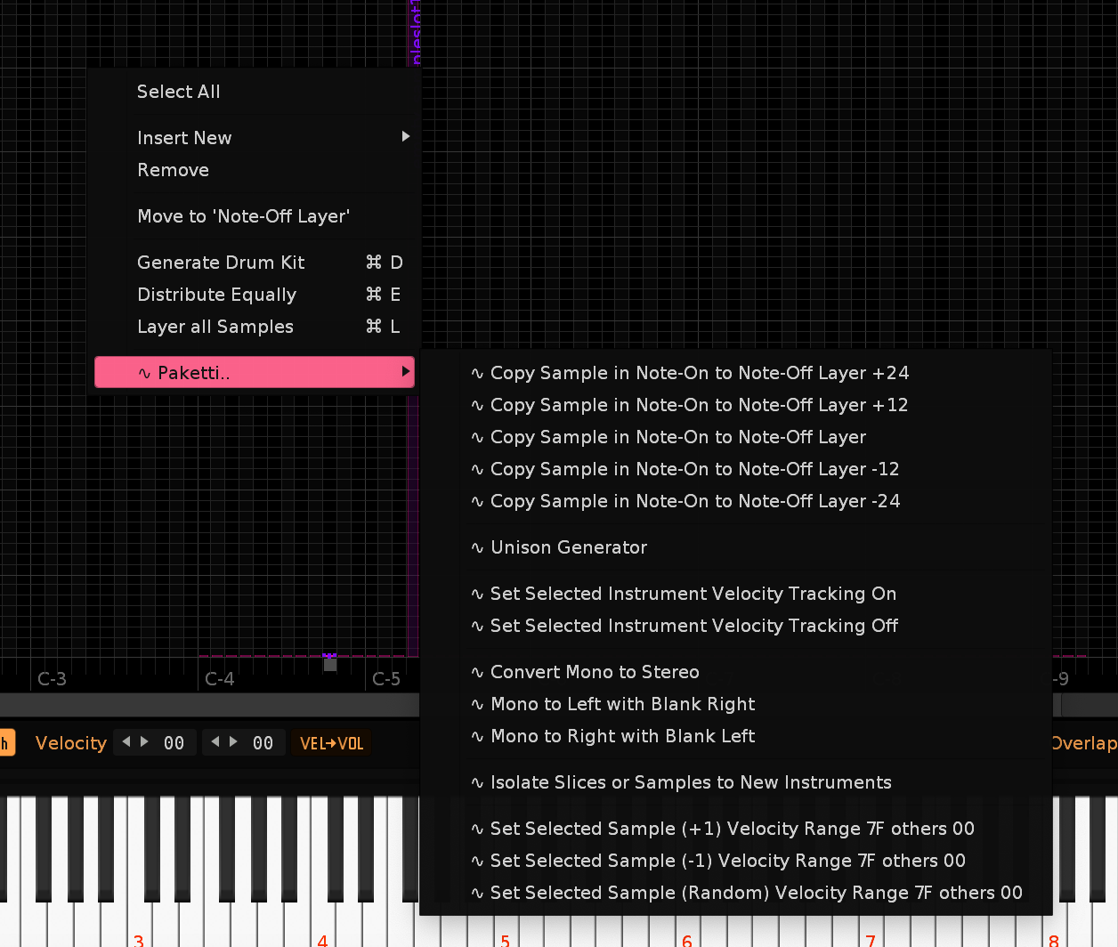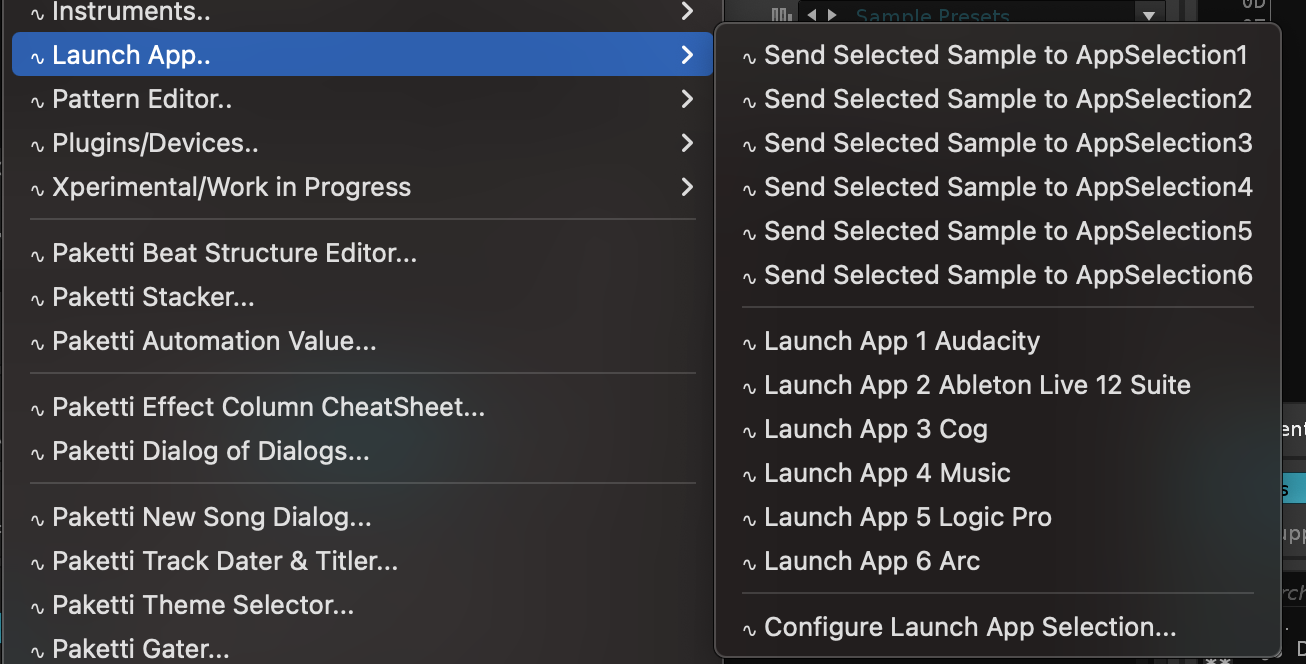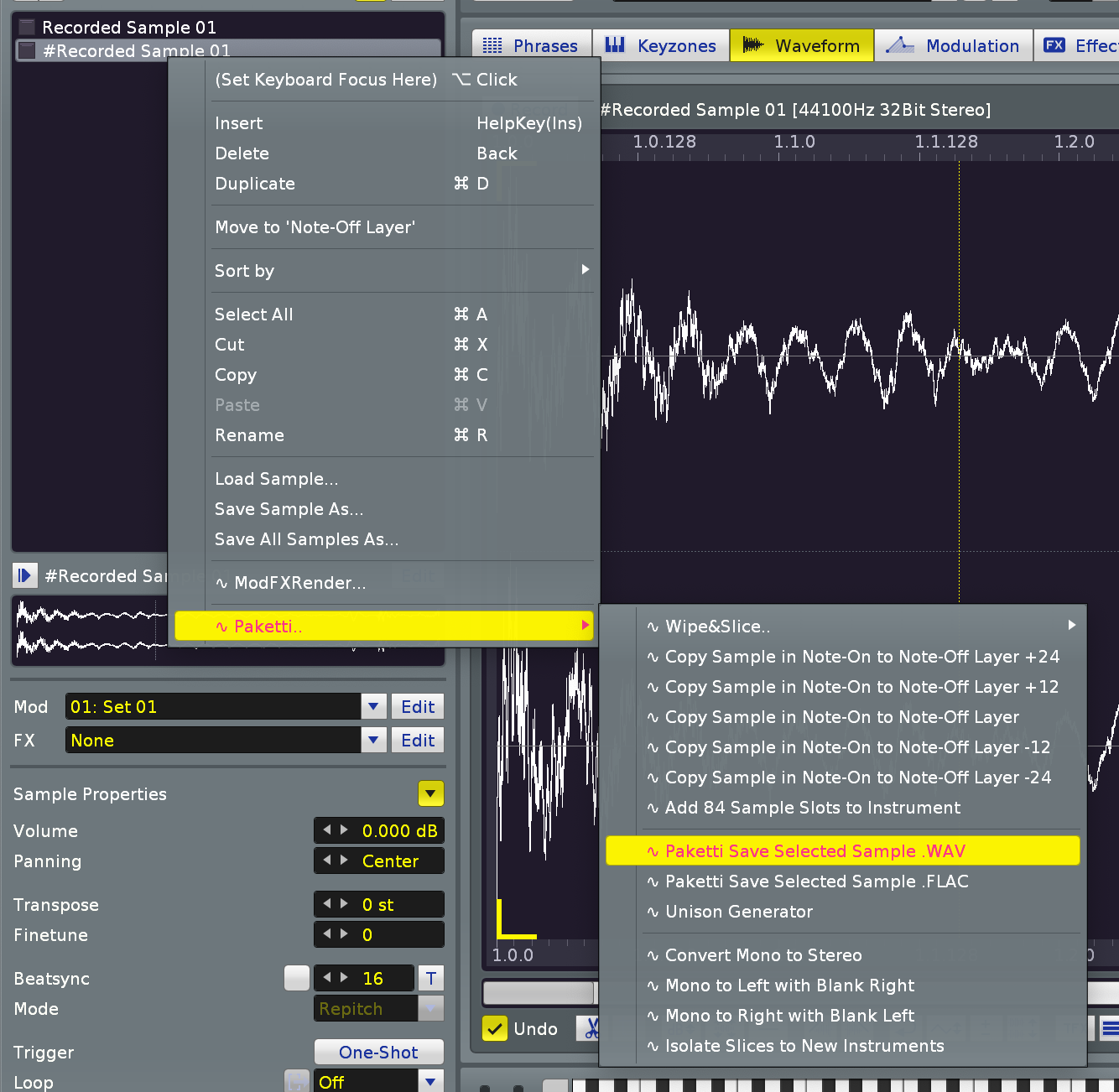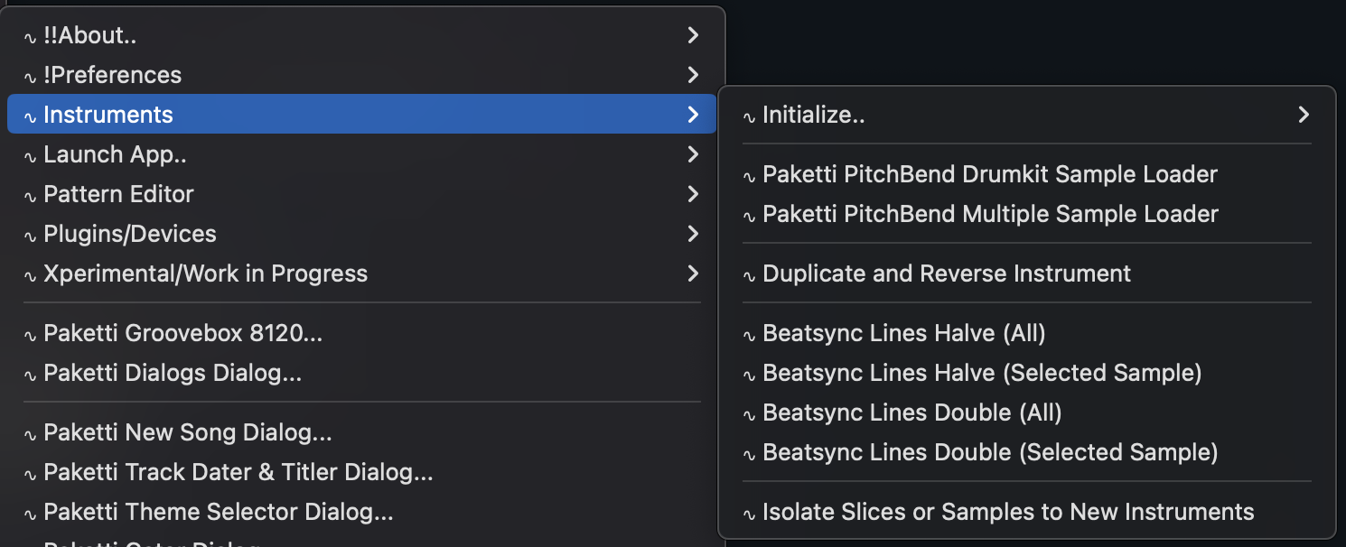Paketti:Microtonal Tunings:Apply 10-TET Decagono LangePaketti:Microtonal Tunings:Apply Phi 7/10 Hybrid LangePaketti:Microtonal Tunings:Apply Lange Phi Music SystemPaketti:Microtonal Tunings:Phi Harmonic Strings WavetableAdded Trim Selected Sample to Selection and Normalize β a combined operation that first trims the selected sample to the current selection range in the Sample Editor, then immediately normalizes the trimmed result. This is a common two-step workflow now available as a single action.