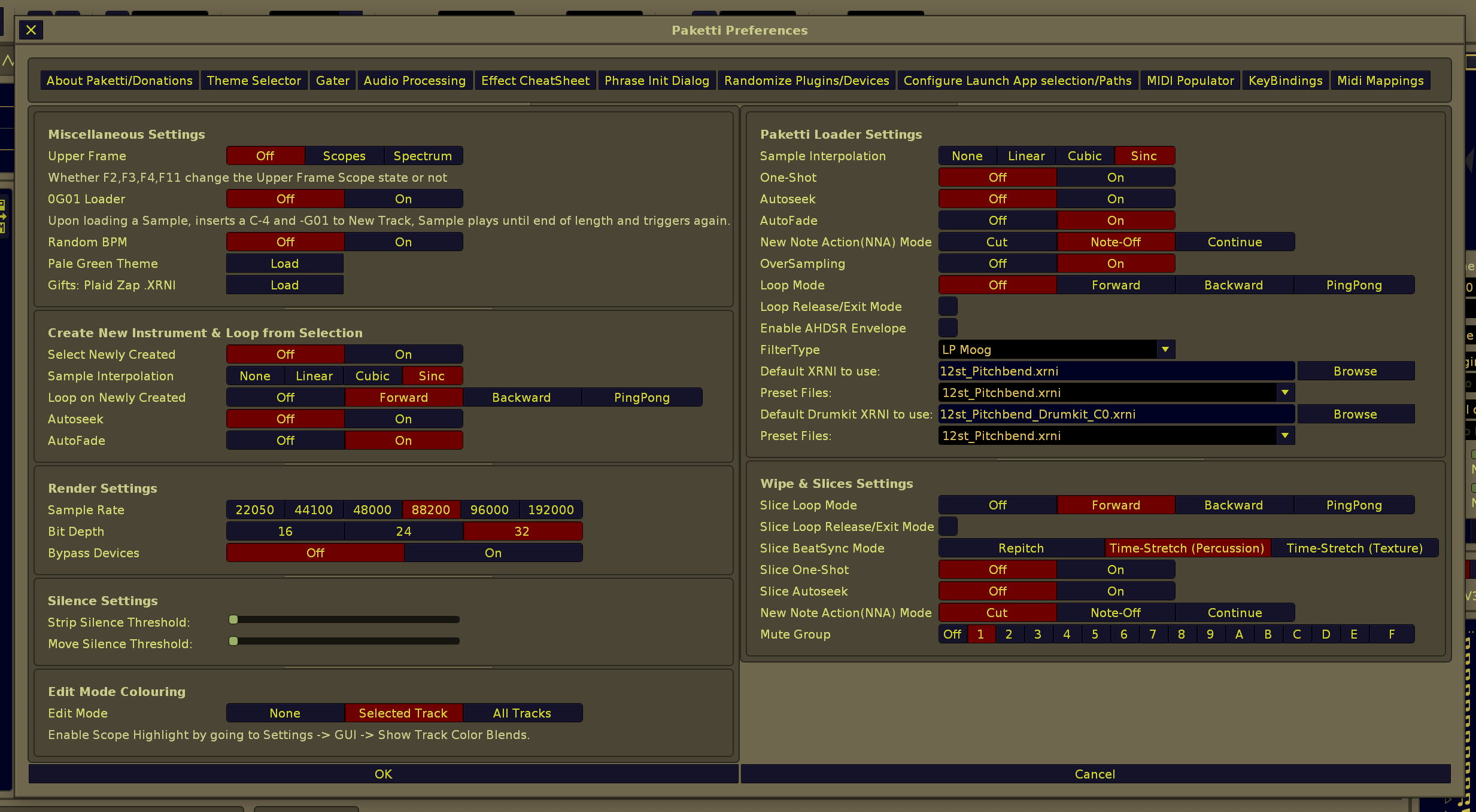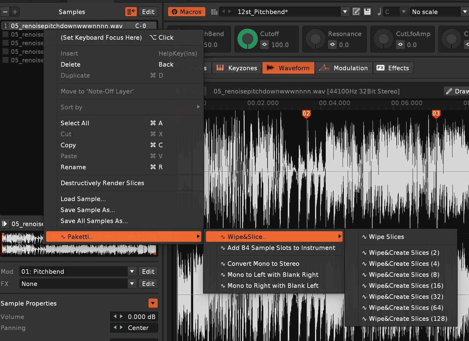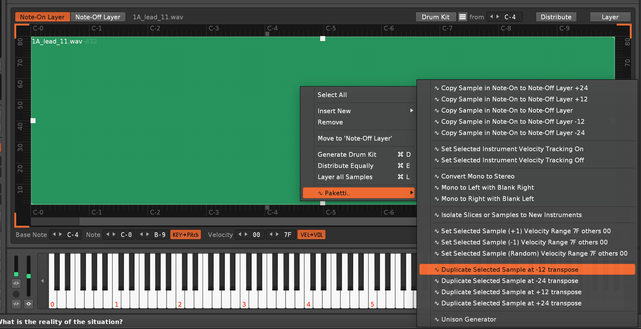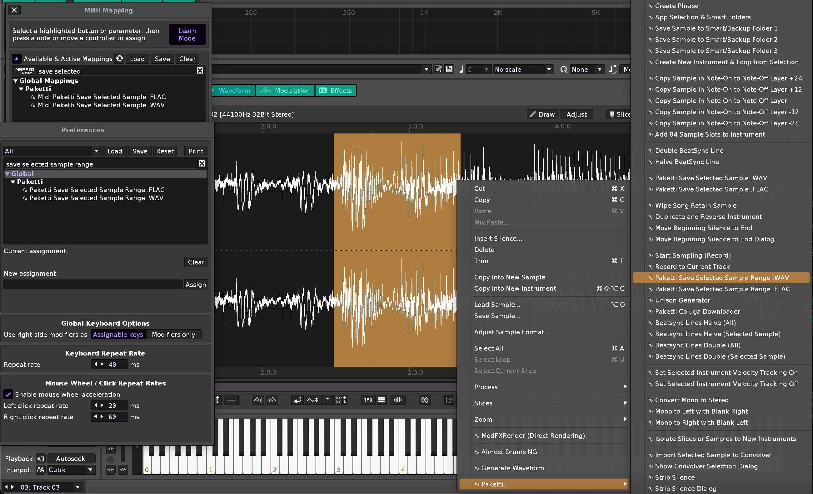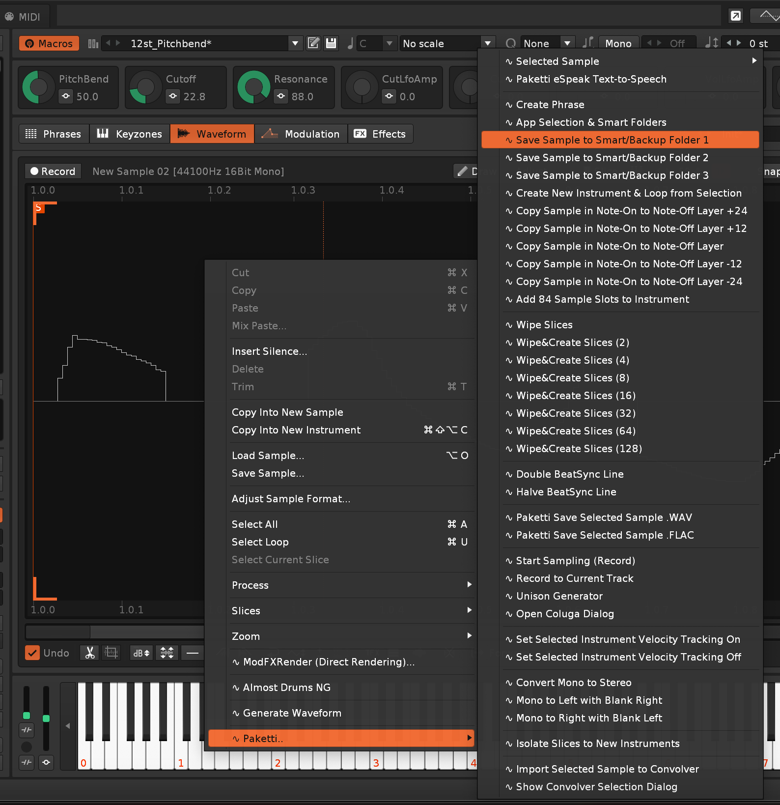 Paketti:Microtonal Tunings:Apply 10-TET Decagono LangePaketti:Microtonal Tunings:Apply Phi 7/10 Hybrid LangePaketti:Microtonal Tunings:Apply Lange Phi Music SystemPaketti:Microtonal Tunings:Phi Harmonic Strings WavetableAdded Trim Selected Sample to Selection and Normalize β a combined operation that first trims the selected sample to the current selection range in the Sample Editor, then immediately normalizes the trimmed result. This is a common two-step workflow now available as a single action.