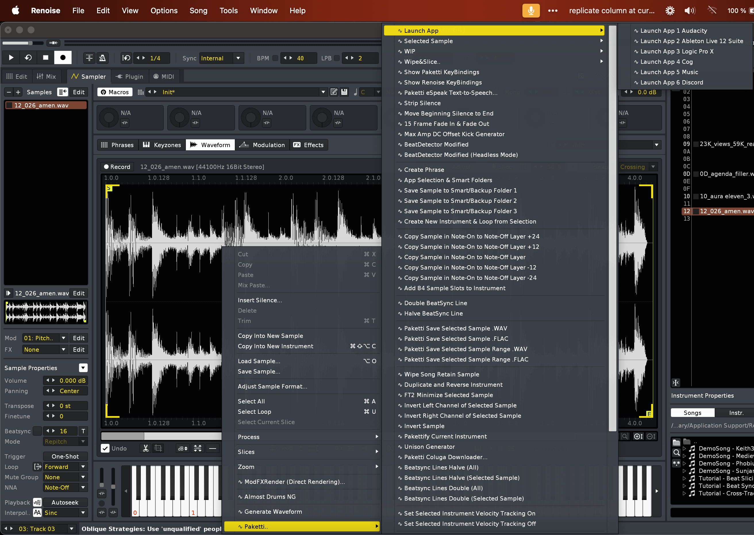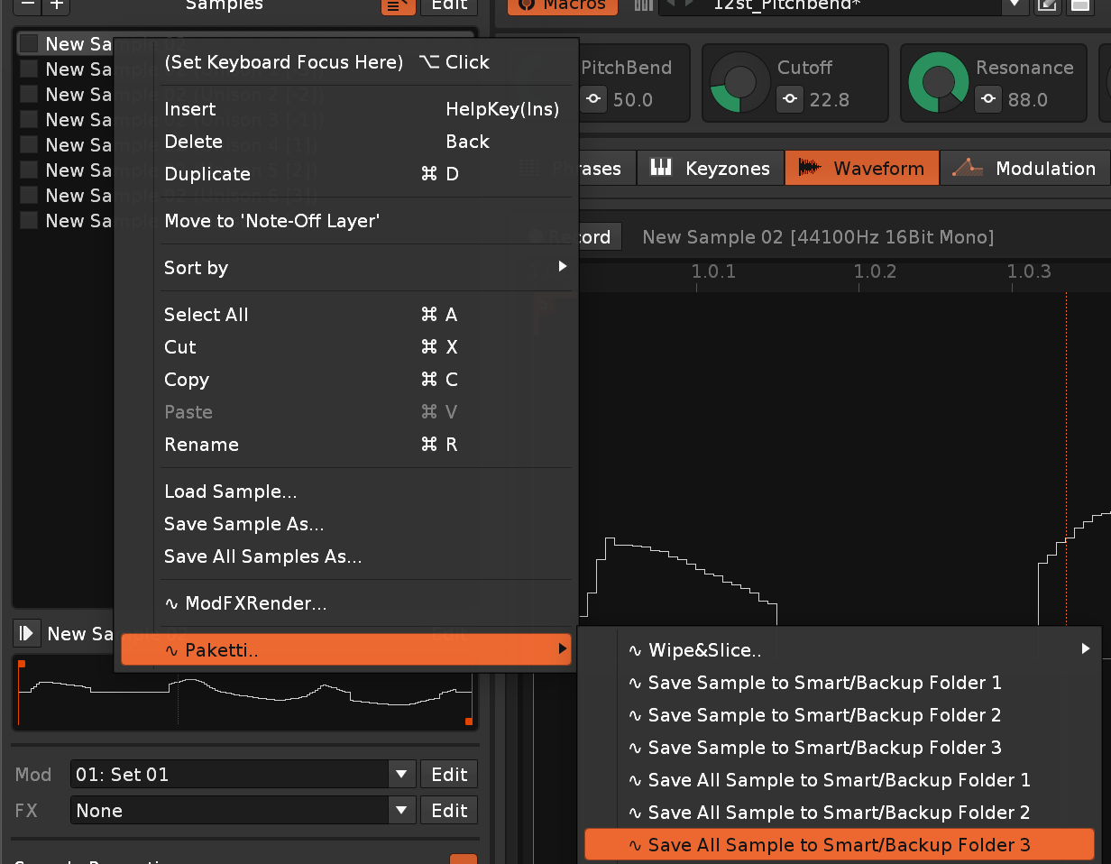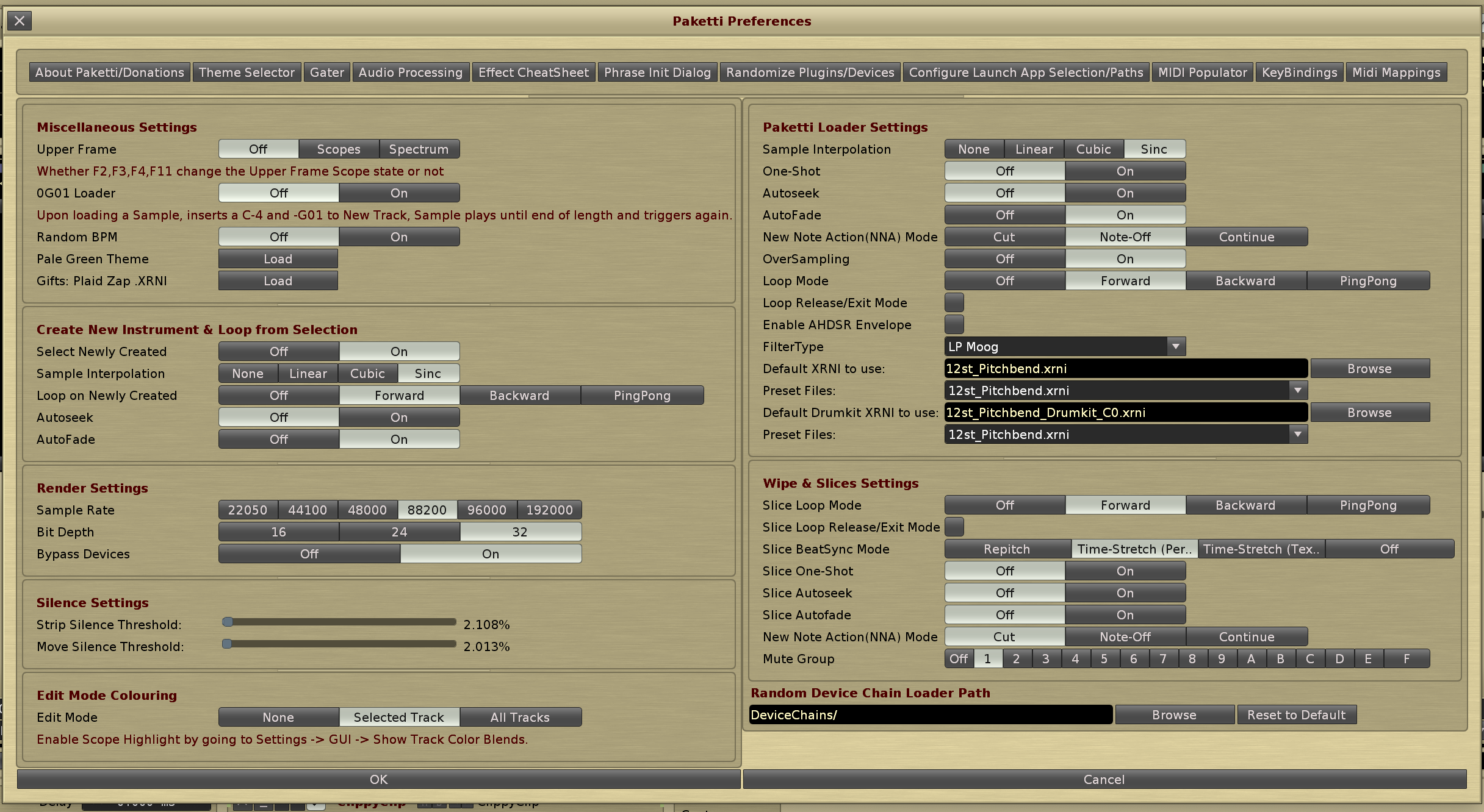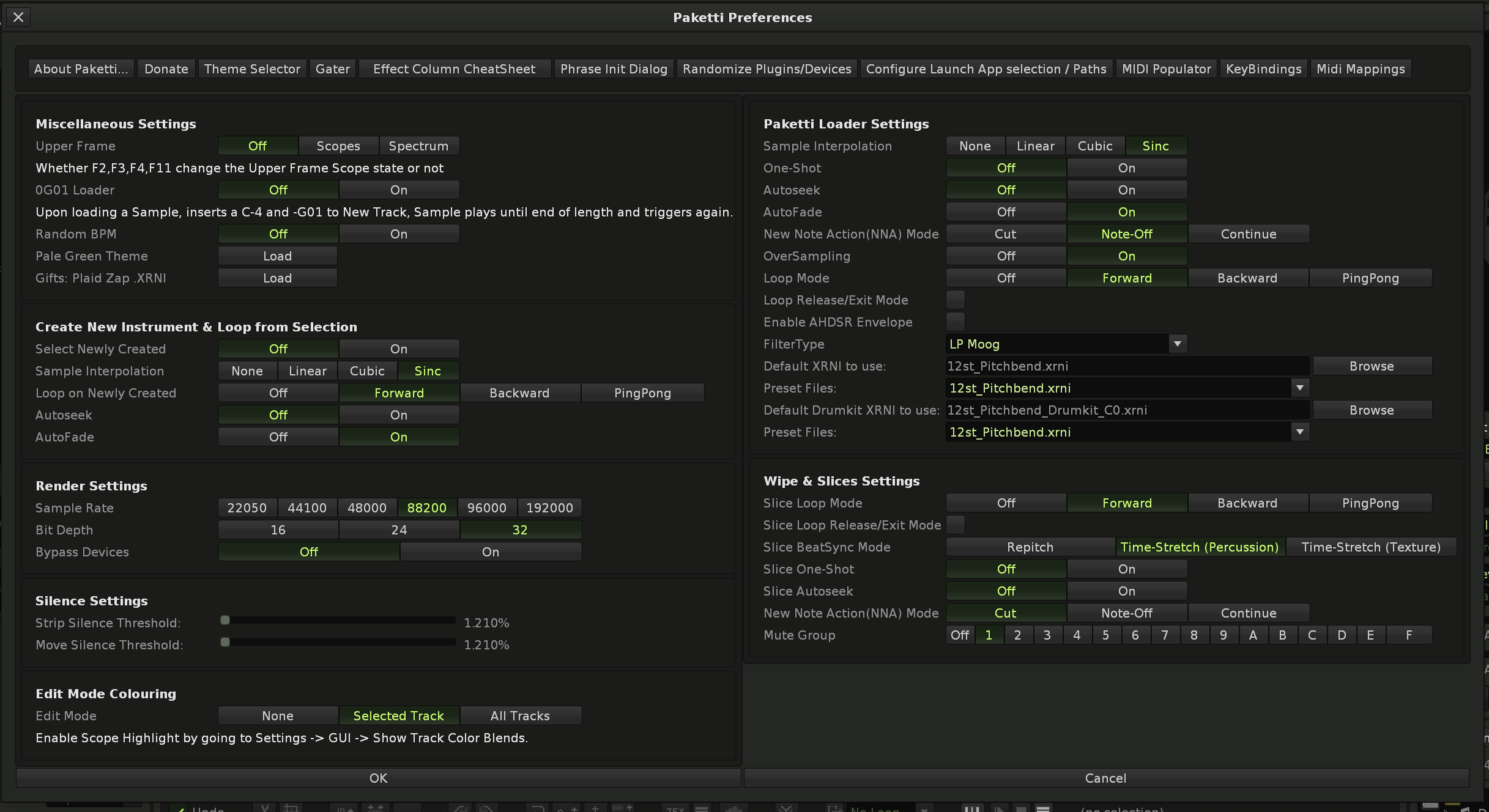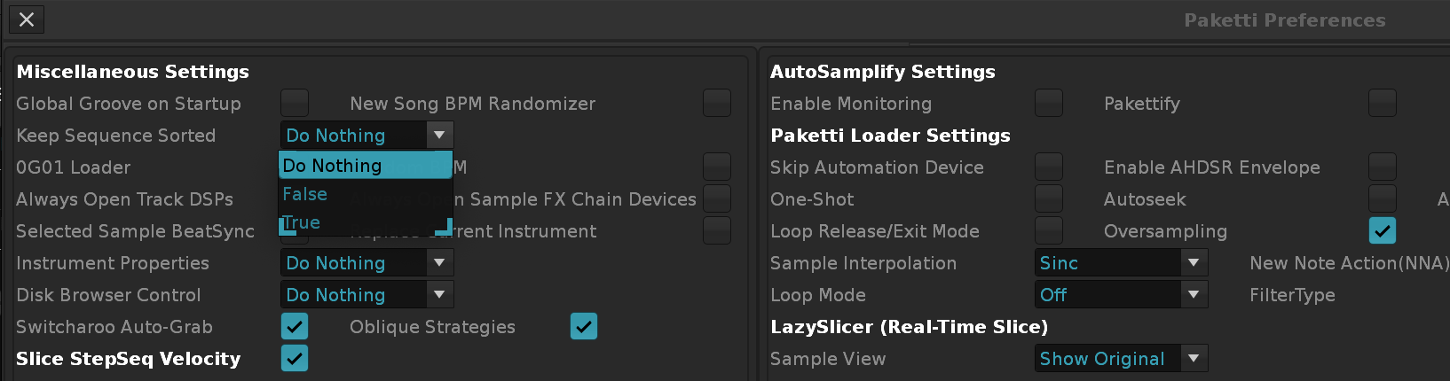 Paketti:Microtonal Tunings:Apply 10-TET Decagono LangePaketti:Microtonal Tunings:Apply Phi 7/10 Hybrid LangePaketti:Microtonal Tunings:Apply Lange Phi Music SystemPaketti:Microtonal Tunings:Phi Harmonic Strings WavetableAdded Trim Selected Sample to Selection and Normalize β a combined operation that first trims the selected sample to the current selection range in the Sample Editor, then immediately normalizes the trimmed result. This is a common two-step workflow now available as a single action.