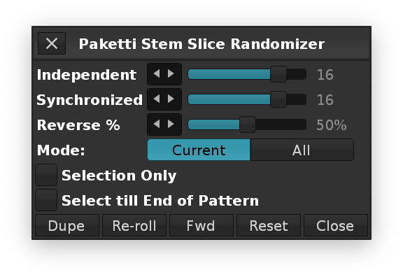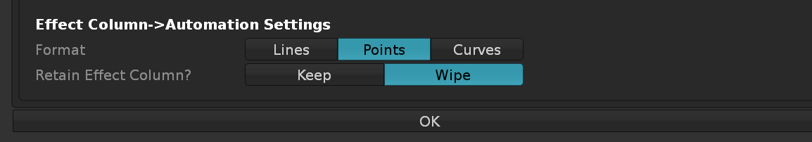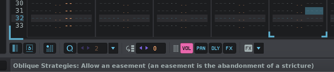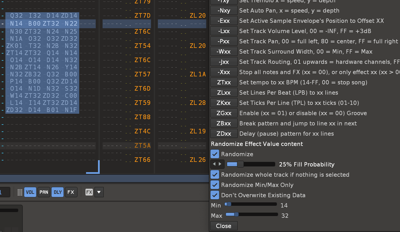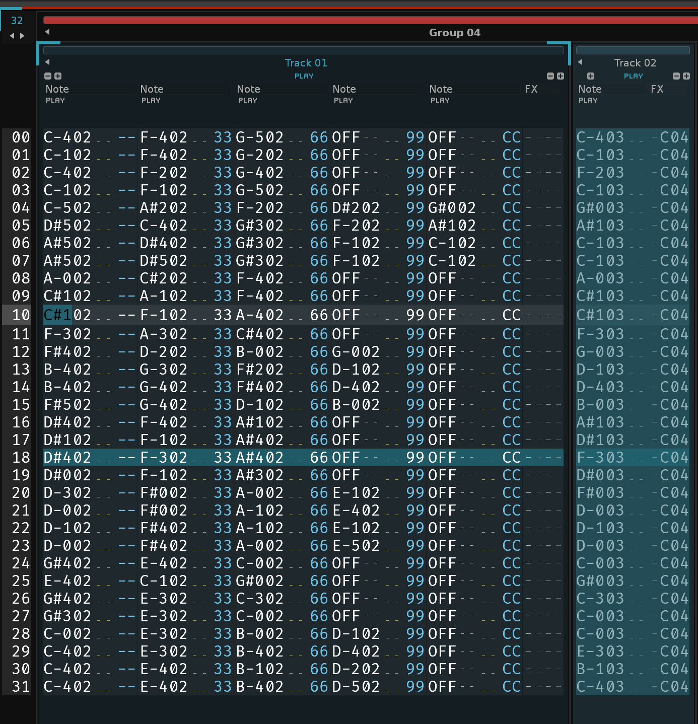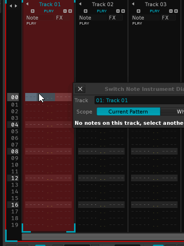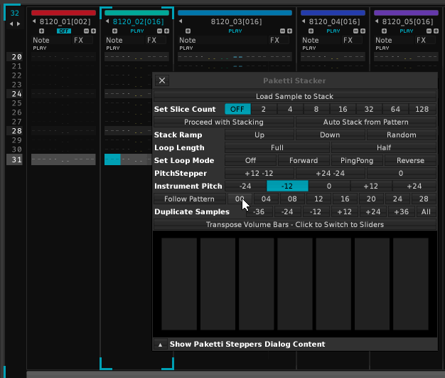 When going from 16 steps to 32 steps, duplicate the content instead of forcing the user to re-do it. Switching from using Sample FX Column for ZZ04 for defining StepCount, to. using Note Column naming for defining StepCount. Maximum Slice was off by one (C#4 to A#4? - allowed picking B-4 which did nothing), fixed. Writing "16step or 32step view?" to first note column (32_32) would mean StepCount 32 and View 32 Steps upon Dialog opening Changing tracks will update the Dialog to that track's settings.