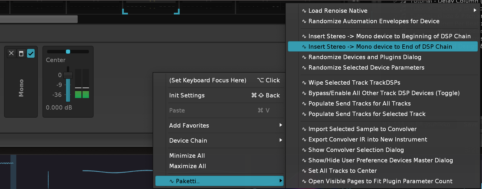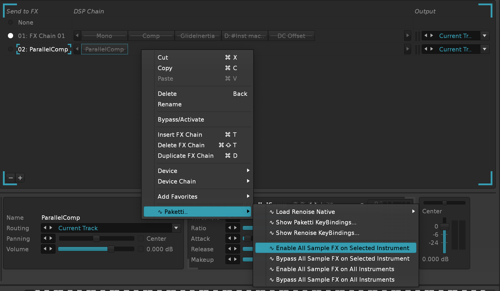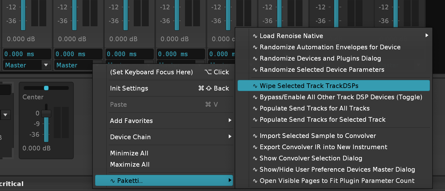 Global:Paketti:Trim Selected Sample to Selection and NormalizeMain Menu β Tools β Paketti β Samples β Trim Selected Sample to Selection and NormalizeSample Editor β Paketti β Process β Trim Selected Sample to Selection and NormalizePaketti:Trim Selected Sample to Selection and NormalizeAdded Destructive Clean Render In Place β a variant of Clean Render In Place that also strips all DSP devices from the rendered tracks after rendering. Once the audio is bounced with all effects baked in, the original DSP chains are no longer needed, so this removes them automatically.