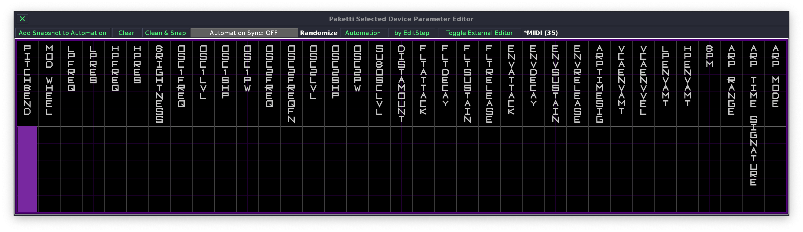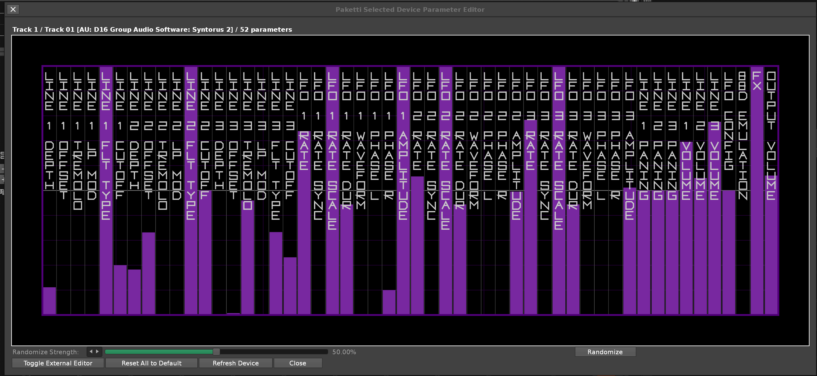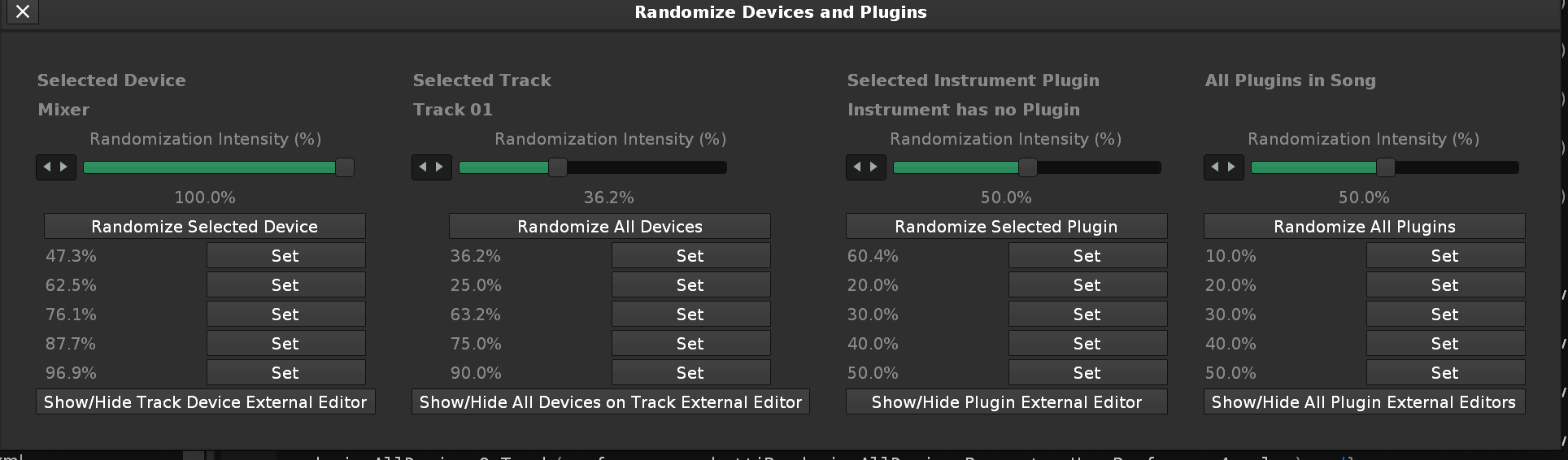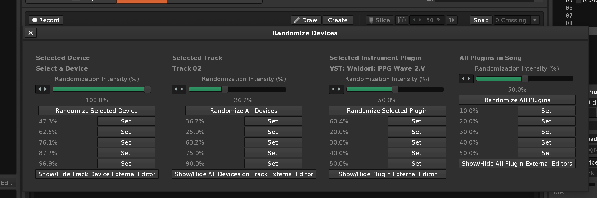 Ableton11Dark theme to Theme SelectorThis will read the currently selected device's parameters and display them on a single canvas, named accordingly. If you select a different device, the dialog will auto-update. You can also randomize parameters by percentage, can toggle External Editor on/off, can just draw to the Array aka create a completely new way of modifying parameters quickly.. Any ideas welcome.