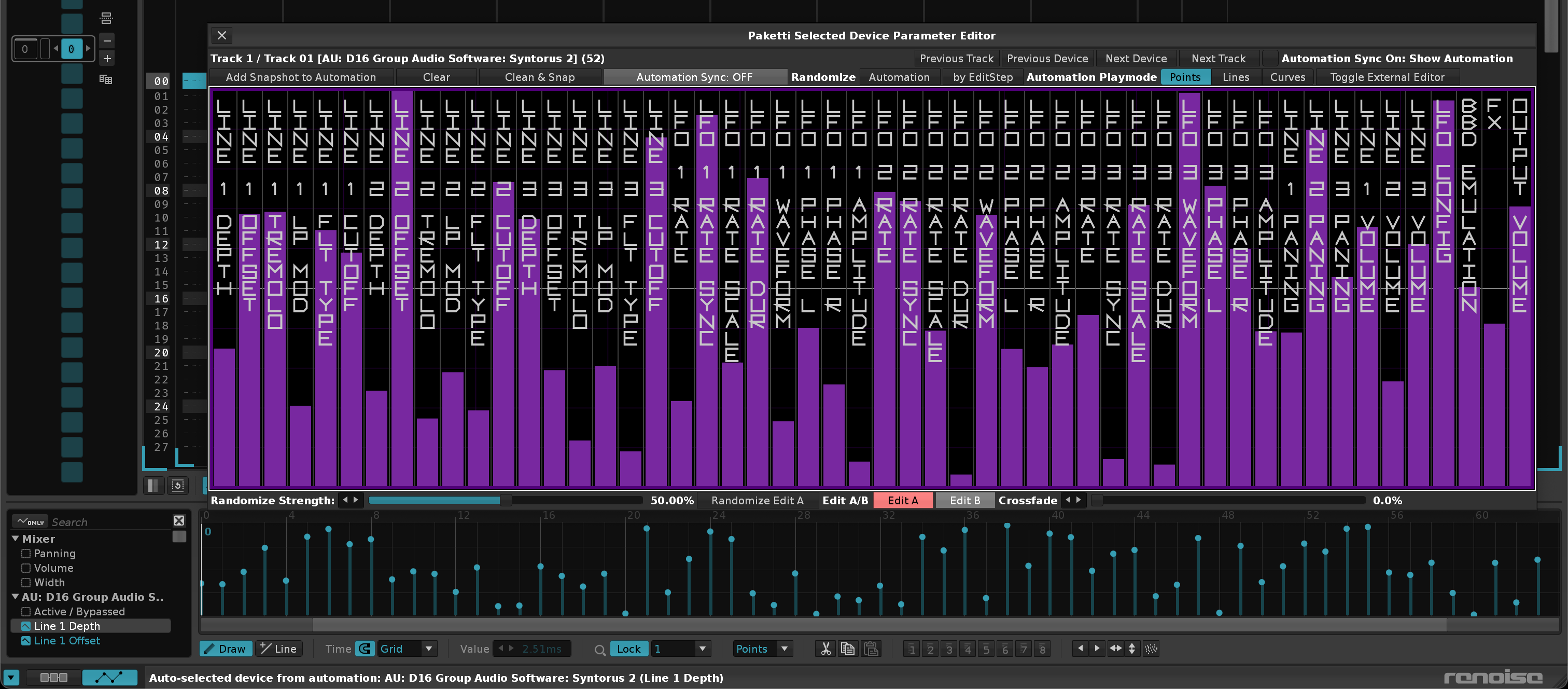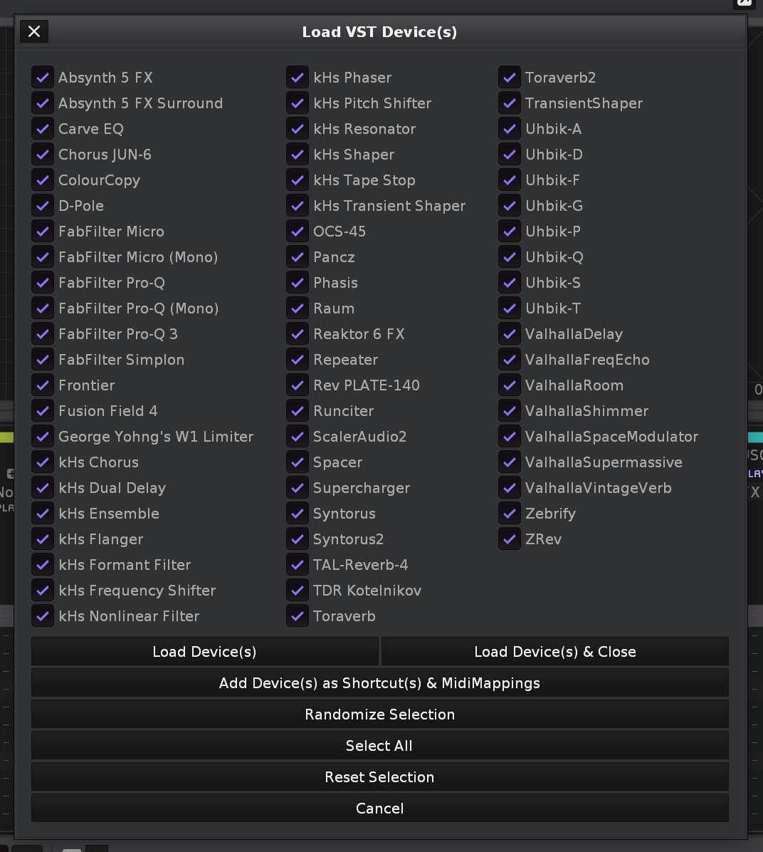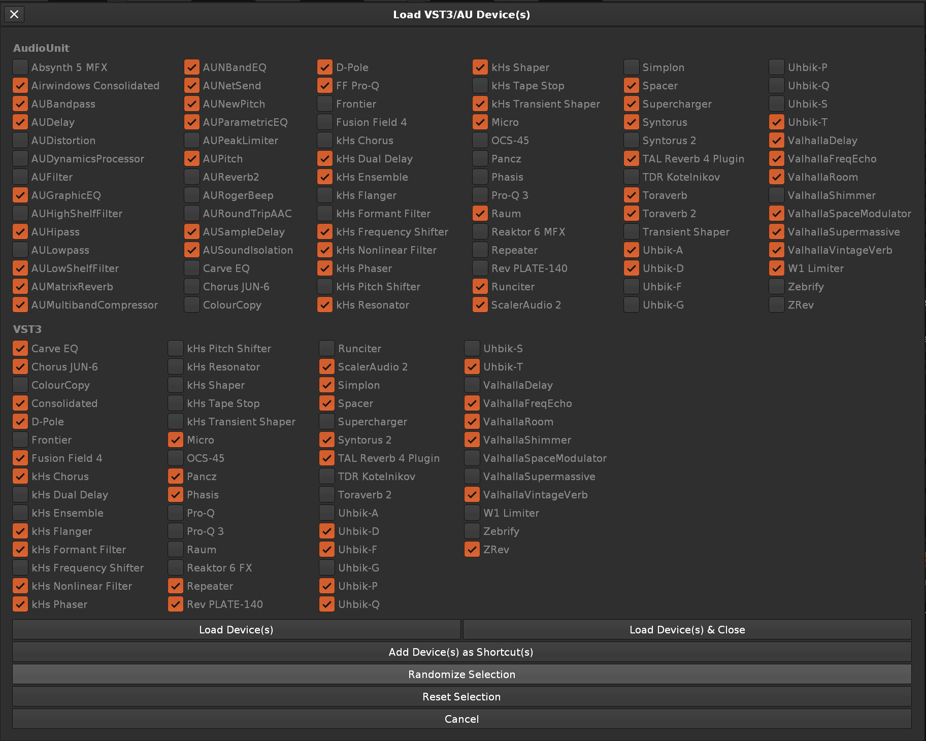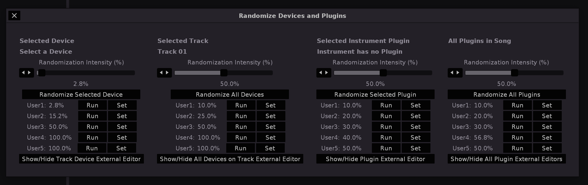 Ableton11Dark theme to Theme SelectorThis will read the currently selected device's parameters and display them on a single canvas, named accordingly. If you select a different device, the dialog will auto-update. You can also randomize parameters by percentage, can toggle External Editor on/off, can just draw to the Array aka create a completely new way of modifying parameters quickly.. Any ideas welcome.