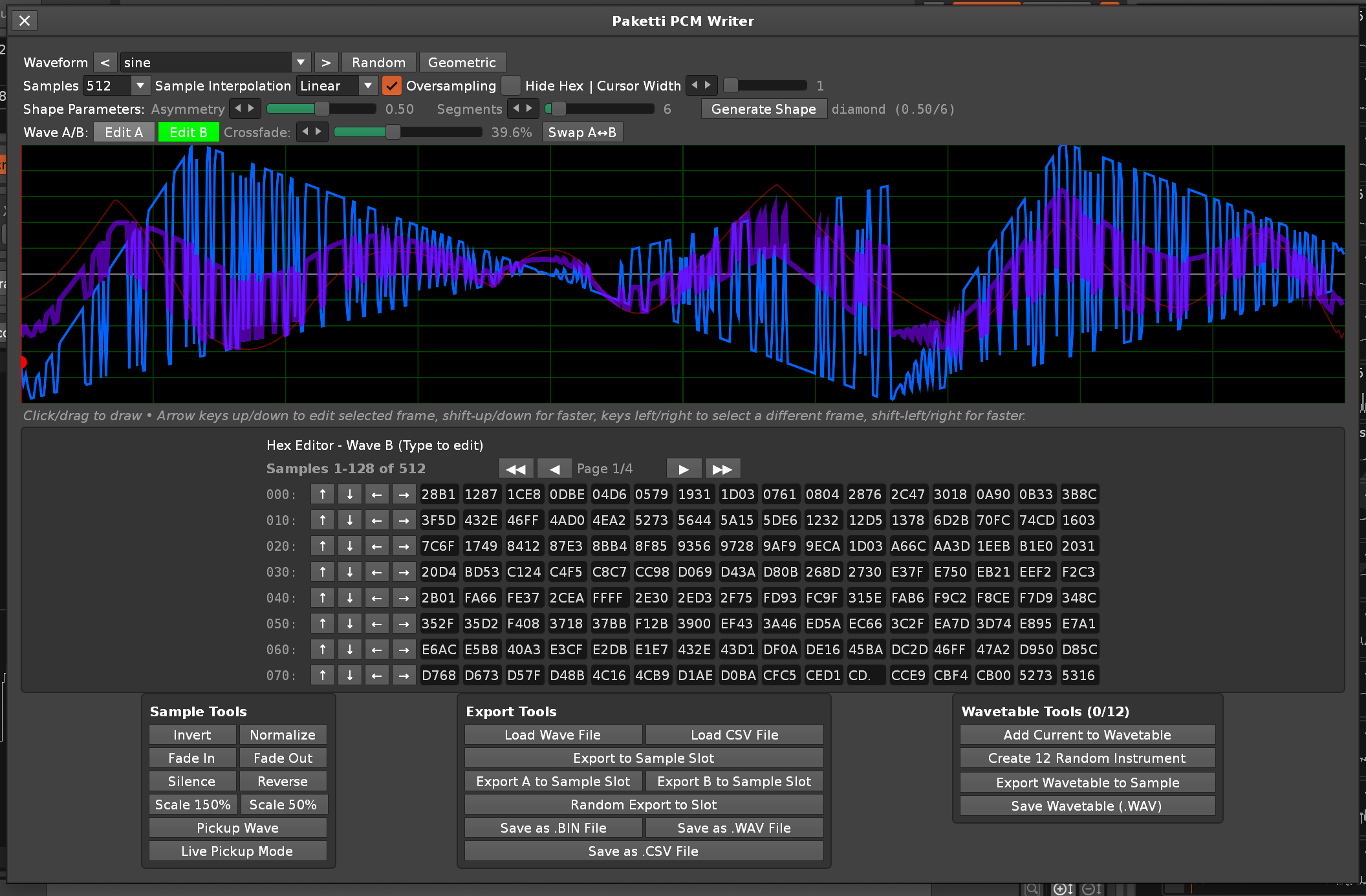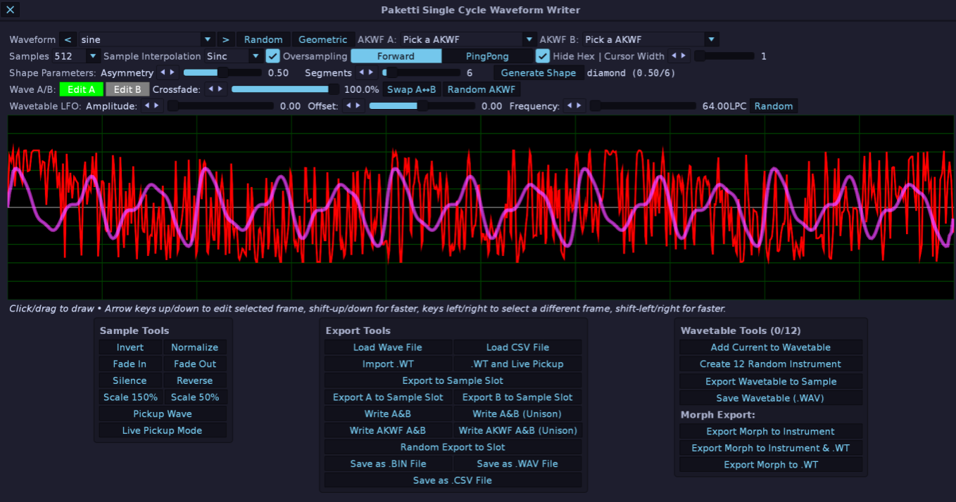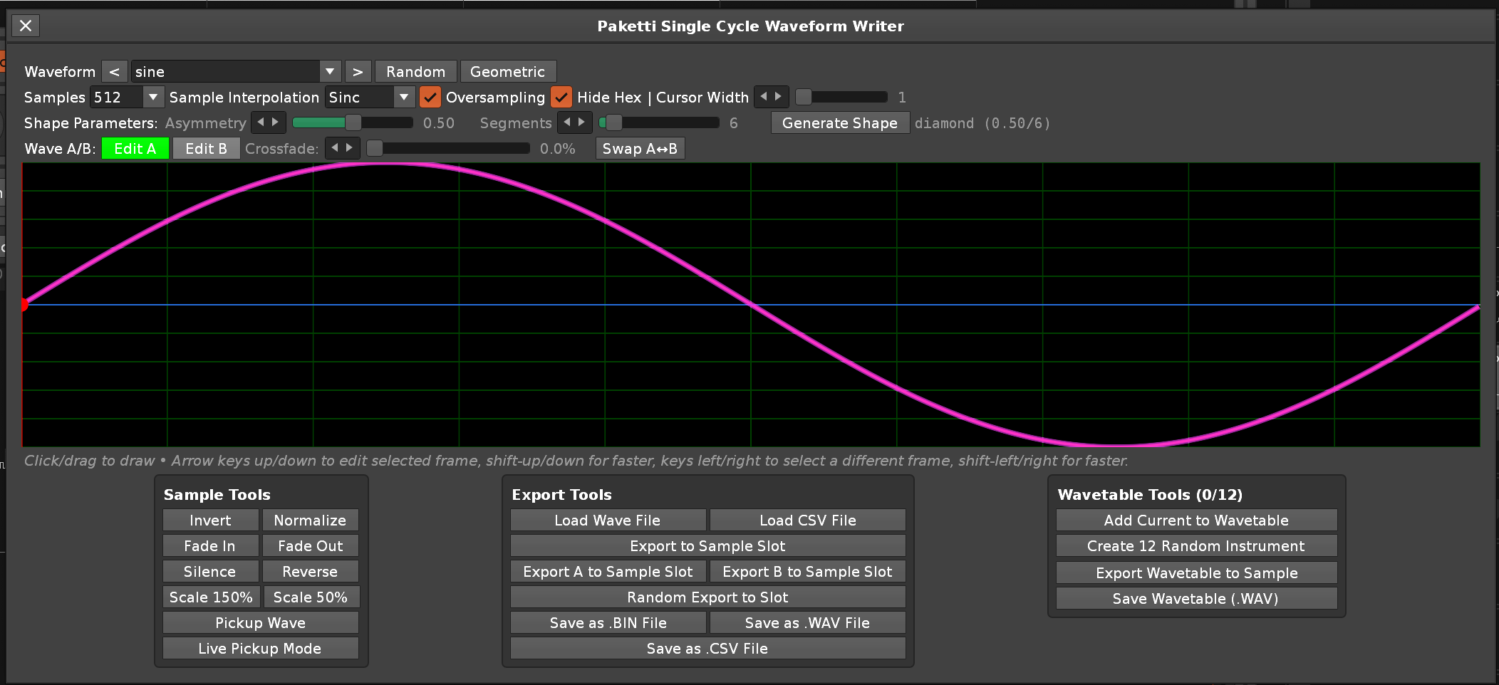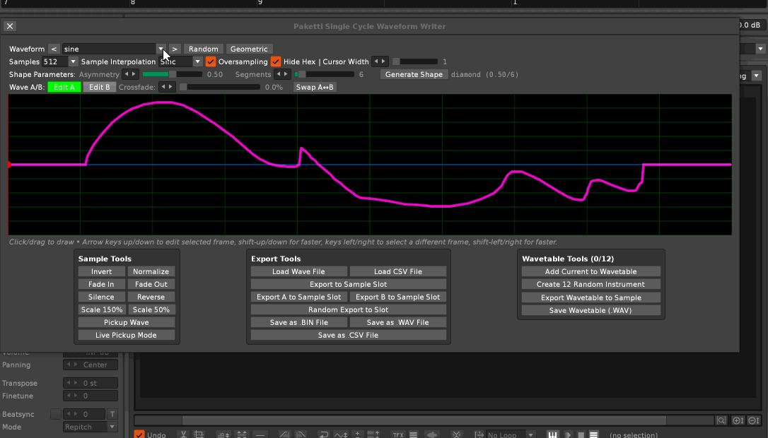 There's a dropdown menu with multiple waveforms - there's a randomizer for creating random waveforms, you can have Wave A and Wave B and crossfade between them, there's a Hex Editor there so you can input the code in yourself. You can save a .CSV and load a .CSV - you can drag in a .CSV into Renoise and it'll get loaded. There's a "Create 12 random instrument" -> meaning, an instrument will pop up with 12 randomized waveforms pre-loaded, and Pakettified. There's the usual simplistic Sample Tools, Invert, Normalize, Fade In, Fade Out, Reverse, Scale 150% Scale 50%. You can pick up the waveform on your current Selected Sample - or have a Live Pickup Mode - which means, whichever Selected Sample you pick, the minute you draw, it is beamed back to the Sample. And a few other things. Any ideas welcome.