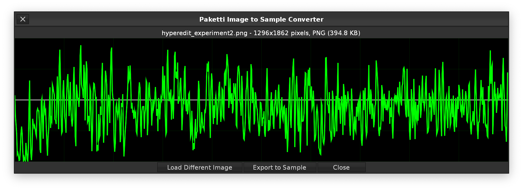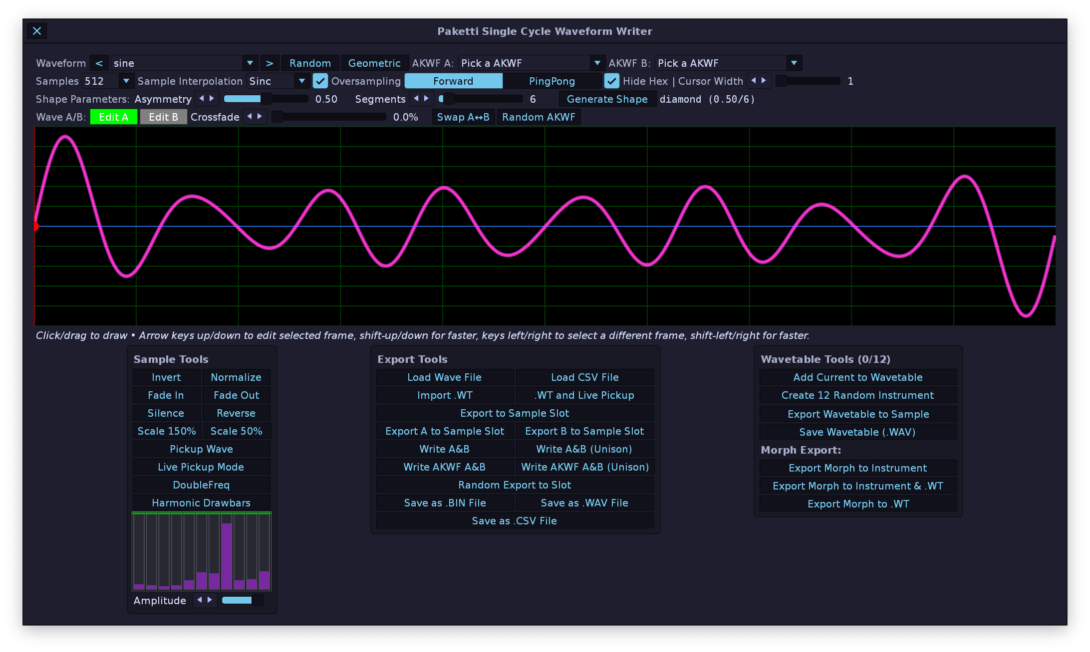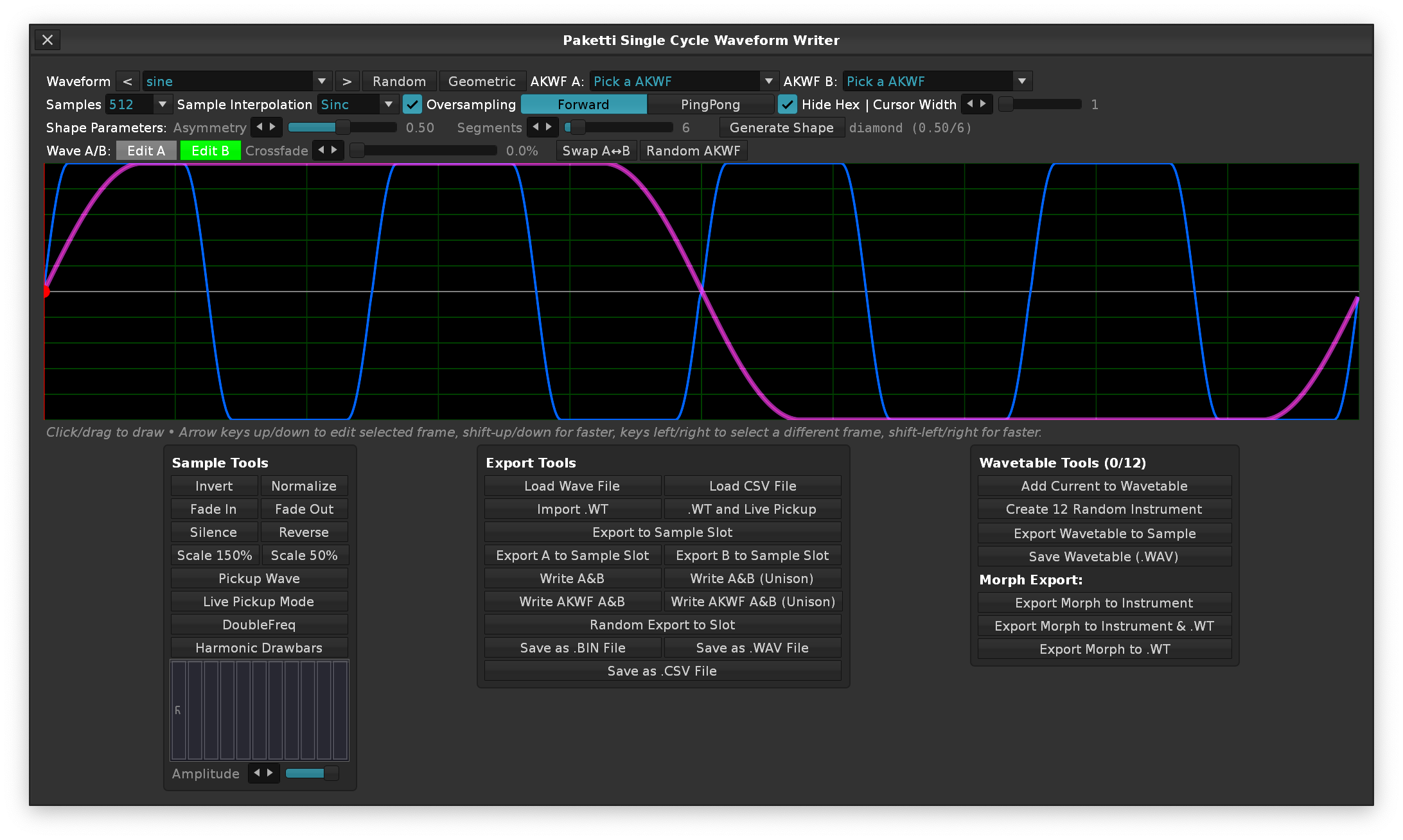 There's a dropdown menu with multiple waveforms - there's a randomizer for creating random waveforms, you can have Wave A and Wave B and crossfade between them, there's a Hex Editor there so you can input the code in yourself. You can save a .CSV and load a .CSV - you can drag in a .CSV into Renoise and it'll get loaded. There's a "Create 12 random instrument" -> meaning, an instrument will pop up with 12 randomized waveforms pre-loaded, and Pakettified. There's the usual simplistic Sample Tools, Invert, Normalize, Fade In, Fade Out, Reverse, Scale 150% Scale 50%. You can pick up the waveform on your current Selected Sample - or have a Live Pickup Mode - which means, whichever Selected Sample you pick, the minute you draw, it is beamed back to the Sample. And a few other things. Any ideas welcome.