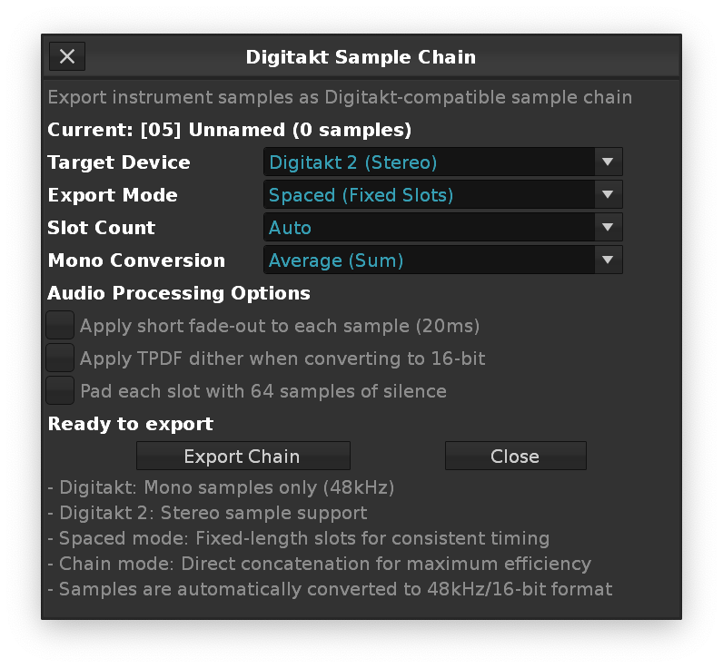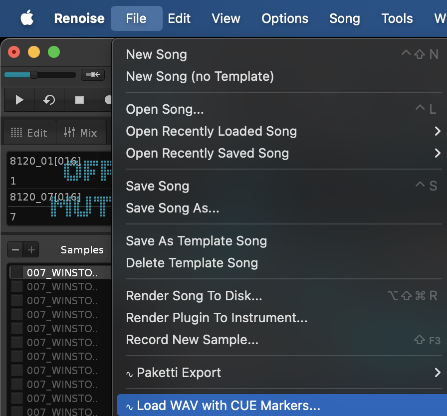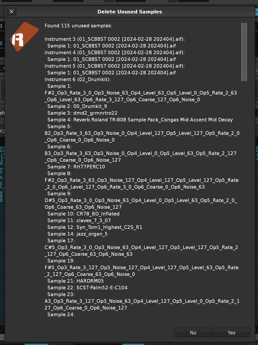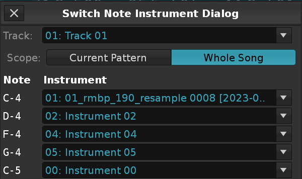 The render uses the same engine and preferences as the existing Render Pattern Selection (sample rate, bit depth, interpolation, DC Offset). After rendering, instrument indices are automatically adjusted so the C-4 note always points to the correct rendered instrument even after unused instruments are deleted and indices shift.