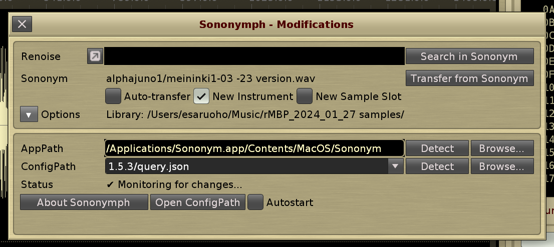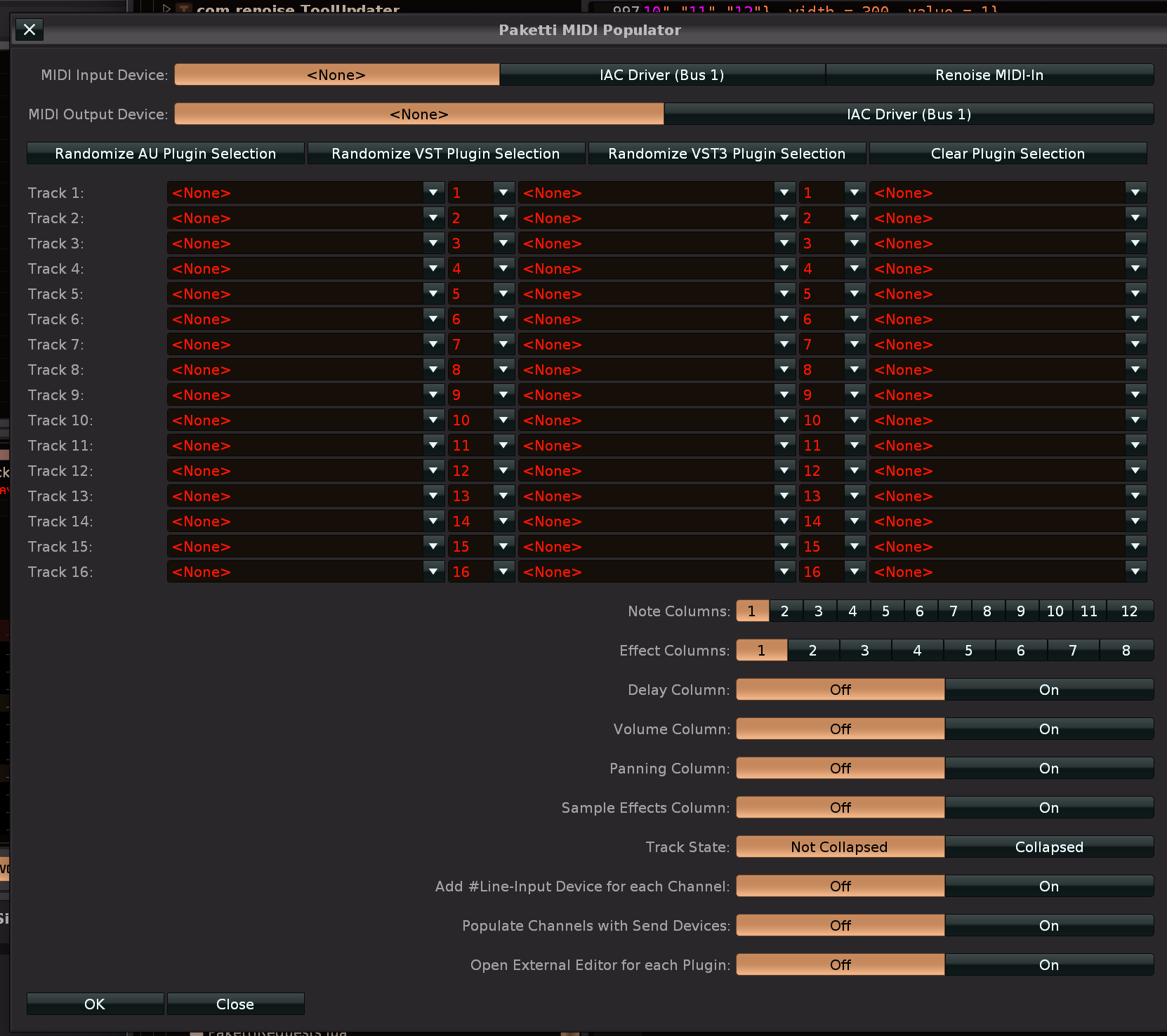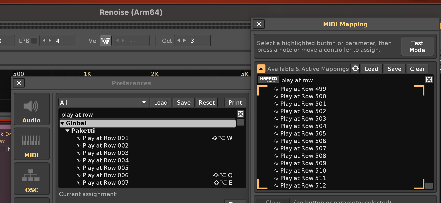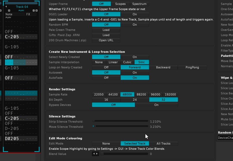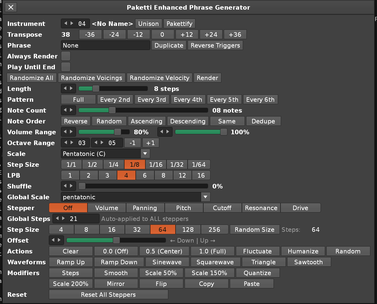 Uses the same Paketti Steppers code, so they stay in sync visually (I make a change to Paketti Steppers dialog, and the Phrase Generator dialog updates, too). Pressing Duplicate will now both duplicate the instrument, and create a new track, and arm the track for playback, AND set "Always Render"&"Play Until End" to ON - meaning you immediately hear the changes you make. When hitting the Instrument transpose buttons, the C-4 + 0G01 is printed to the selected Track in Pattern Editor.