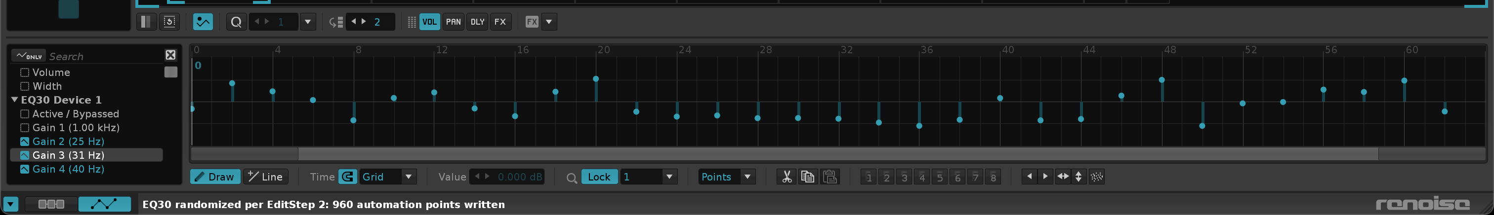 This will clear the current EQ30 automation across all envelopes, and Randomize by EditStep - and set the envelopes to Points so they don't interpolate, but instead step by EditStep.