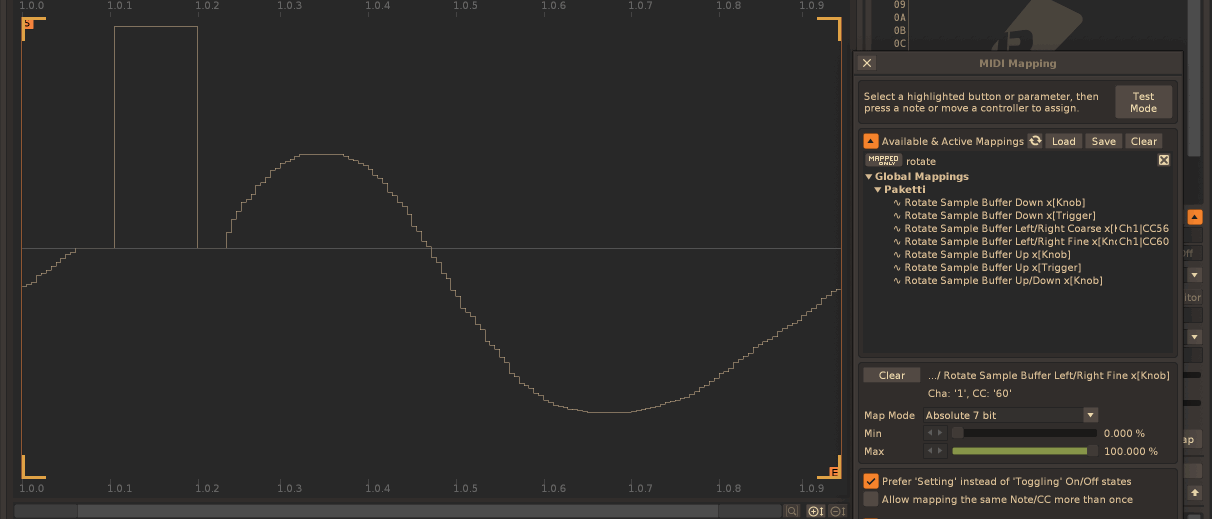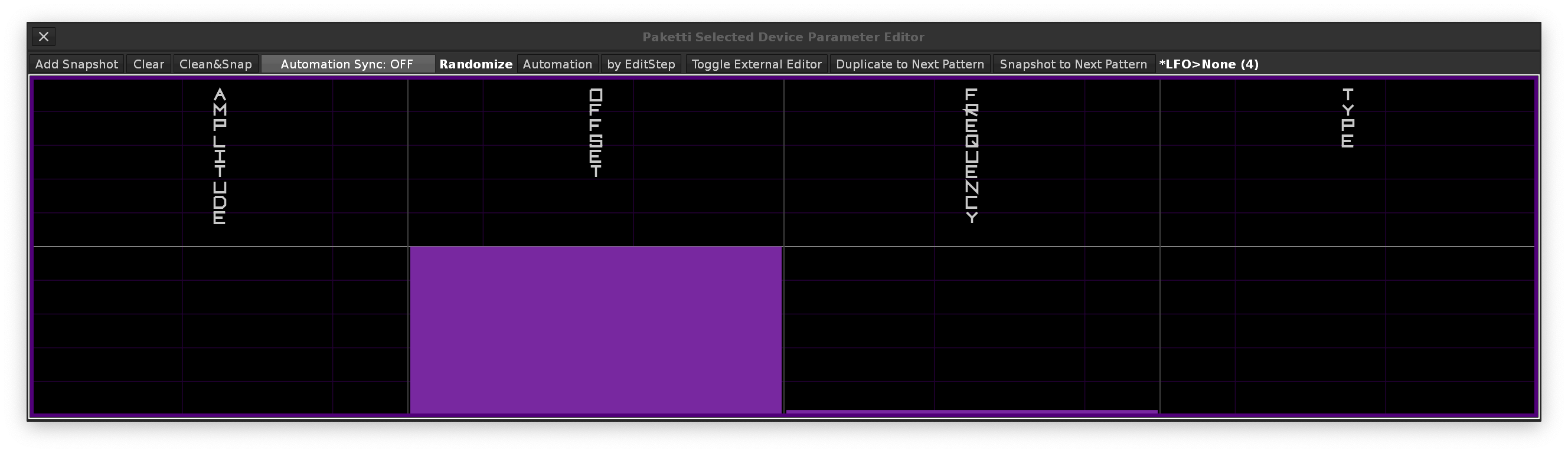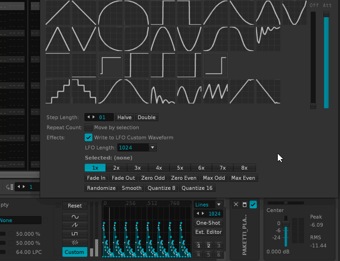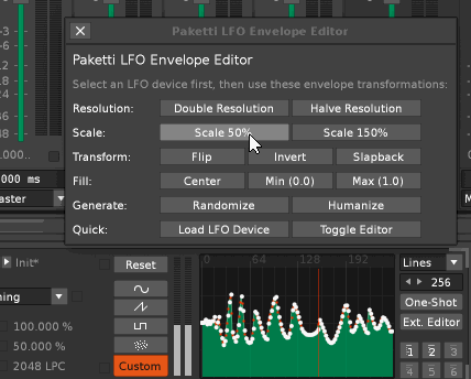 You can now use Single Cycle Waveform Writer to create "a type of wavetable" - The newly added "Write A&B" button will create Wave A as Sample Slot 1, Wave B as Sample Slot 2. The Wave A will be in Sample FX Chain 1, the Wave B will be in Sample FX Chain 2. The FX Chain 1 will have a LFO connected to Gainer, and the FX Chain 2 will also have a LFO connected to a Gainer. After the Gainer, for both FX Chains, there will be a Send device to FX Chain 3 - which is the "regular" Paketti FX Chain (followed by FX Chain 4 for Parallel Compression). After this, the Live Pickup Mode is enabled in the Single Cycle Waveform Writer - but with additional tweaks: Now, after this change, the Wave A Waveform drawing will write to Sample Slot 1, and Wave B Waveform drawing will write to Sample Slot 2. The Instrument is configured like so: The Modwheel controls the Reset of both LFO devices in Sample Chain 1 & Sample Chain 2. Both LFOs are set to "Infinite" Frequency - meaning, only the Modwheel will change the location of the LFO step. The Selected Track also gets a LFO, connected to Instr. Macro device's Modwheel. The Selected Track LFO Amplitude, Offset and Frequency, are exposed in the Mixer for easier availability, and the Dialog is automatically updated with three additional sliders - you guessed it, Amplitude, Offset and Frequency. This means that you can automate the LFO on the Selected Track - the device is helpfully renamed to Wavetable Mod *LFO, and thusly you can automate the crossfade / oscillation between the Wave A and Wave B waveforms. When the Single Cycle Waveform Writer is opened on an Instrument such as this - the Live Pickup Mode is automatically set, and the Three sliders on the Dialog are shown to the User.