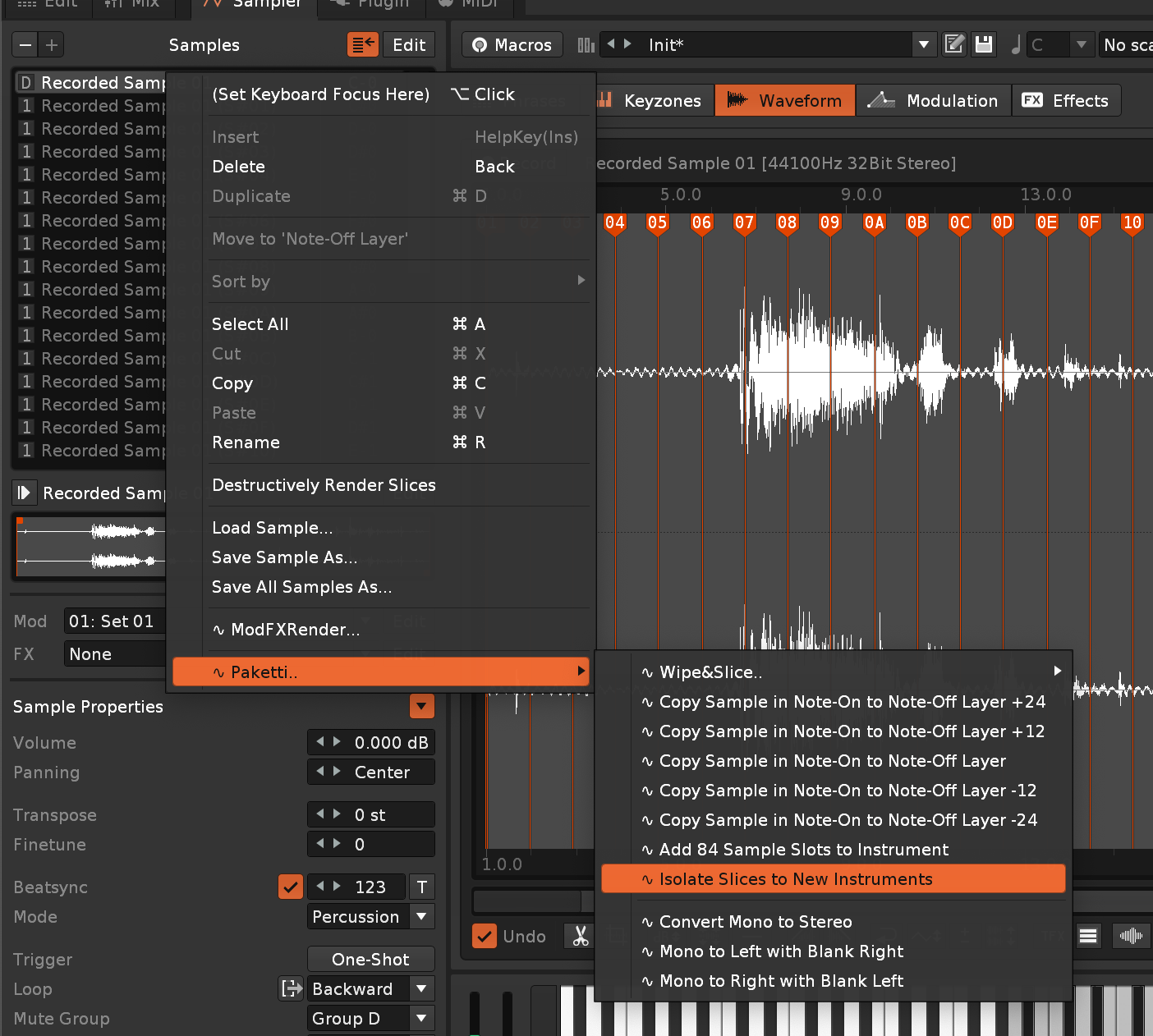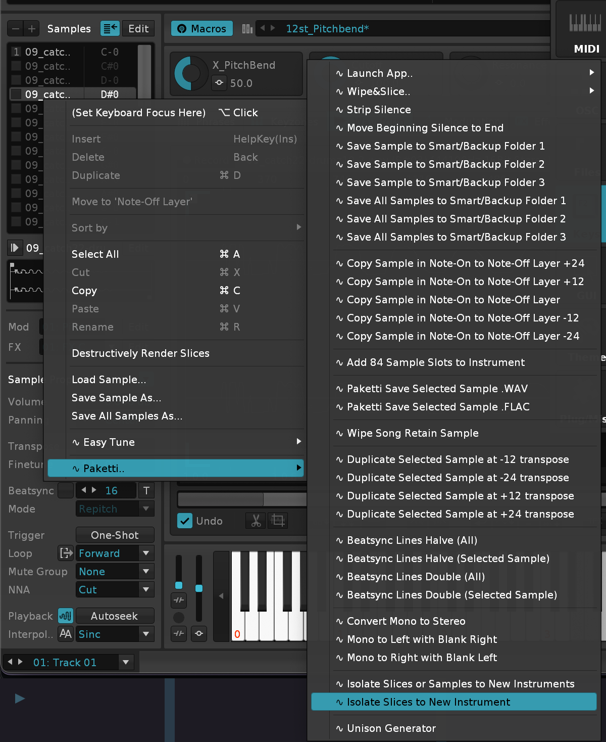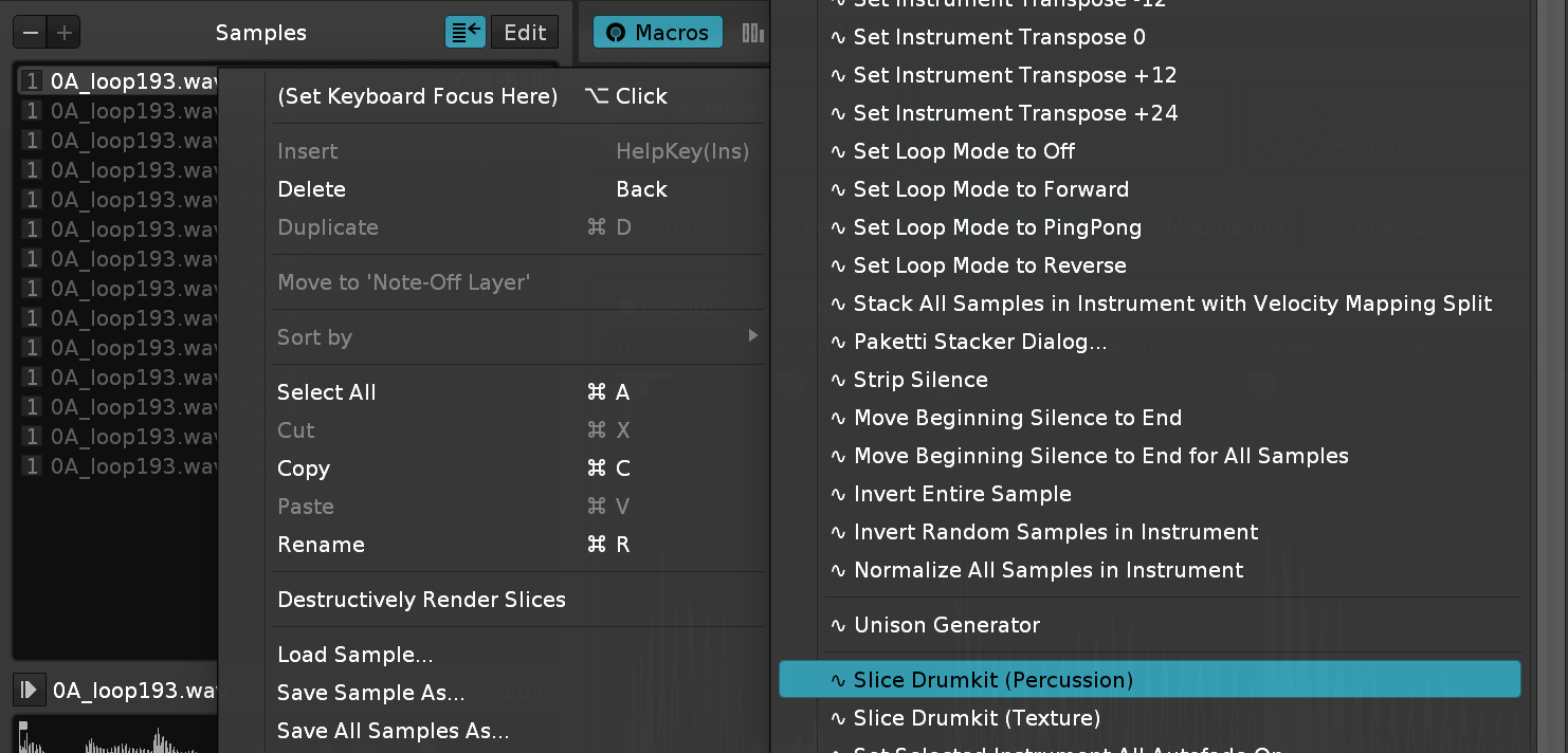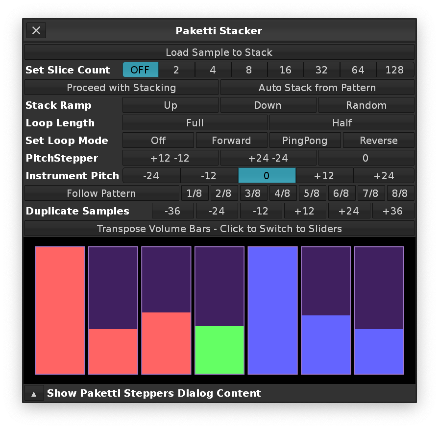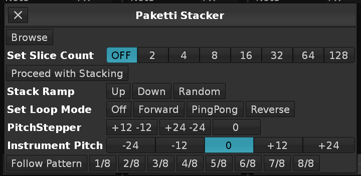Added "Auto Stack from Pattern" - this means, if you've used slices to create sequences, and suddenly want to transpose the slices, you can turn them from Slices into a Stacked instrument, and the selected track will be duplicated but written with velocity stacking.