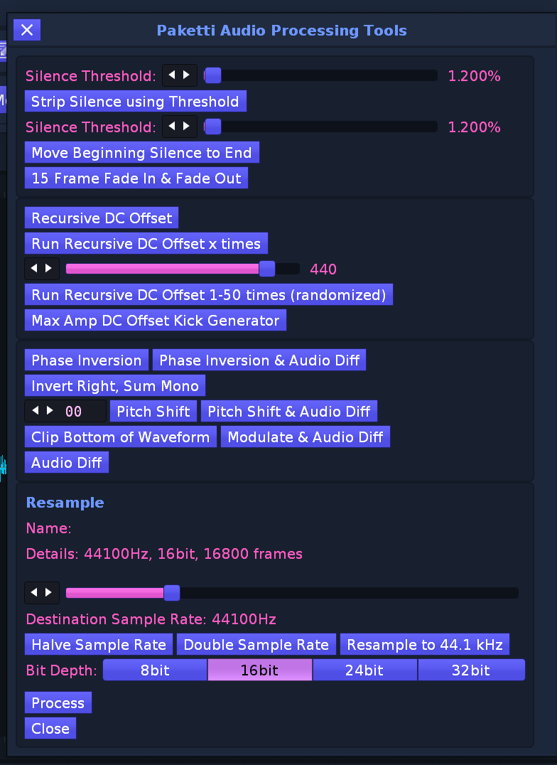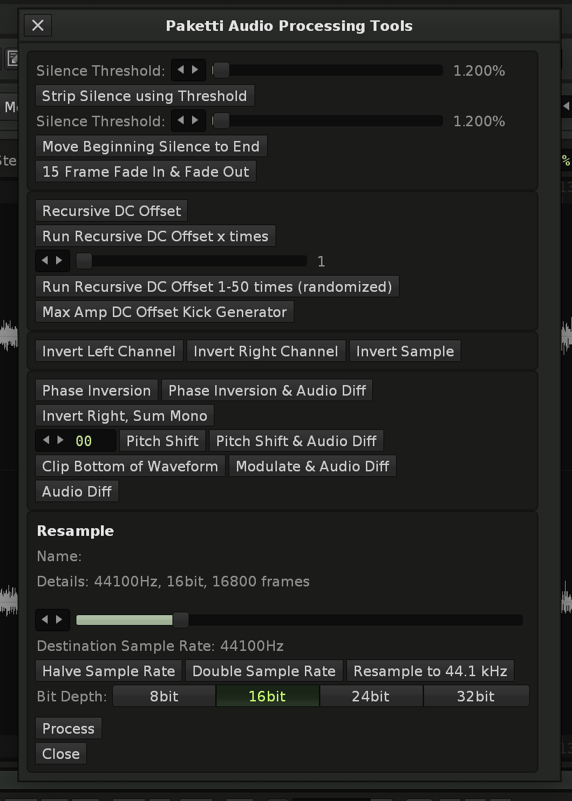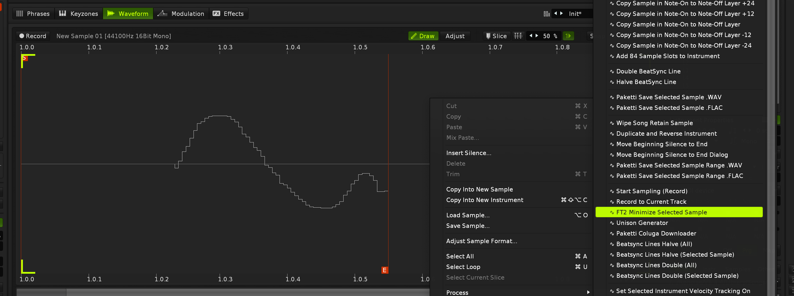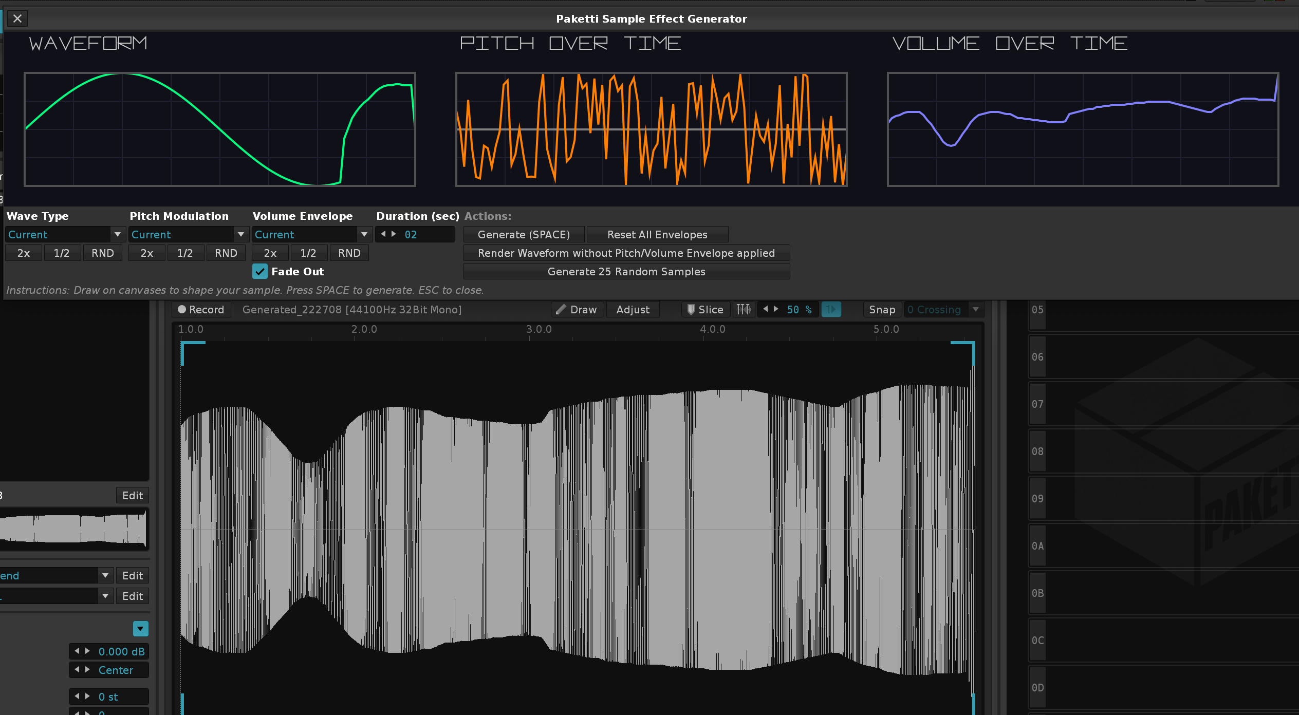 Added more waveforms (2 octave steps, 1 octave steps), tweaked the 2X / 1/2X to be less buggy, improved the interface, added Invert button for inverting, added a Live Audition mode, so basically, draw and let go of drawing and it is rendered. Added Paketti Loader Settings (Interpolation, Oversampling, Autofade, other settings).. Added Random Steps for pitch loops, tweaked the Fade out to be less clicky. Also tunes the sample to a440hz so it'll, if using Octave Steps, for instance, match with a plugin played on the same instrument. Also added Process Slicing to the 25 Random samples, and made it less random (not random,random,random for 25 samples - instead, randomly pick something from the dropdown menus for Waveform, Pitch and Volume.)