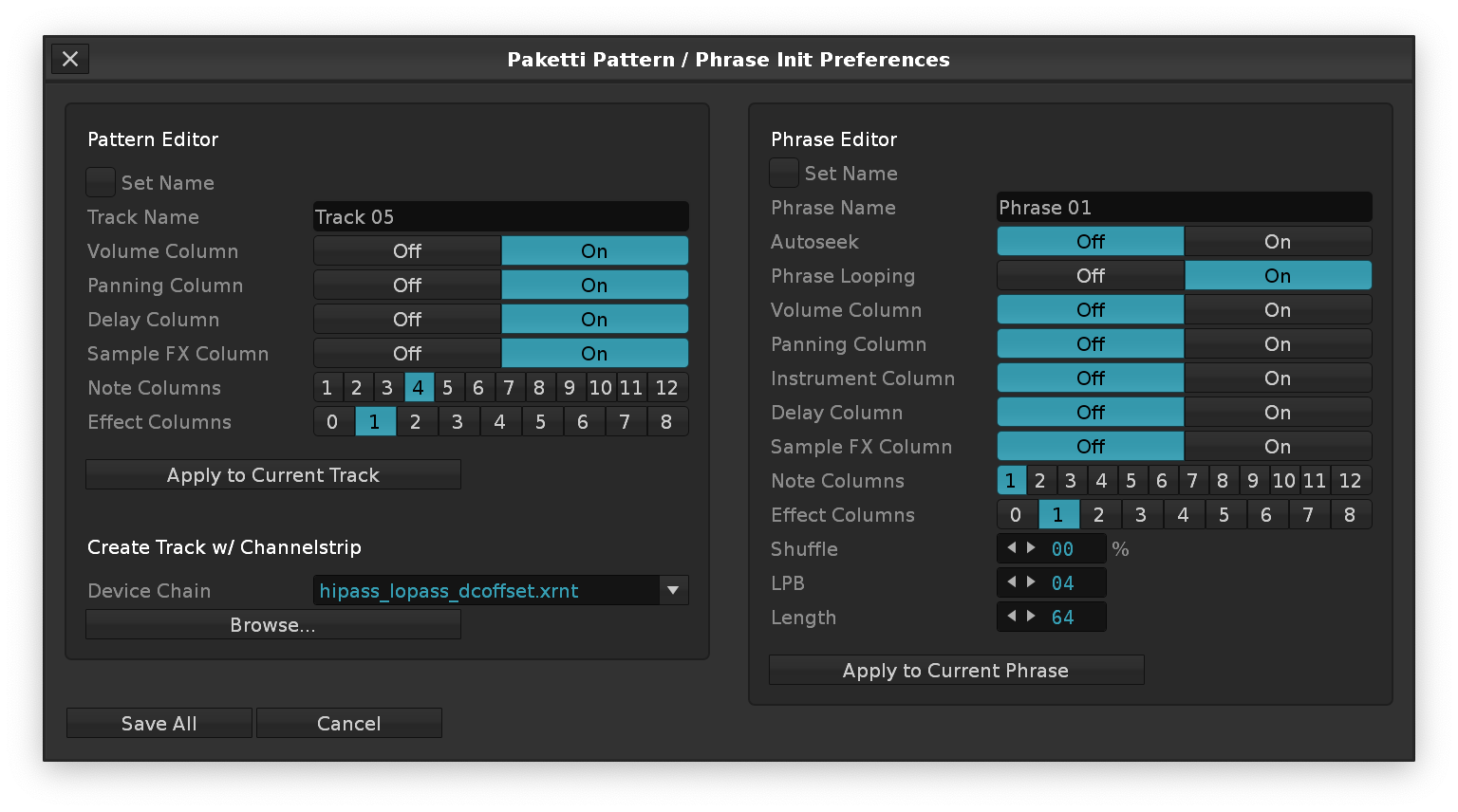 Pattern Editor:Paketti:Selection to PhraseMain Menu:Tools:Paketti..:PhraseGrid:Pattern Integration:Selection to PhrasePattern Editor:Paketti:PhraseGrid:Selection to PhrasePaketti:Selection to Phrase [Trigger]Global:Paketti:Pattern to Phrase β now also fixes instrument column, adds undo, copies sub-column visibilityRemoved unnecessary padding from four dialogs so they take up less screen space: