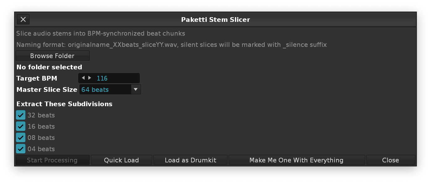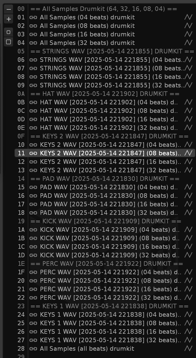 Automatic BPM-based Beat-slicing/audio preparing of your remix stens. Set BPM, decide the beat lengths (64, 32, 16, 8, 4) - Start the Process - and Paketti StemSlicer will do your automatic cutting for you. Afterwards, click on Load as Drumkit - and they appear sorted by original sample and length. The silence ones are skipped from being loaded.