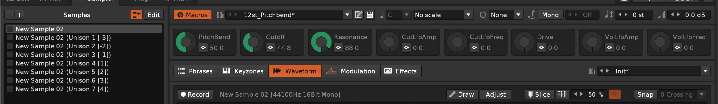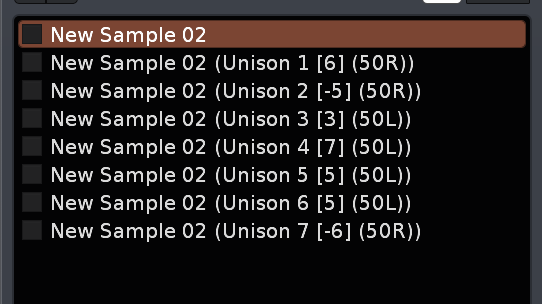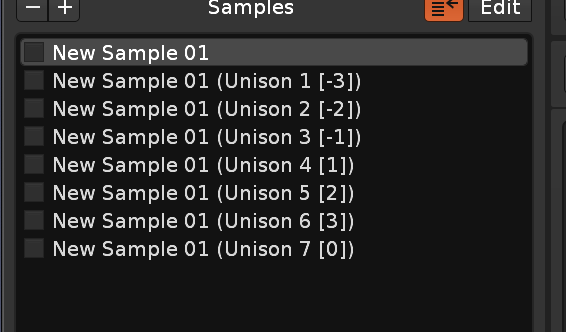 For setting the maximum minimum detune, and whether the detune fluctuates, or whether it's "hard sync" (surely the wrong term - but meaning if you set the finetune slider to 96, then all unison'd up samples are -96 to 96. And the original sample finetune is taken into consideration and calculated against.