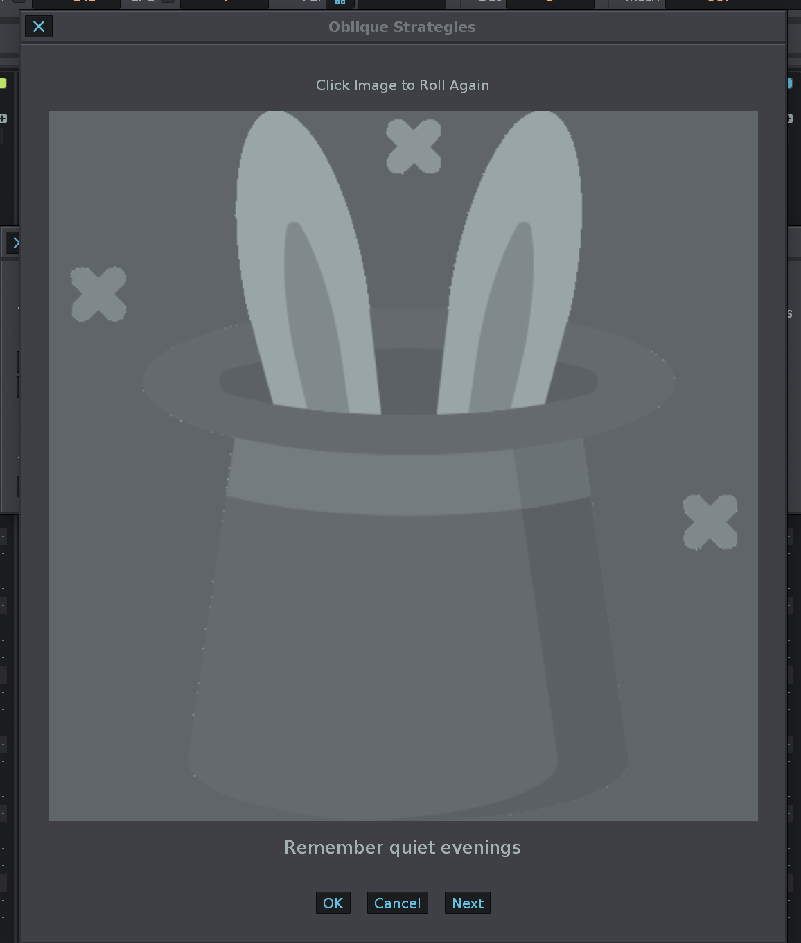 This started with "Oh yay, v3.5 has a Phrase Script Editor", followed by "But I don't want to use it. Can I script the script?". This is basically a system for creating, and always-rendering, the Phrase Script Editor output, and having it play, without needing to look at the Phrase Script Editor. It lets you decide how long the sequence of notes is, how many notes there are, and which scale the notes conform to, and what the note order is. When you drag the Length and Note Count sliders, new sequences are randomly created, new note orders, etc. Volume Range controls the minimum and maximum Velocity. Octave Range is, for the range of Octaves covered. You can Randomize the Voicings, Randomize the Velocity, or Randomize All. You're able to control the Instrument Transposition, the Shuffle, Step Size and LPB. And access all the Steppers dialogs. The Status bar will show you what you created, and it will automatically start playing. Experiment and enjoy!