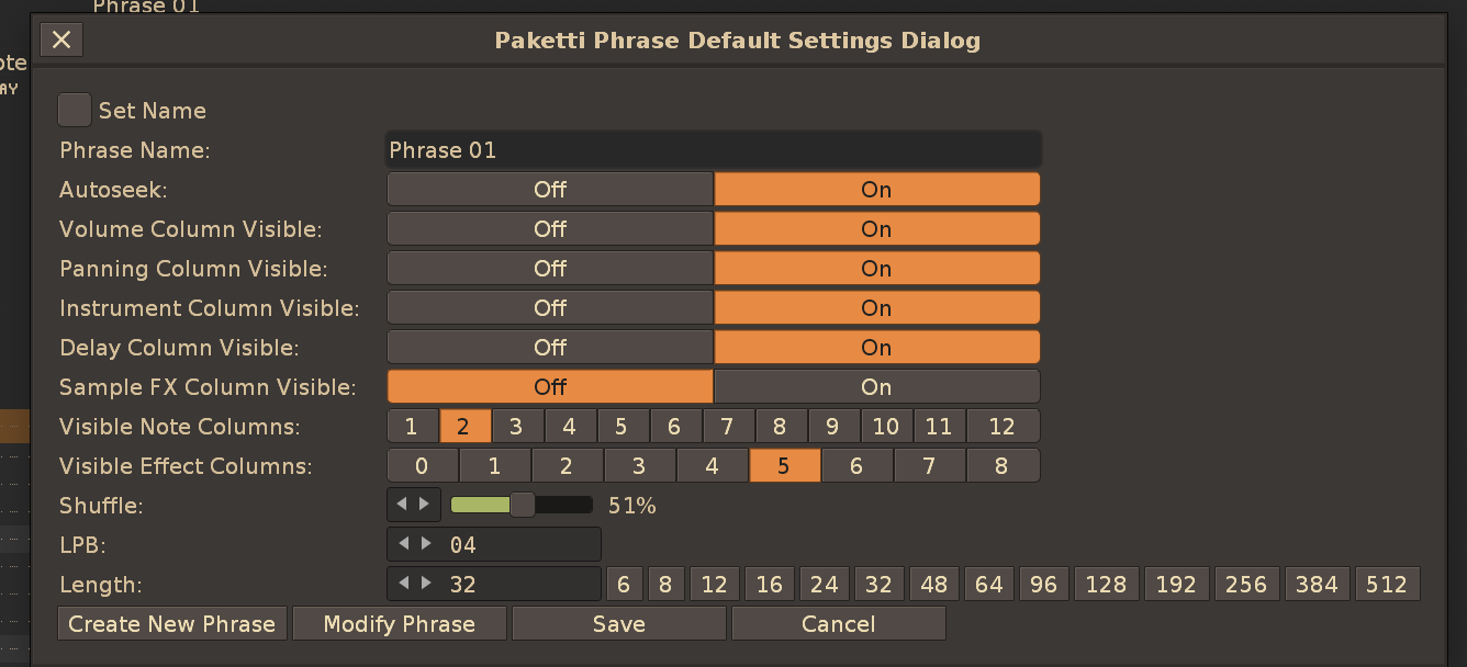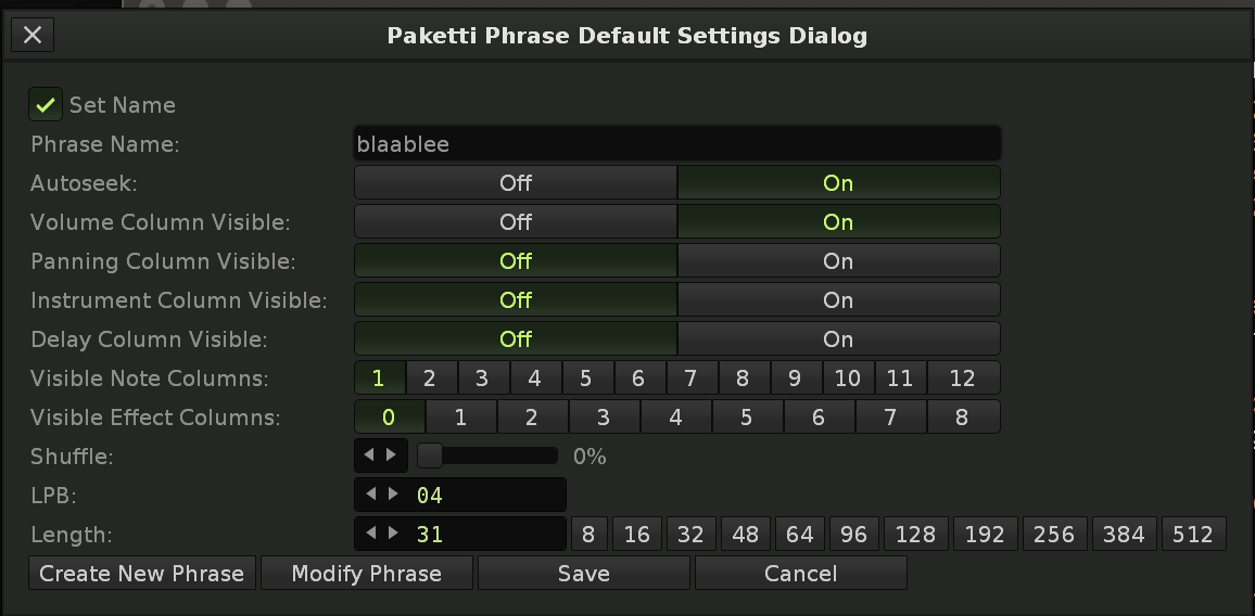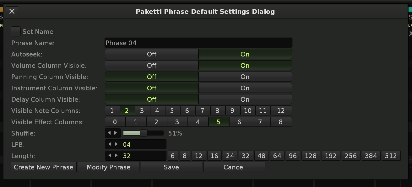 Pattern Editor:Paketti:Replace Selection with PhraseGlobal:Paketti:Replace Selection with PhraseMain Menu:Tools:Paketti..:PhraseGrid:Pattern Integration:Replace Selection with PhrasePattern Editor:Paketti:PhraseGrid:Replace Selection with PhrasePaketti:Replace Selection with Phrase [Trigger]Added a dedicated Selection to Phrase feature that grabs whatever you've selected in the Pattern Editor and turns it into a new phrase on the selected instrument. Select a region, fire the shortcut, and you've got a phrase β complete with the same number of note columns, effect columns, volume/panning/delay sub-column visibility, and your current LPB. The phrase is set to loop by default and named with the source pattern and line range for easy identification.