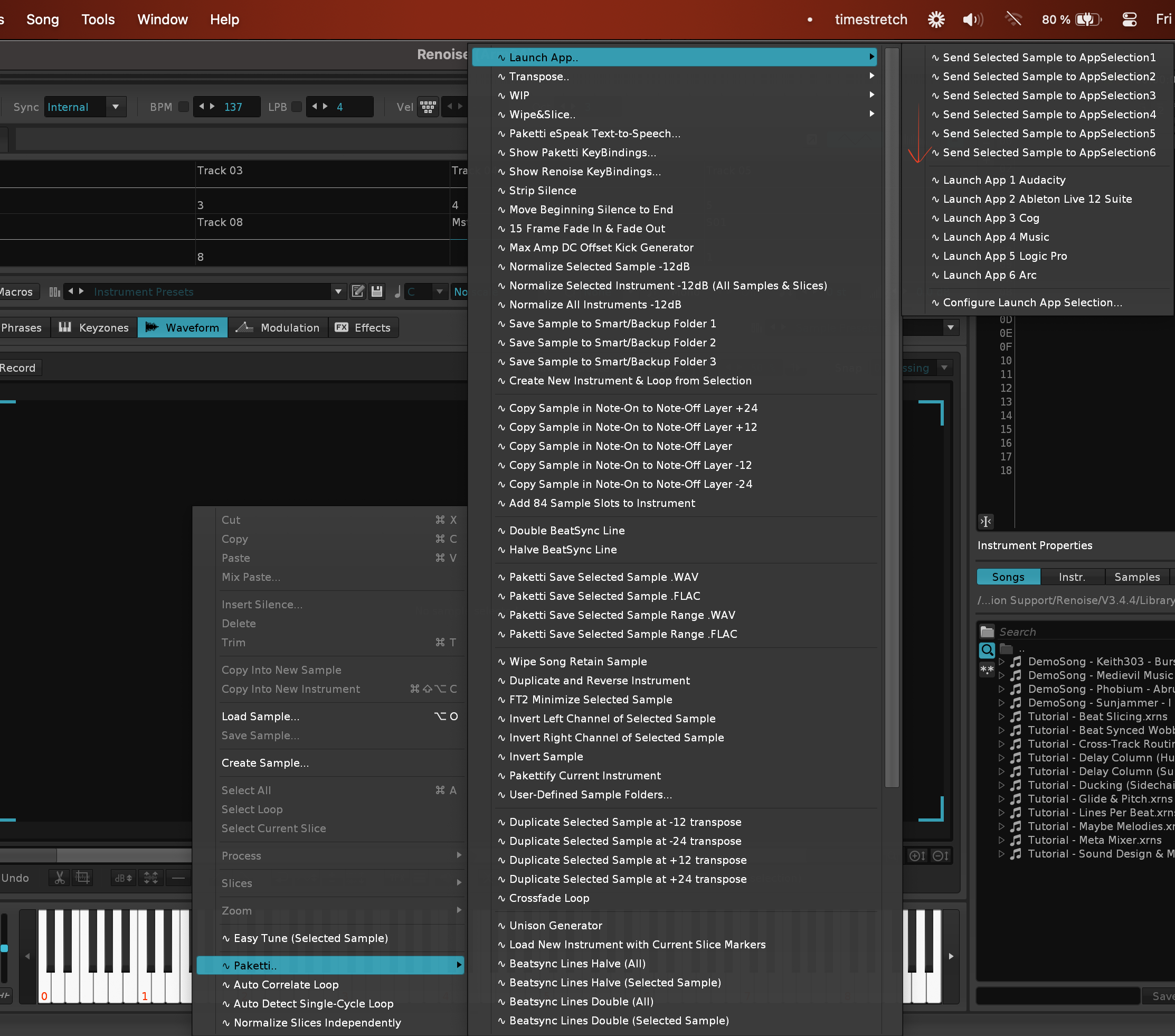 How it works: Enable the "Filter Mode" checkbox next to any app slot in the Launch App dialog. Enter arguments in the Args textfield using $infile and $outfile placeholders (e.g. $infile -r 8000 $outfile for sox). When you click "Send Selected Sample to App" or "Send Sample Range to App", instead of launching a GUI application, Paketti saves the sample to a temp WAV, runs the CLI command in the background (non-blocking), polls for completion, and loads the result back into Renoise. The processed audio creates either a new pakettified instrument or a new sample slot, controlled by the "Filter Output" preference in the dialog.